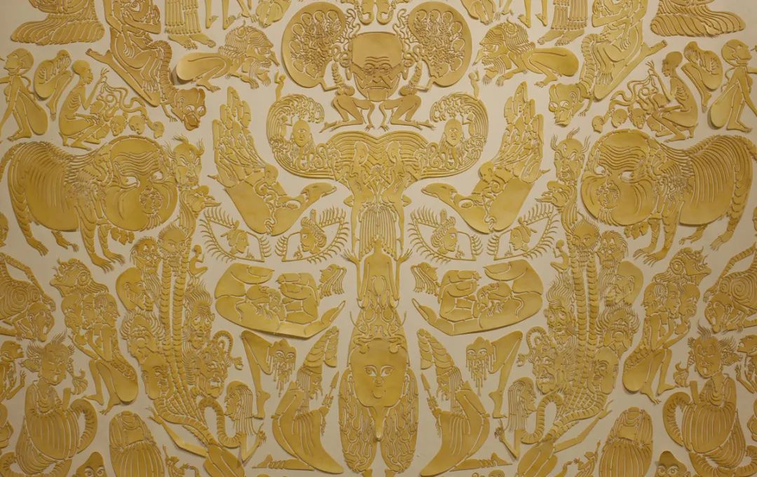 在2011年,邬建安创作了大型镂空剪纸作品《七层壳》,7件极致繁复又统合完整的、高达5米的作品高高悬挂与布面,蜿蜒蔓延在整个展厅。作品共有360个用纸镂刻,染色后用蜡油浸透的形象从而组成7个大的造型。成百上千个小形象彼此叠压、交错呈现出标志性的复杂绚丽的视觉肌理。单独来看是对人性的隐喻,整体来看是对某种社会规则的映射——个体只有找到绝对正确的固定位置,才能够组成一个完美的整体。