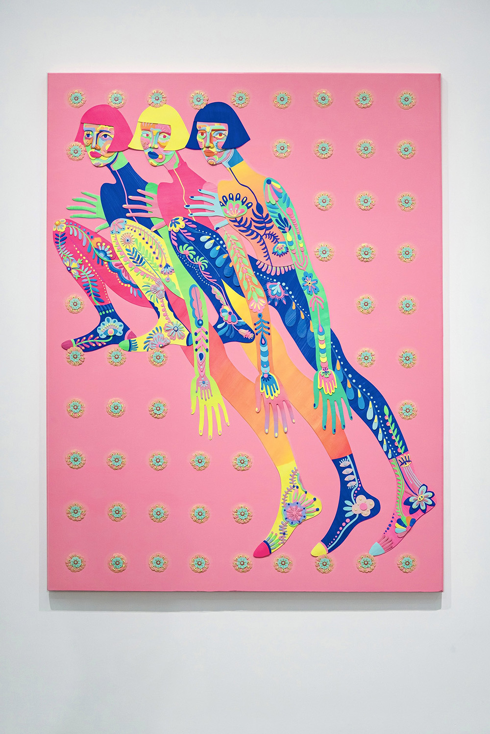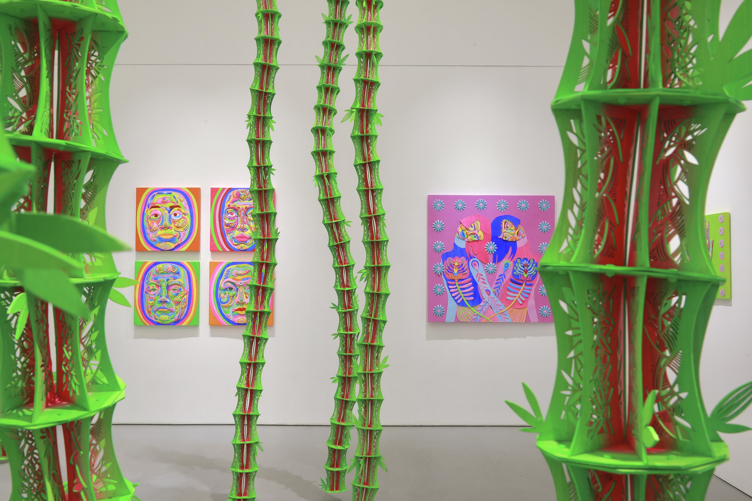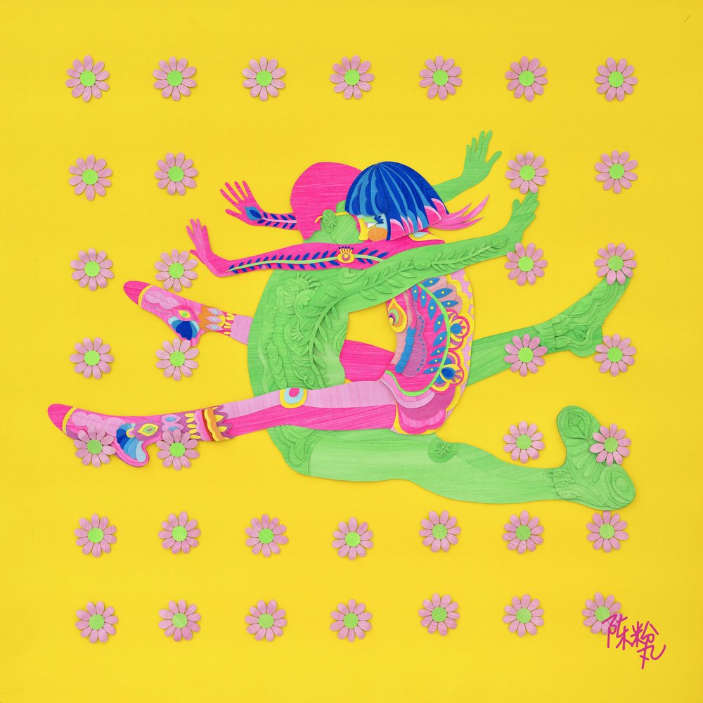 从依靠对折获得的基础对称剪纸特征出发,在近年的创作与研究中,粉丸一直视「对称」为自身研究课题并赋予阶段性的新解。在她看在来,「对称」有着视觉之外的解释,即拥有动词词性的行为或动态关系象征:我们的身体、生活、时间,人与人间的情感关系、付出与收获,都是“对称的”。 数以千计保有手工着色肌理的色块,共同合作演绎成一张具有情态的画面。与平常的剪纸不同,每组色块并没有被镂空。而是从一张完整的纸上裁切下来,再将纸张上剩余的“图案”舍弃了,留与舍的互换依然构成了剪纸。