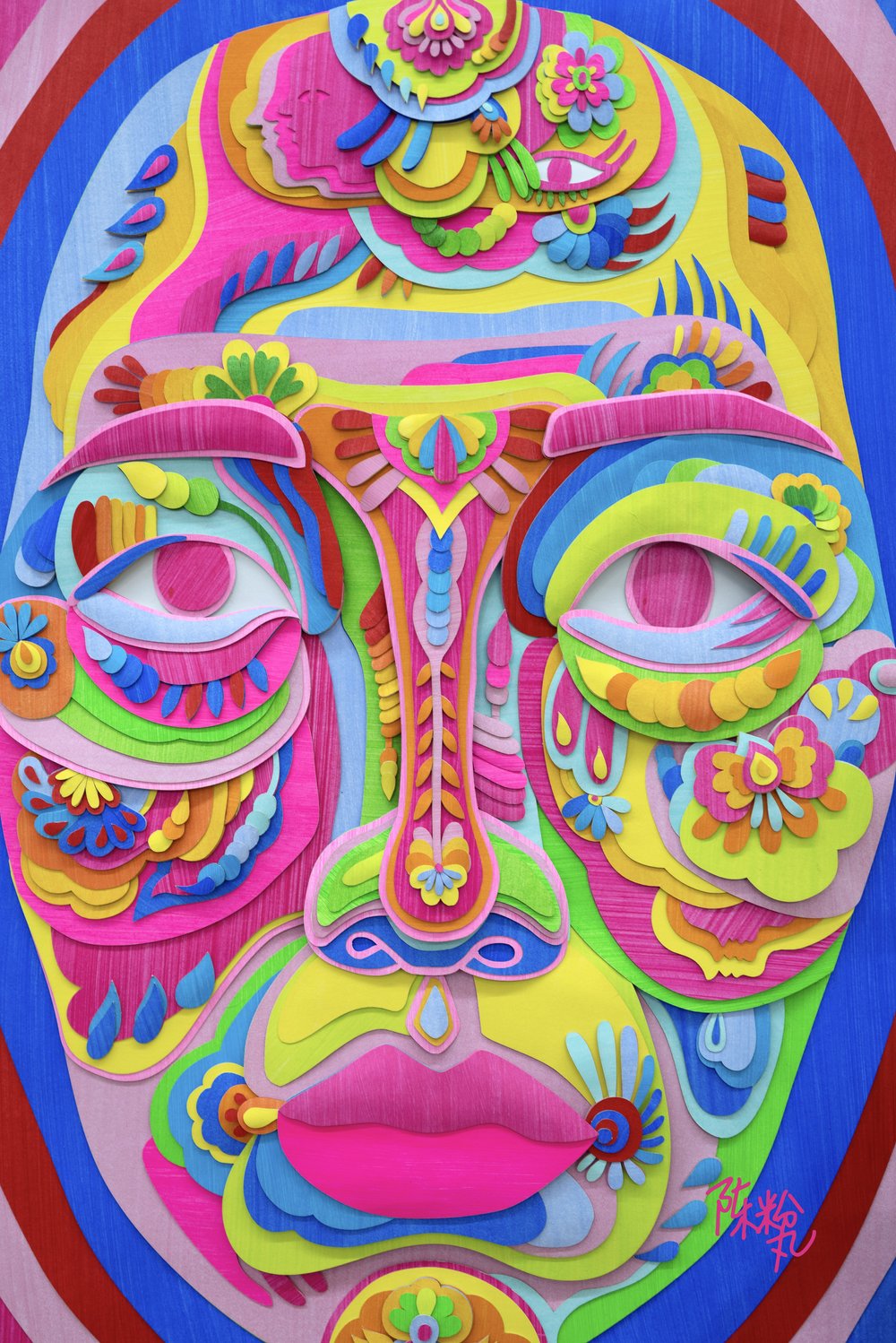 从记录某张真实的面孔或动作开始,肖像经历了分解重组的步骤过程。粉丸在“临摹”刻画这些清晰的素材时,其实是以主观的冲动进行的,神态细节的分布依据不同人的特征被布置为鲜艳的色块与线条,不再具有精确的还原性。而数字化制图软件却会忠实地呈现艺术家的创作安排,将屏幕的矢量图形落成于纸张的纤维之上。雕刻过后,再由工作室团队对零散的色块进行分类,对照屏幕一一组合拼贴。