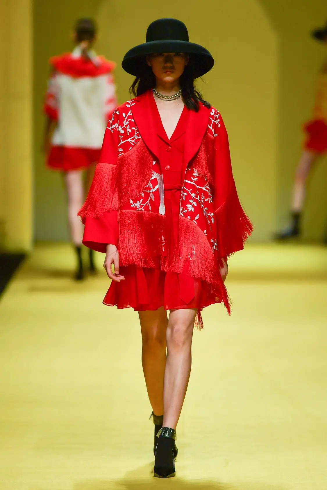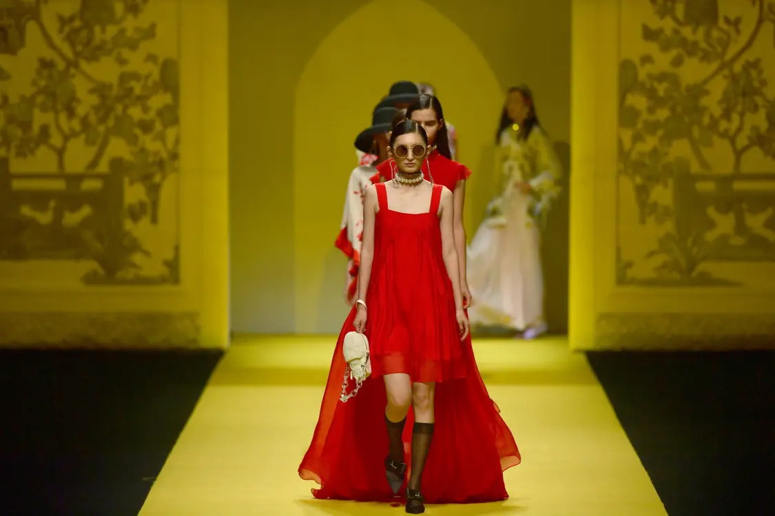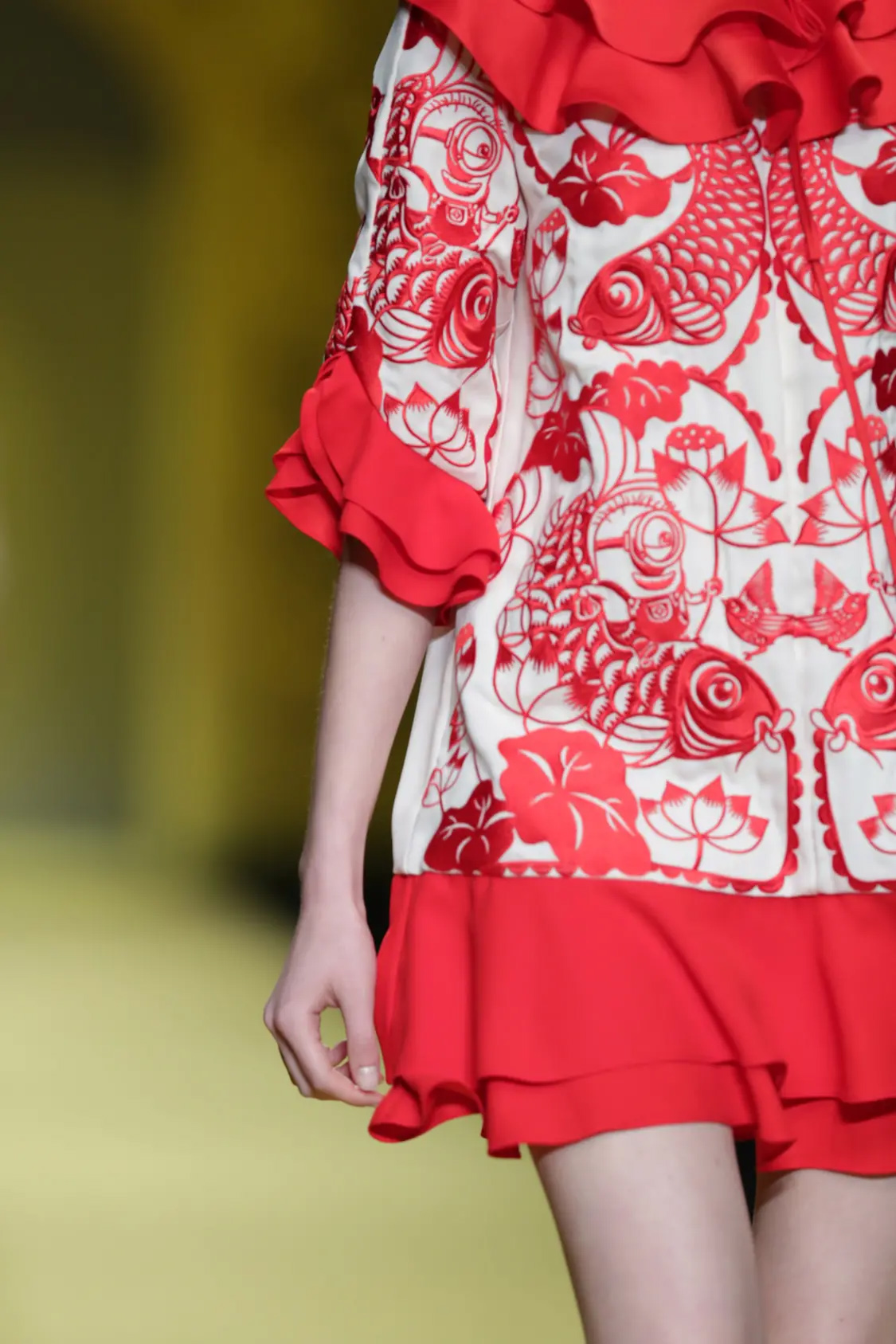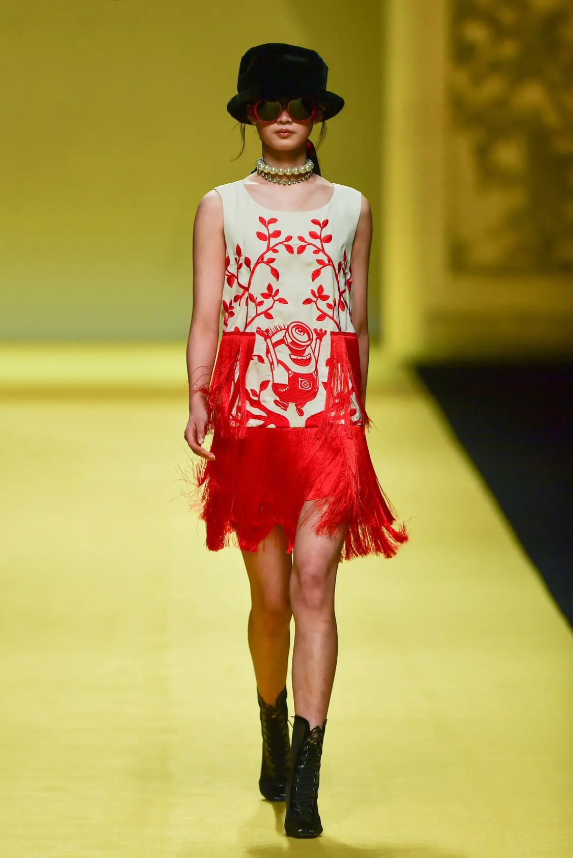 秀场压轴之作惊喜连连,设计师从中国剪纸艺术撷取灵感,元素混搭不设界限,将俏皮的小黄人融入到国人所熟悉的锦鲤、荷花、树枝等中国风元素的绣花工艺中。最后以中国红为主色调,加入飘逸的流苏元素,获得现代中西风格有机结合的新式设计呈现。