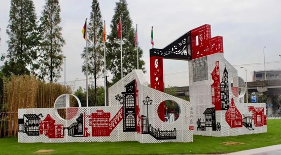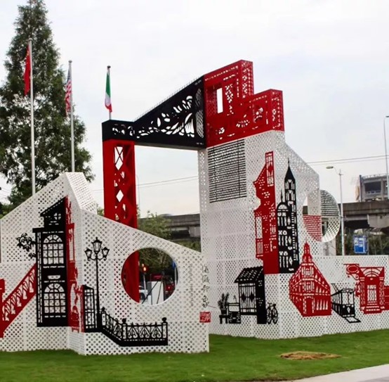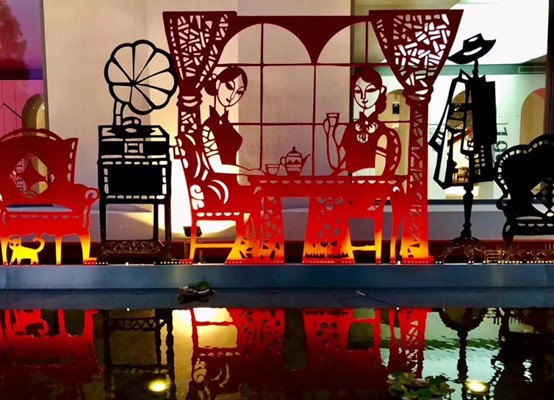 在上海石库门“西城里”藏着一个大型剪纸装置壁画,这是由艺术家李守白设计,守白艺术团队共同打造,以海派剪纸为基础的大型景观艺术。