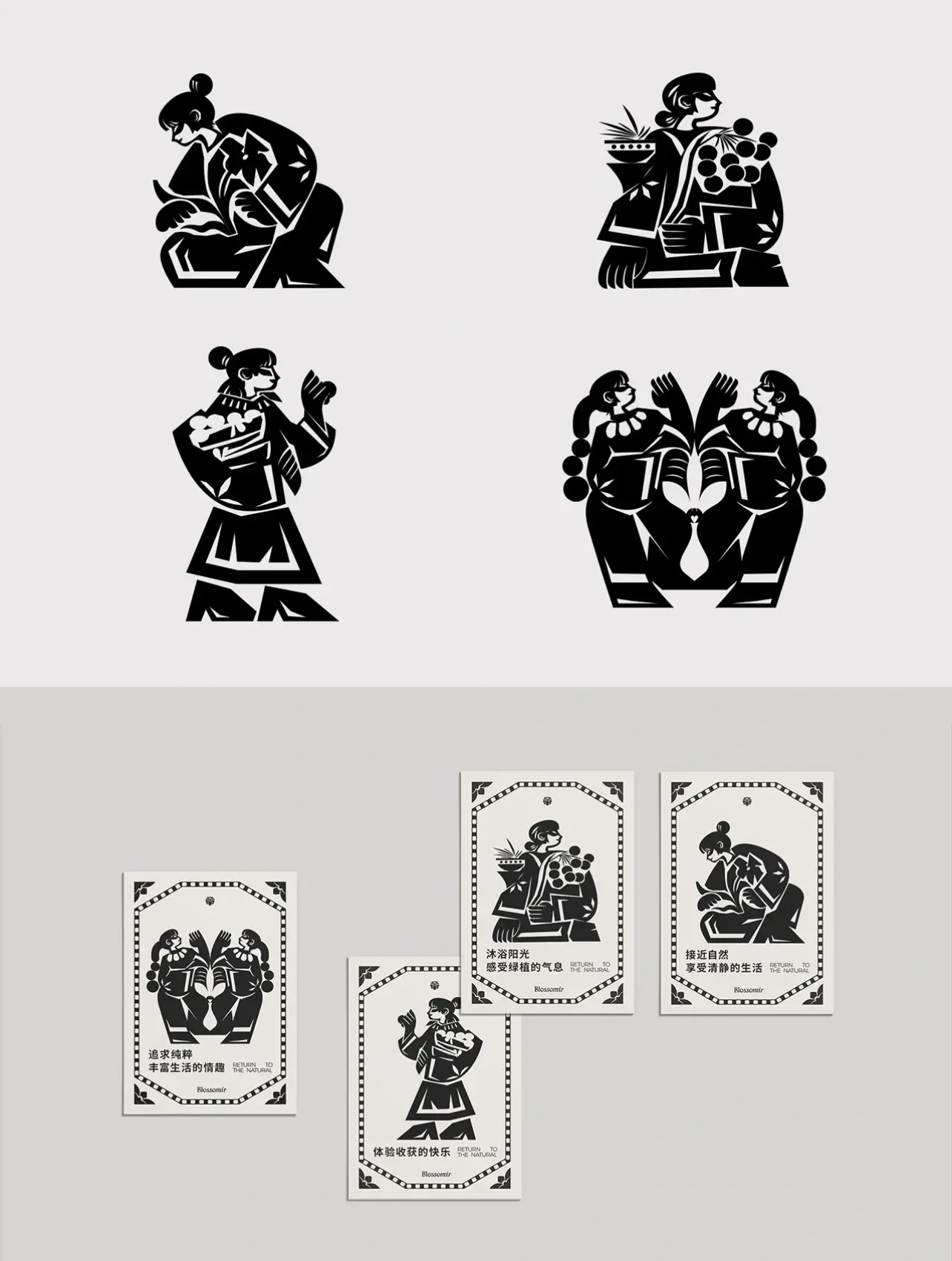 Blossomir的视觉设计沿用了“花木有情”的概念,将花植和中国传统剪纸相结合,以方圆为轮廓,采用对称的方式呈现,寓意“花开并蒂”,也象征“花开富贵”“花好月圆”。在当代的视觉语言中承载一些传统文化,在装点生活的同时,兼具温度品质,打造带有东方美学的生活氛围。作者希望通过 Blossomir 这个品牌,将东方美学理念带入到现代家庭园艺设计中,用当代的设计来讲述传统的故事。[1]
