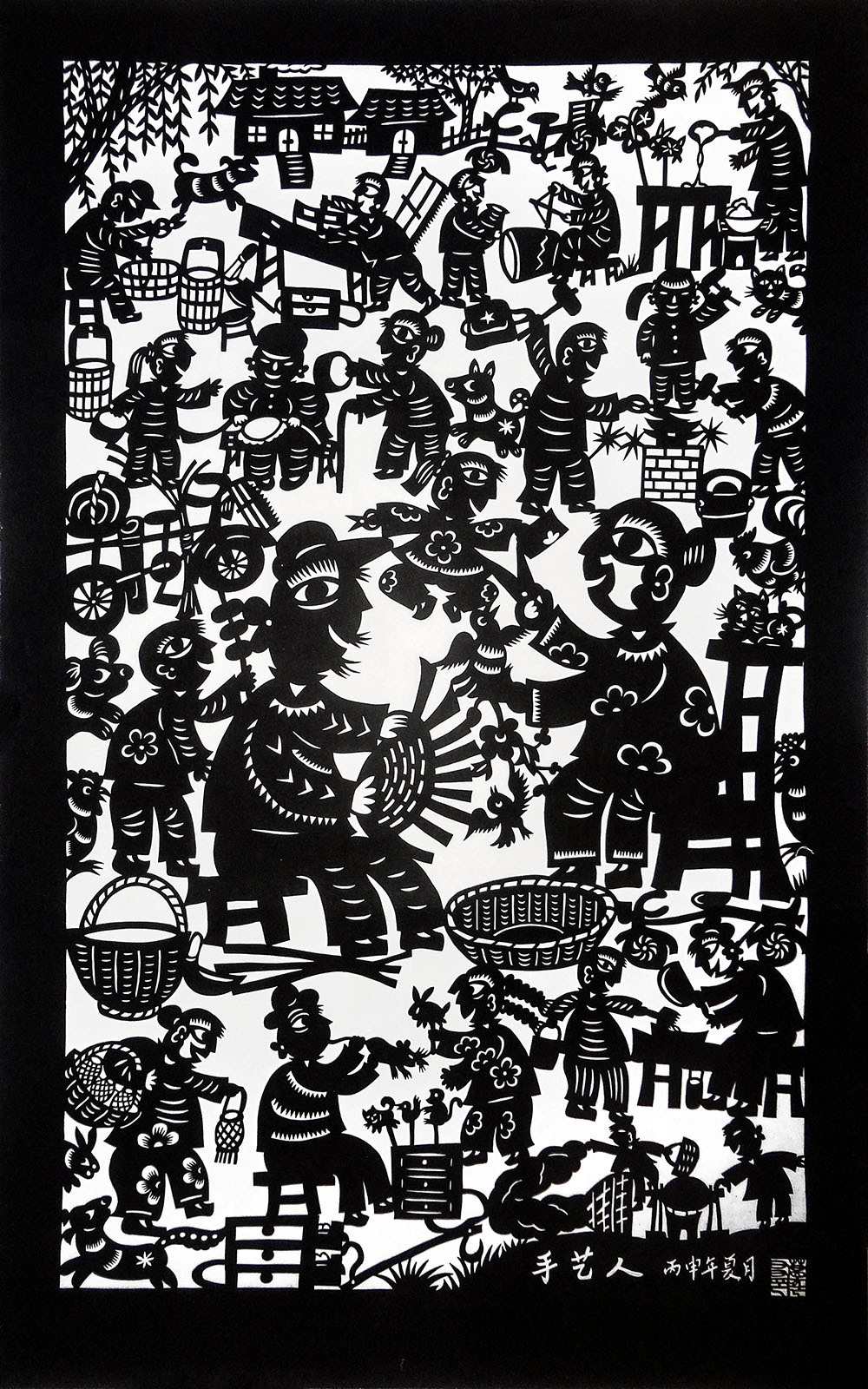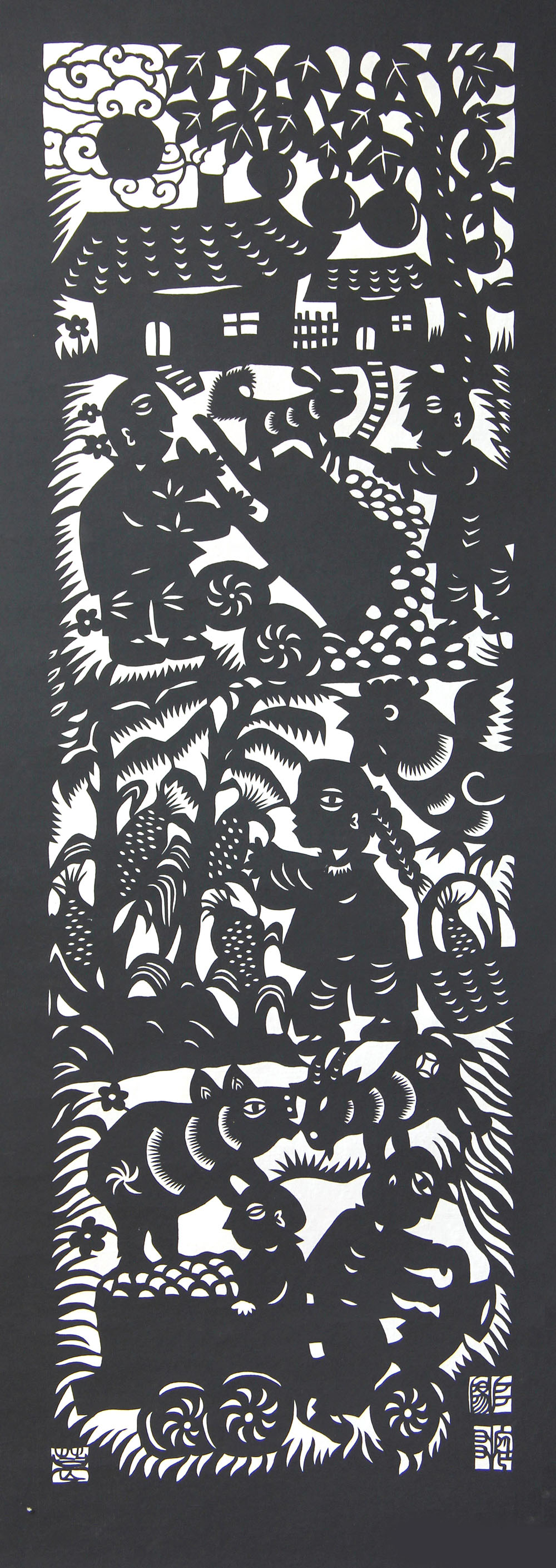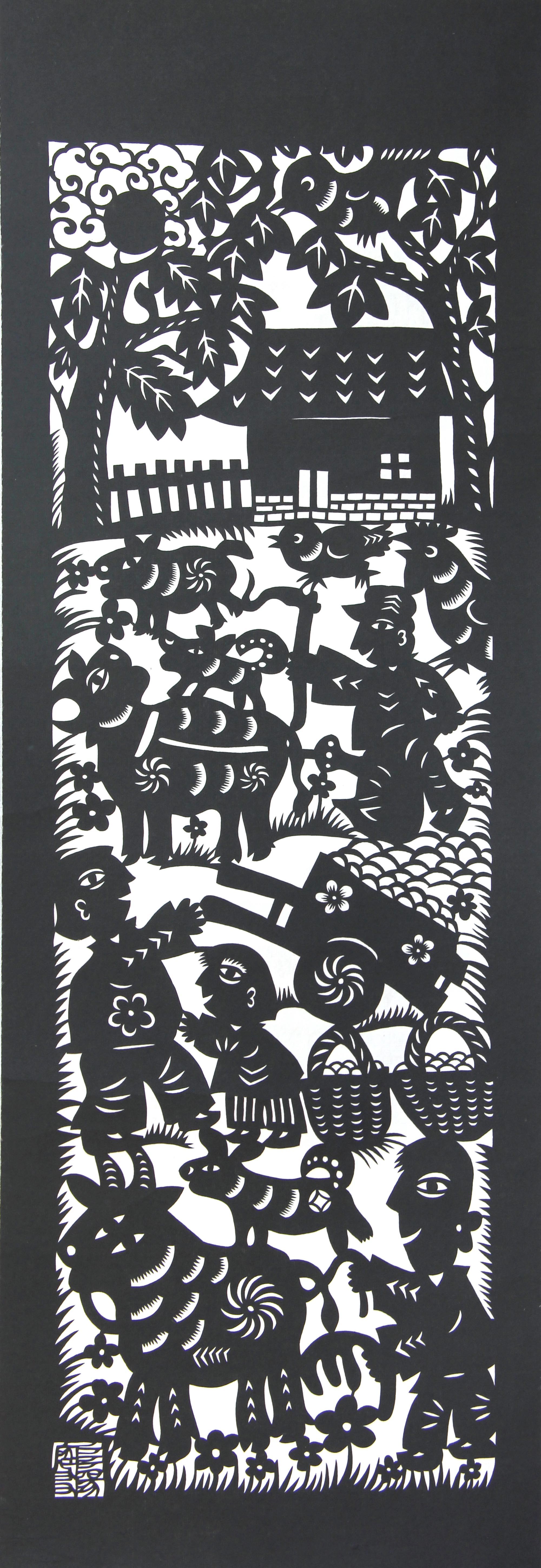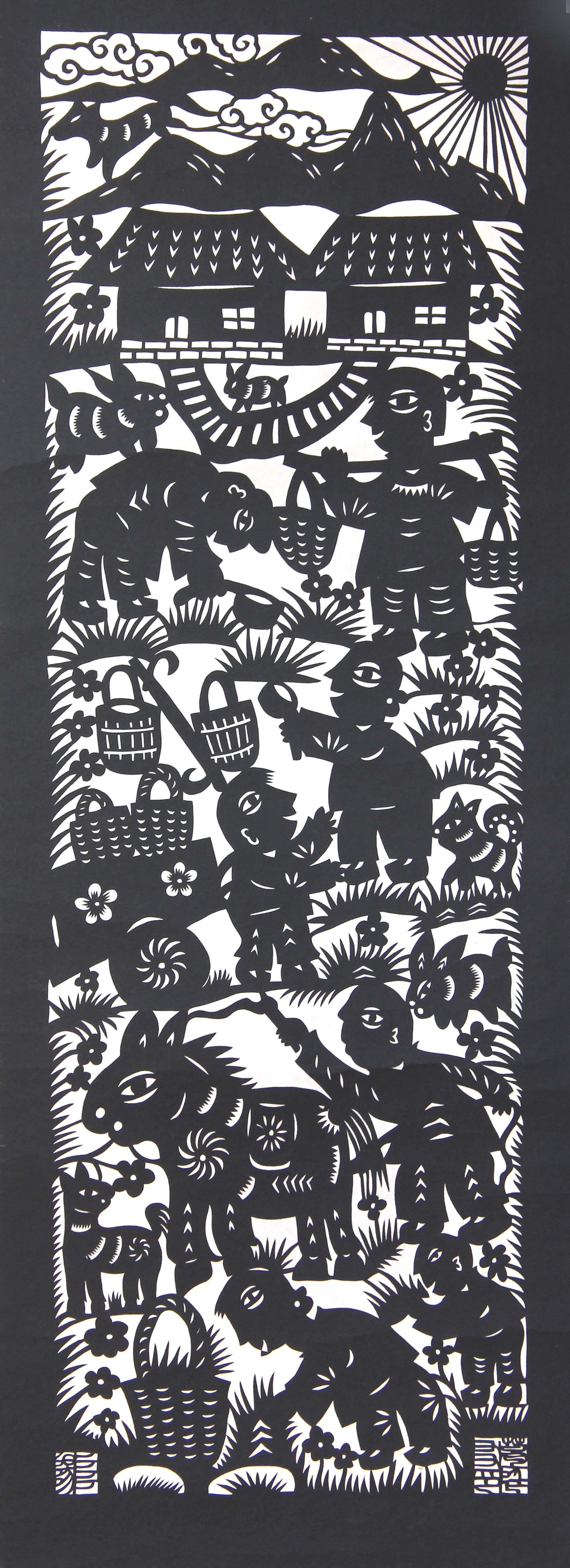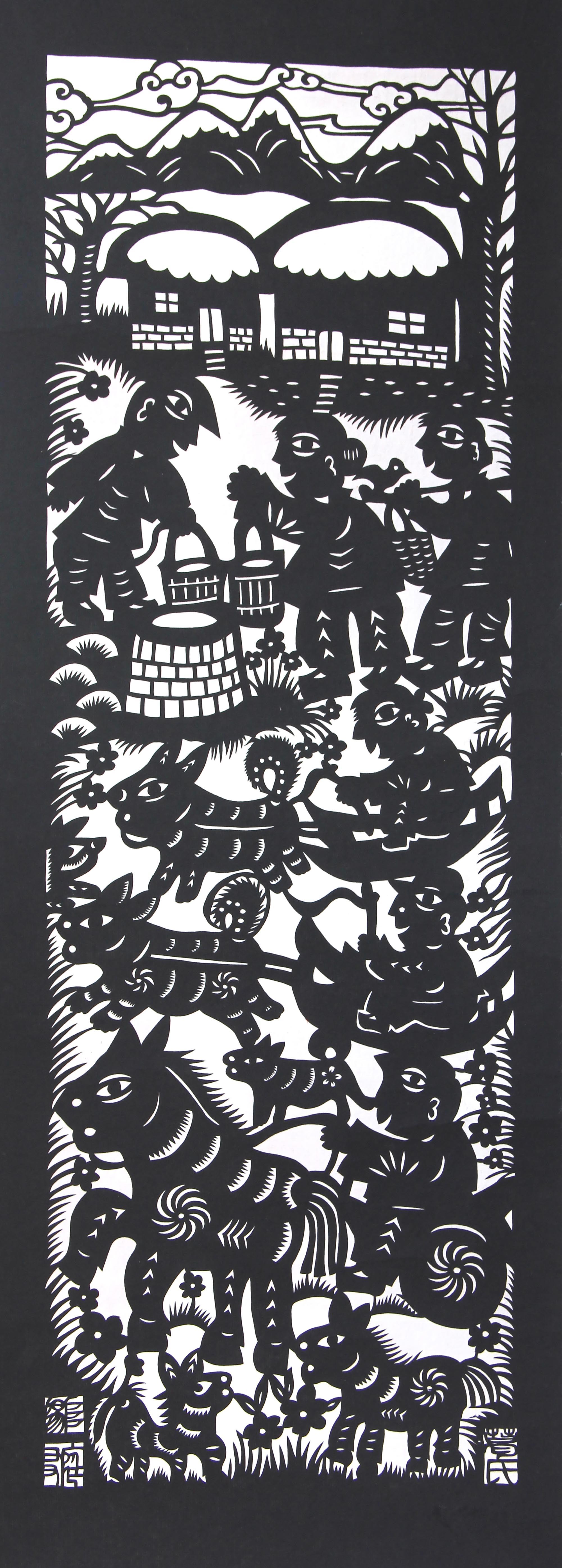 突出艺术特色:剪纸作品造型夸张意象、构图饱满、简洁传神、朴实厚重、装饰个性、富有乡土气息,具有朴素原始的艺术美,个人艺术特色鲜明。他拓展了剪纸的一刀剪、阴阳剪、旋转剪等剪纸的独特刀法,所剪内容更加广泛。