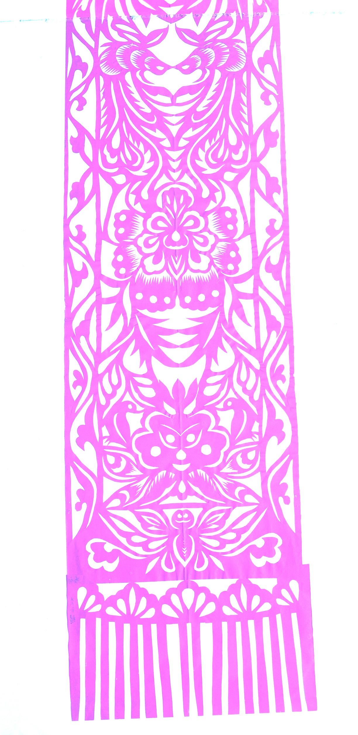 吴玉琴10岁时跟着奶奶学剪花样,每天晚上和奶奶熬到半夜。为学剪花,她的头发常常被煤油灯灯火烧焦。她学剪碗架云子花,开始照着奶奶的云子花剪,后来就自己画自己剪。碗架对子花是装饰碗架两边柱子的剪纸,高有150公分,宽35公分,多采用彩色纸平面拼贴的剪纸方法进行制作。是将花头、花叶、枝干、动物分开剪出,然后拼贴成一幅完整的画面,制作难度较大。她为了学作碗架对子花,每天废寝忘食。