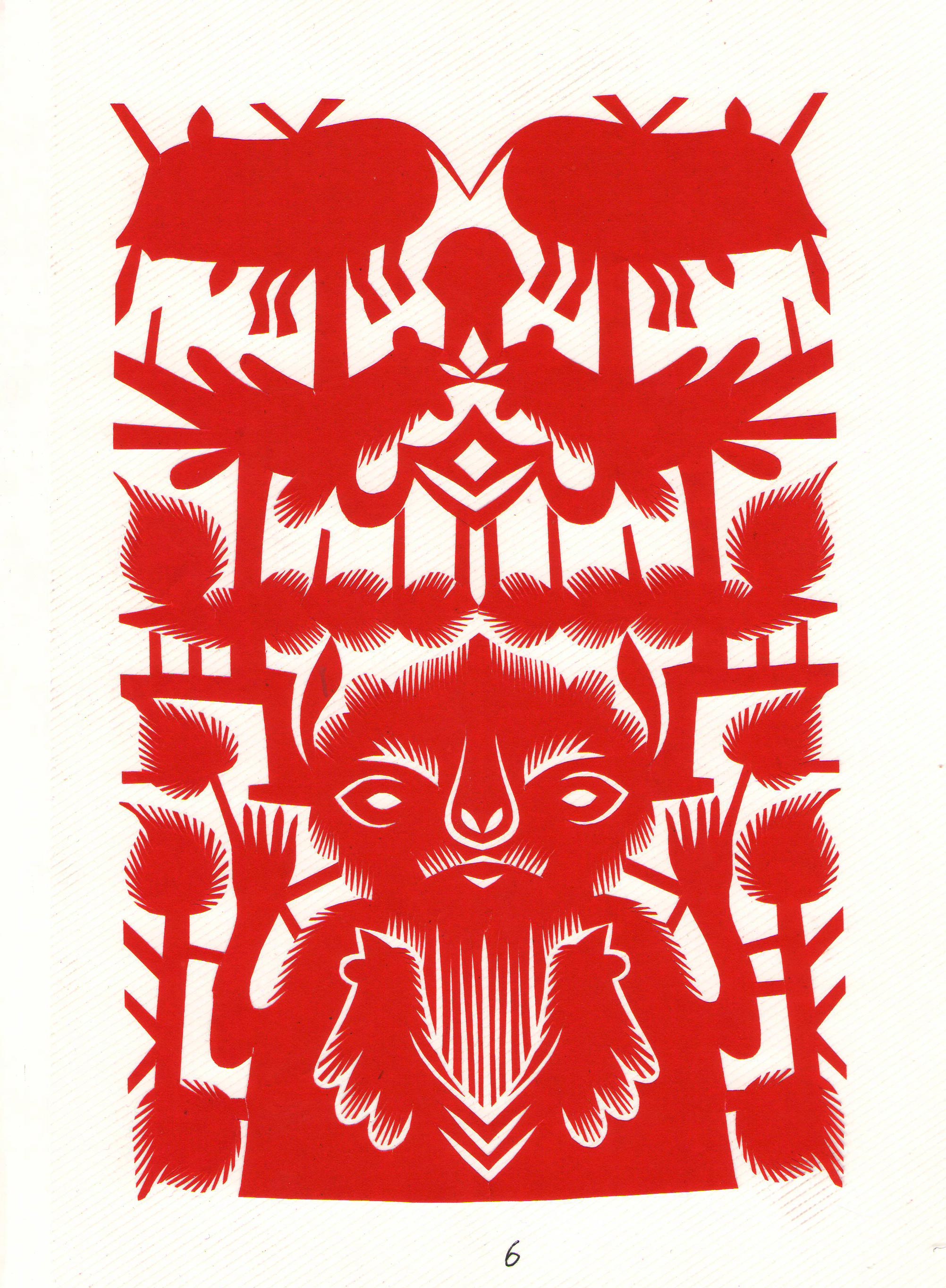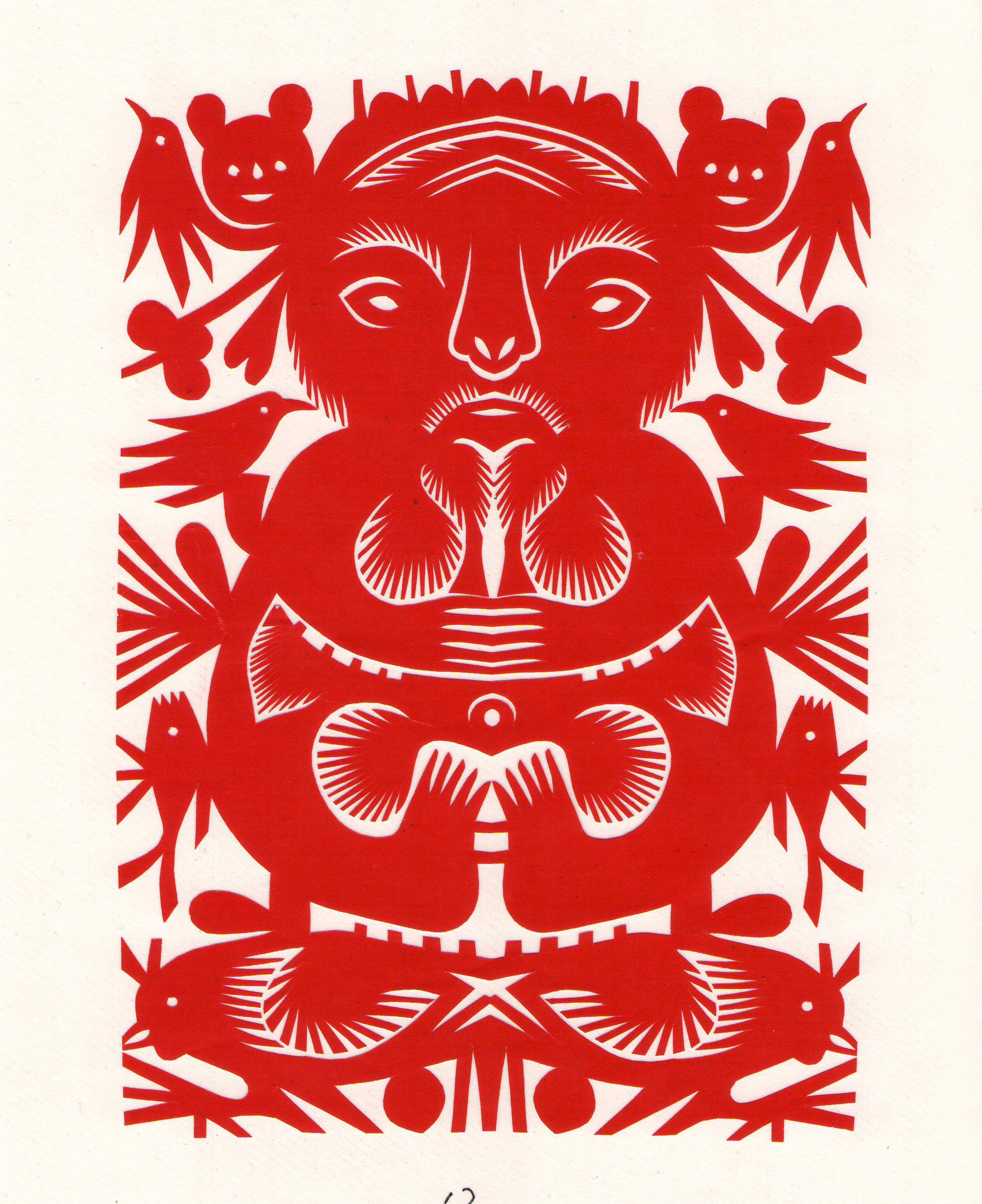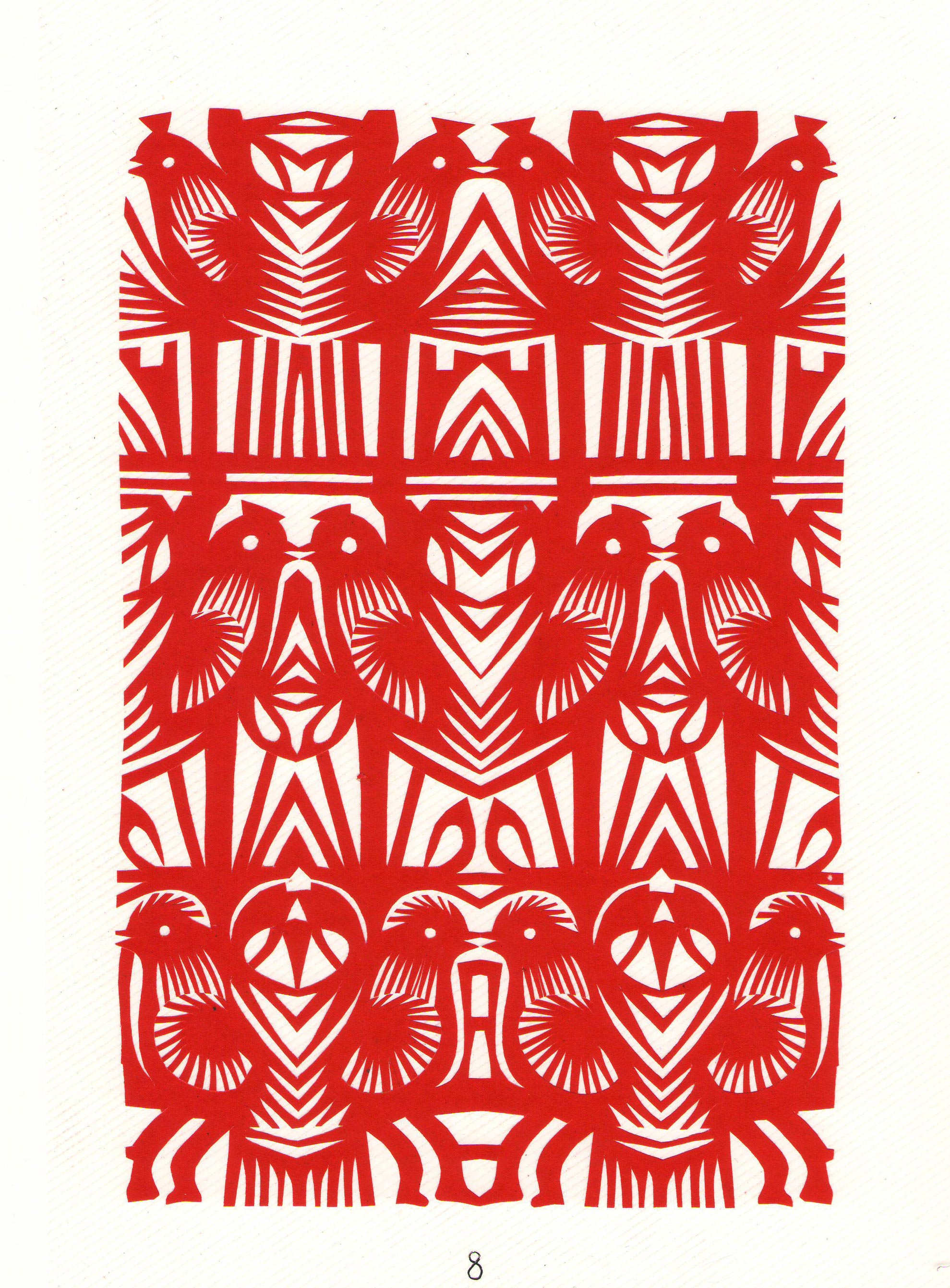 刘兰英将剪纸中常用的锯齿纹变形为长而无尖的装饰纹,像似一排排细线组成的几何形体,与简洁、圆润、原始、稚趣、大气的造型相结合,形成了质朴、阳刚、对称,连续的剪纸艺术之美。