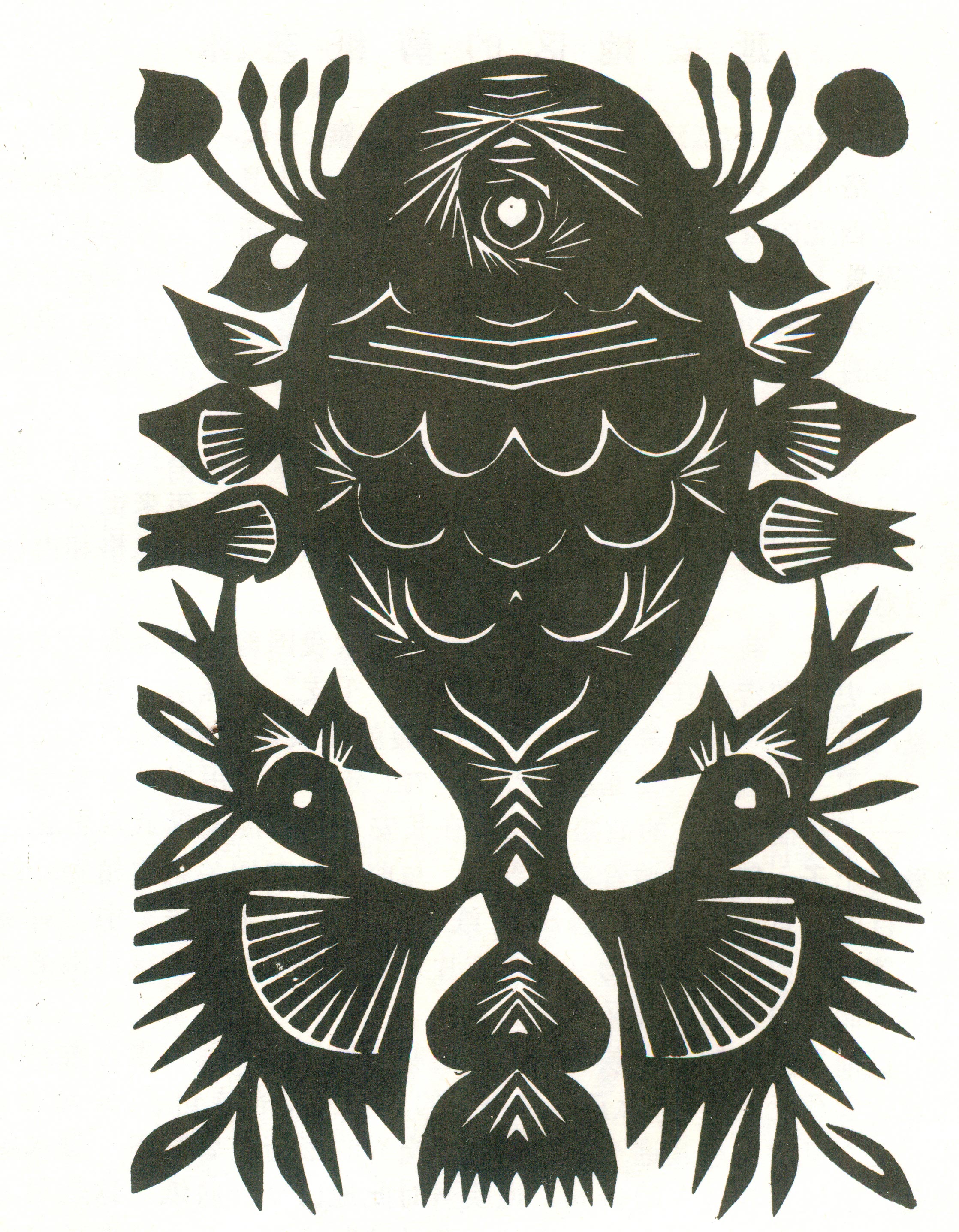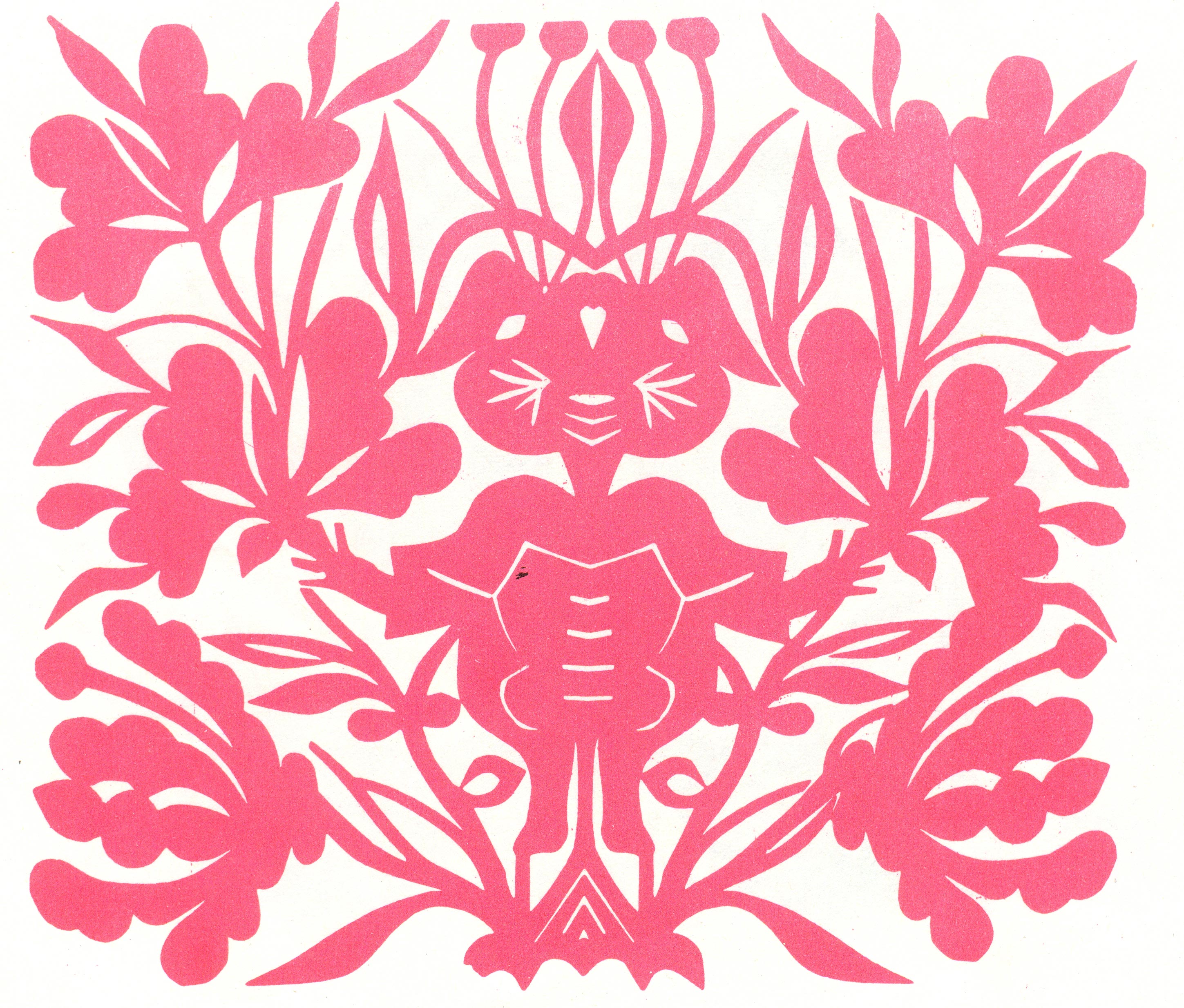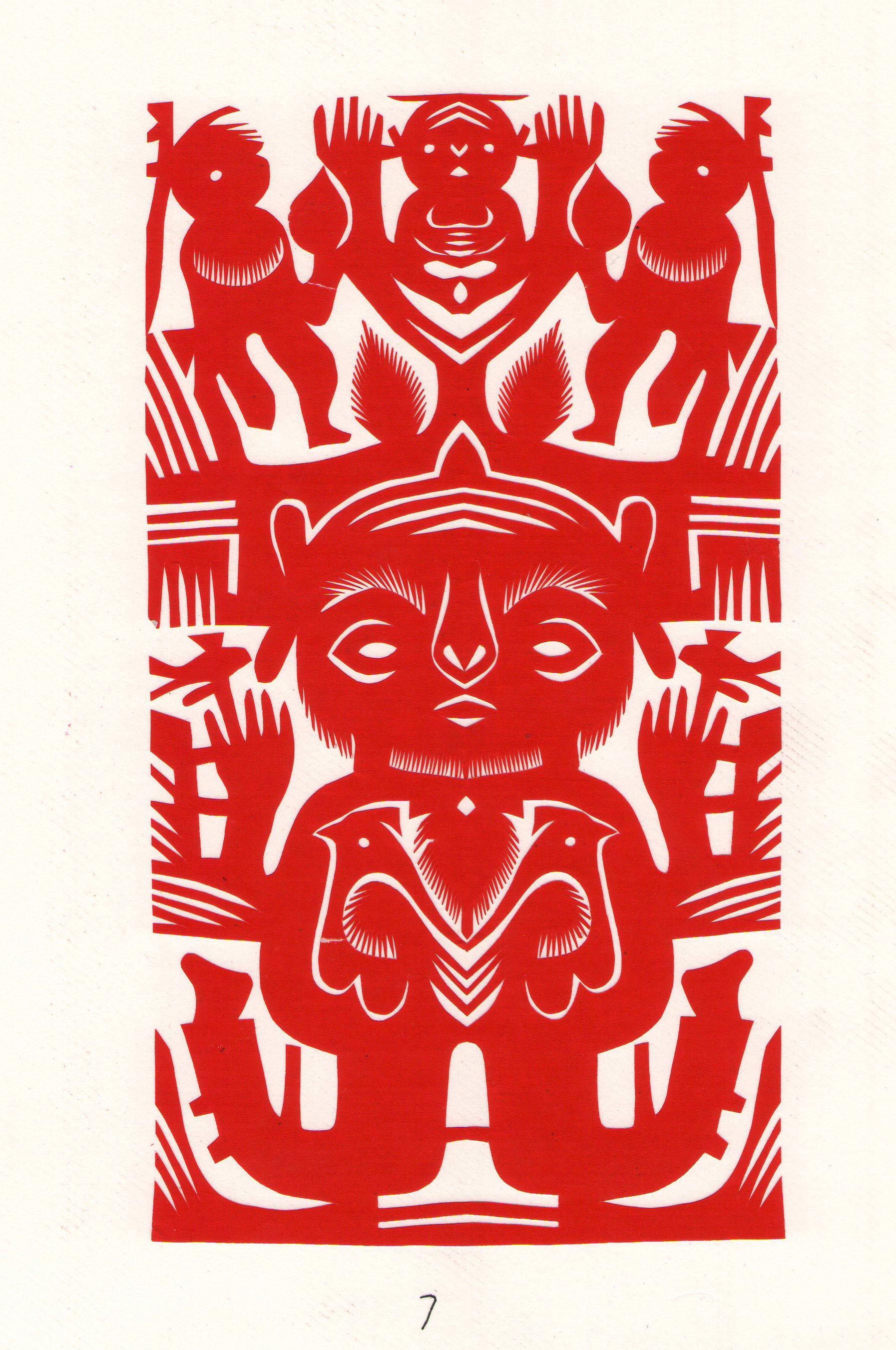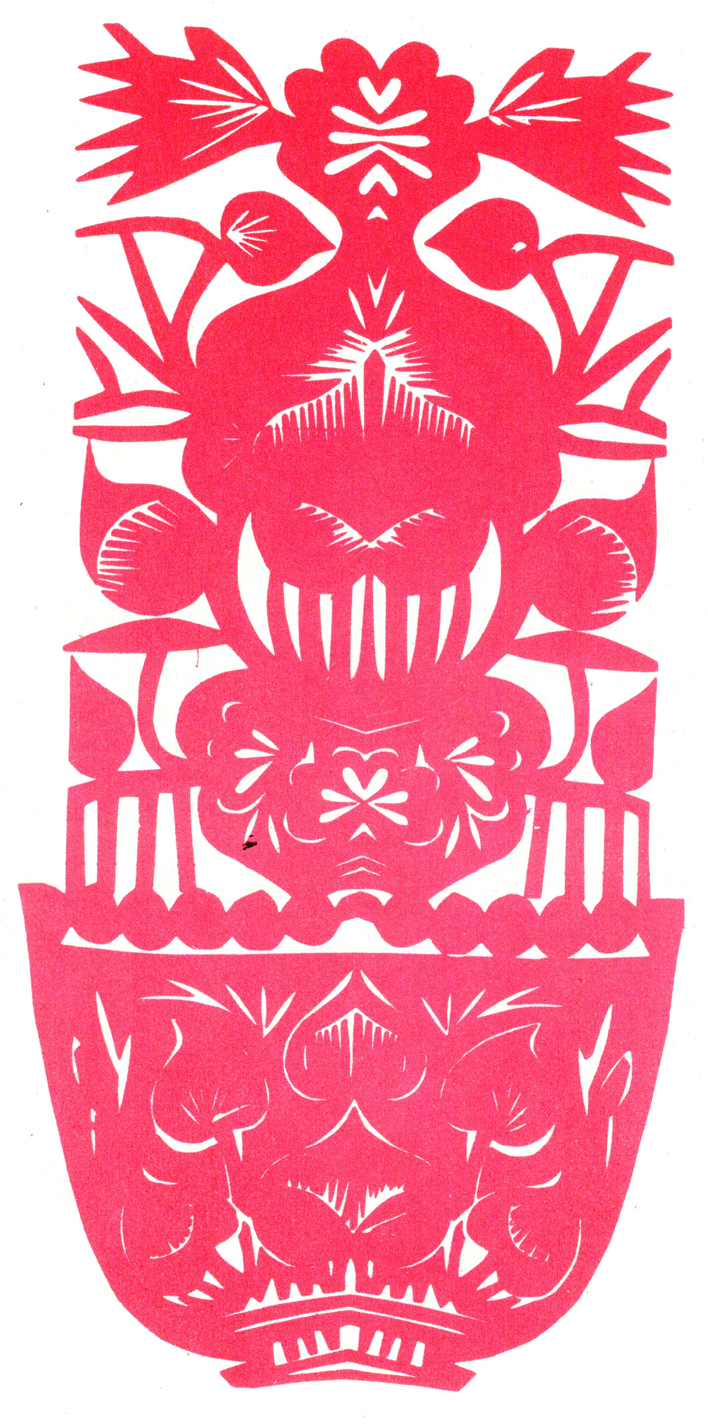 刘兰英将剪纸中常用的锯齿纹变形为长而无尖的装饰纹,像似一排排细线组成的几何形体,与简洁、圆润、原始、稚趣、大气的造型相结合,形成了质朴、阳刚、对称,连续的剪纸艺术之美。
