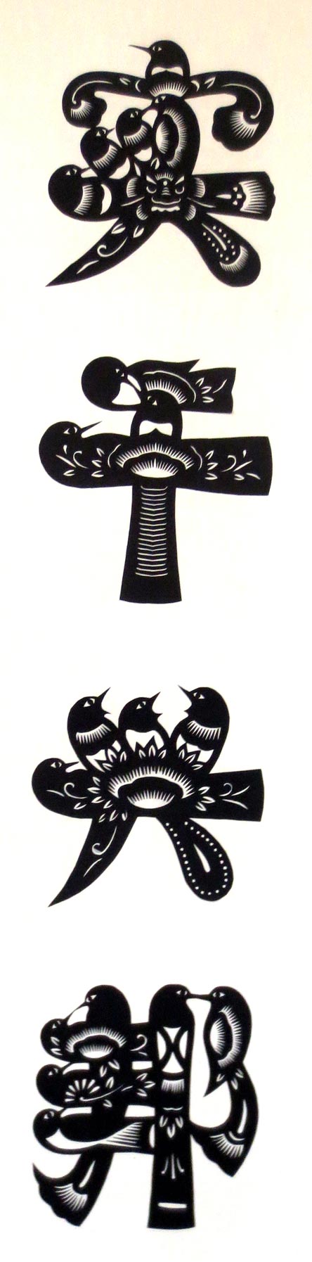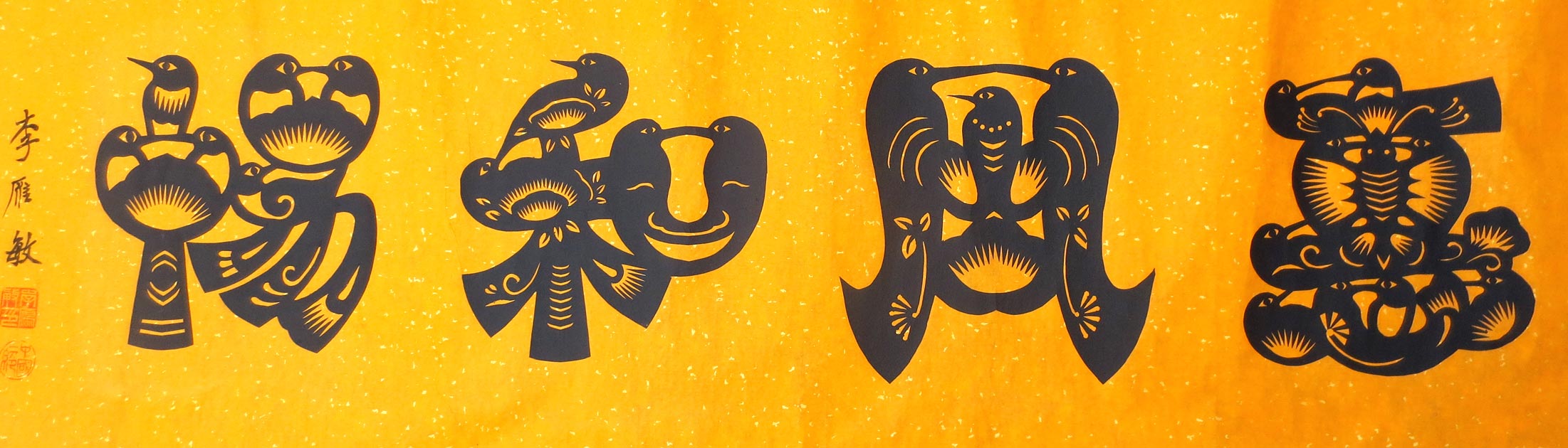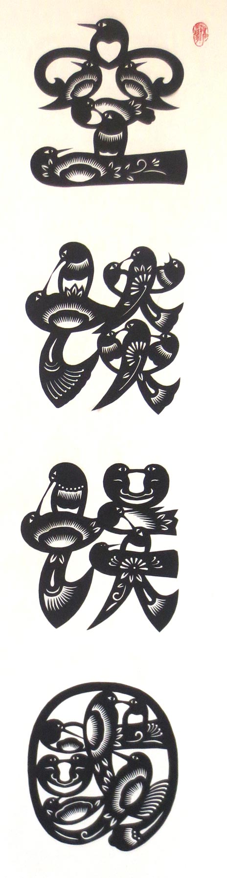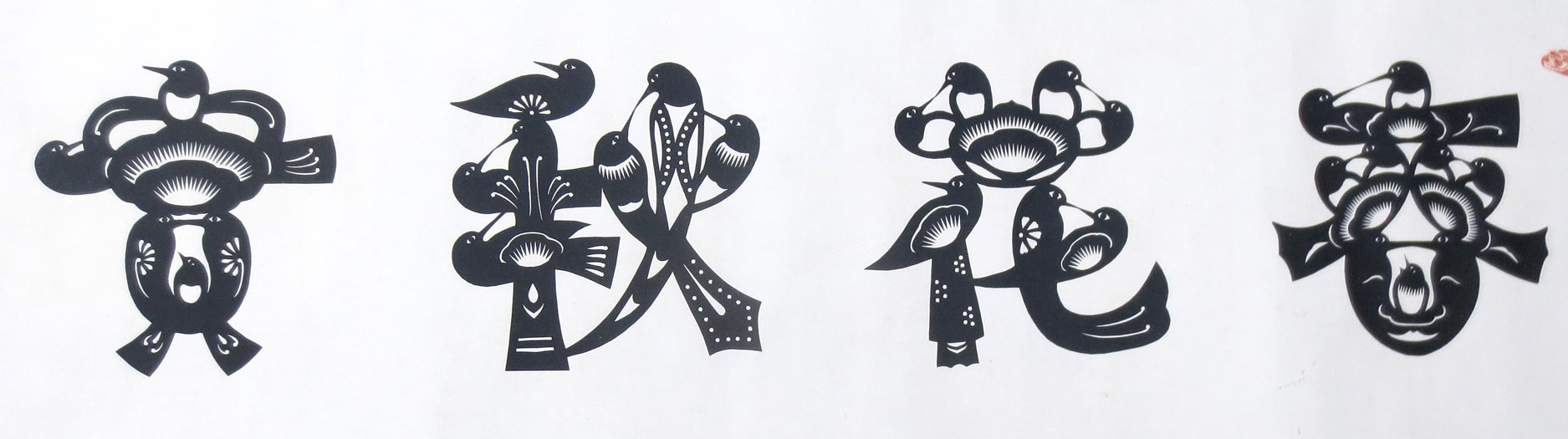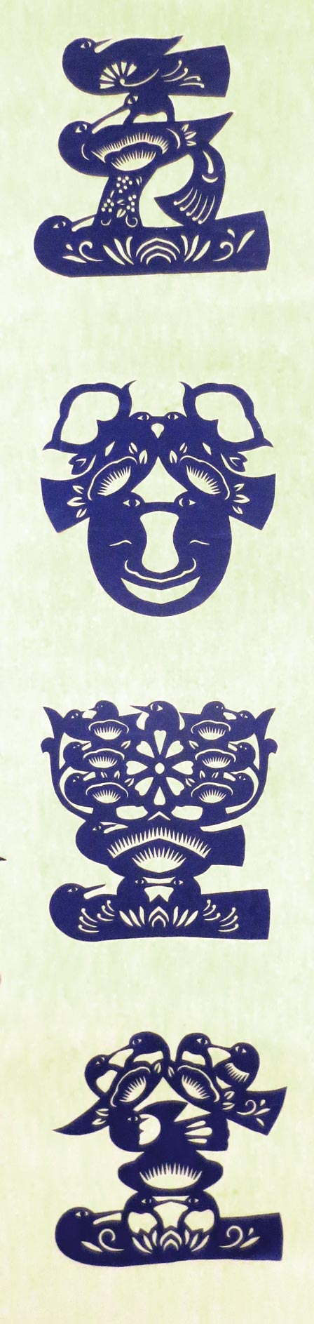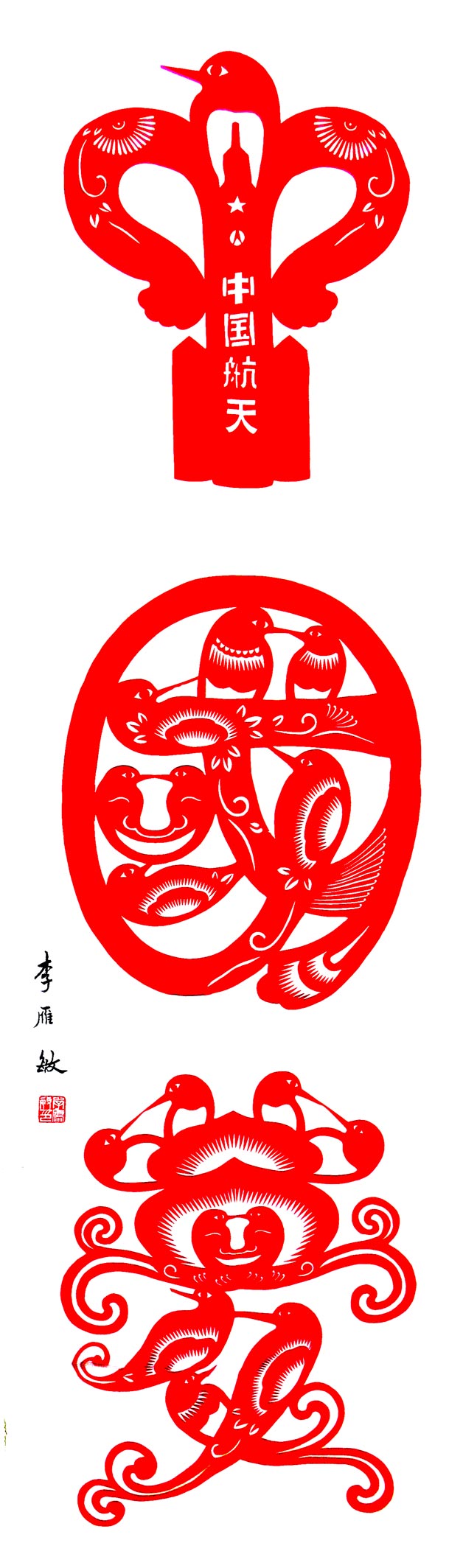 李雁敏的剪纸及“鹊鸟字”剪纸造型粗犷质朴、构思巧妙新颖,结体严谨,形成了自己鲜明的剪纸风格。