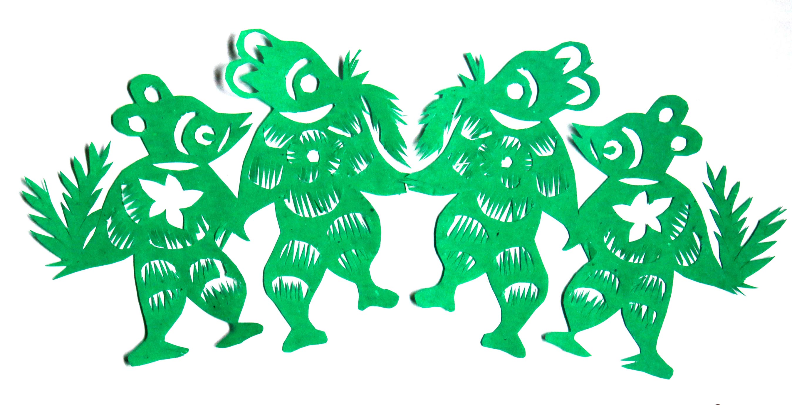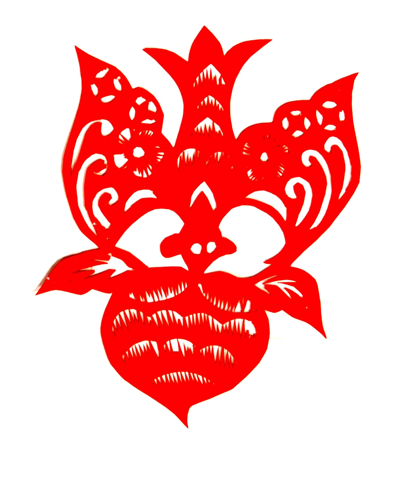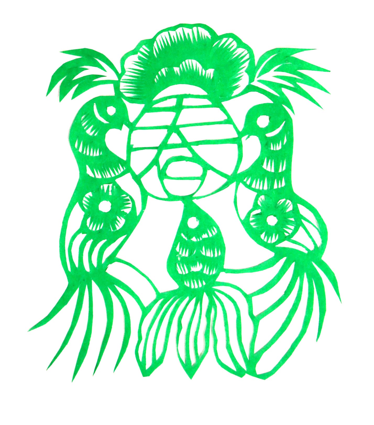 马建玲的剪纸造型生动自然,粗犷大气,装饰没有程式,画面有点有线,灵动随意,形成了自己较鲜明的艺术风格。