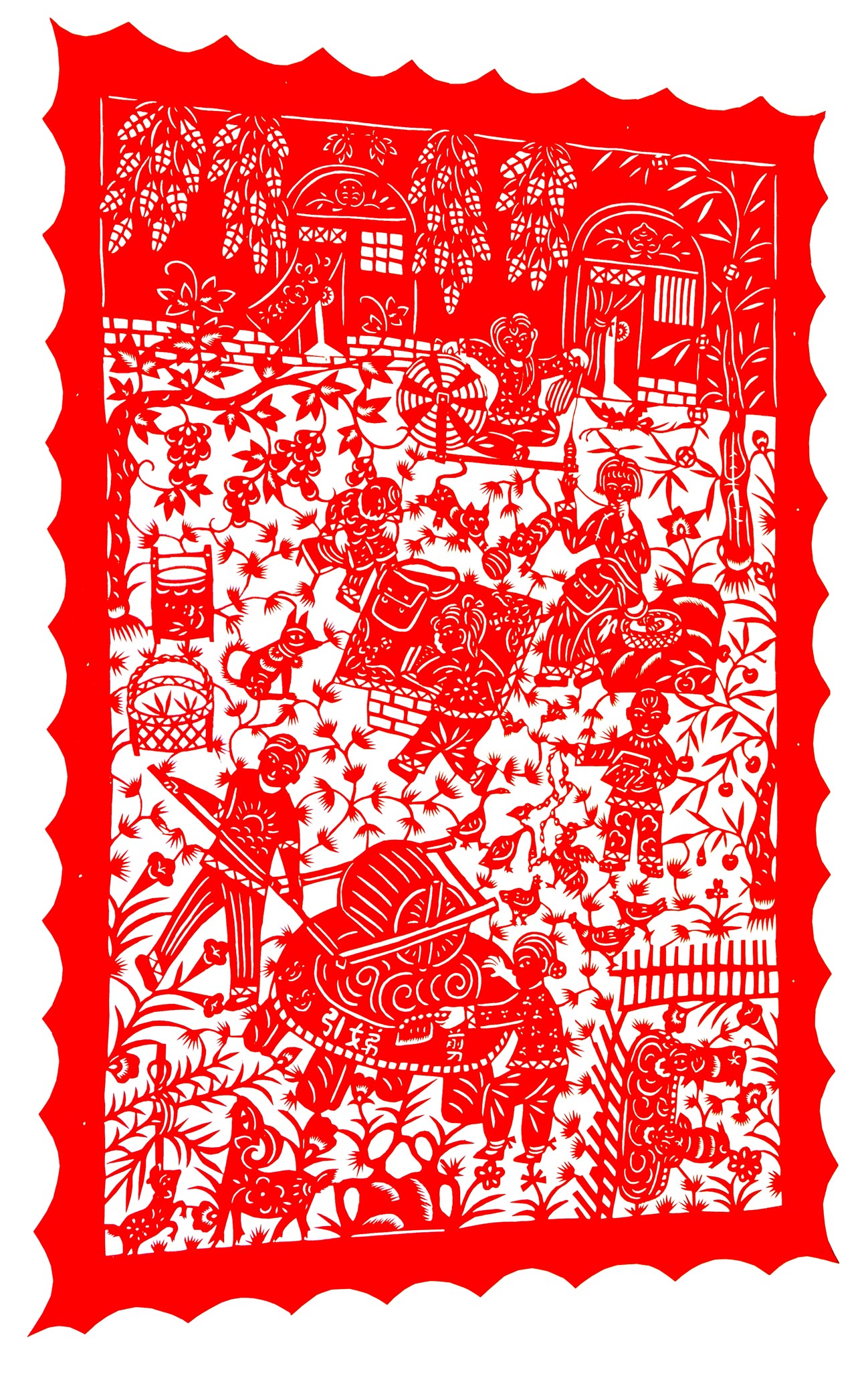 徐引娣的剪纸造型生动淳朴、生活情趣浓郁,构思新颖,构图丰满,给人一种亲切的美感。