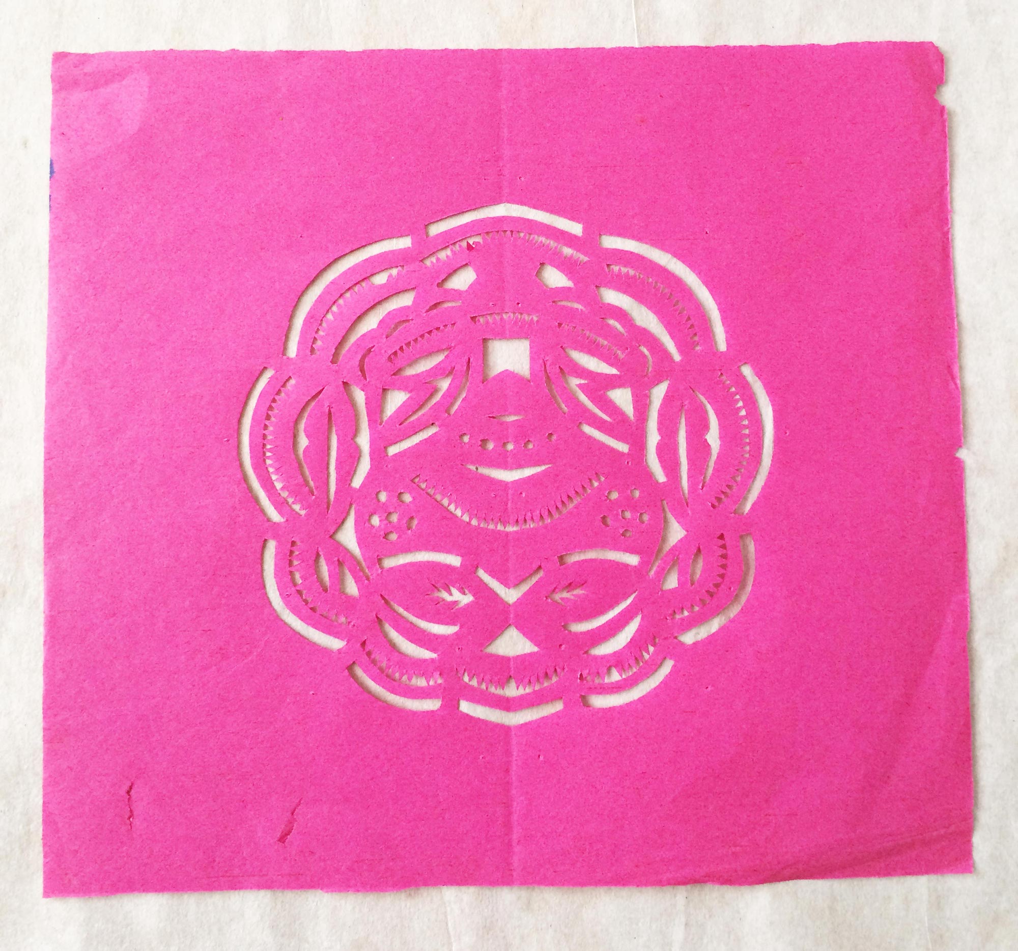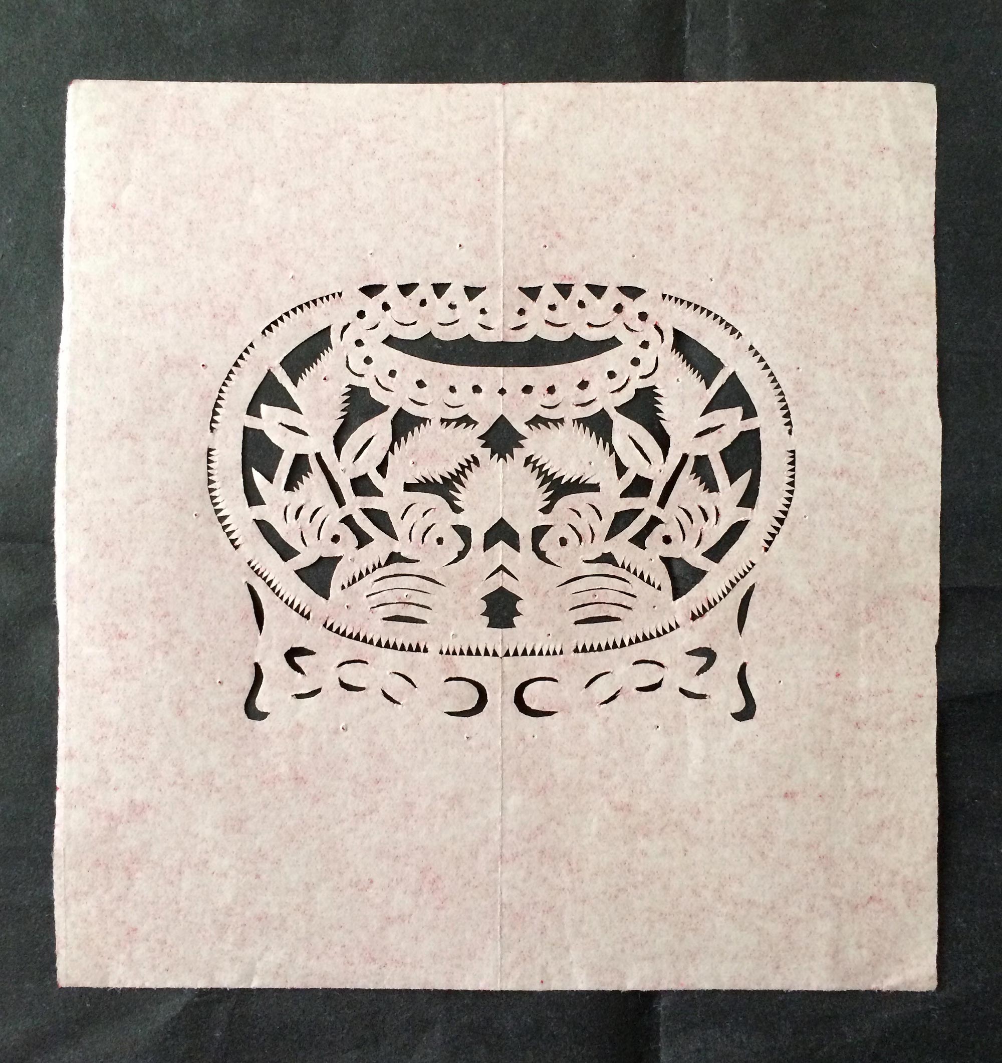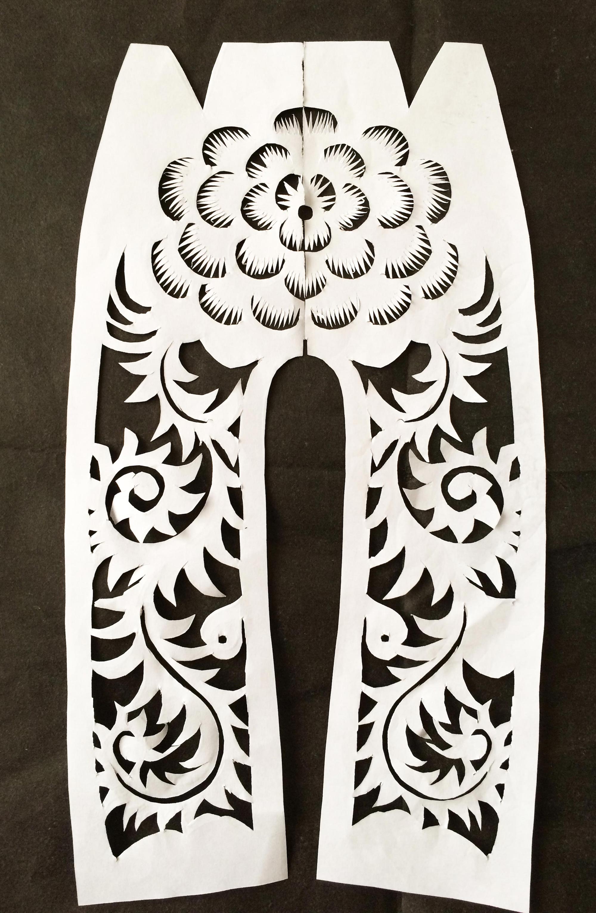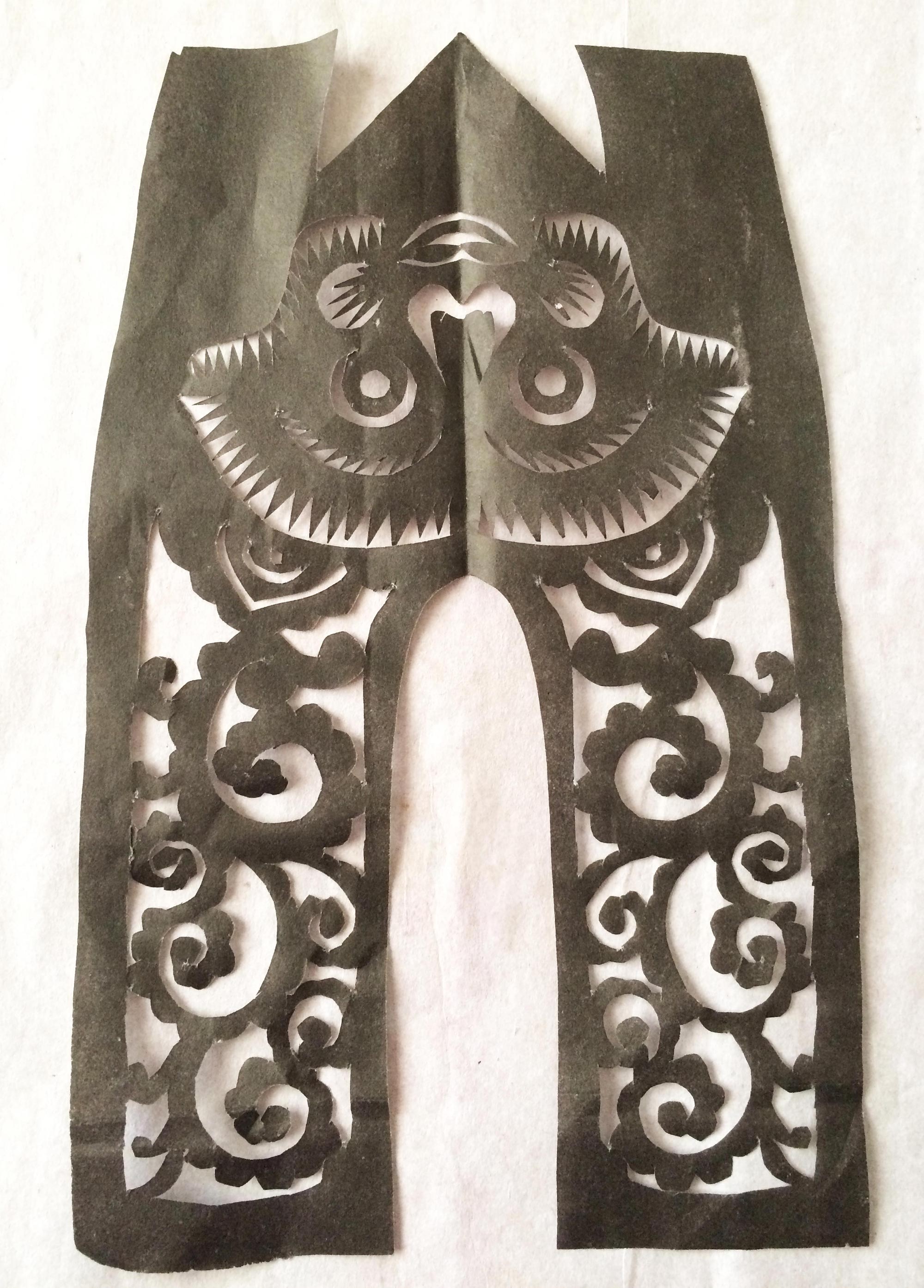 雷蓬岗,男,1992年生,汉族。雷鹏岗家是当地老户,祖辈农民。父亲有制香的手艺,母亲会纸扎工艺,会剪花、会刺绣,还会用木刻版印制冥币。改革开放后,母亲在镇上开了家纸扎工艺店,经销丧葬纸扎工艺品和香蜡纸表。大姑和二姑手都很巧,会剪会绣,还会草编工艺。雷鹏岗兄弟两个,他是老二。受家庭影响,从小对剪纸感兴趣,父母在做纸活时,他拿起剪刀学着剪一点简单的花草图样。13岁时,村上几位老奶奶给庙上剪糊神衣神袍,糊神靴神帽,衣袍上精美古朴的剪纸图案深深地吸引着他,老奶奶精湛的剪花技艺使他着魔。老奶奶们剪糊衣袍鞋帽剪糊了三天,他跟着看了三天,学到了不少传统纹样的剪法,对剪糊庙宇用的剪纸的方法步骤及样式有了一些了解。
