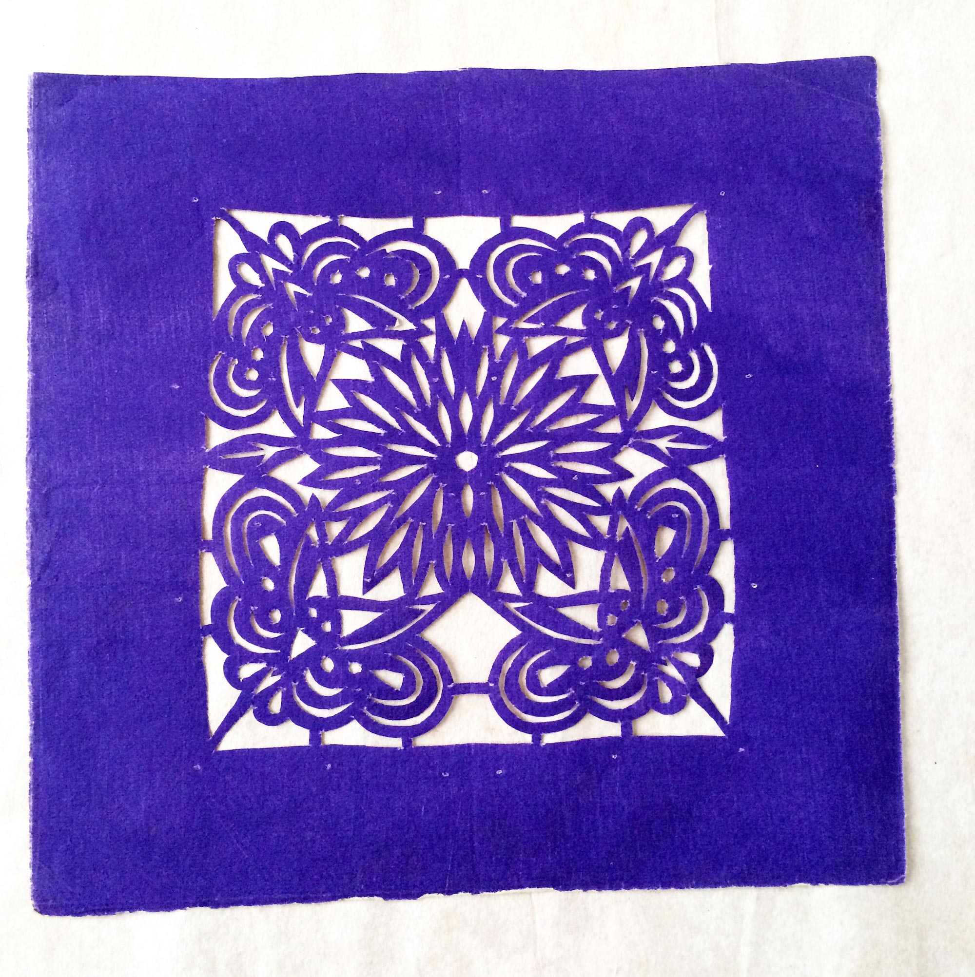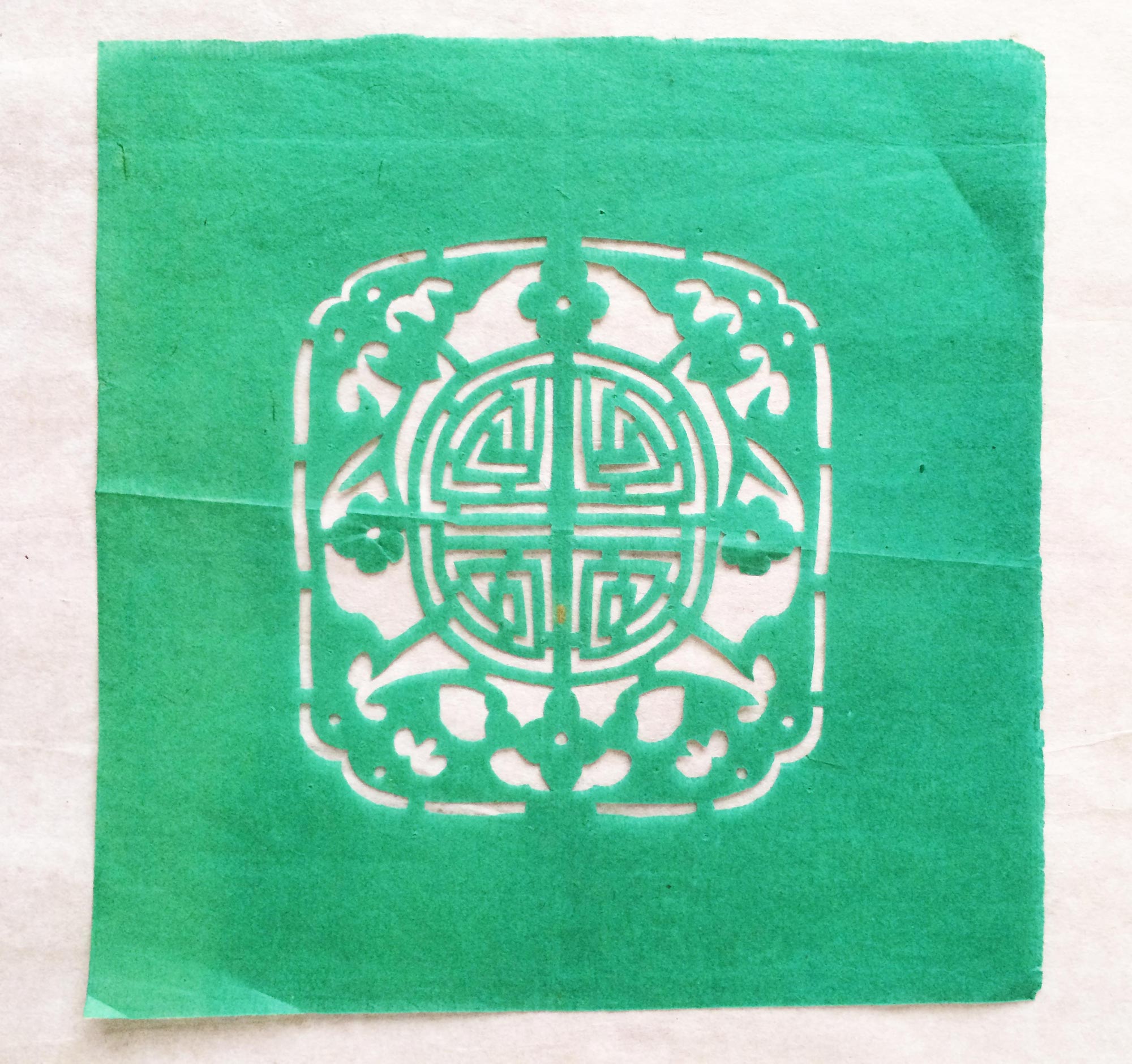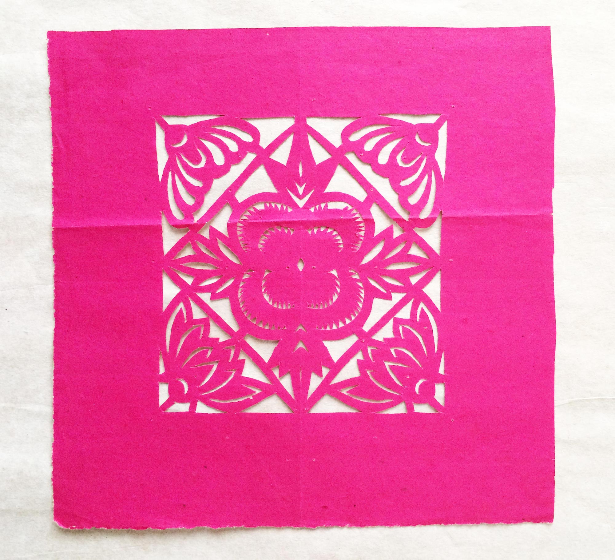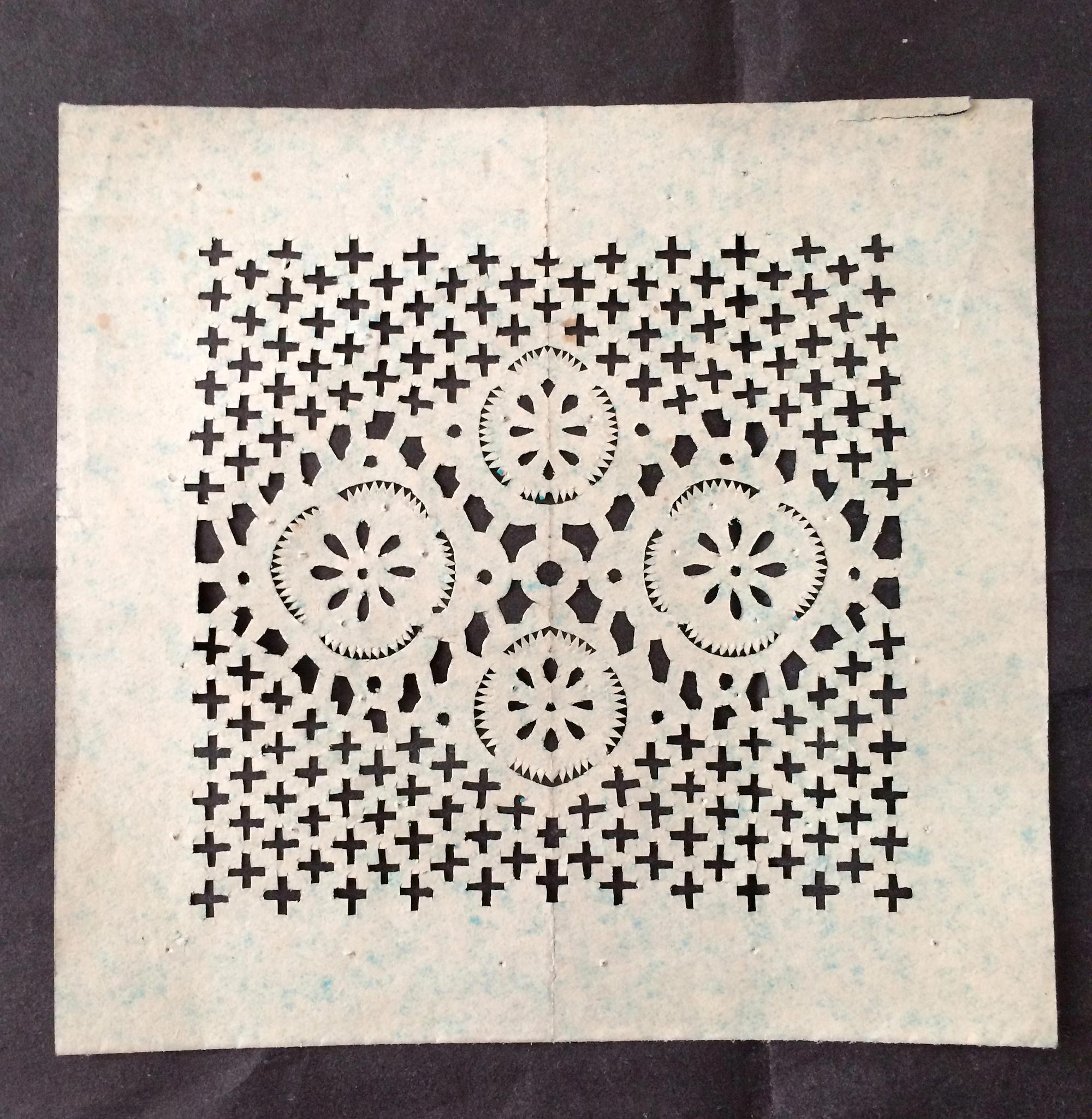 雷蓬岗,男,1992年生,汉族。雷鹏岗家是当地老户,祖辈农民。父亲有制香的手艺,母亲会纸扎工艺,会剪花、会刺绣,还会用木刻版印制冥币。改革开放后,母亲在镇上开了家纸扎工艺店,经销丧葬纸扎工艺品和香蜡纸表。大姑和二姑手都很巧,会剪会绣,还会草编工艺。雷鹏岗兄弟两个,他是老二。受家庭影响,从小对剪纸感兴趣,父母在做纸活时,他拿起剪刀学着剪一点简单的花草图样。13岁时,村上几位老奶奶给庙上剪糊神衣神袍,糊神靴神帽,衣袍上精美古朴的剪纸图案深深地吸引着他,老奶奶精湛的剪花技艺使他着魔。老奶奶们剪糊衣袍鞋帽剪糊了三天,他跟着看了三天,学到了不少传统纹样的剪法,对剪糊庙宇用的剪纸的方法步骤及样式有了一些了解。