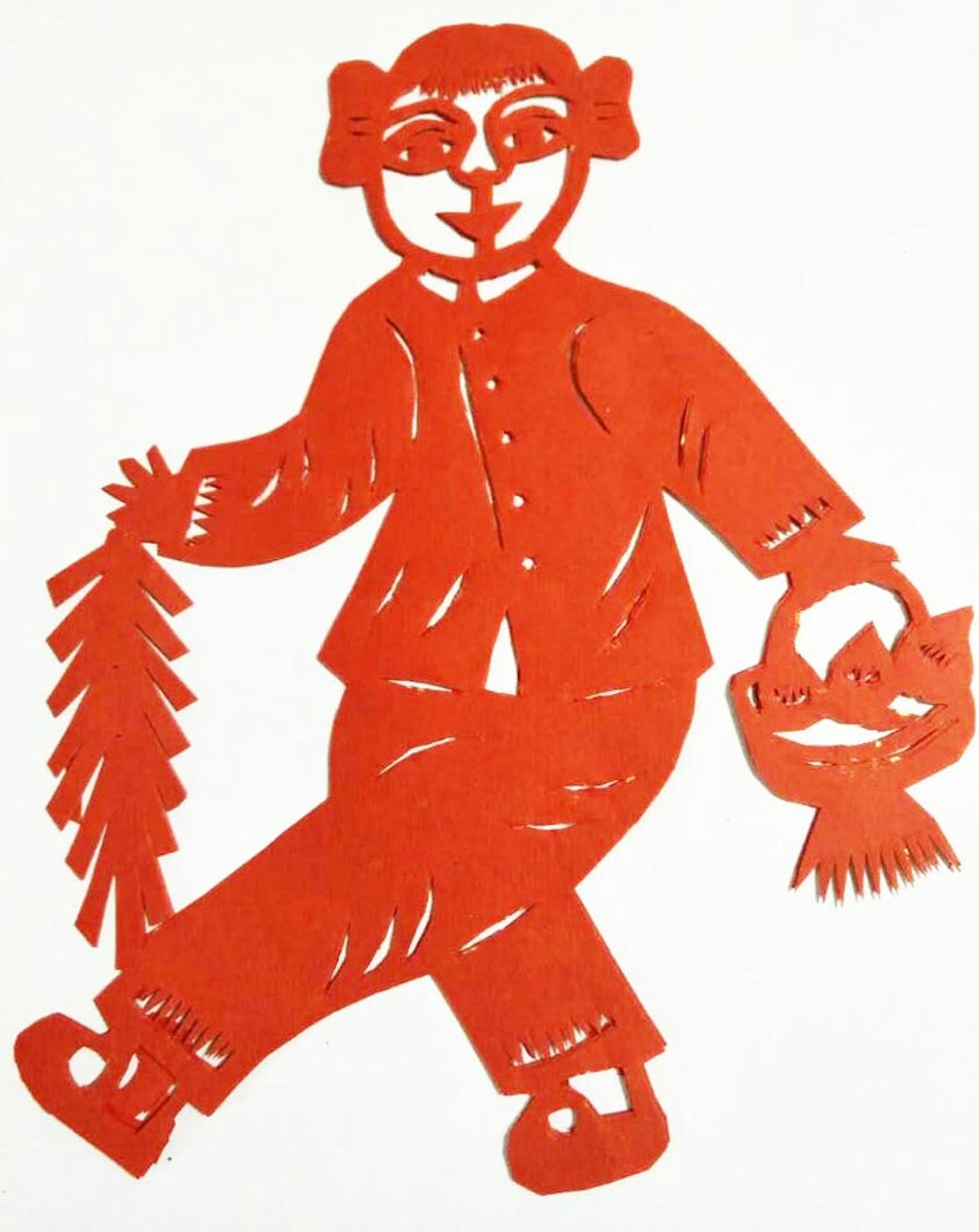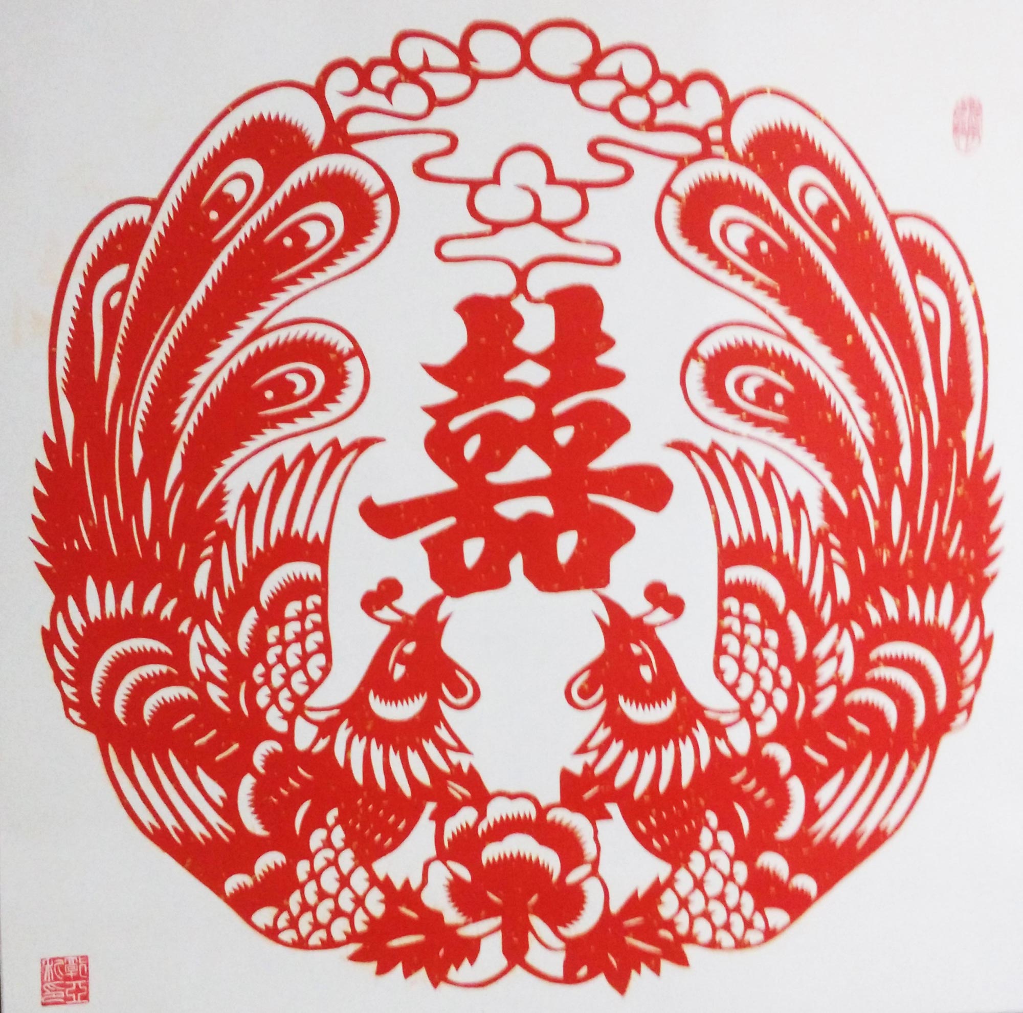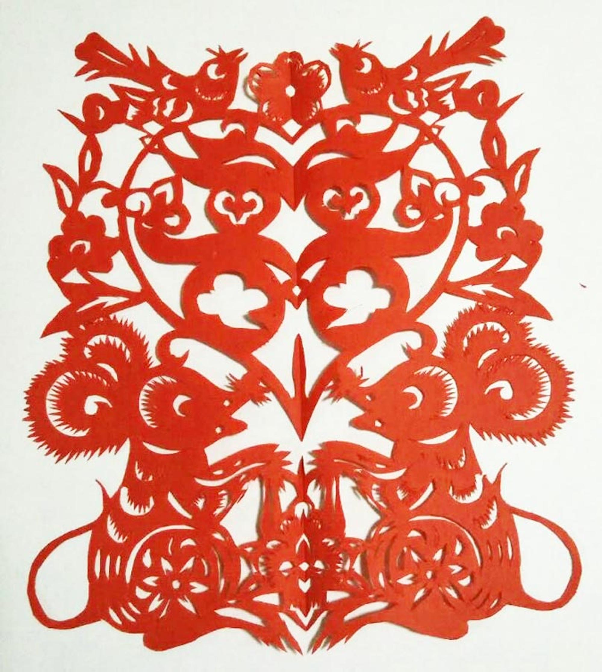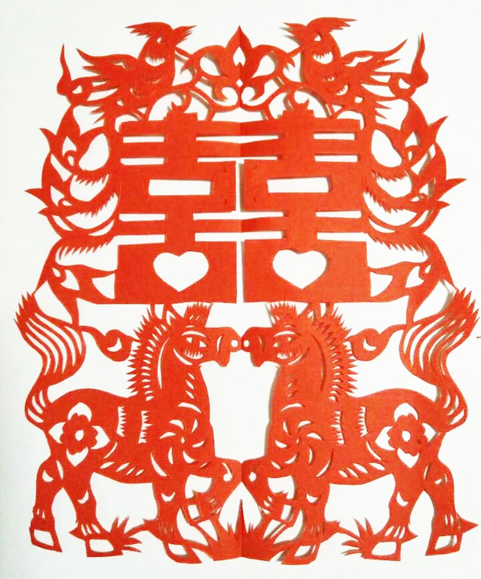 郭亚利,女,1974年8月20日生,汉族。家中姊妹3人,她排行老二,有一姐一弟,都不会剪纸。母亲会简单剪纸刺绣,都是小时候自学。郭亚利8岁上学,上了九年,初中毕业,放学放假常期帮家里干活。十岁开始学剪纸,十三四岁开始学刺绣。小时候特别喜欢剪纸,但因家庭贫穷,母亲舍不得把剪刀给孩子乱用,她就用指甲撕花,撕各种图案,团花、喜字,自己学,第一幅撕的是喜字,用笔写下来照着撕的。学的时候什么都剪,有空的时候就剪,但父母不支持她学剪纸。都是偷着自己剪,直到婚后有了自由,才开始认真剪纸。当时冒剪还不熟练,因为在城里居住,那时已经没有太多贴窗花的习俗。