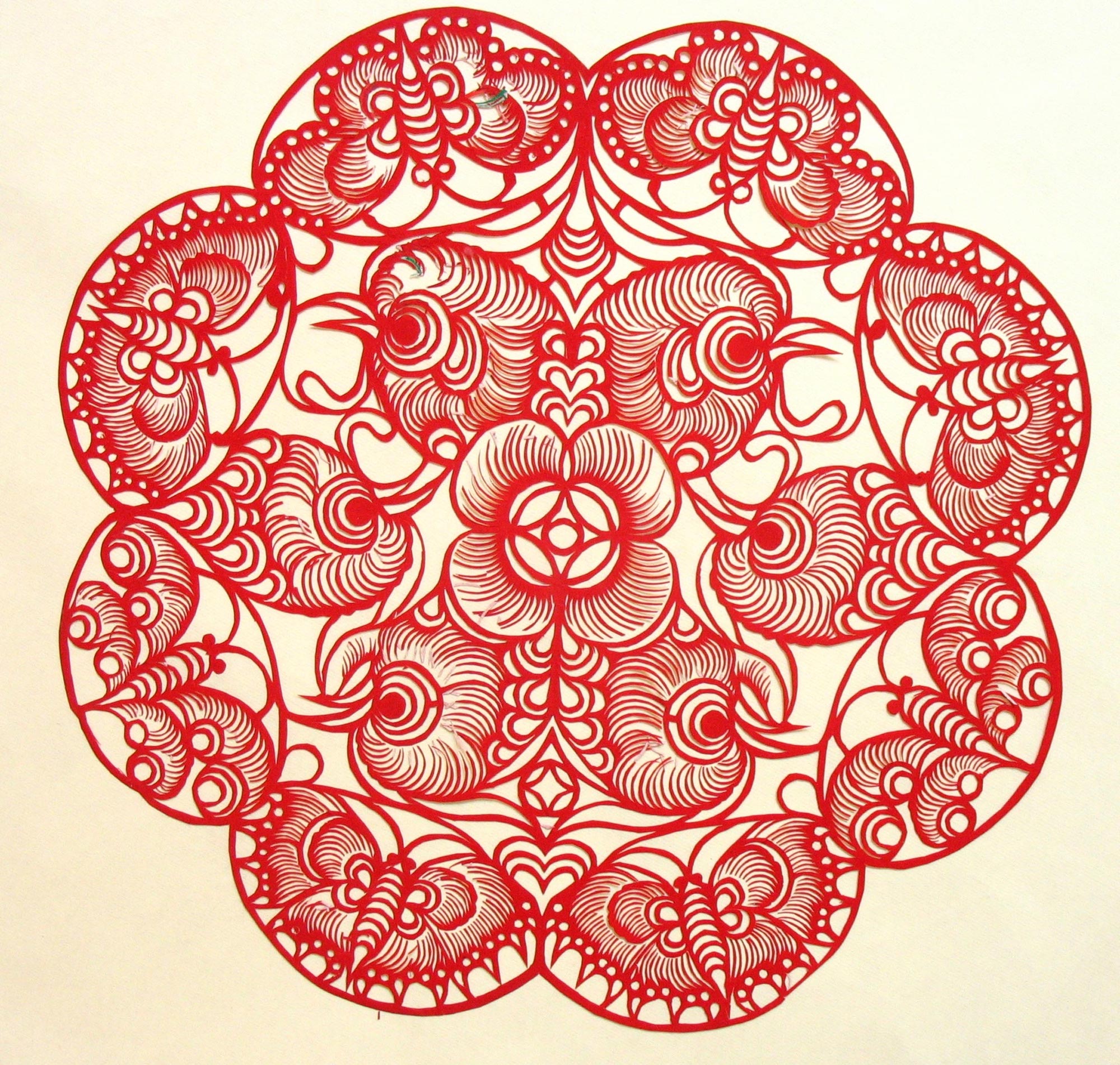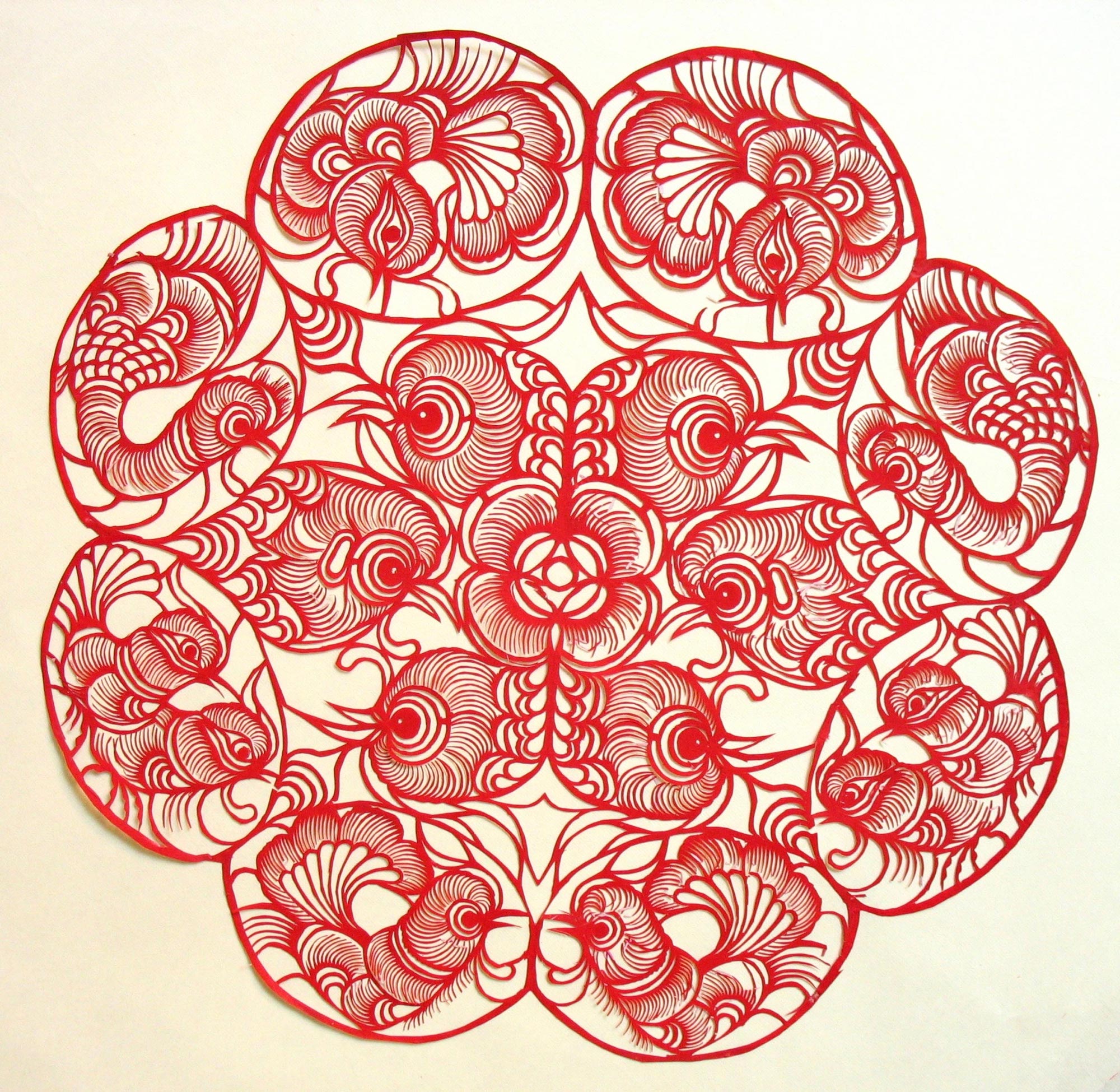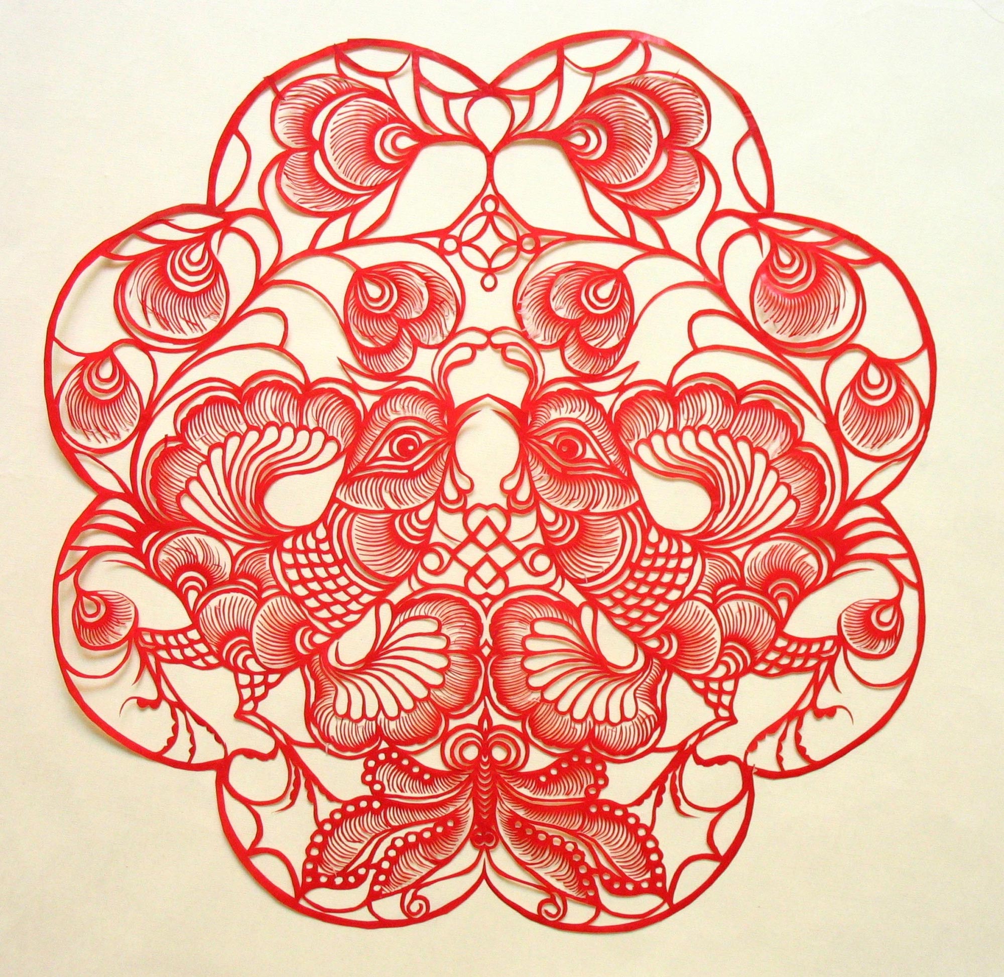 张艳娥的剪纸作品,作者根据自己的思维想象,先折好纸,把折好的纸周围用纸订固定好,再用铅笔勾出所要剪的图案大致轮廓,然后开剪。其艺术特征南北风格兼容,既有南方的细腻清丽、精致典雅,又有北方的古朴浑厚,改传统直线排纹为弧线排纹,作品玲珑剔透。其几十年创作的作品数以千计,代表作有《十二生肖》《二龙戏珠》《太阳鸟》《四大美女》《西游记人物》《戏剧人物》等。