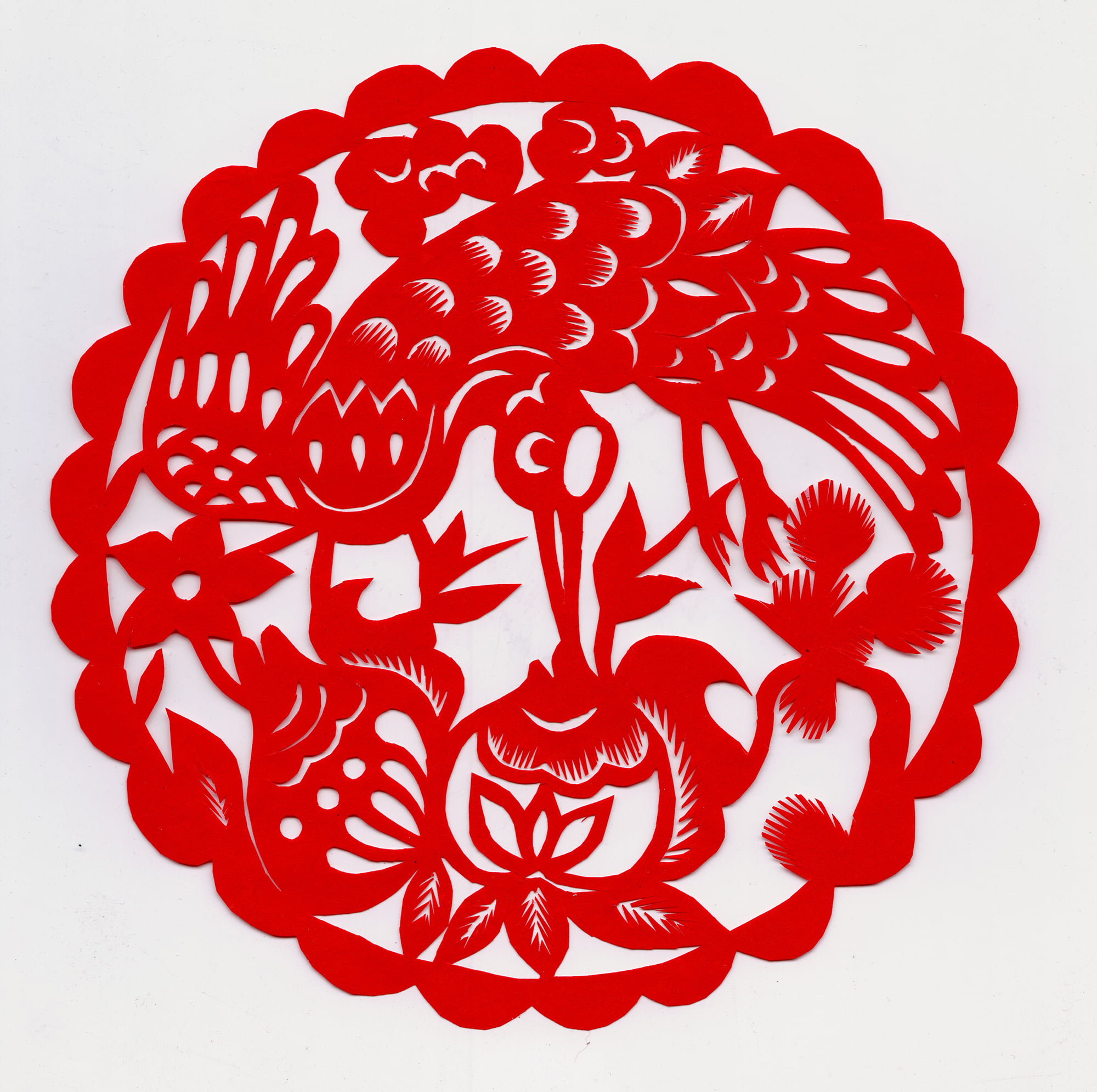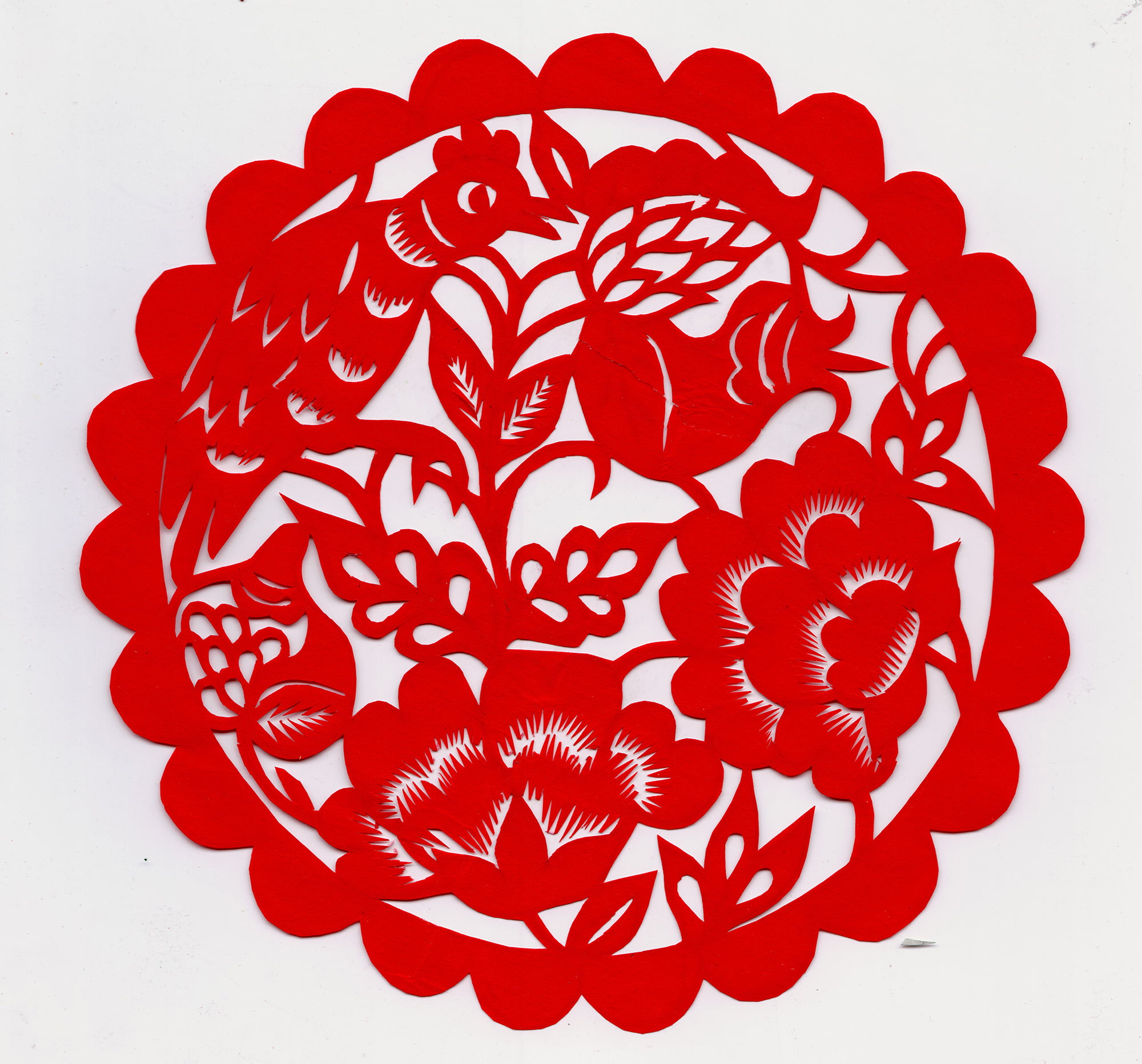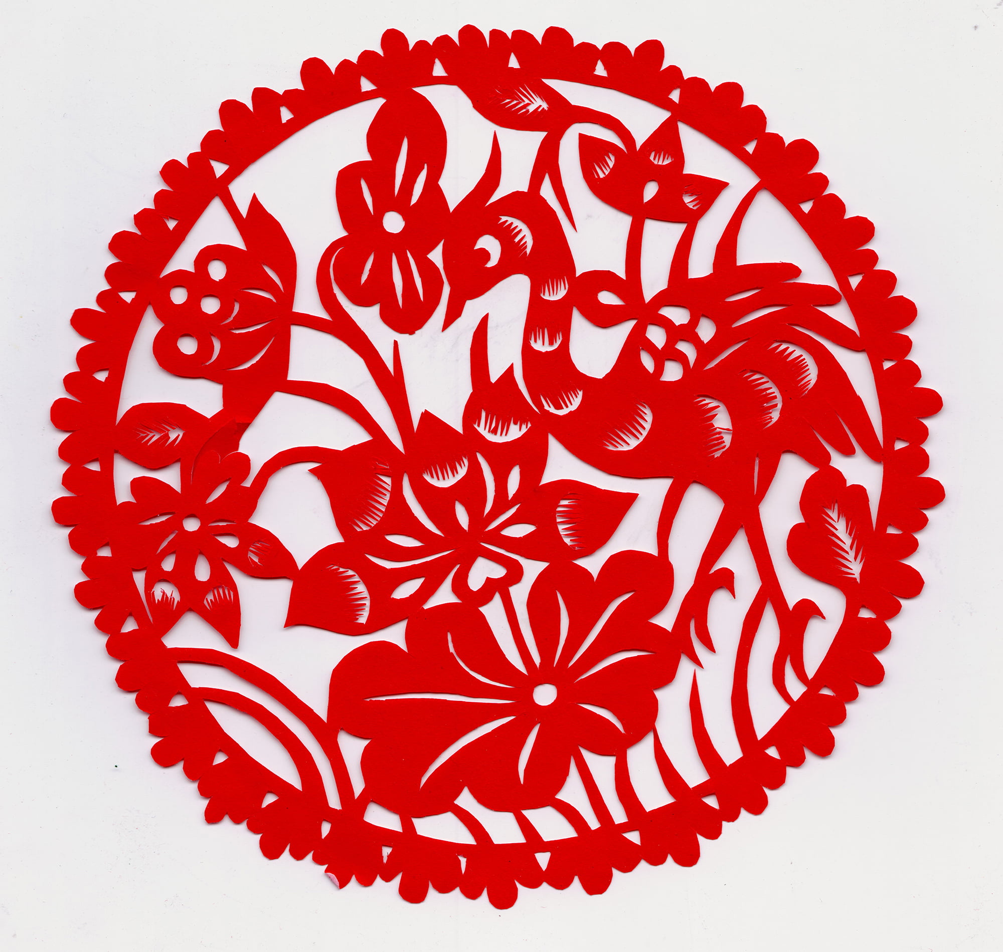 她剪的喜花造型质朴,装饰丰满,线条流畅,较好地传承了当地剪纸的风格特点与纹饰内容。当地烟格花多用折叠的方法剪制,纹饰内容较为丰富,有花果,有动物还有几何图案,其大小同窗格一致,直接贴于窗棂之上,似窗纱的作中。张翠生剪的烟格花多为花草和几何纹样,别致新颖,细腻精到,给人一种清新的对称美。代表作有《鹭鸶探莲》《事事如意》《莲里生子》《双桃》等。