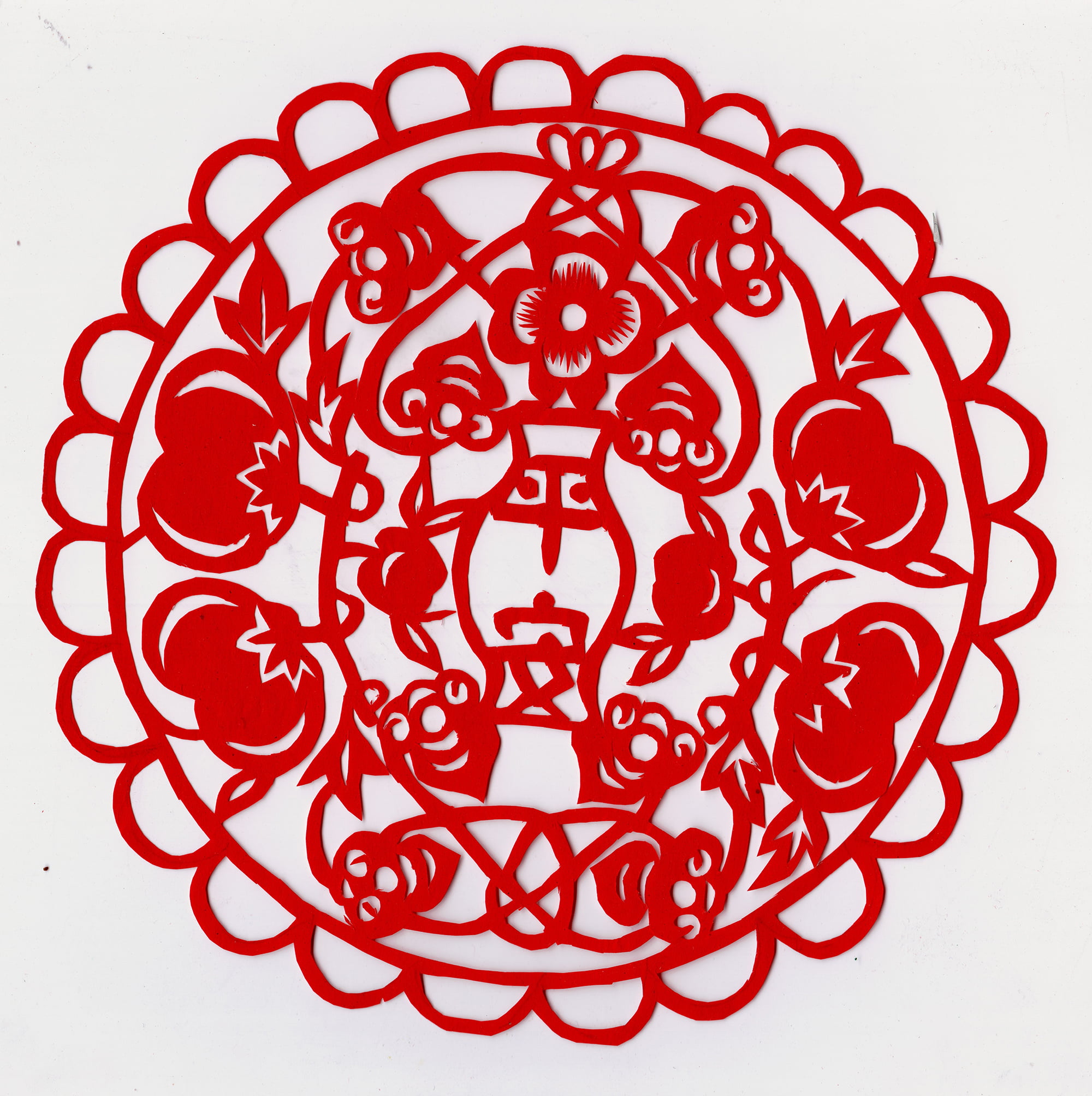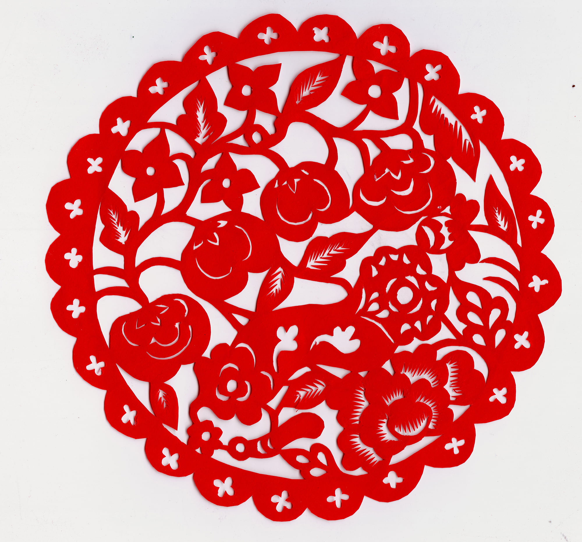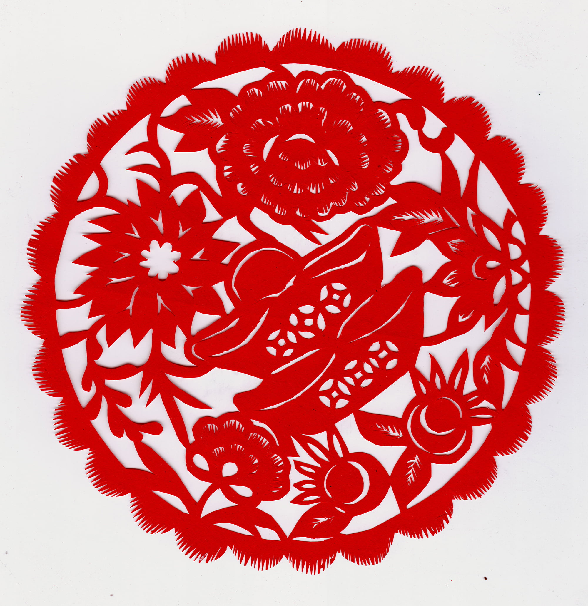 她剪的喜花造型质朴,装饰丰满,线条流畅,较好地传承了当地剪纸的风格特点与纹饰内容。当地烟格花多用折叠的方法剪制,纹饰内容较为丰富,有花果,有动物还有几何图案,其大小同窗格一致,直接贴于窗棂之上,似窗纱的作中。张翠生剪的烟格花多为花草和几何纹样,别致新颖,细腻精到,给人一种清新的对称美。代表作有《鹭鸶探莲》《事事如意》《莲里生子》《双桃》等。