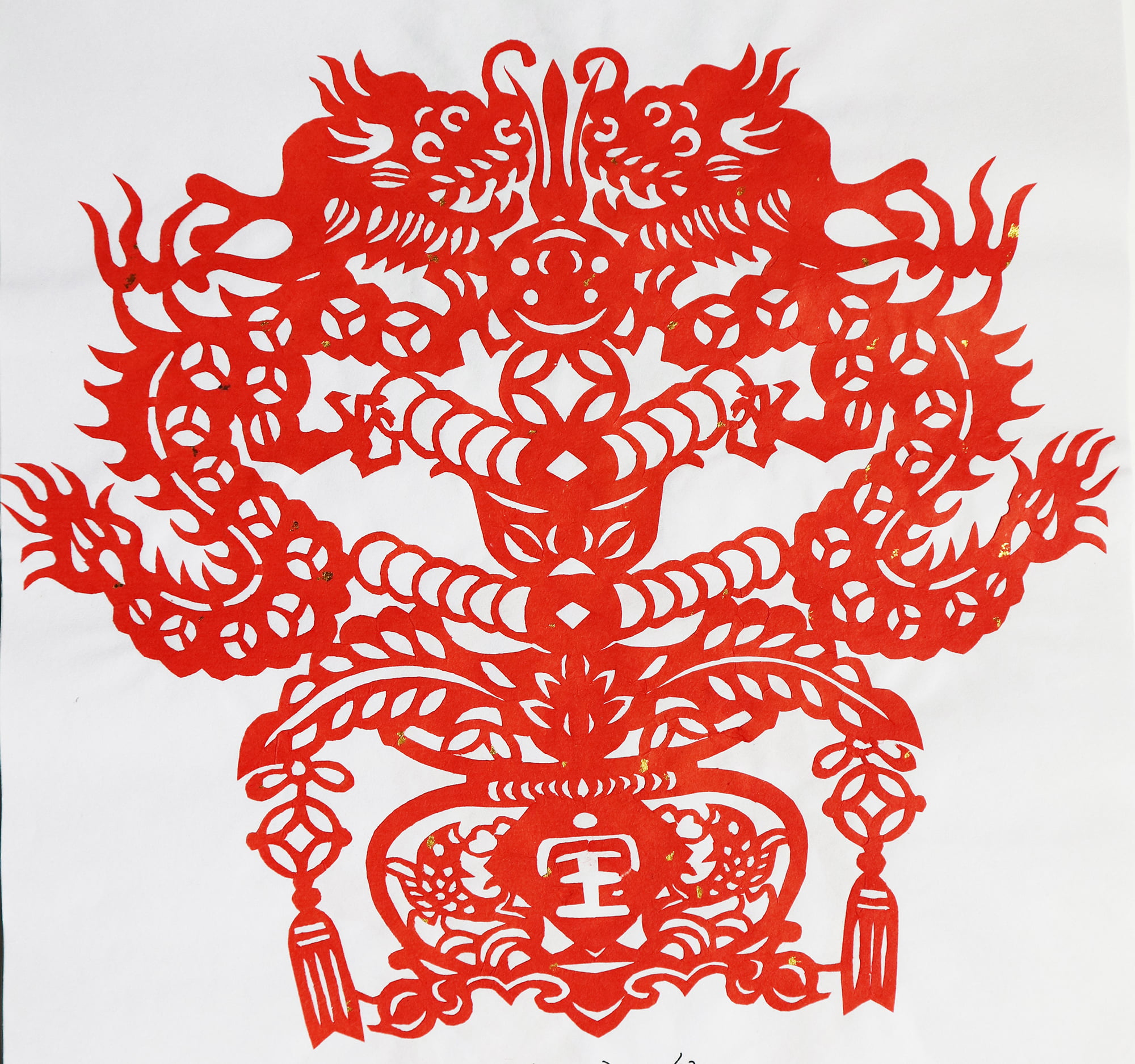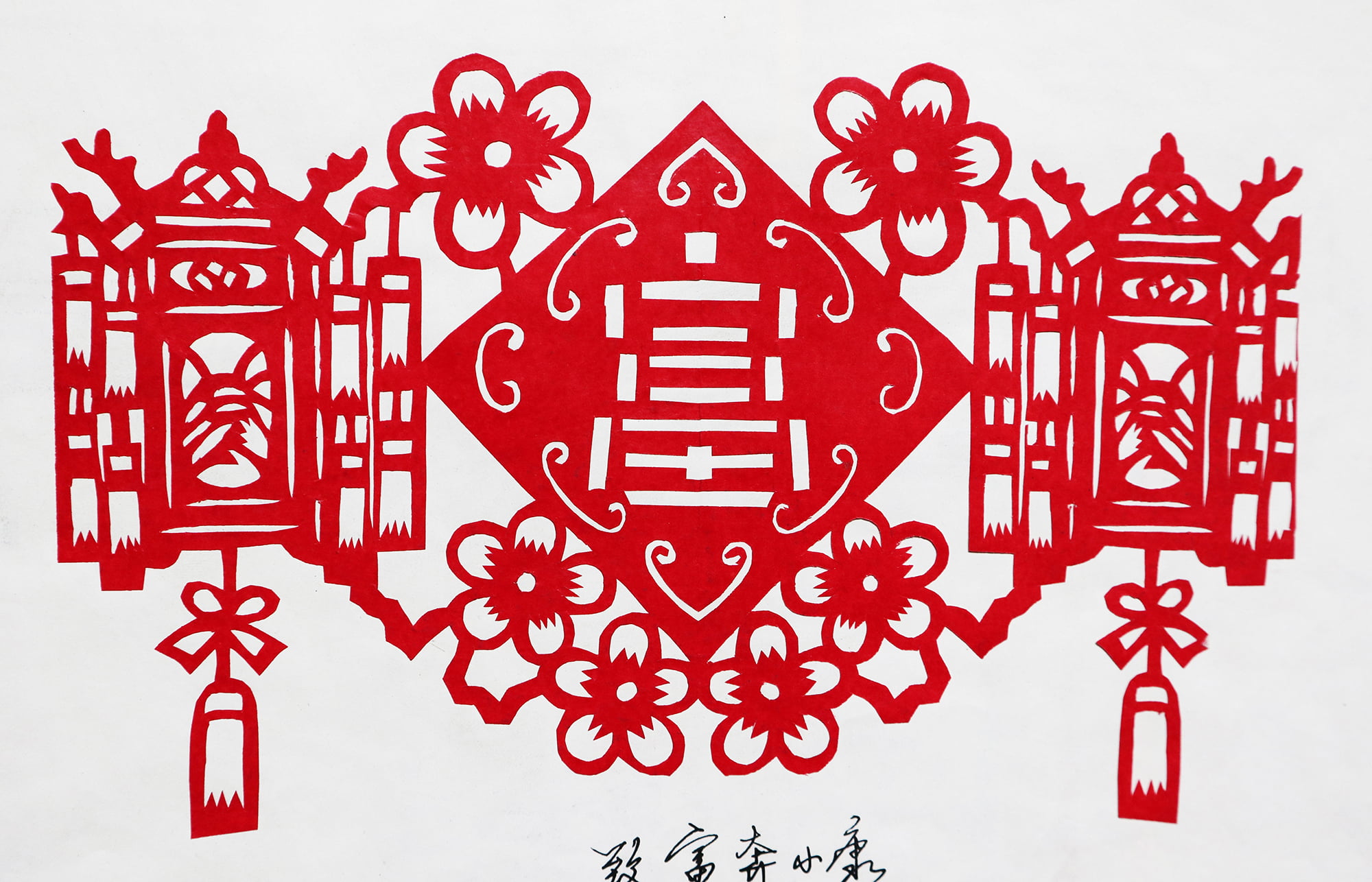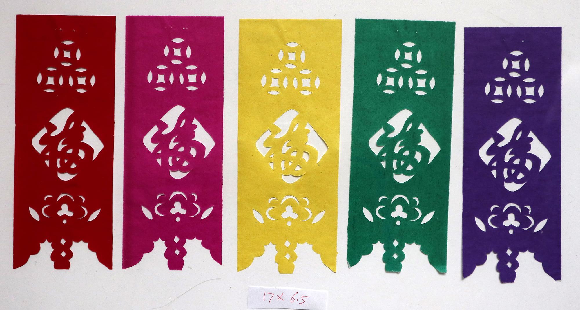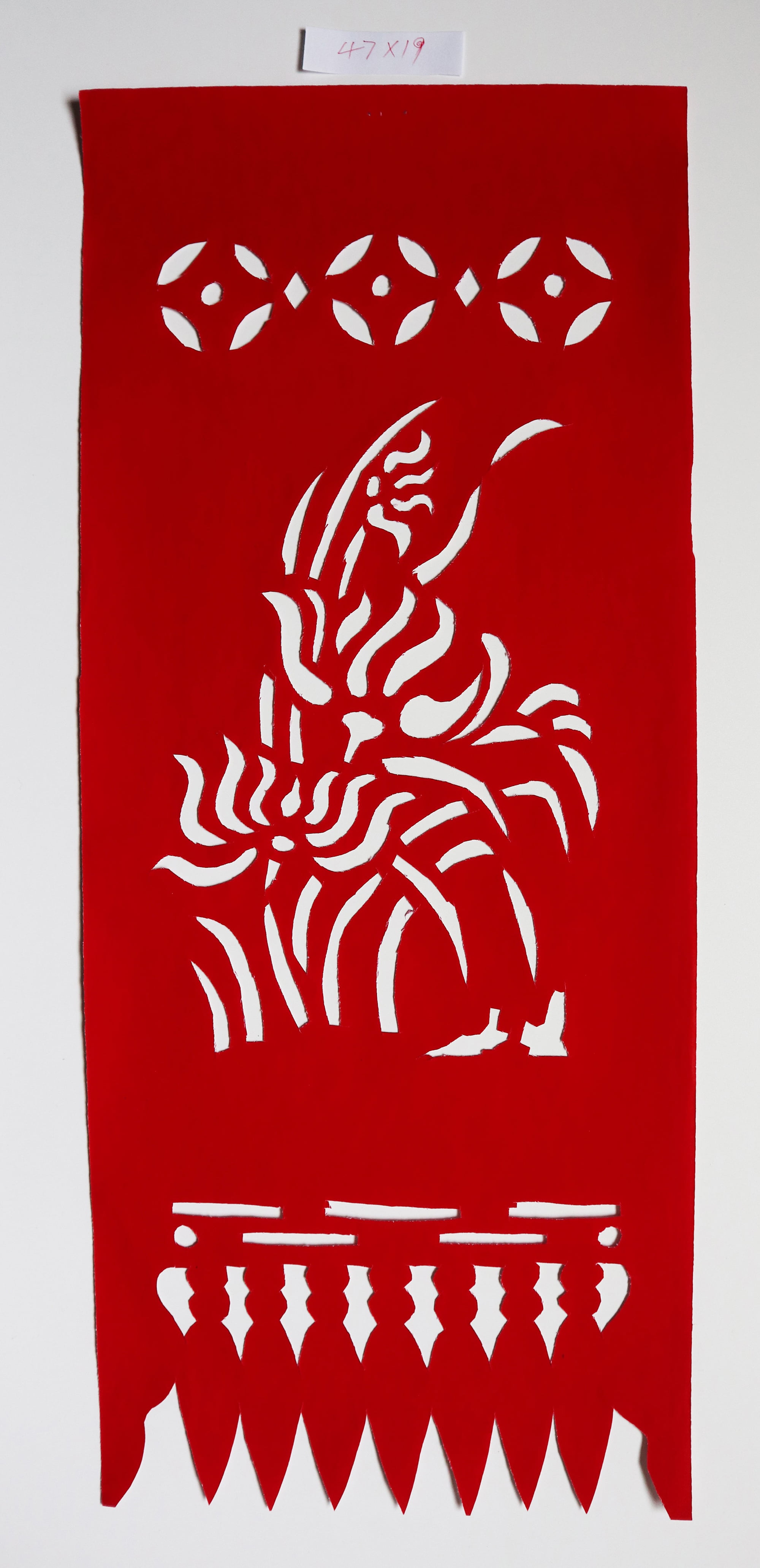 刘普强长期担任校长一职,他怕剪纸创作有不务正业之嫌,剪纸很少在外界展出。退休后时间充裕,他把剪纸作为自娱自乐的文化方式,经常帮村人剪喜花,过年为村人剪门笺。每到村上庙会期间他为村上庙会剪神幡,五色旗、门笺等。