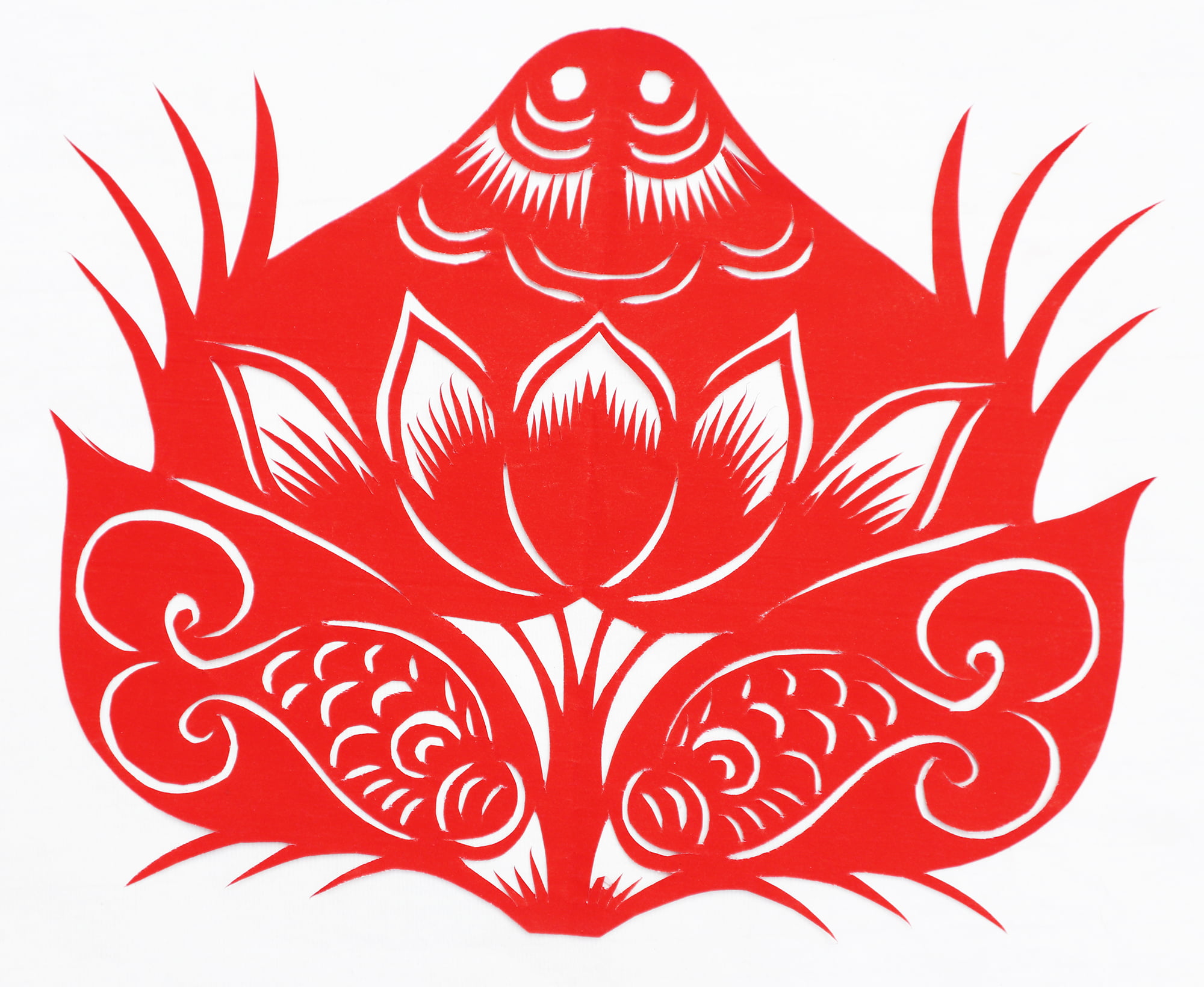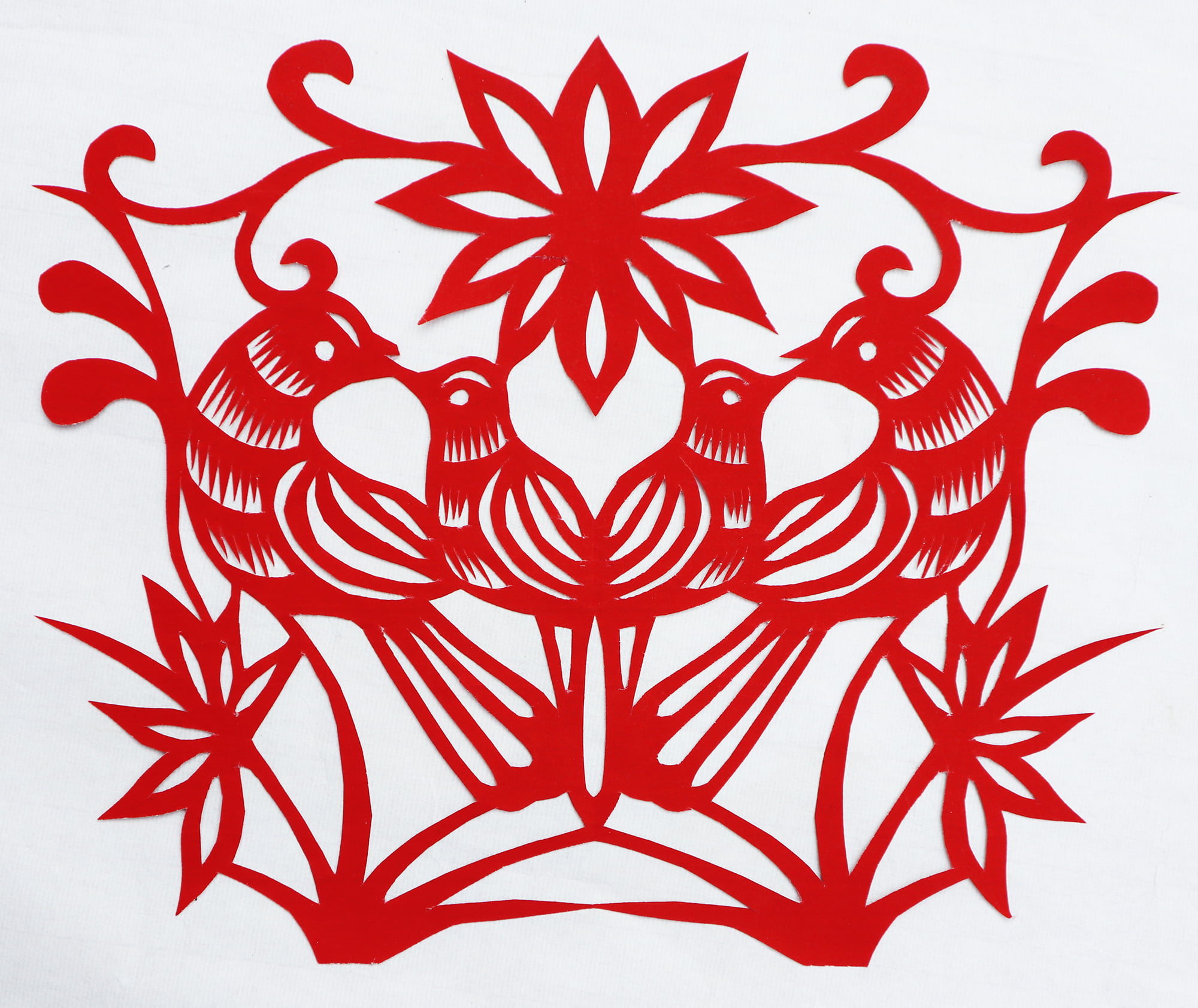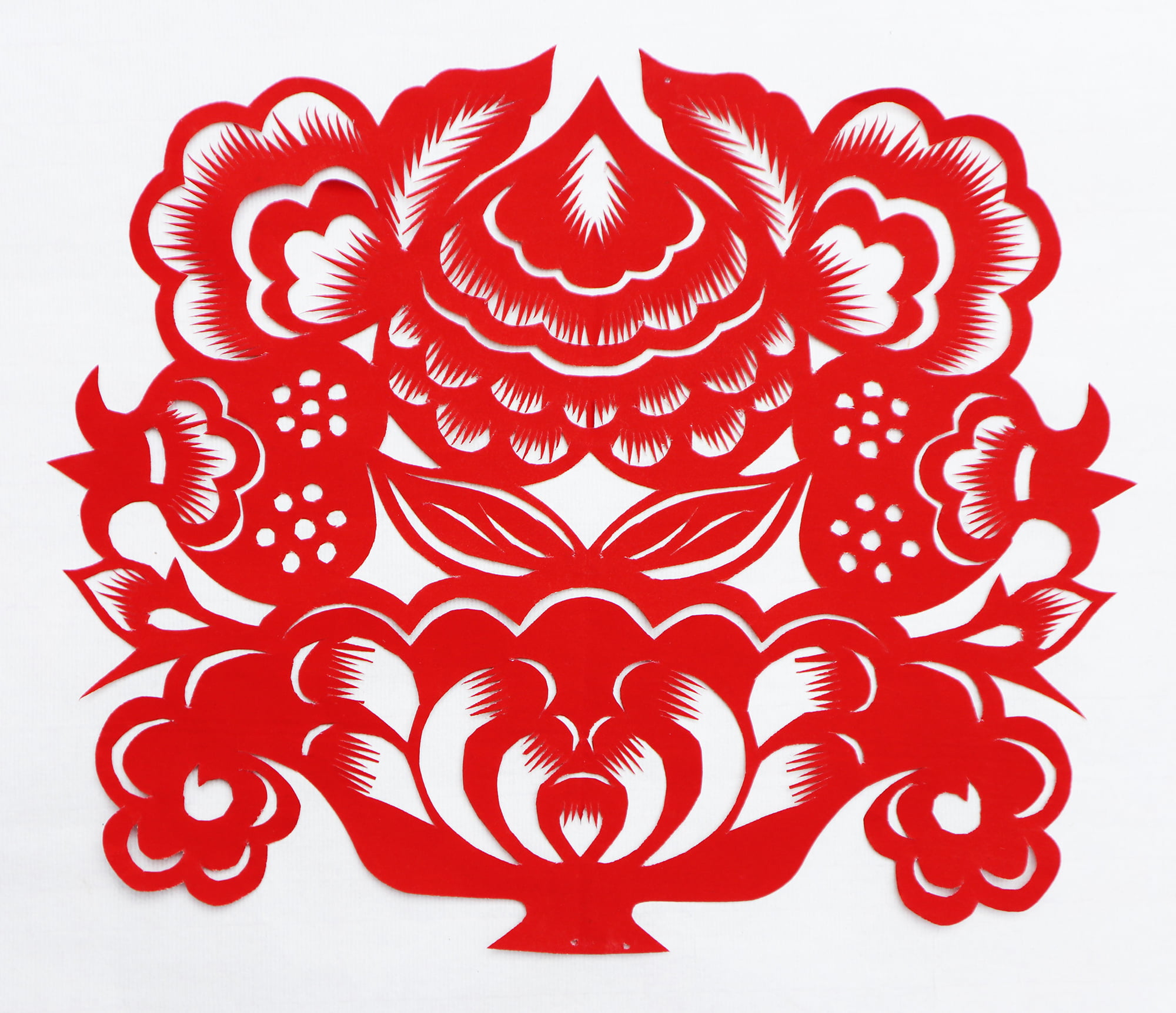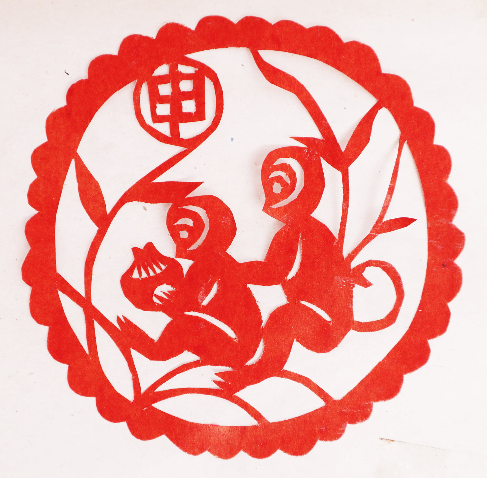 王锁莲的剪纸属原创型一派,她没经师传,主要靠自己琢磨,不懂时看别人家窗上贴的窗花,又因她喜欢读书,善于学习,不管是窗花还是喜花,立意都较独到新颖,也能把传统的纹样灵活运用到自己的创作之中,作品质朴,造型简洁明快,生活情趣浓郁,给人一种亲切的美感。