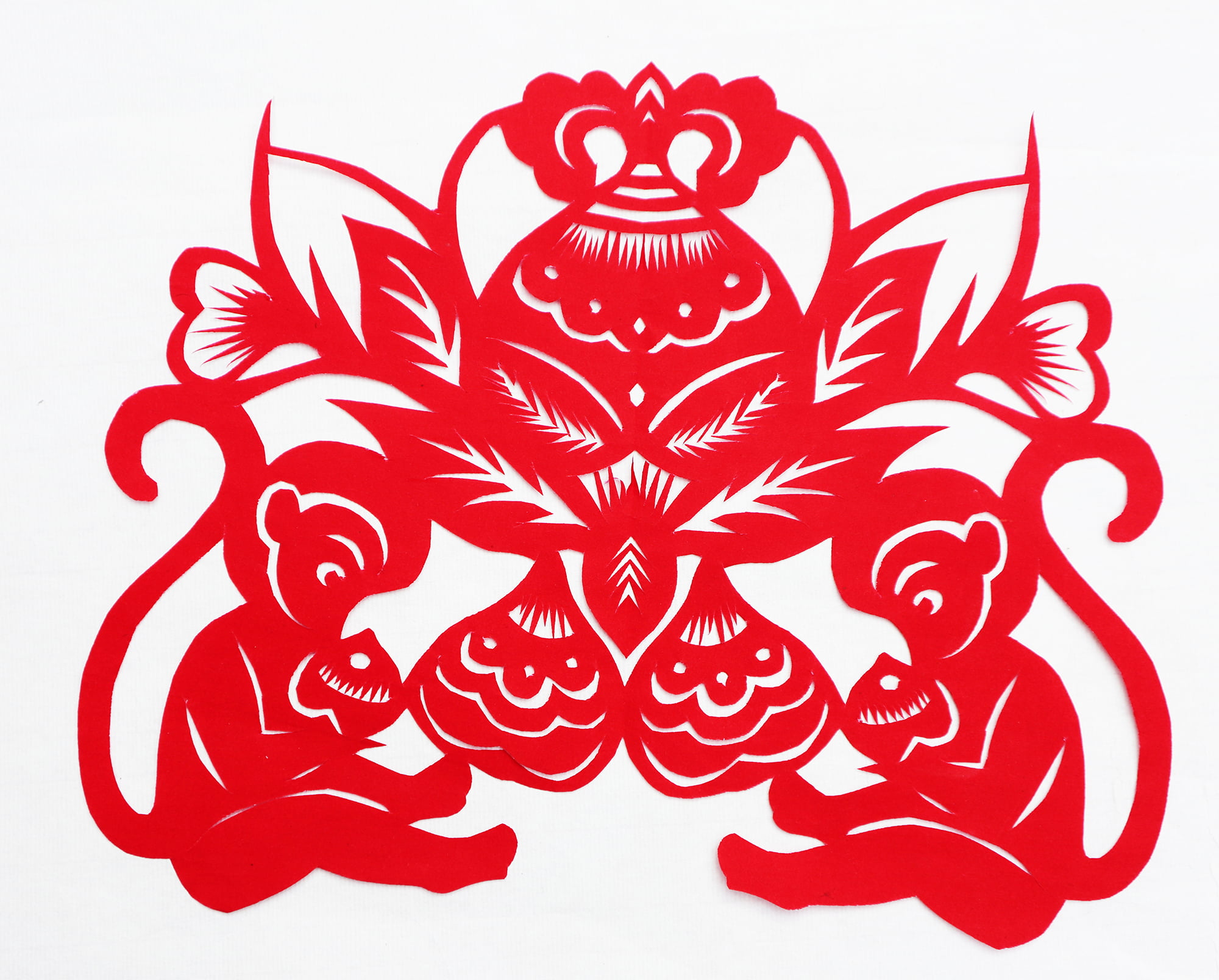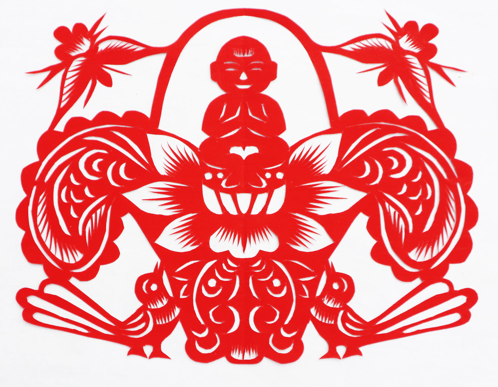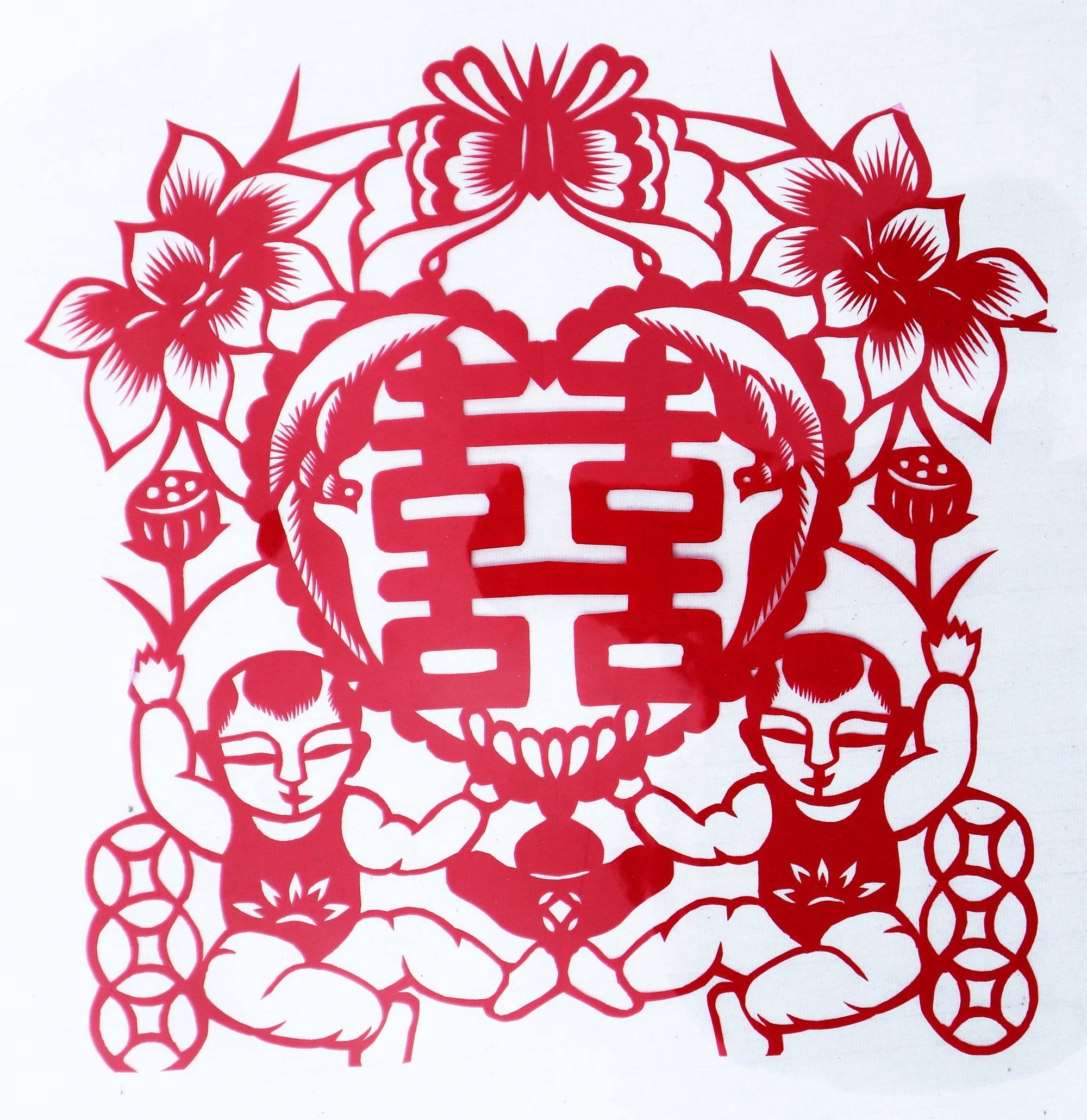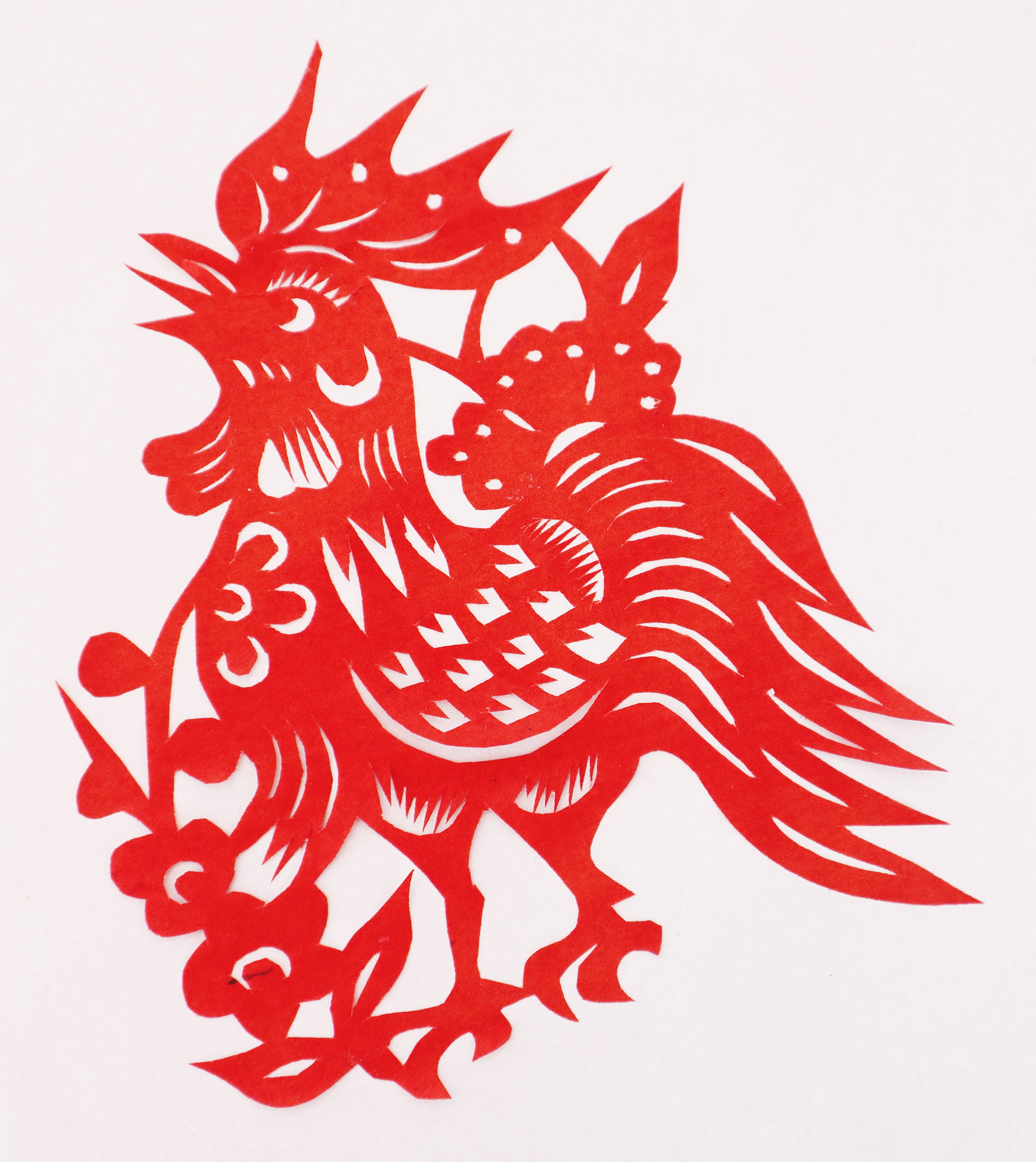 王锁莲的剪纸属原创型一派,她没经师传,主要靠自己琢磨,不懂时看别人家窗上贴的窗花,又因她喜欢读书,善于学习,不管是窗花还是喜花,立意都较独到新颖,也能把传统的纹样灵活运用到自己的创作之中,作品质朴,造型简洁明快,生活情趣浓郁,给人一种亲切的美感。