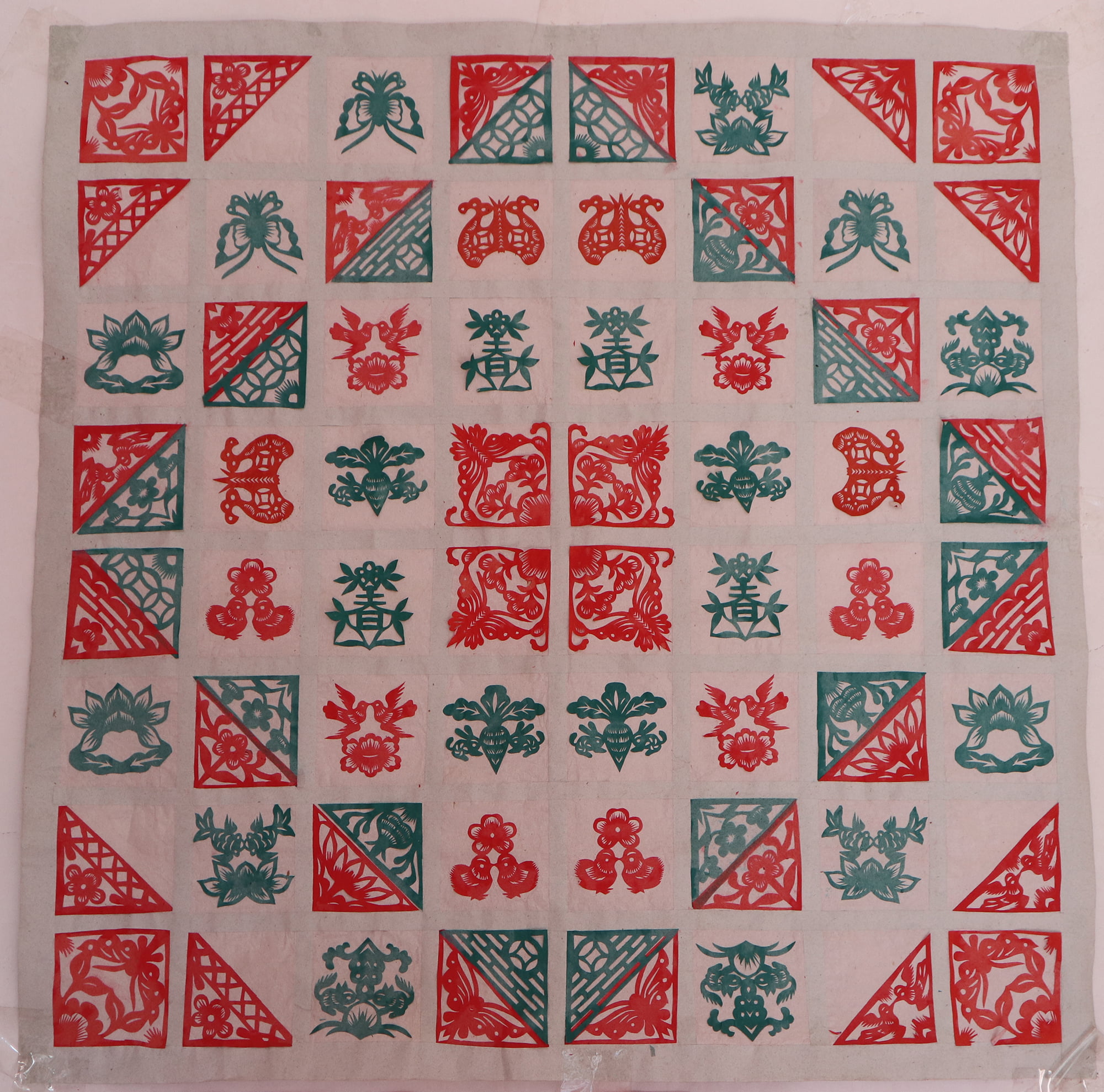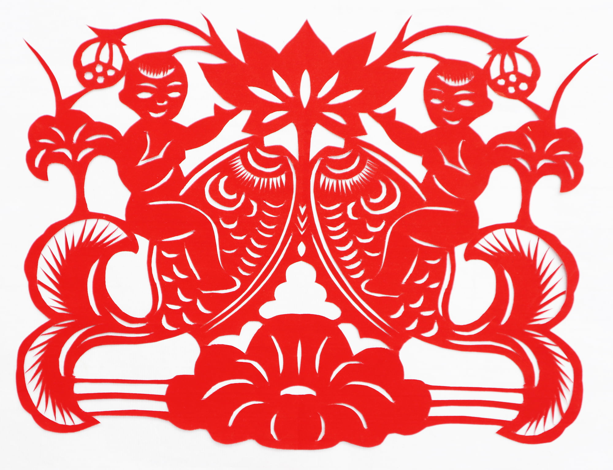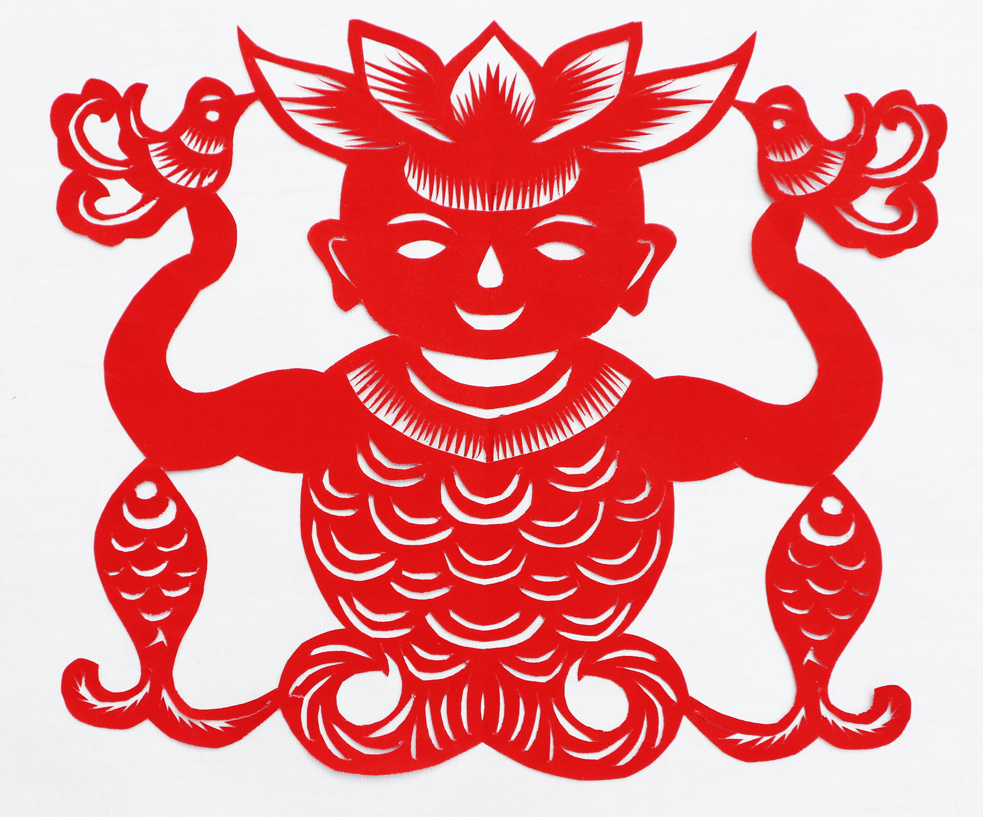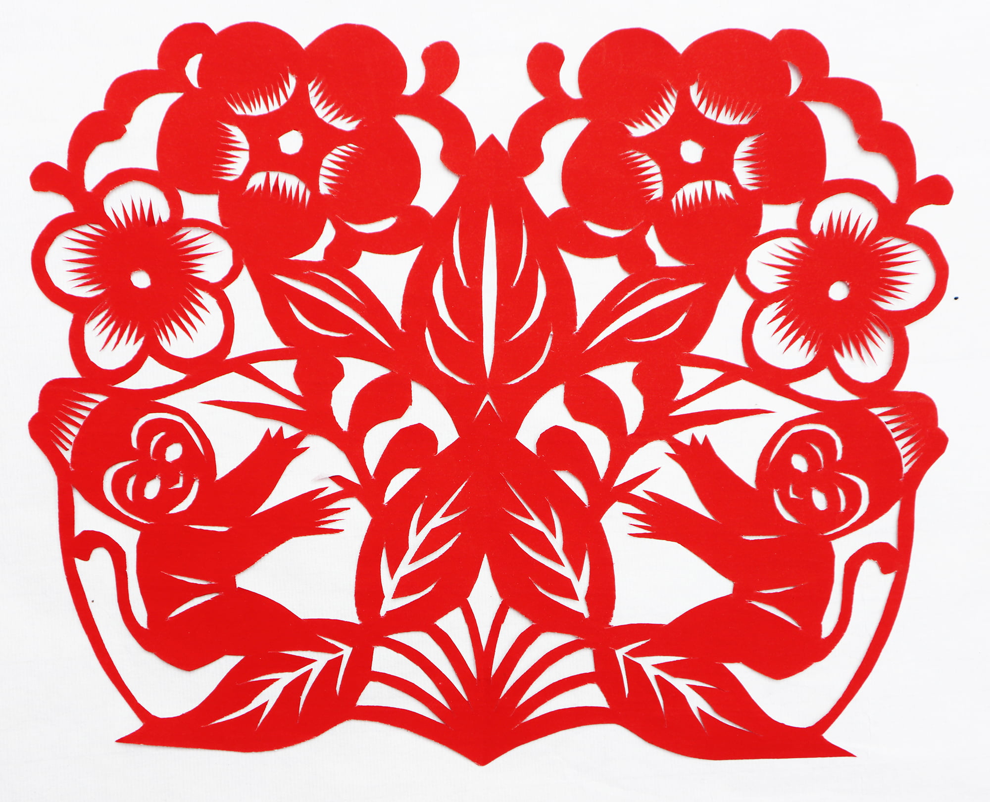 王锁莲的剪纸属原创型一派,她没经师传,主要靠自己琢磨,不懂时看别人家窗上贴的窗花,又因她喜欢读书,善于学习,不管是窗花还是喜花,立意都较独到新颖,也能把传统的纹样灵活运用到自己的创作之中,作品质朴,造型简洁明快,生活情趣浓郁,给人一种亲切的美感。