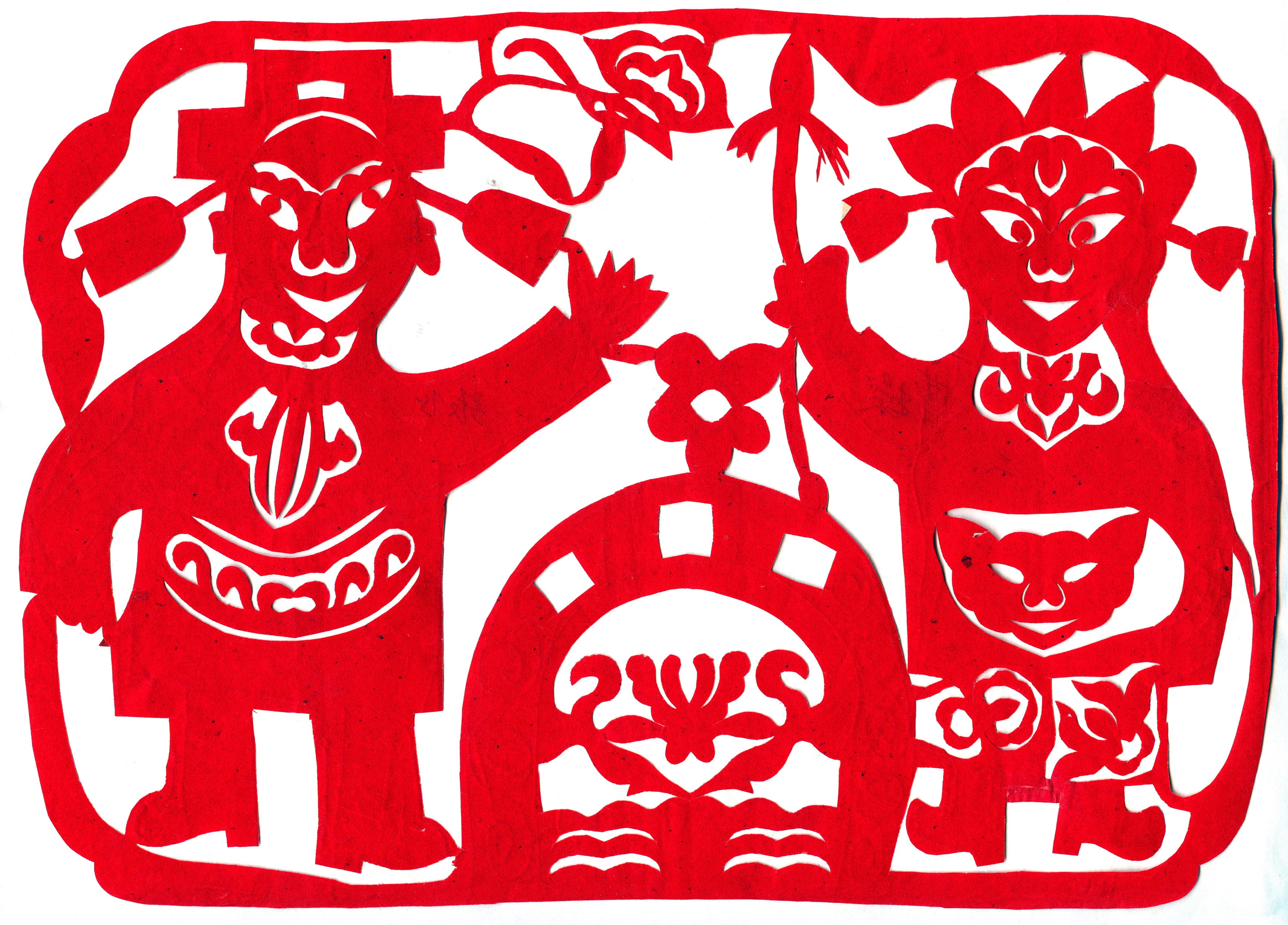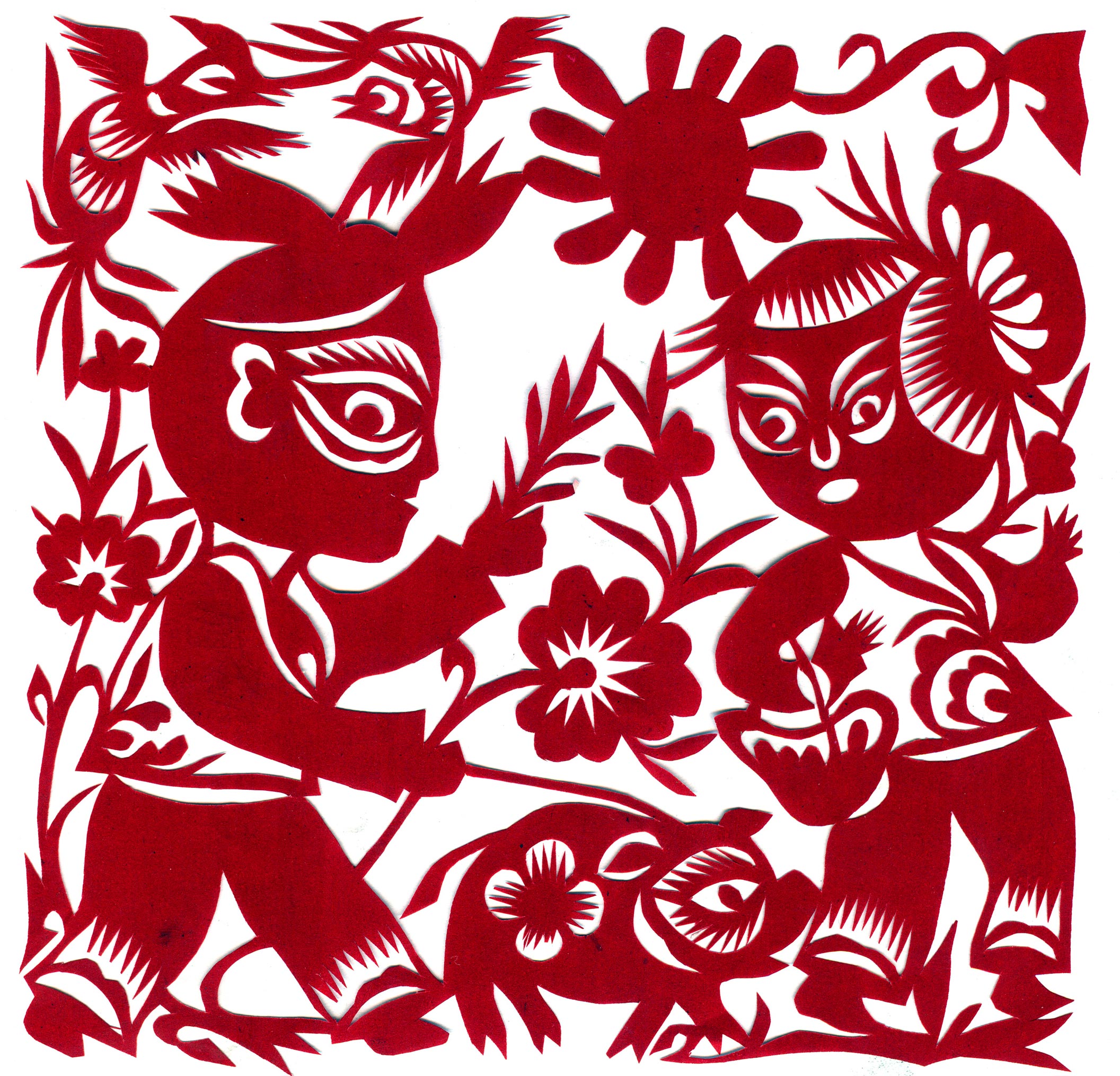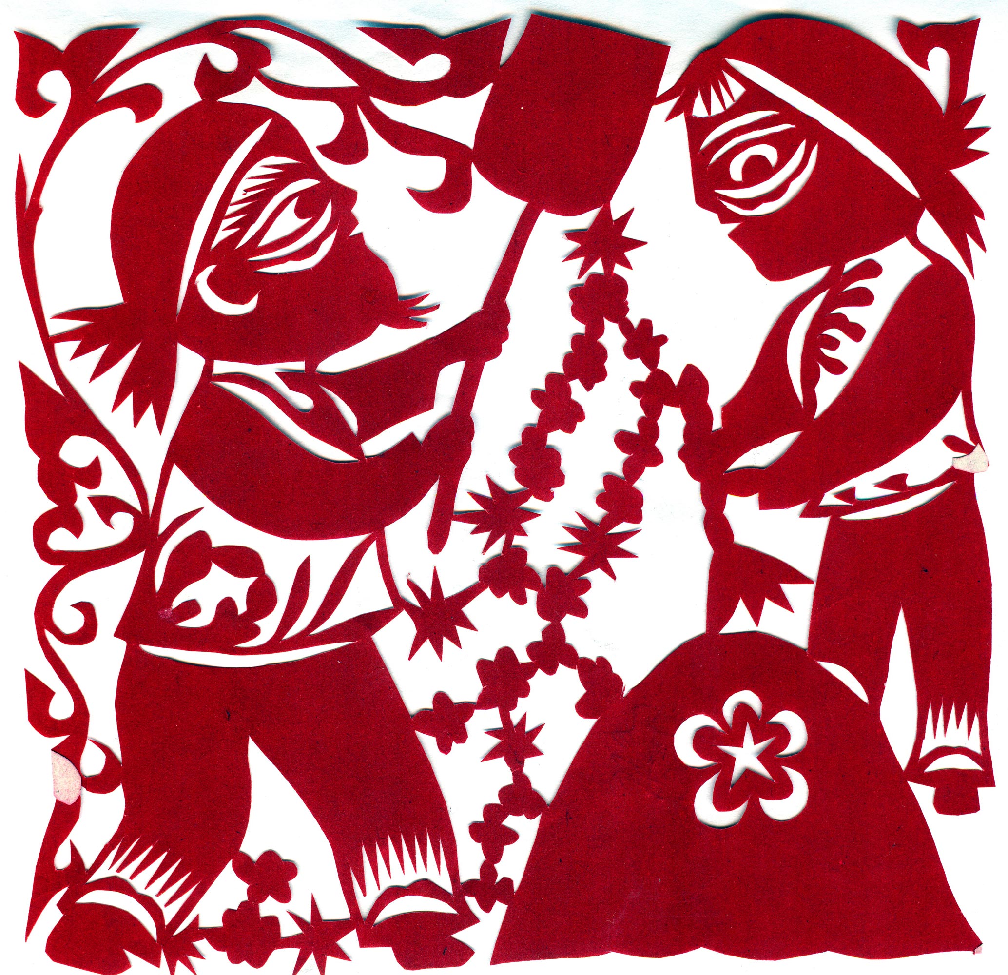 刘晓娟早在七八岁时就开始学习剪纸。母亲是村里剪花的巧人,每到腊月就给村里家家户户剪窗花,刘晓娟看在眼里记在心里,就学着母亲的样子剪了起来。父亲看见了说:“从小不学个好的,就学伺候人的本事。”但刘晓娟就是喜欢剪纸,每年就渴望腊月快点到来,坐在炕头上剪花花别提有多高兴了。因为母亲从不拓样子剪,所以她也就直接冒剪。开始学剪纸都是先学剪花草,慢慢地剪动物,熟练之后再把人物与动物往一起组合。过年的窗花、墙边花、下雨天的扫天媳妇、叫魂看病的剪纸都是她来剪。
