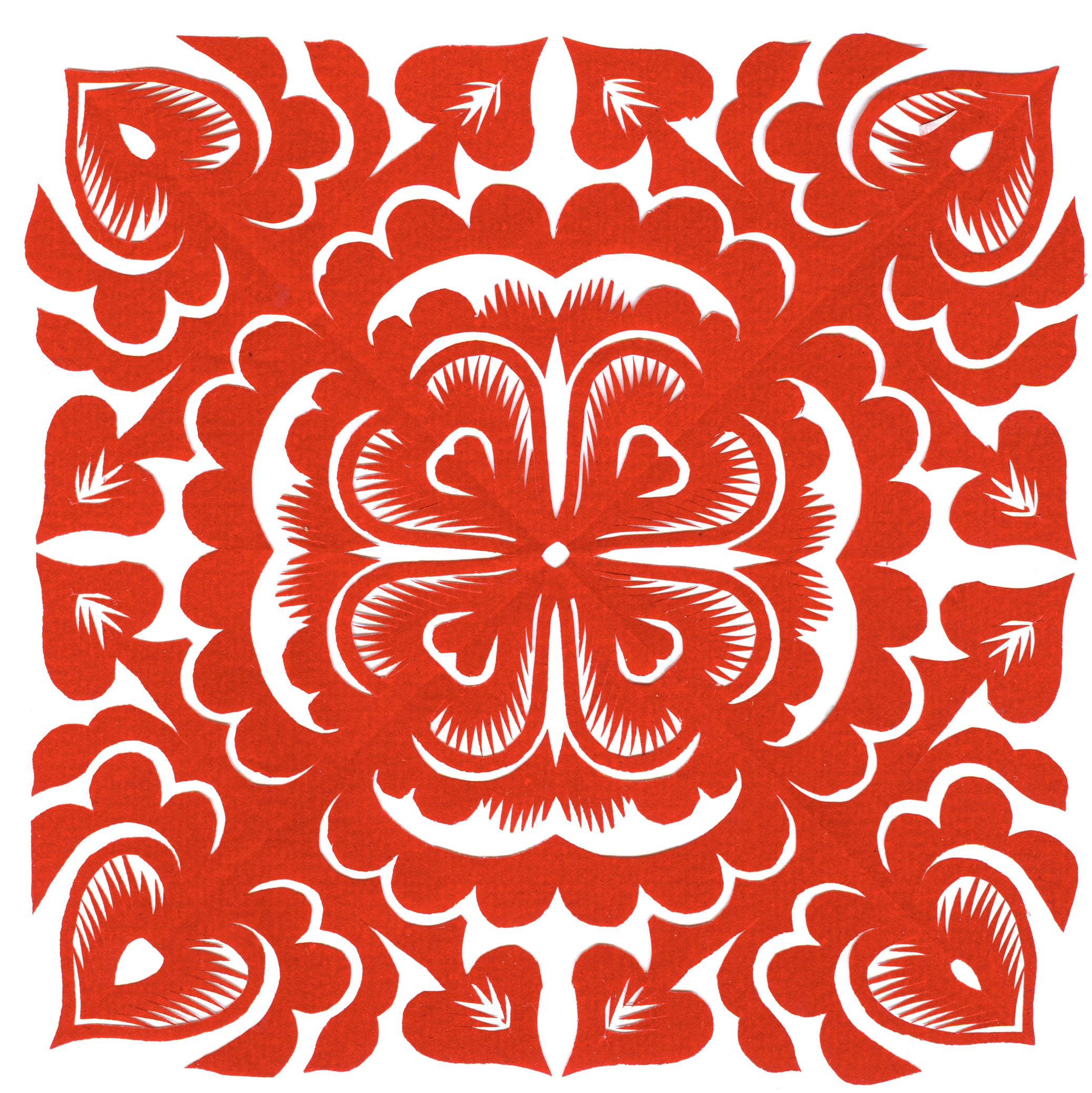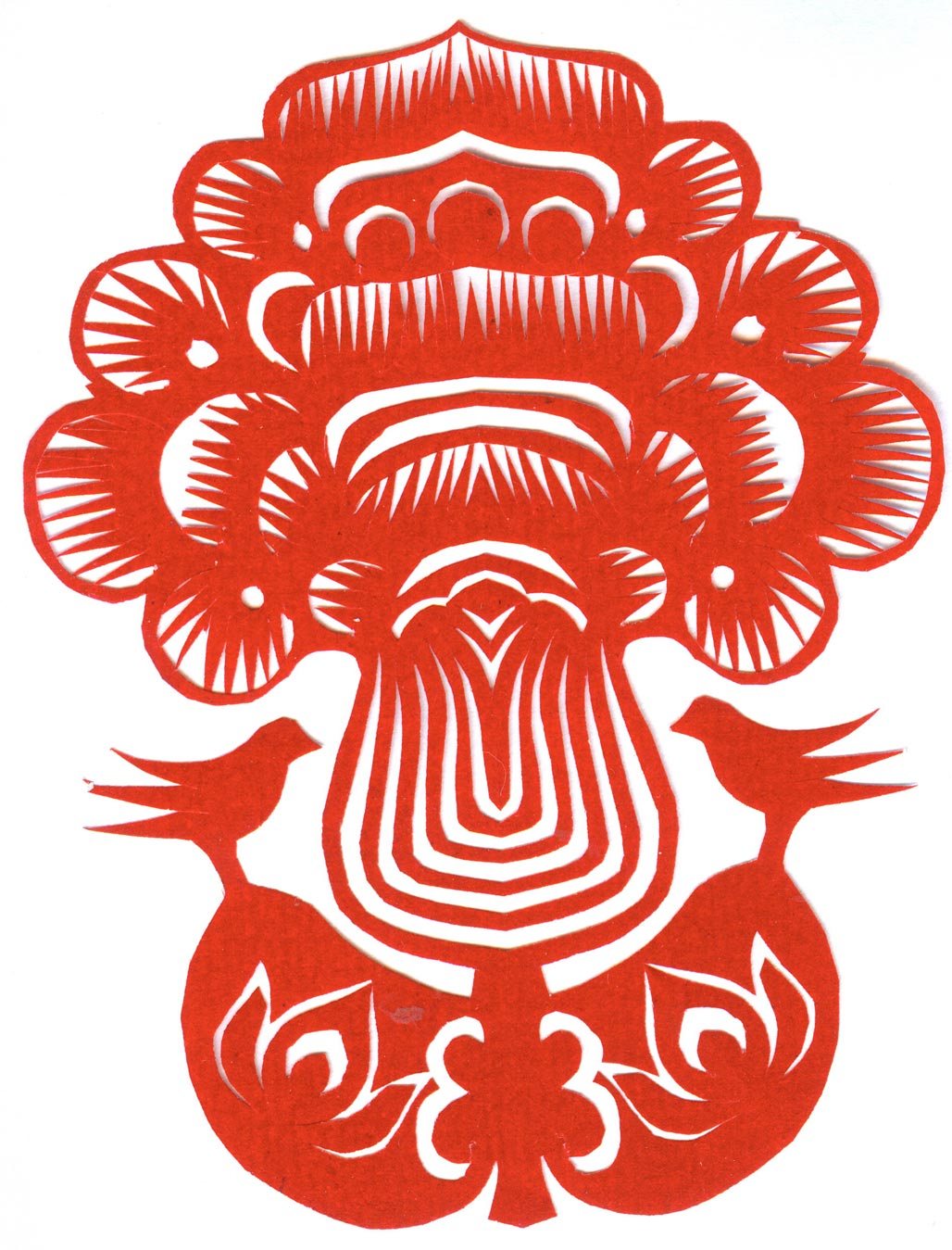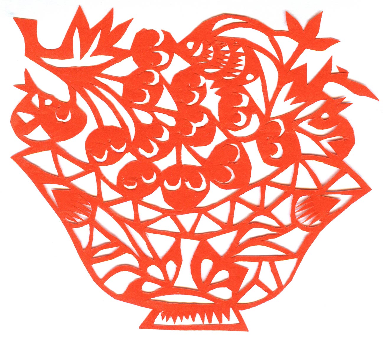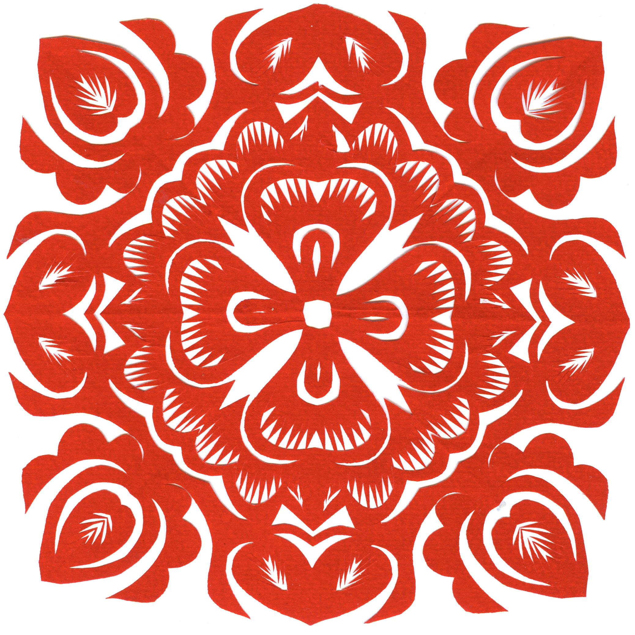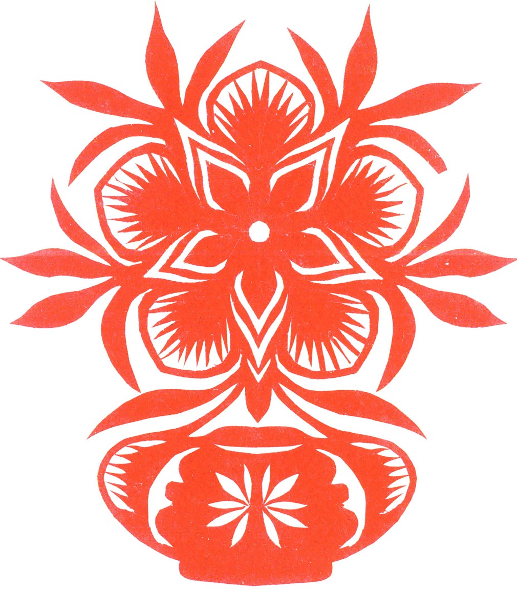 郑国翠兄妹4个,她最小,手也最巧。8岁上学,上了三年学,后因家庭贫困就辍学回家,帮家人干农活,减轻家里负担。从7岁起就看见母亲剪纸好奇,受母亲影响,开始学习剪纸,因为家里的条件不好,纸张有限,就把旧对联从外面撕下来拿回家练习剪纸。最开心的是,每年过年母亲从乡镇的商店里买好多彩色纸,村里人也都拿着纸来家里让妈妈帮她们剪窗花。因为镇上会剪纸的人很少,所以母亲在当时就是村里数一数二的巧人了。母亲剪,她也跟着剪。上学那时候就喜欢剪纸,除了上学、吃饭、写作业、做家务,经常都在废寝忘食地剪窗花,如剪狗、牛、羊常见到的动物,还有凳子、筐子、锄头,后来开始剪自行车、汽车,飞机,村里的人都说称赞她像母亲和外婆,长了一双巧手。她剪的第一幅剪纸是团花,因为喜欢团花,又没有固定的样子,靠自己脑子里想象出的画面,剪出来的样子比较新颖又好看,此后村里人每年过年便都来找母亲和她剪窗花。过年用的剪纸都是自己冒剪的,还会剪结婚和白事上用的剪纸,有时还剪一些教育宣传等方面的剪纸。同时还学会做鞋、鞋垫,都是跟奶奶学的。
