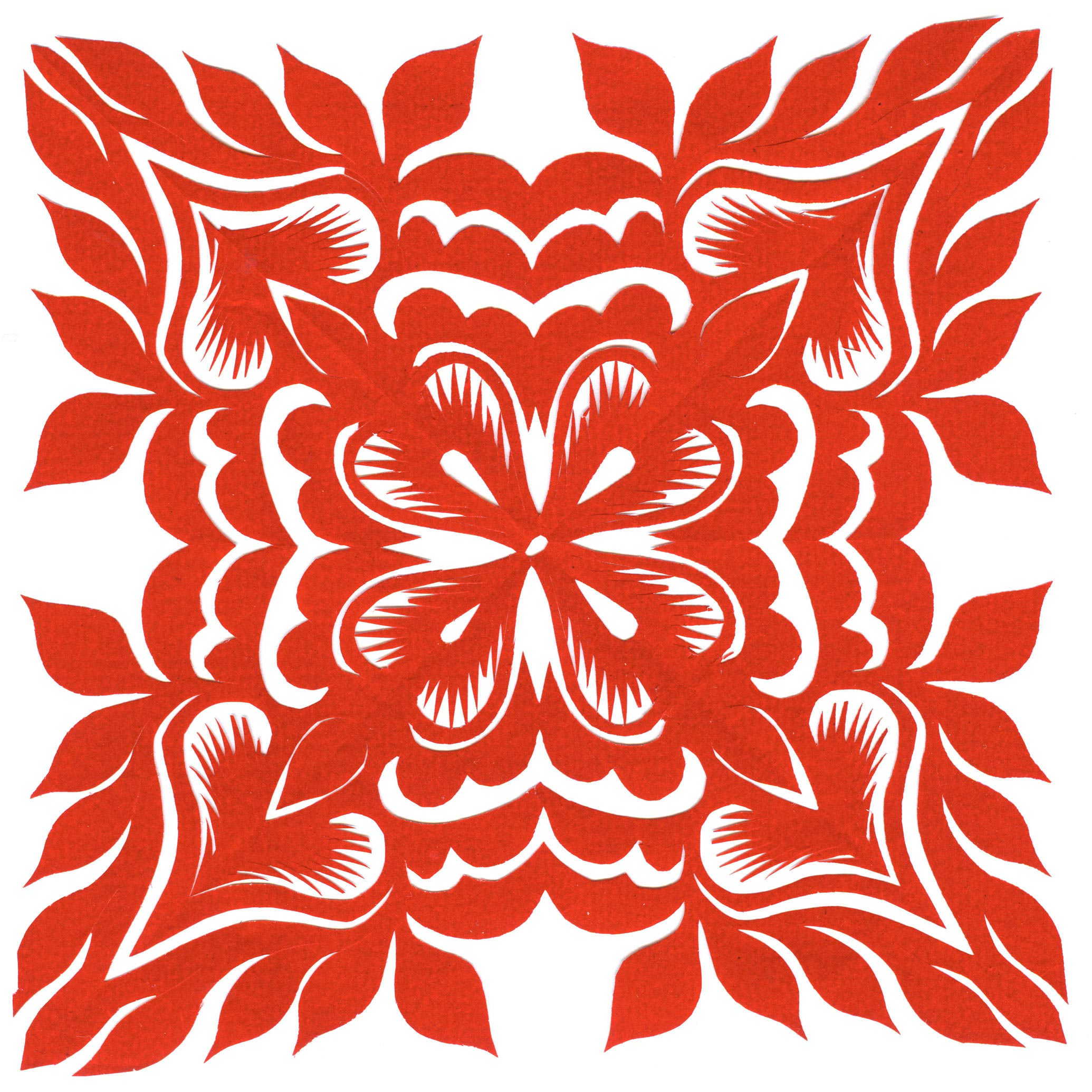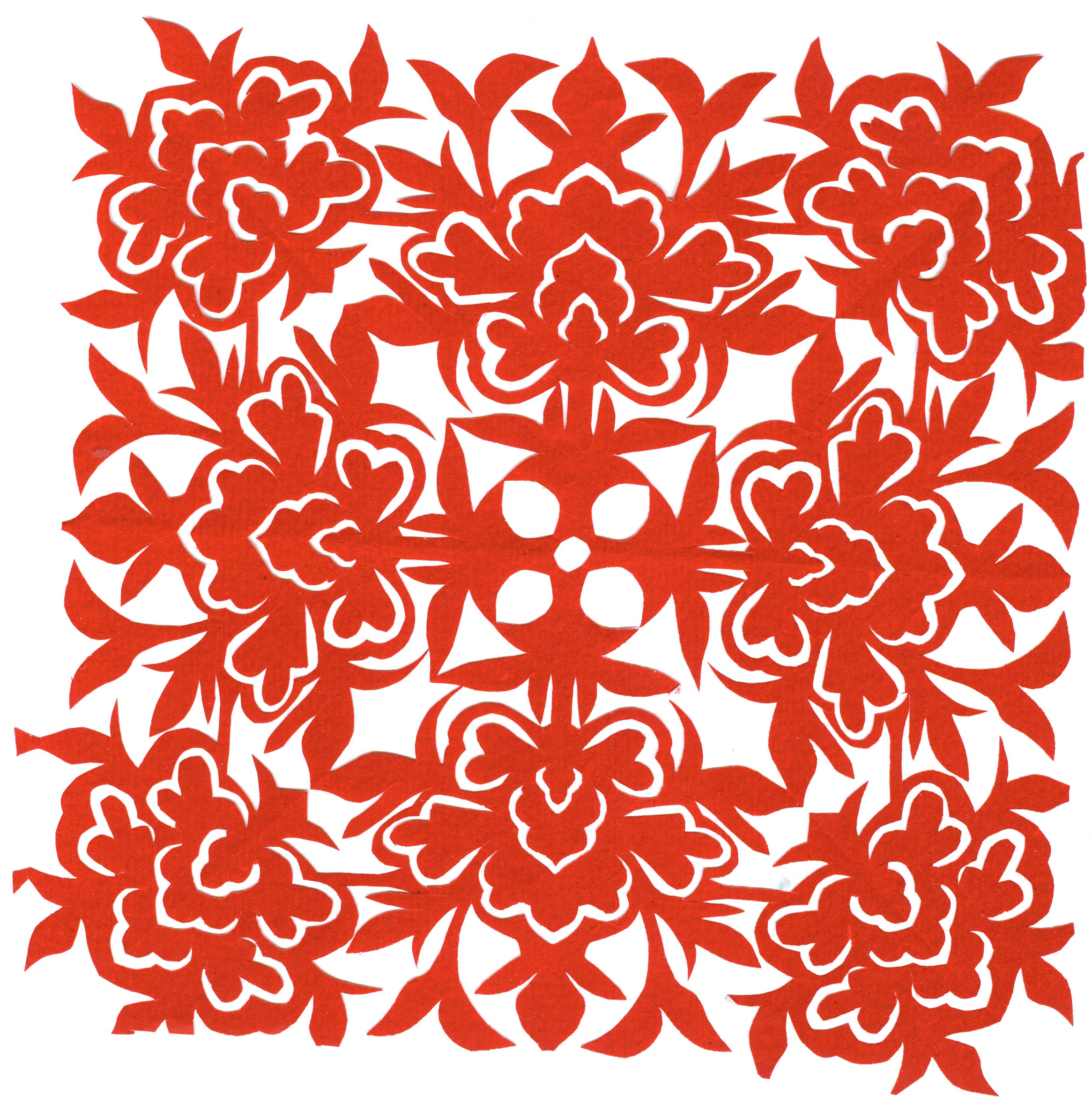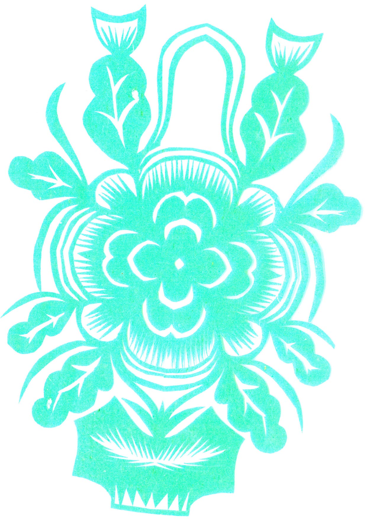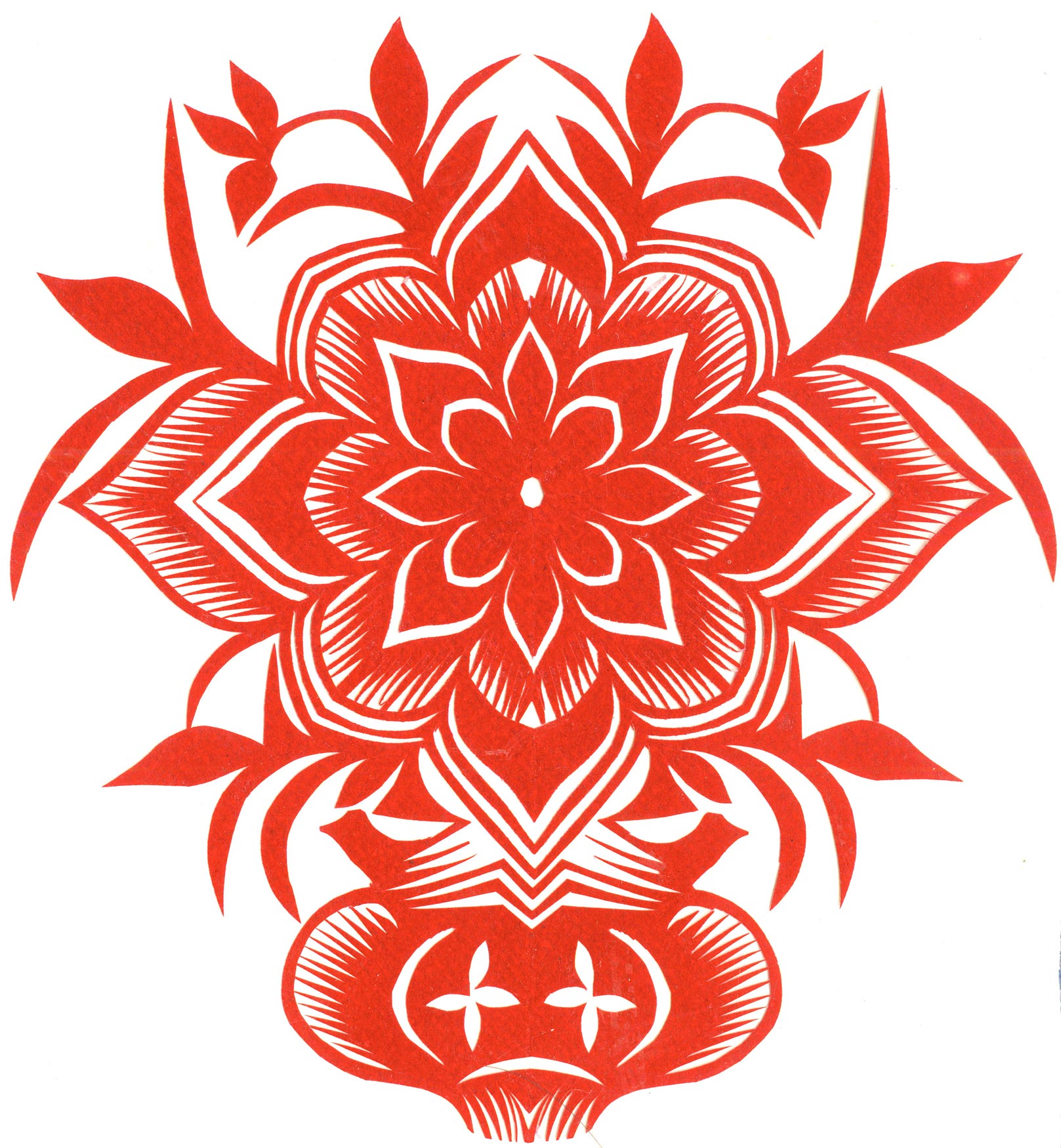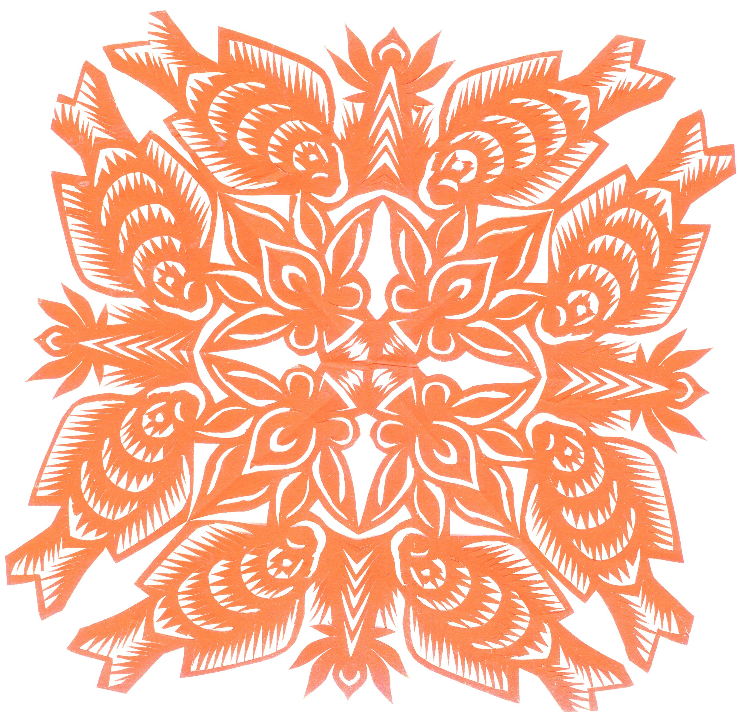 郑国翠兄妹4个,她最小,手也最巧。8岁上学,上了三年学,后因家庭贫困就辍学回家,帮家人干农活,减轻家里负担。从7岁起就看见母亲剪纸好奇,受母亲影响,开始学习剪纸,因为家里的条件不好,纸张有限,就把旧对联从外面撕下来拿回家练习剪纸。最开心的是,每年过年母亲从乡镇的商店里买好多彩色纸,村里人也都拿着纸来家里让妈妈帮她们剪窗花。因为镇上会剪纸的人很少,所以母亲在当时就是村里数一数二的巧人了。母亲剪,她也跟着剪。上学那时候就喜欢剪纸,除了上学、吃饭、写作业、做家务,经常都在废寝忘食地剪窗花,如剪狗、牛、羊常见到的动物,还有凳子、筐子、锄头,后来开始剪自行车、汽车,飞机,村里的人都说称赞她像母亲和外婆,长了一双巧手。她剪的第一幅剪纸是团花,因为喜欢团花,又没有固定的样子,靠自己脑子里想象出的画面,剪出来的样子比较新颖又好看,此后村里人每年过年便都来找母亲和她剪窗花。过年用的剪纸都是自己冒剪的,还会剪结婚和白事上用的剪纸,有时还剪一些教育宣传等方面的剪纸。同时还学会做鞋、鞋垫,都是跟奶奶学的。