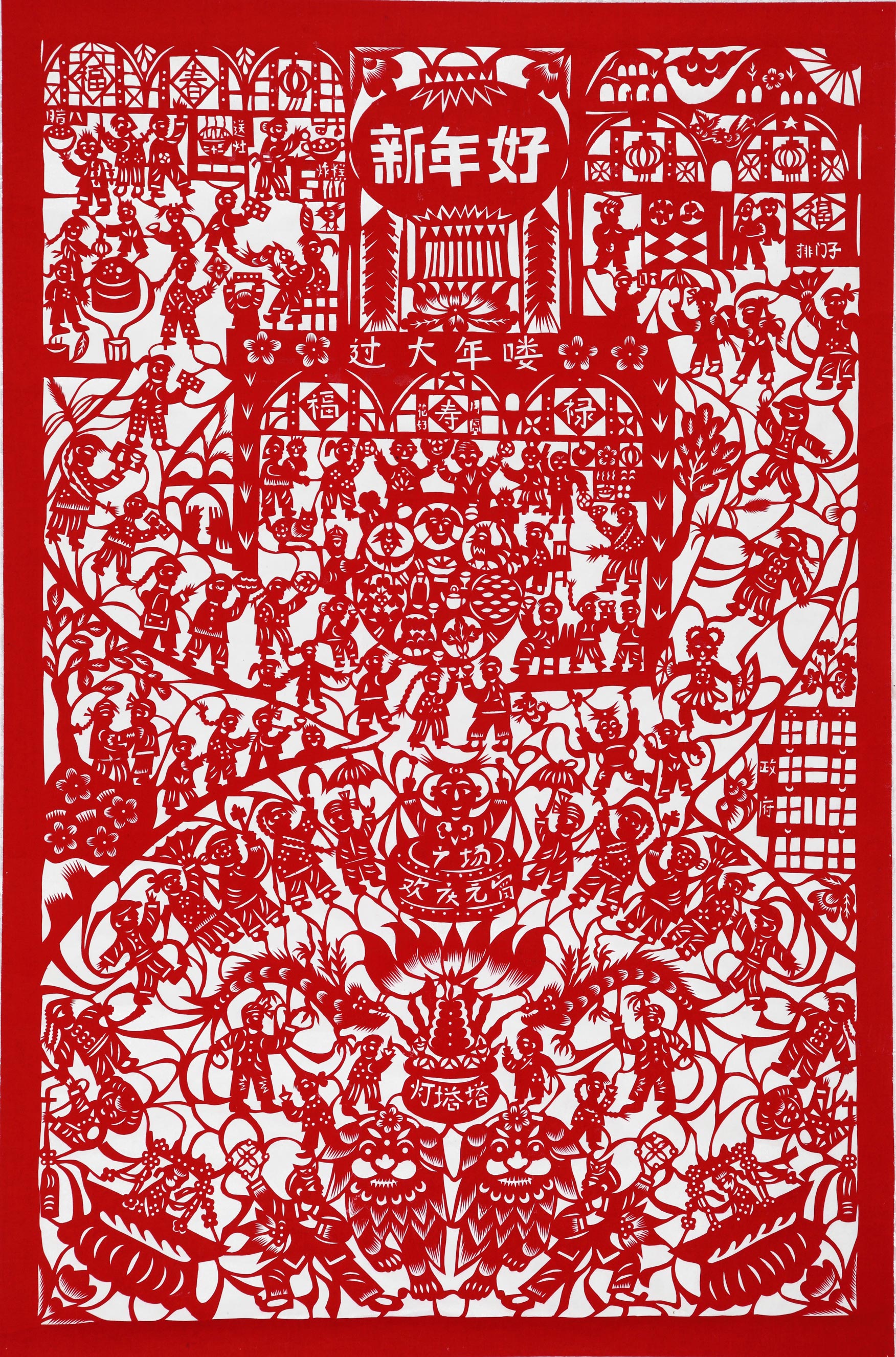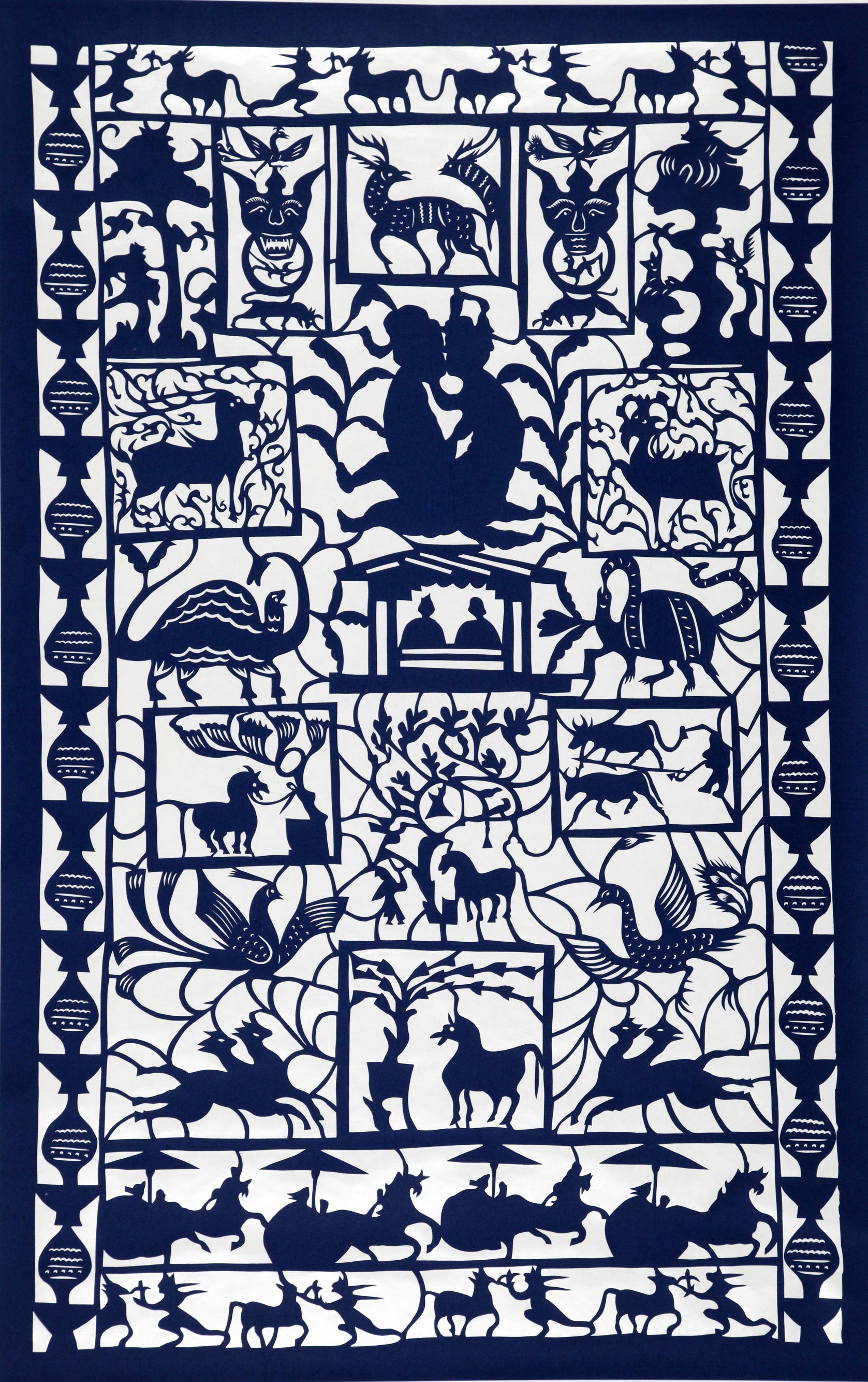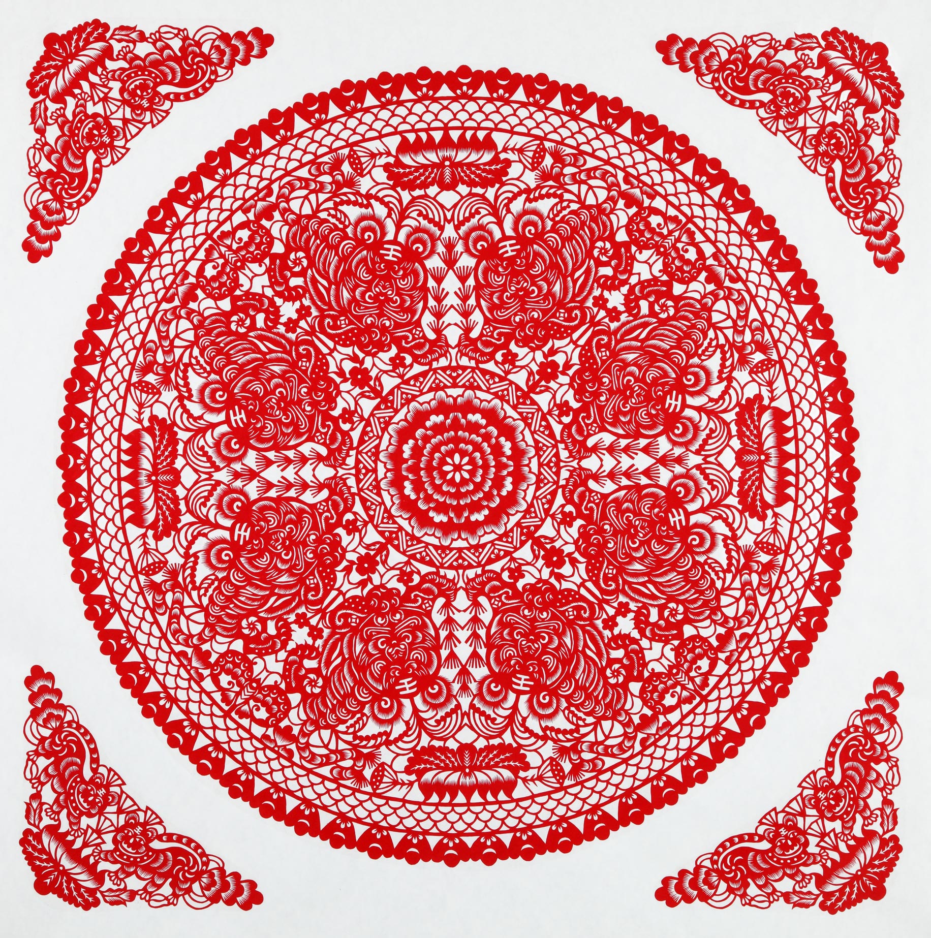 康巧莲的剪纸造型古朴粗犷,简洁洒脱,构图饱满,装饰华丽,剪工精美,灵动自然,较好地传承了绥德剪纸的地域风格。