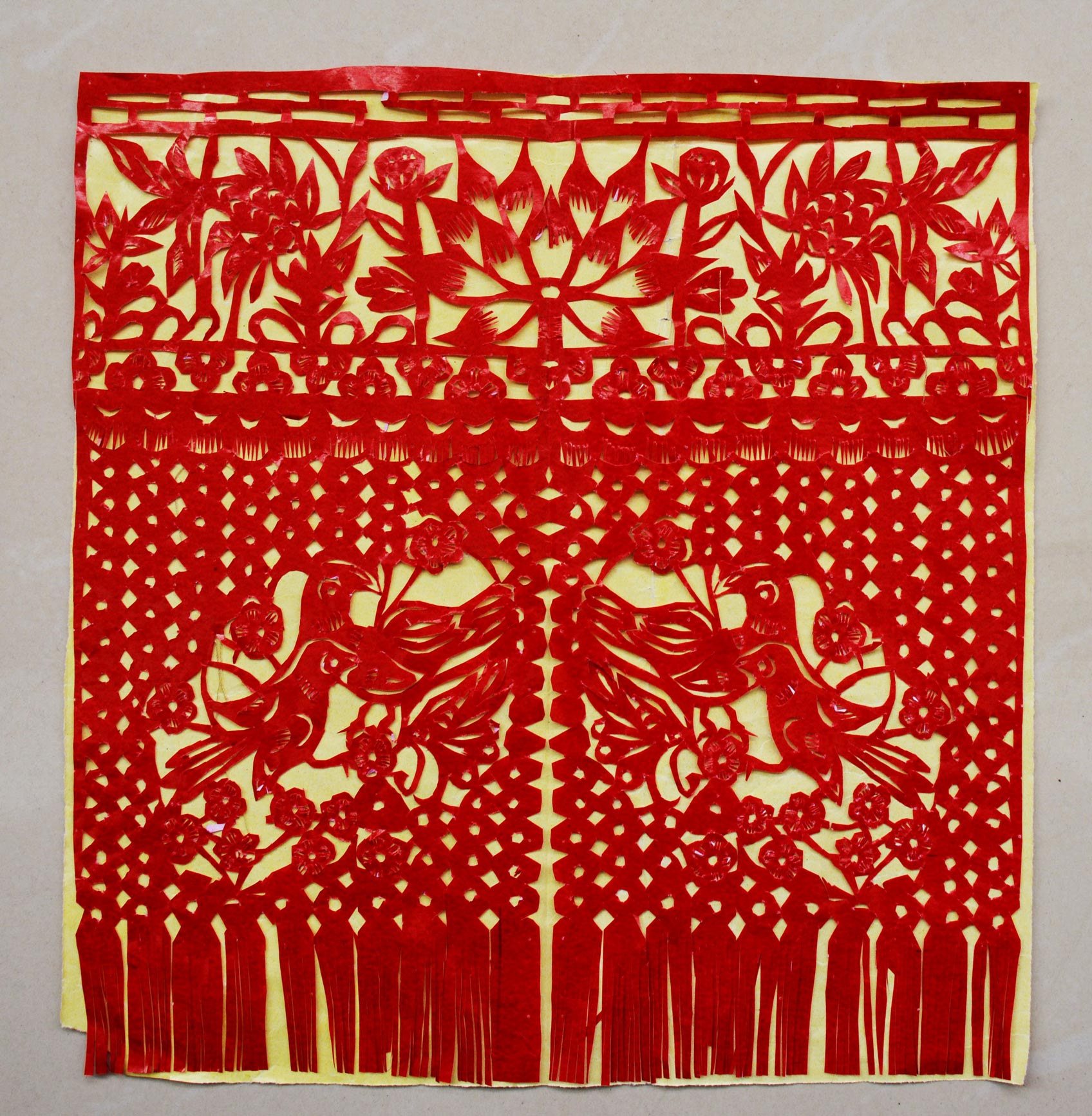 1976年1月结婚,当时23岁,结婚时的嫁妆刺绣花样基本都是自己剪,自己做,有些事母亲和姑奶奶做的。娘家生活状况还好些,丈夫家庭情况比较差。那是婆婆刚去世不久,留有三个弟弟,一个妹妹。婆家是合阳本地人。公公农民,不识字,也没有什么爱好手艺。婆婆刘叶儿是出个名的巧手,剪纸及各类女红活样样精通, 49岁病世。丈夫行相斌,国家干部,喜爱写作,特别擅长民俗文化的研究及相关民俗理论的撰写,非常支持妻子的剪纸发展。丈夫家的姨姨刘金叶会剪花,在当地较有名气。结婚两年后,1978年其弟结婚,按合阳风俗,要请人做纸塑窗花,对于一个刚过门不久的媳妇是件很难得事,无奈,自己一个人开始做,一连做了7天,内容是《三滴血》《花庭相会》,当窗格挂出后,全村人震惊了,从此后,村上每逢结婚大事,刘民芳都是一名义务做窗花的人。几十年里,先后做窗花一百多副,副副都叫村里人称赞。婚后生育一女一子,女儿在县民政局工作,儿子在海军某舰队任职,女儿从2016年开始抽空学习剪纸。