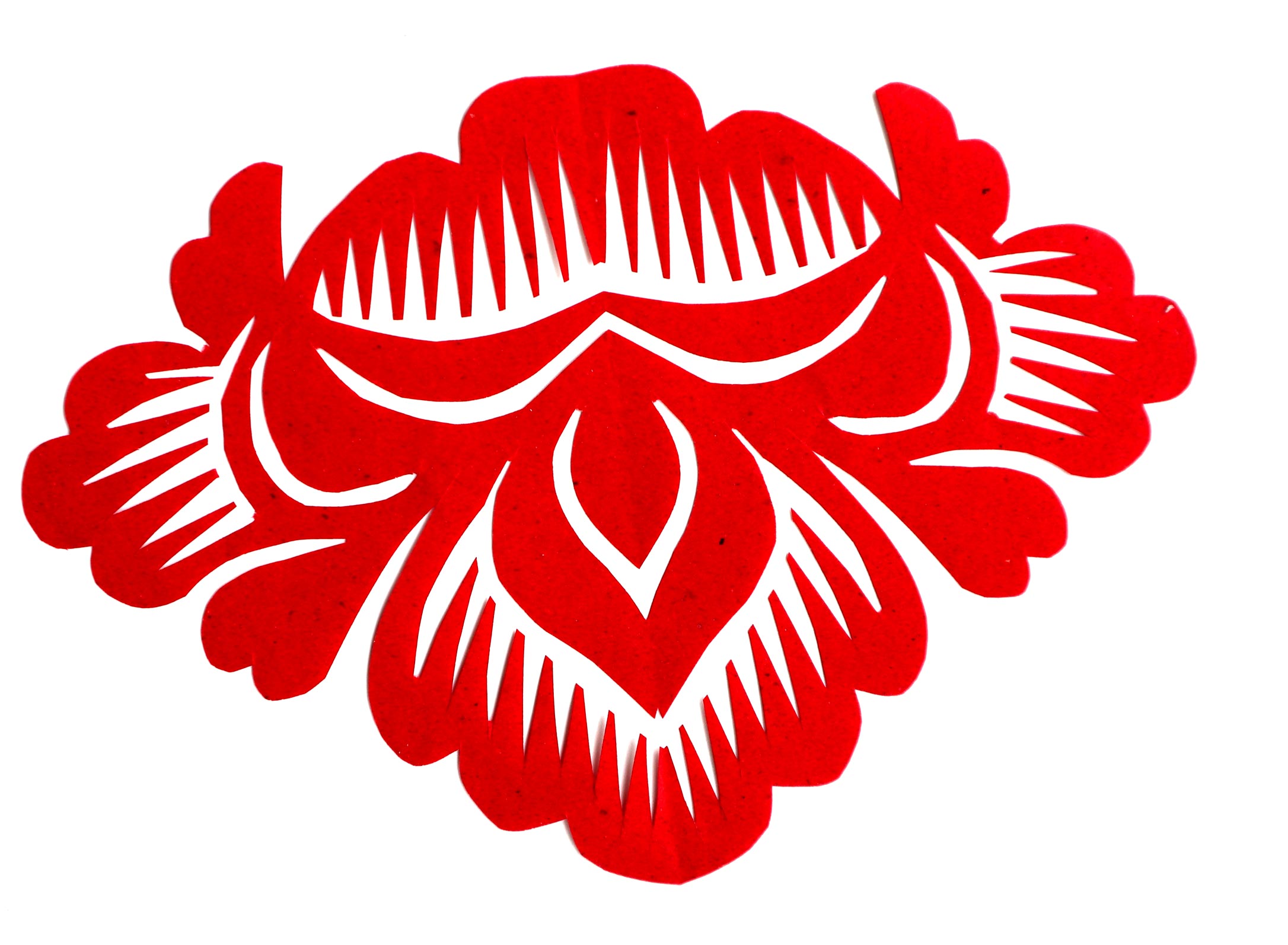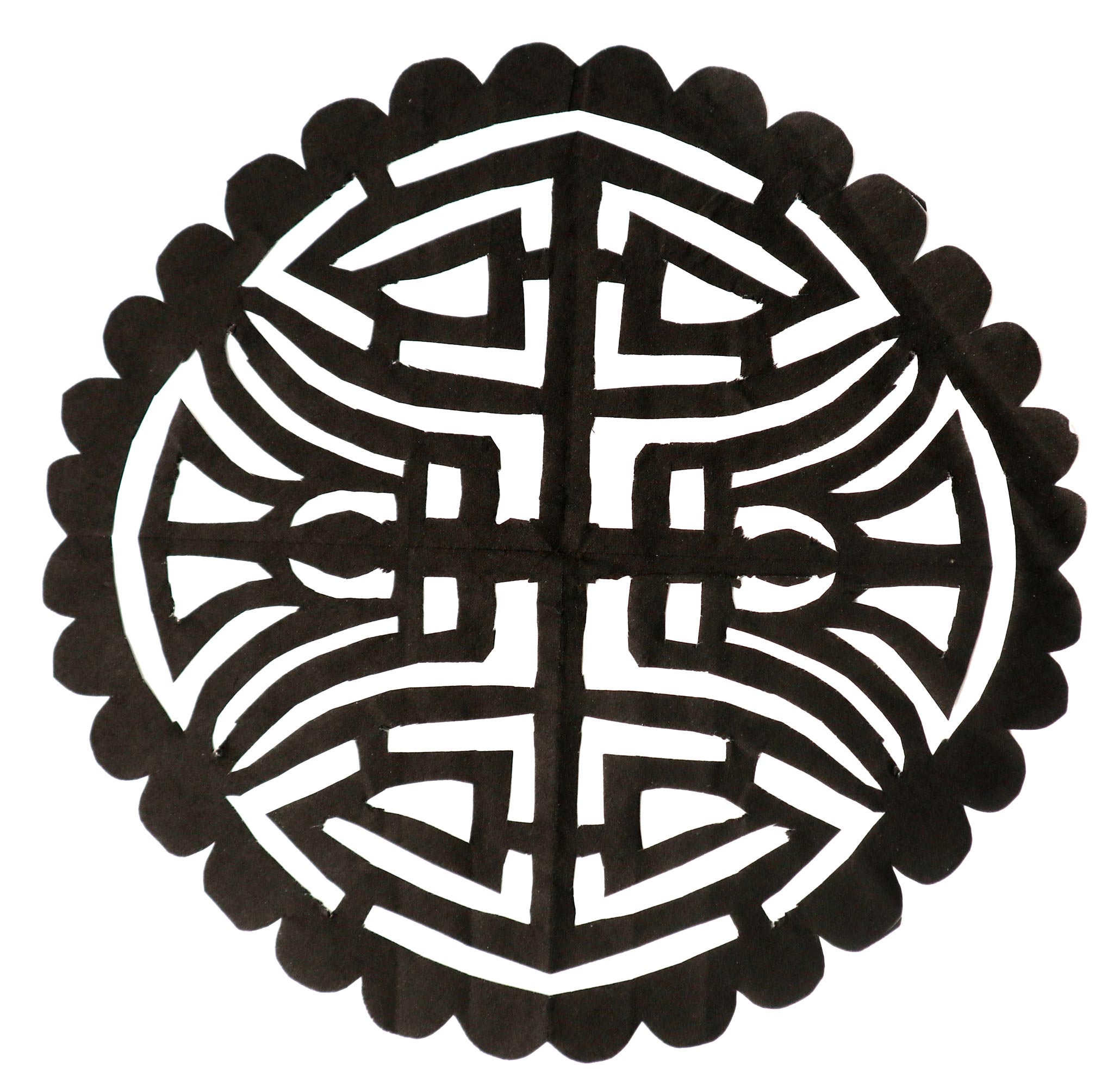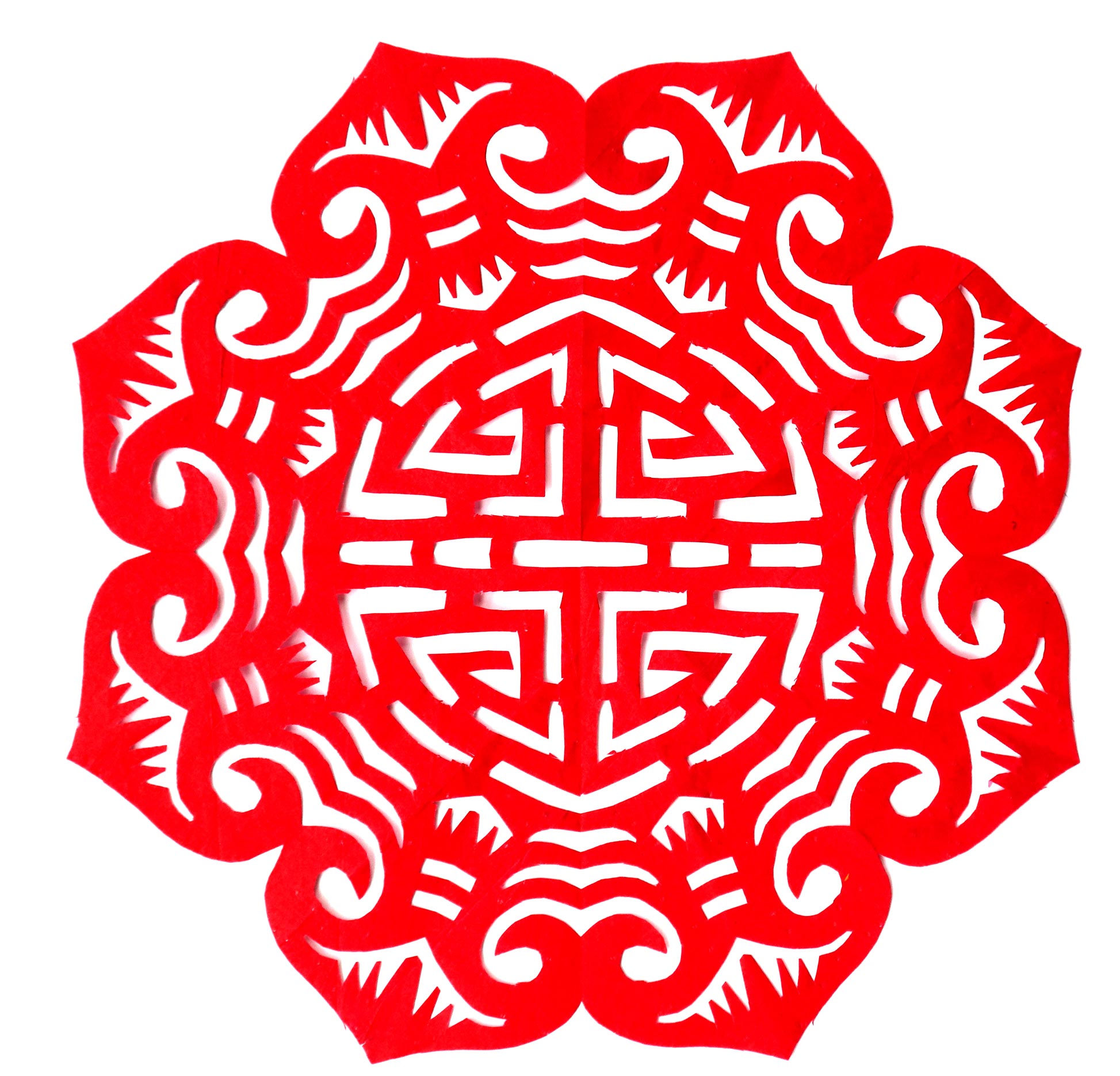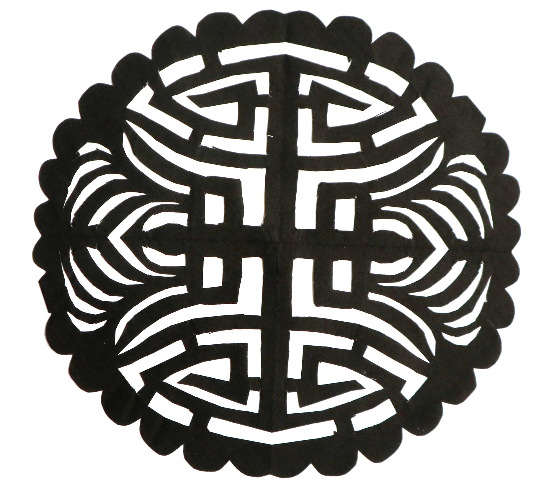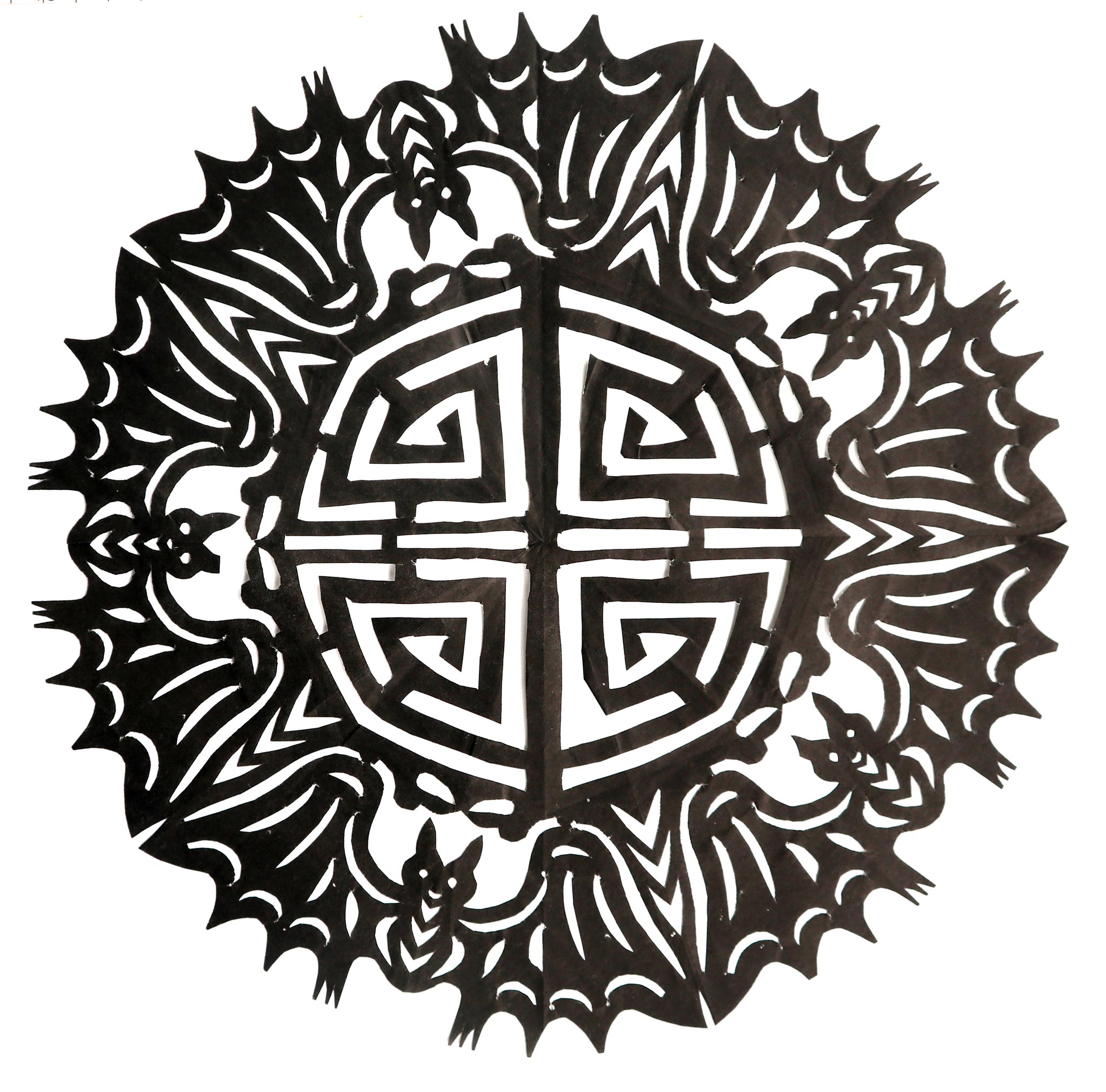 唐玉莲的剪纸作品主要用于庙宇活动。她剪的门符,寿字团花等,造型古朴厚重,有陵墓石刻的艺术气质。