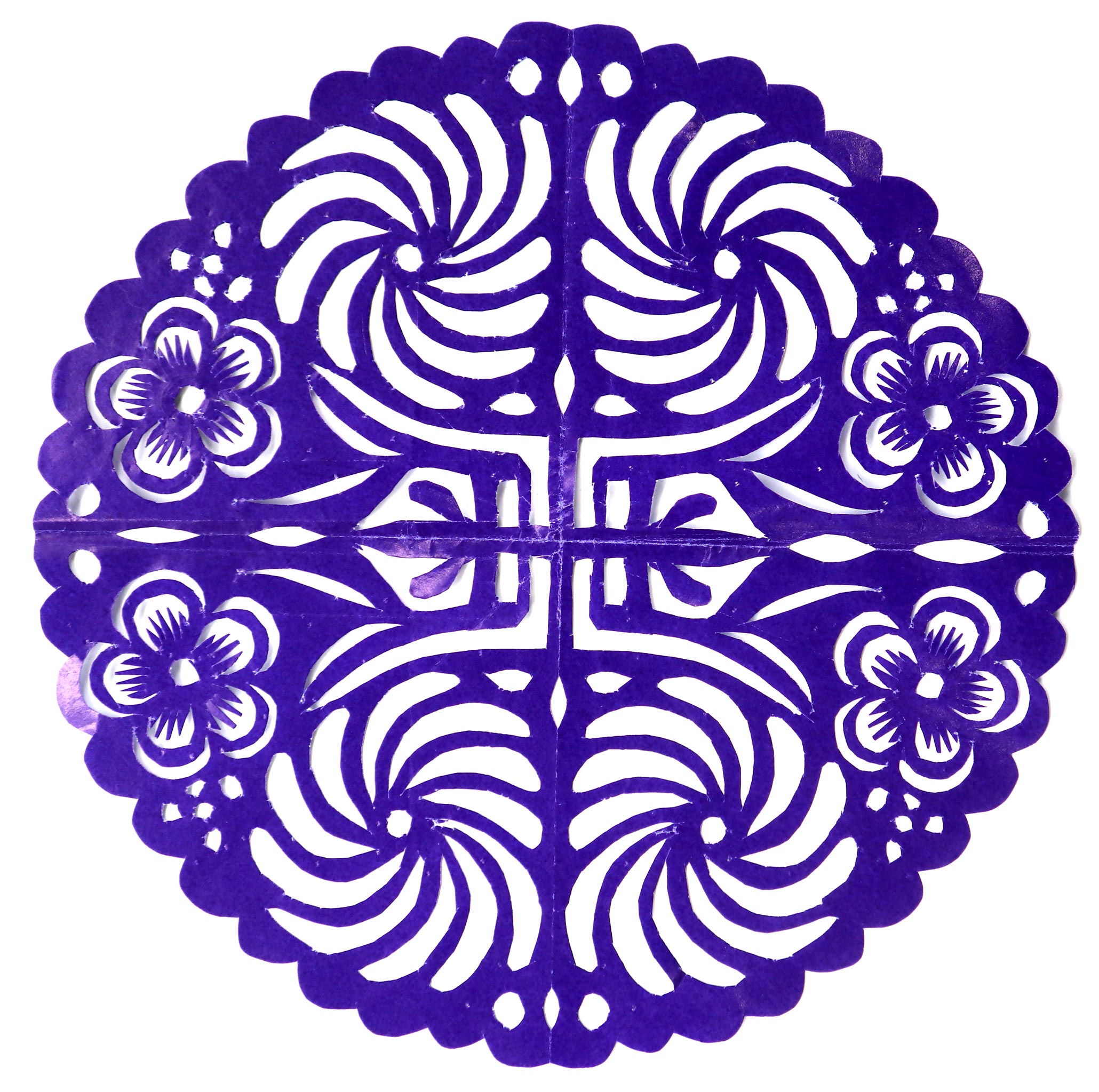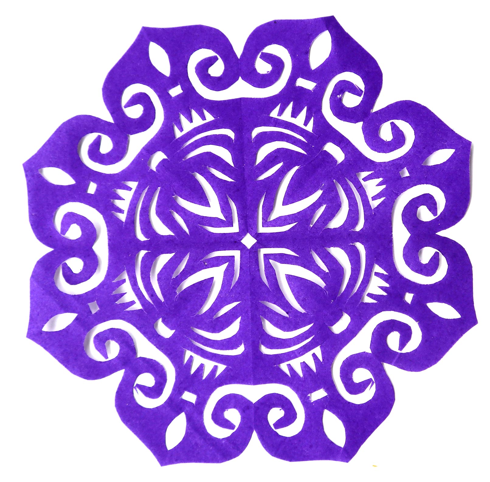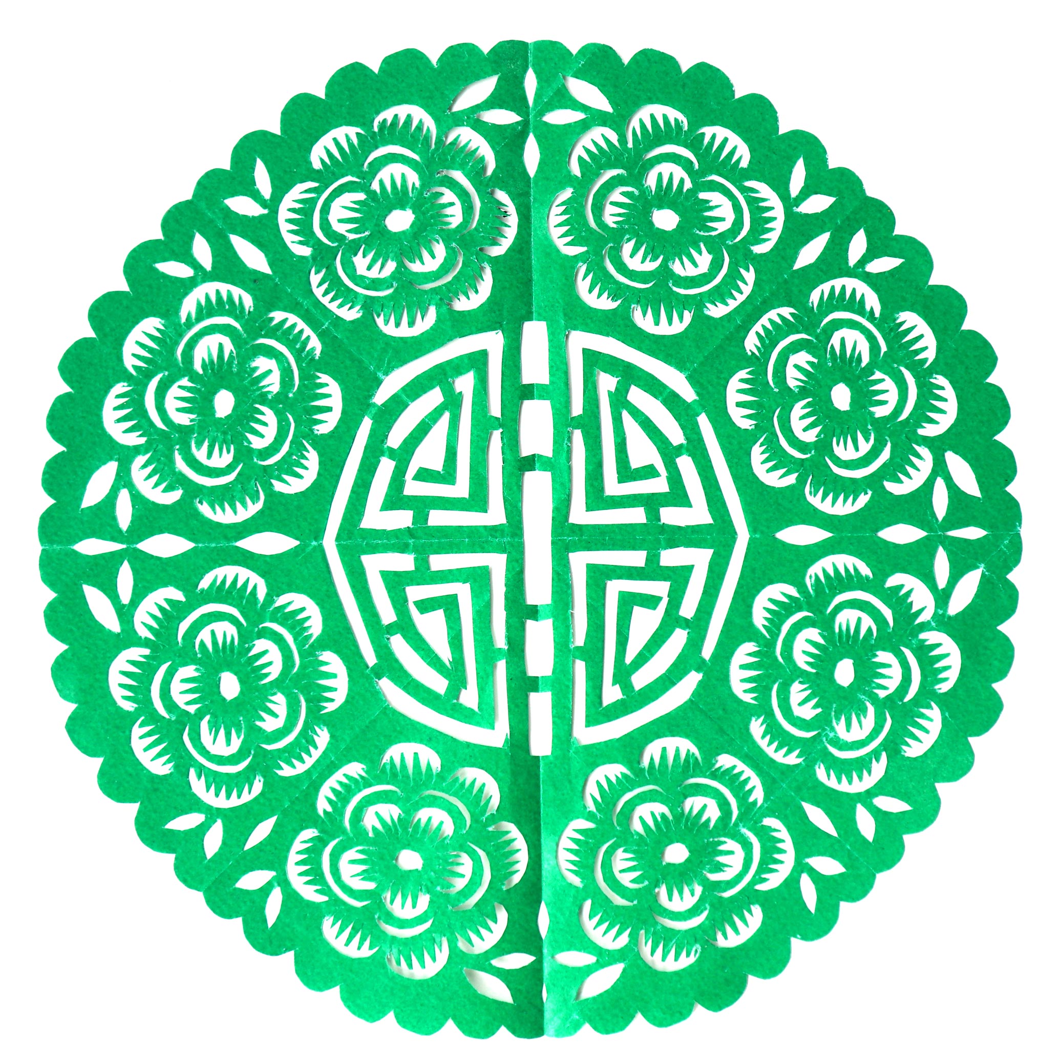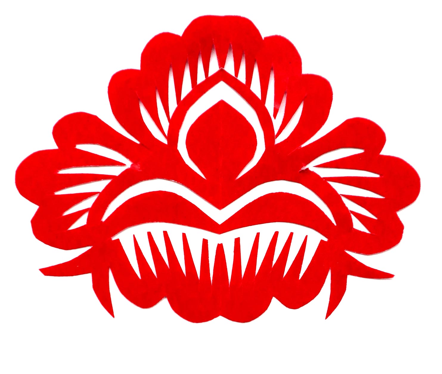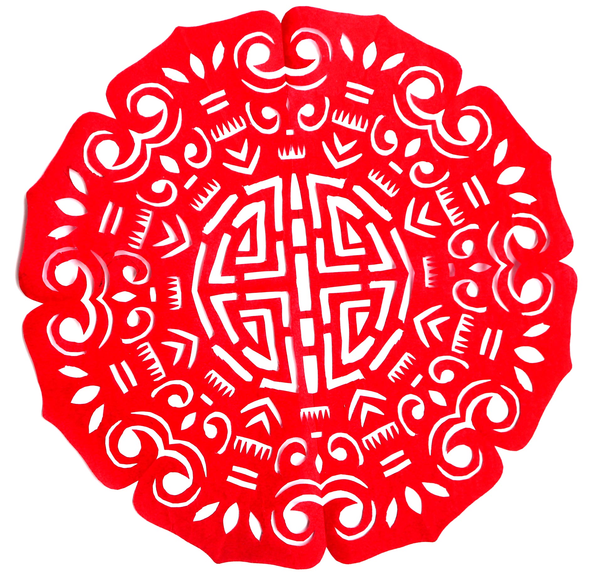 唐玉莲的剪纸作品主要用于庙宇活动。她剪的门符,寿字团花等,造型古朴厚重,有陵墓石刻的艺术气质。