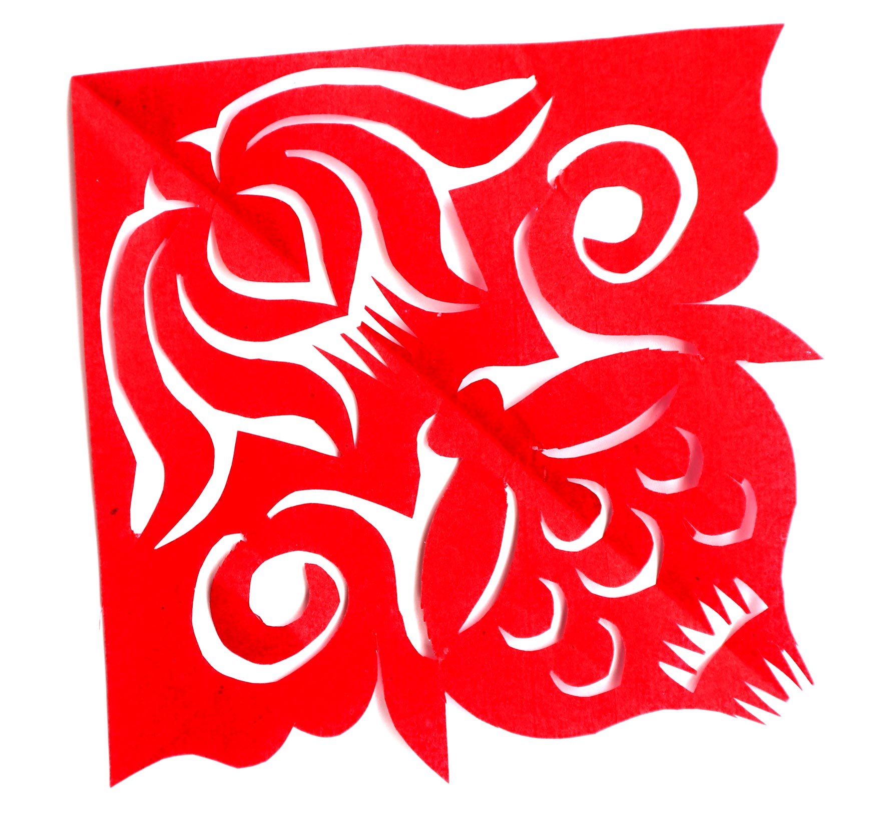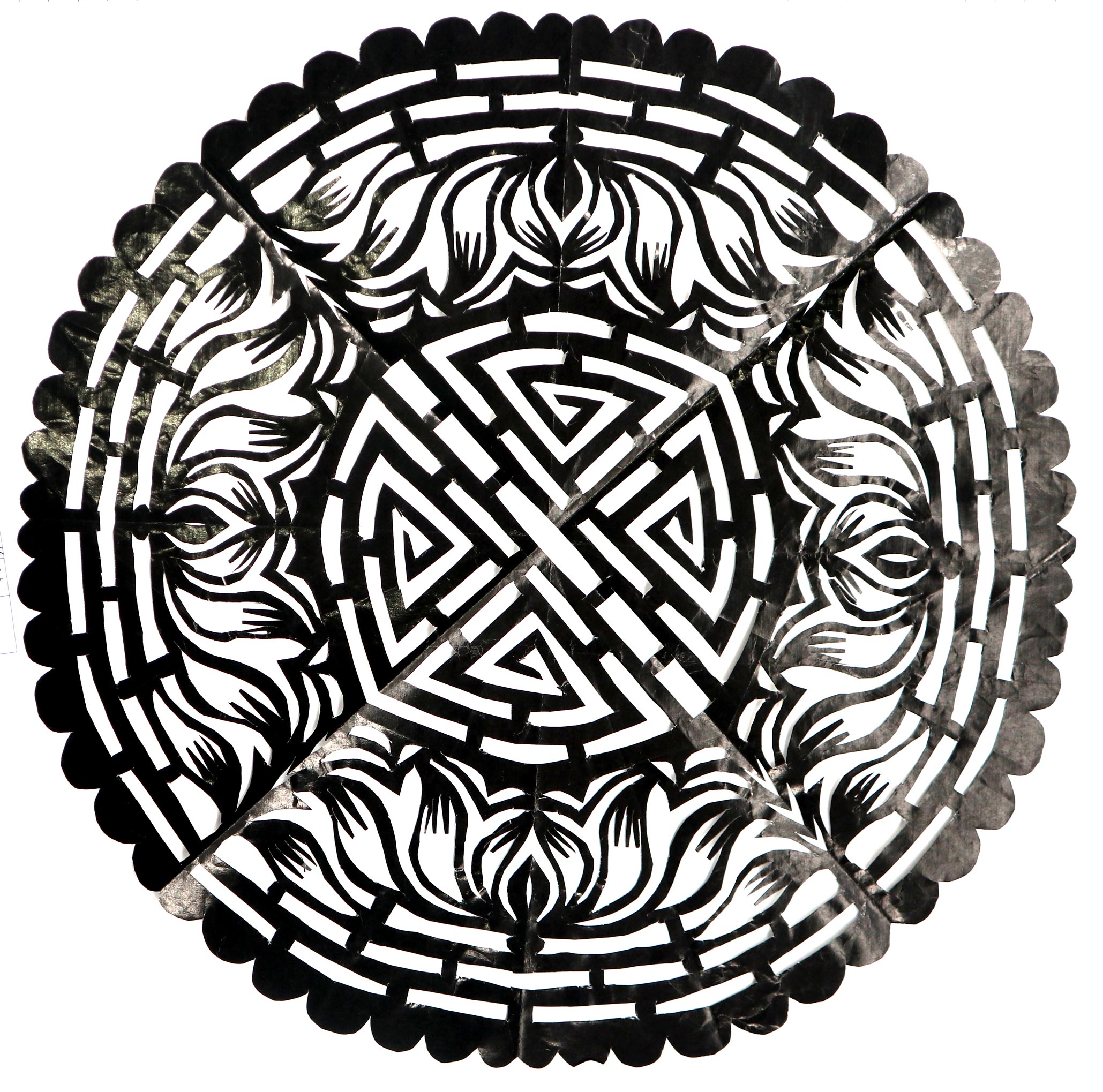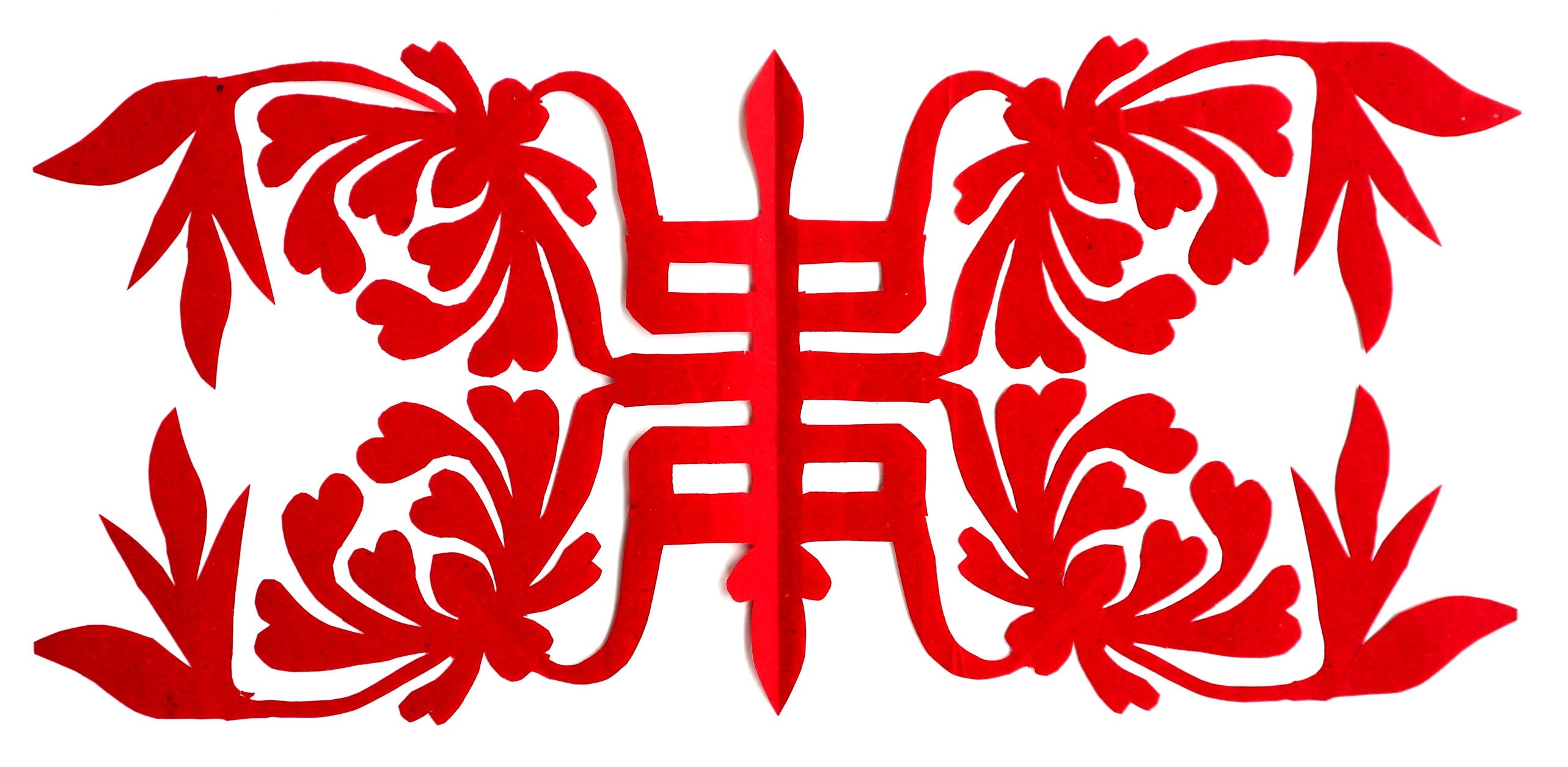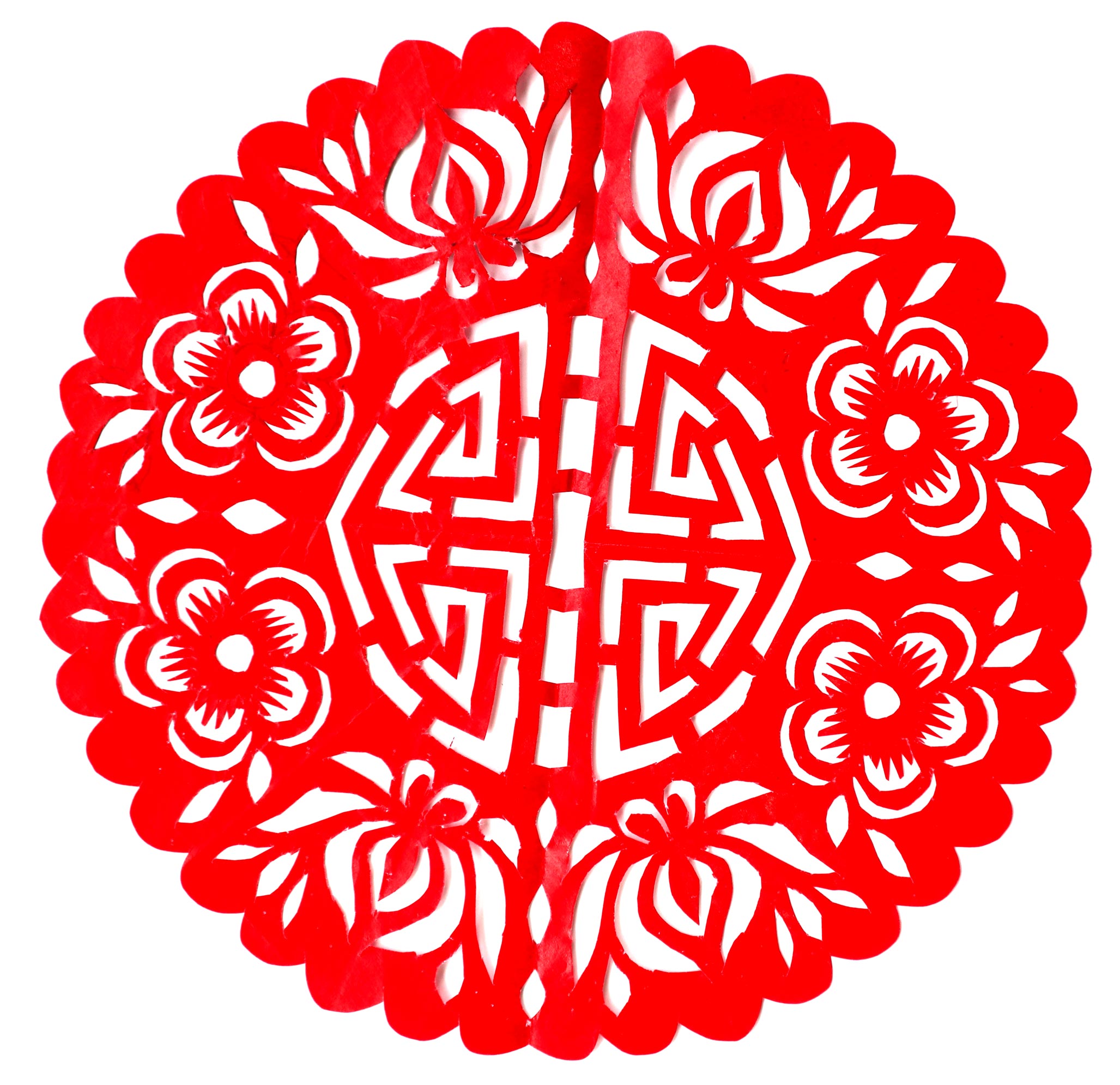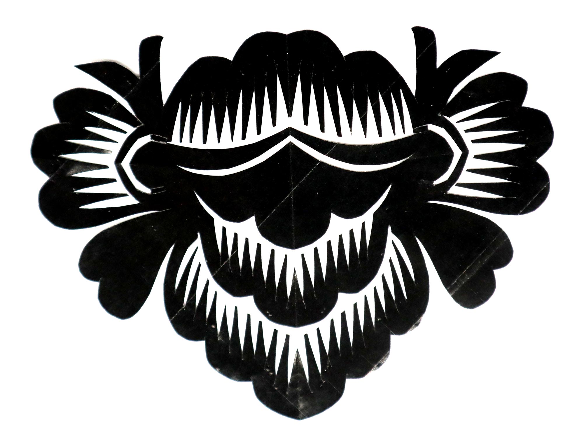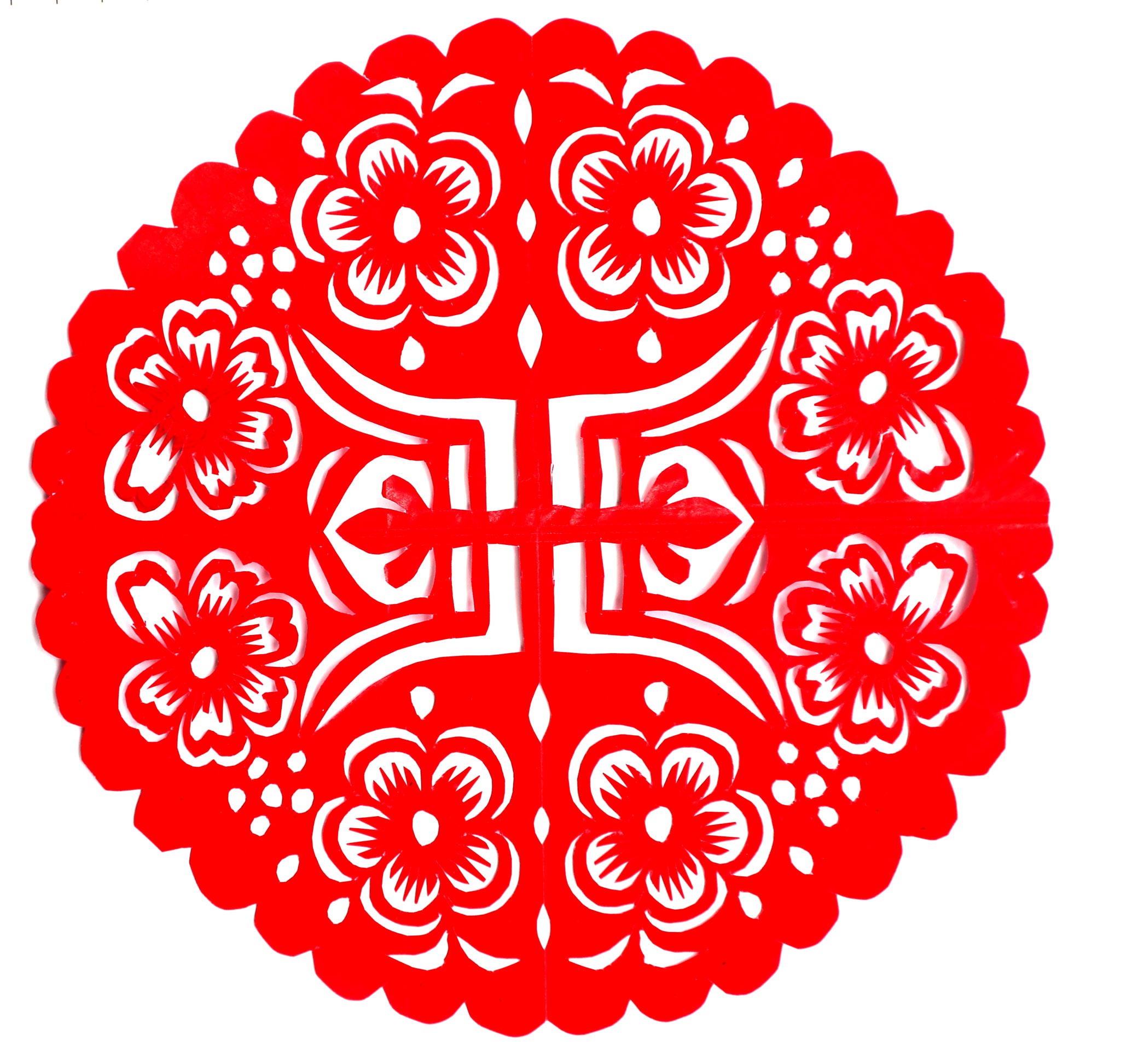 唐玉莲的剪纸作品主要用于庙宇活动。她剪的门符,寿字团花等,造型古朴厚重,有陵墓石刻的艺术气质。