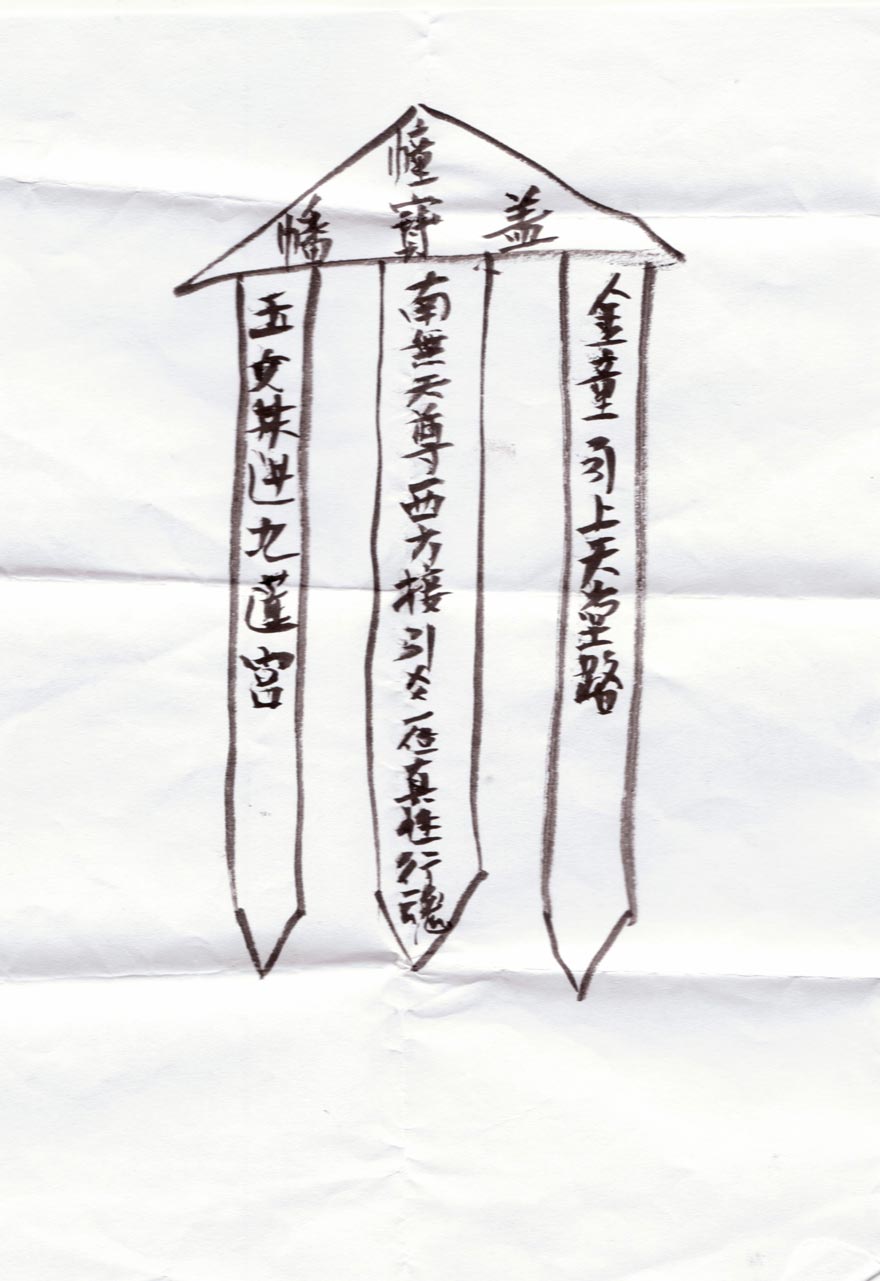 2002年,王会芳信奉大道门,学着念经,也开始照着别人的剪纸样子剪一些庙宇上使用的神幡、经幡、门旗剪纸等,后来学剪神衣神袍神靴。学剪纸是要花功夫的,她没事了就剪,有时身体状态好,剪一天还想剪。有时别人的样子她觉得不好看就重新修改装饰,添加些自己学到的纹样。此后每年庙上过会,经幡、斗花、门符都是王会芳来剪。庙上的巧人很多,她们之间相互学习,人家有好样子,她便给自己复制一套作为学习资料。闲暇时剪一些庙会常用的纹样放起来,到庙会期间,把这些纹样往旗幡上一贴就成了,不耽误事情。对于神幡上写的内容,因为自己不识字,她请别人写在样幡上,小心收藏,总担心弄错了,对神不敬。凡给庙宇里剪剪纸,只要庙上有需要她就剪,纸张都是自己出,从不要一分钱。一般一张纸裁八个门封(符),每个尺寸约20×50厘米,门封用五色纸剪出讲究东方绿,南方红,中间黄,西方水红,北方黑。内容多是《万事如意》《连年有余》等传统纹样。