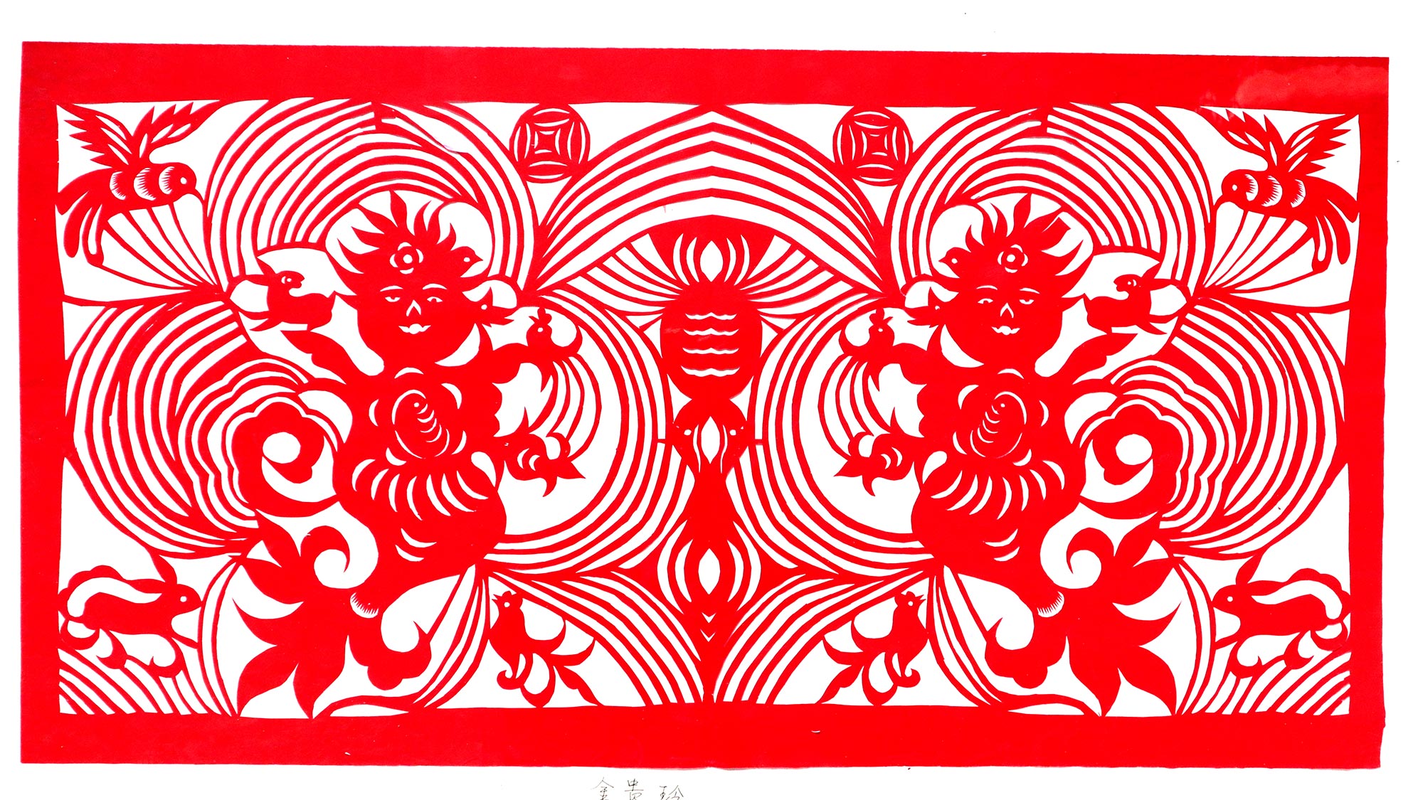 金贵玲不但会剪纸,还擅于绣花做鞋,画绣样,裁衣服,编筐等,各种农活都会干,是村上的能人巧人。常常被绣品店邀请画鞋垫花样。现在家里还种了几亩的香瓜,一天到晚在地里忙。她创作能力极强,能把自己的生活用剪纸这样的艺术形式反映出来。