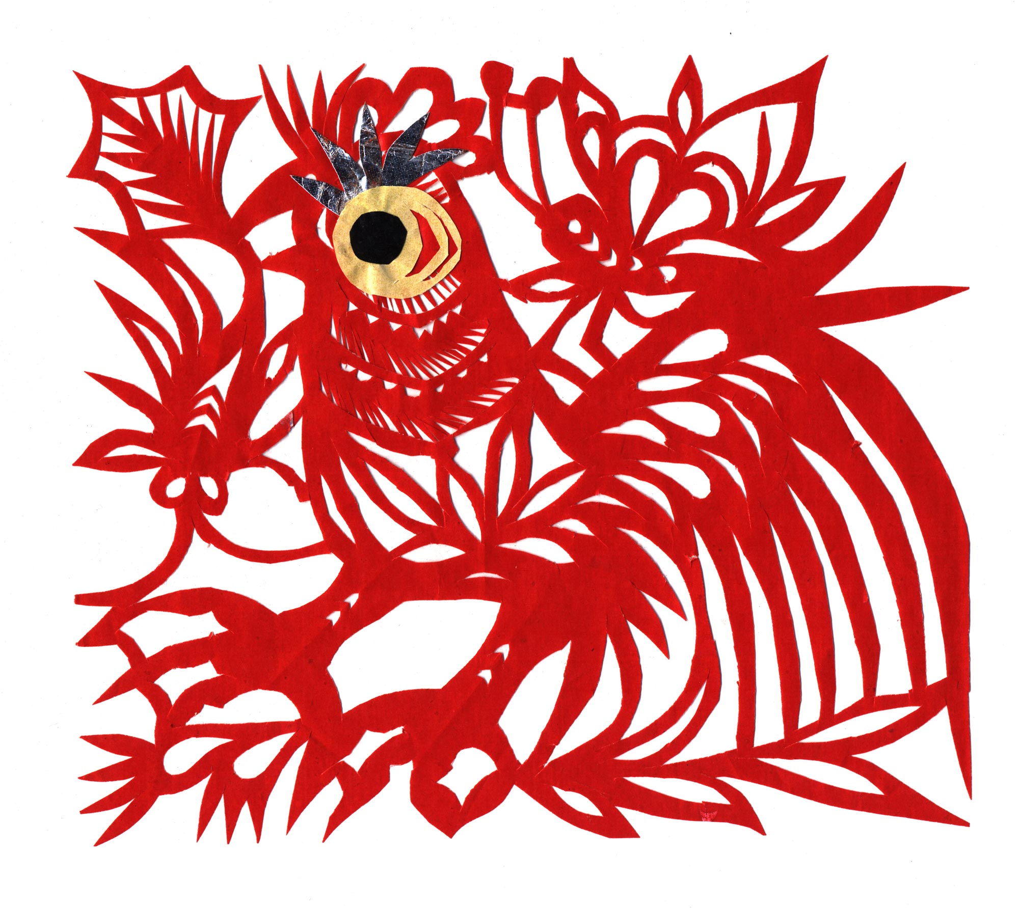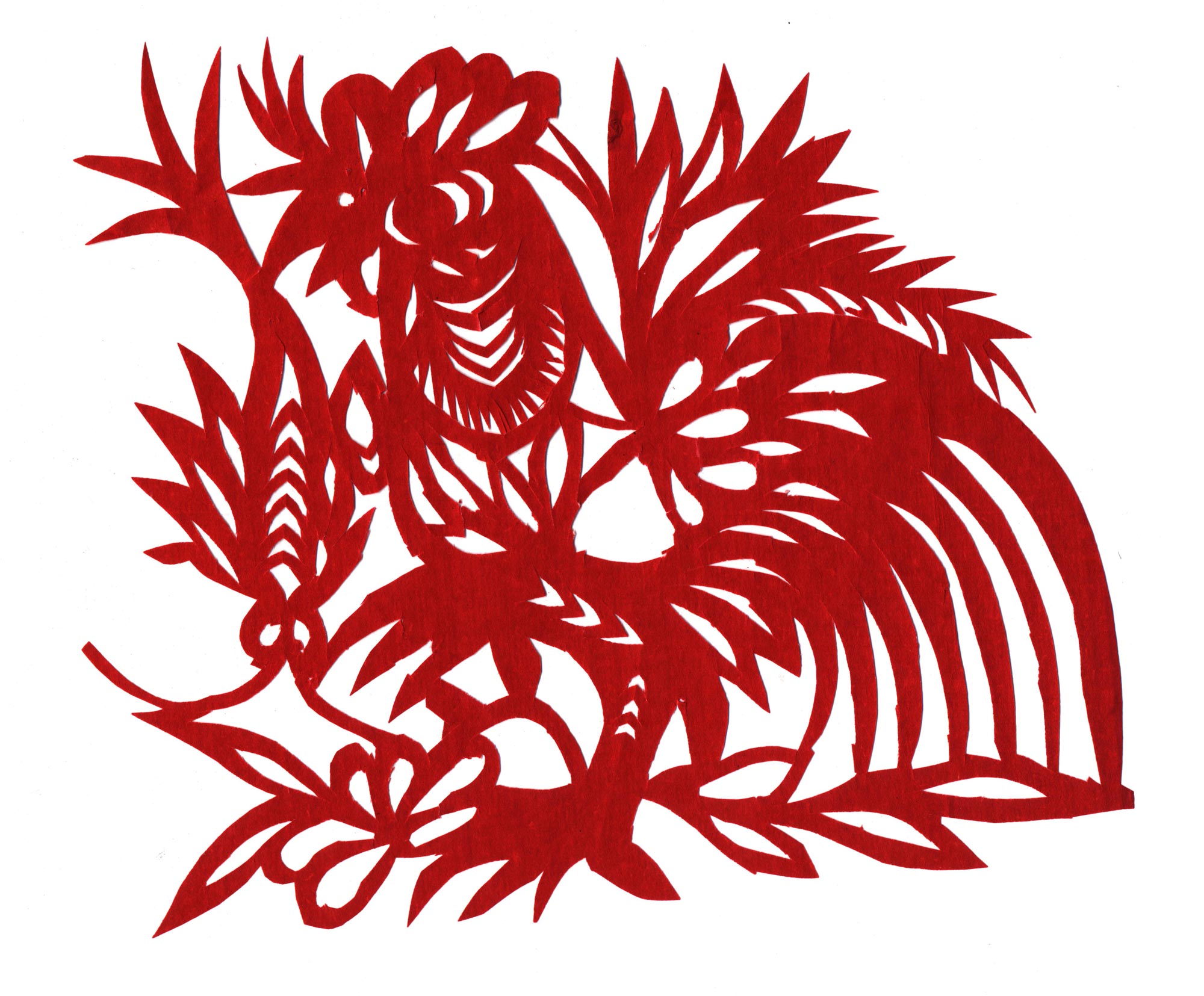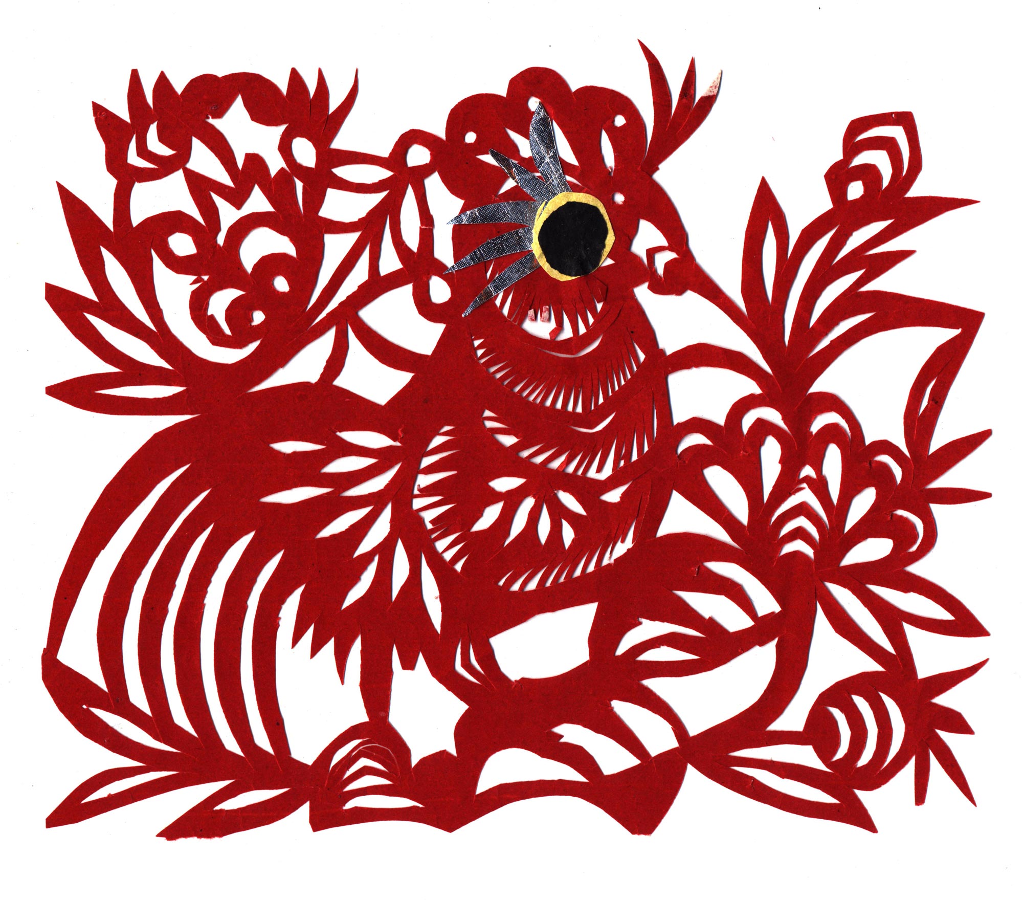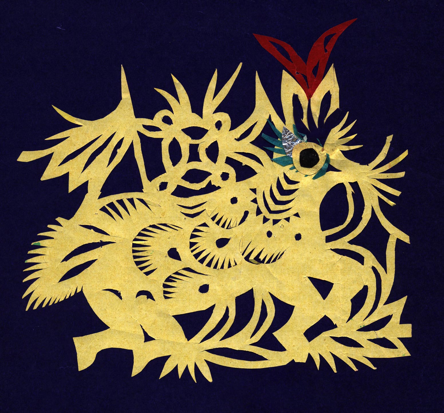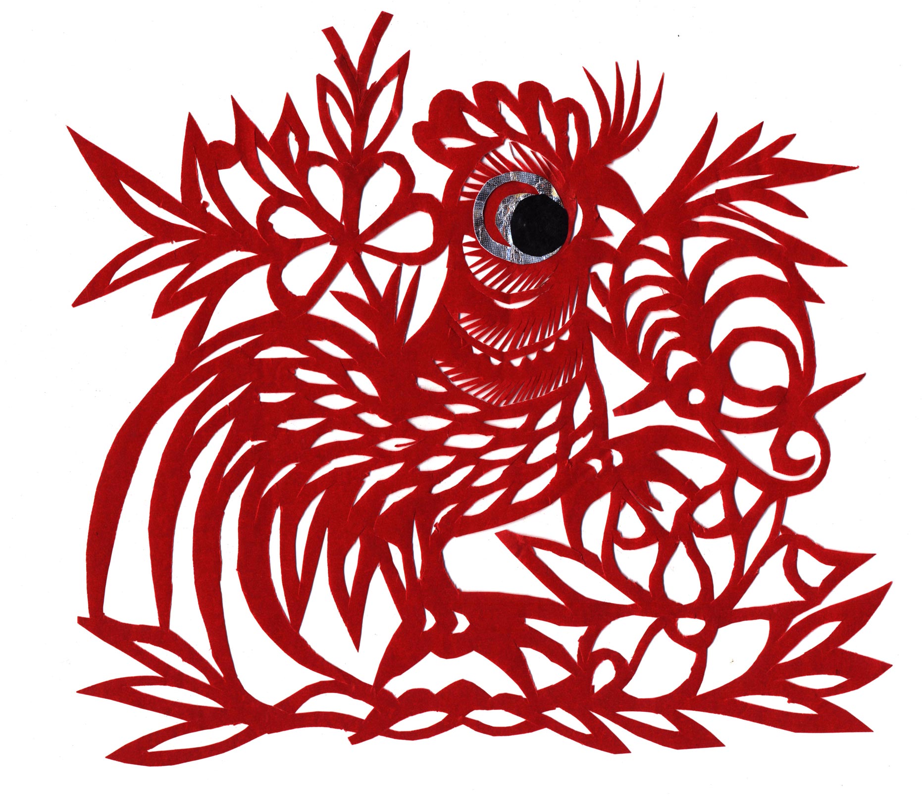 倪培莲剪纸时喜欢用大剪刀,不画不描,下刀直减,风格粗犷大气,淳朴浑厚。
