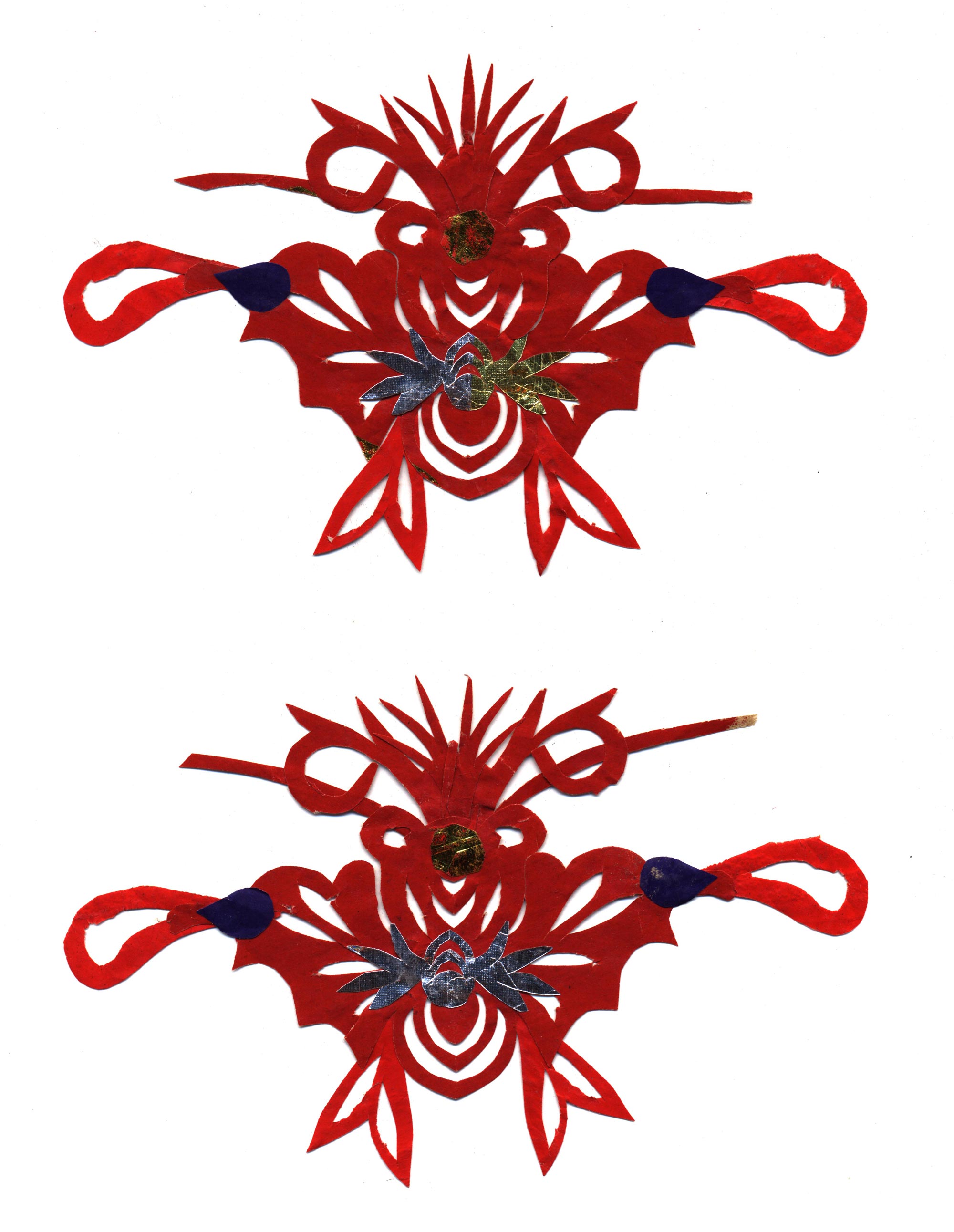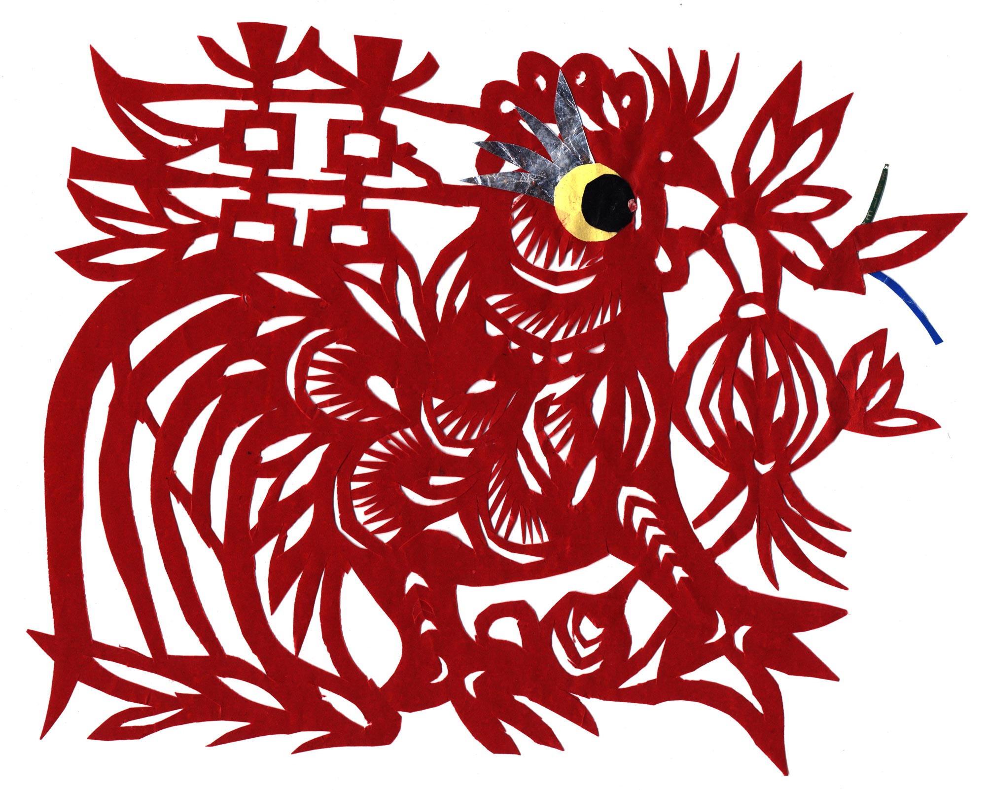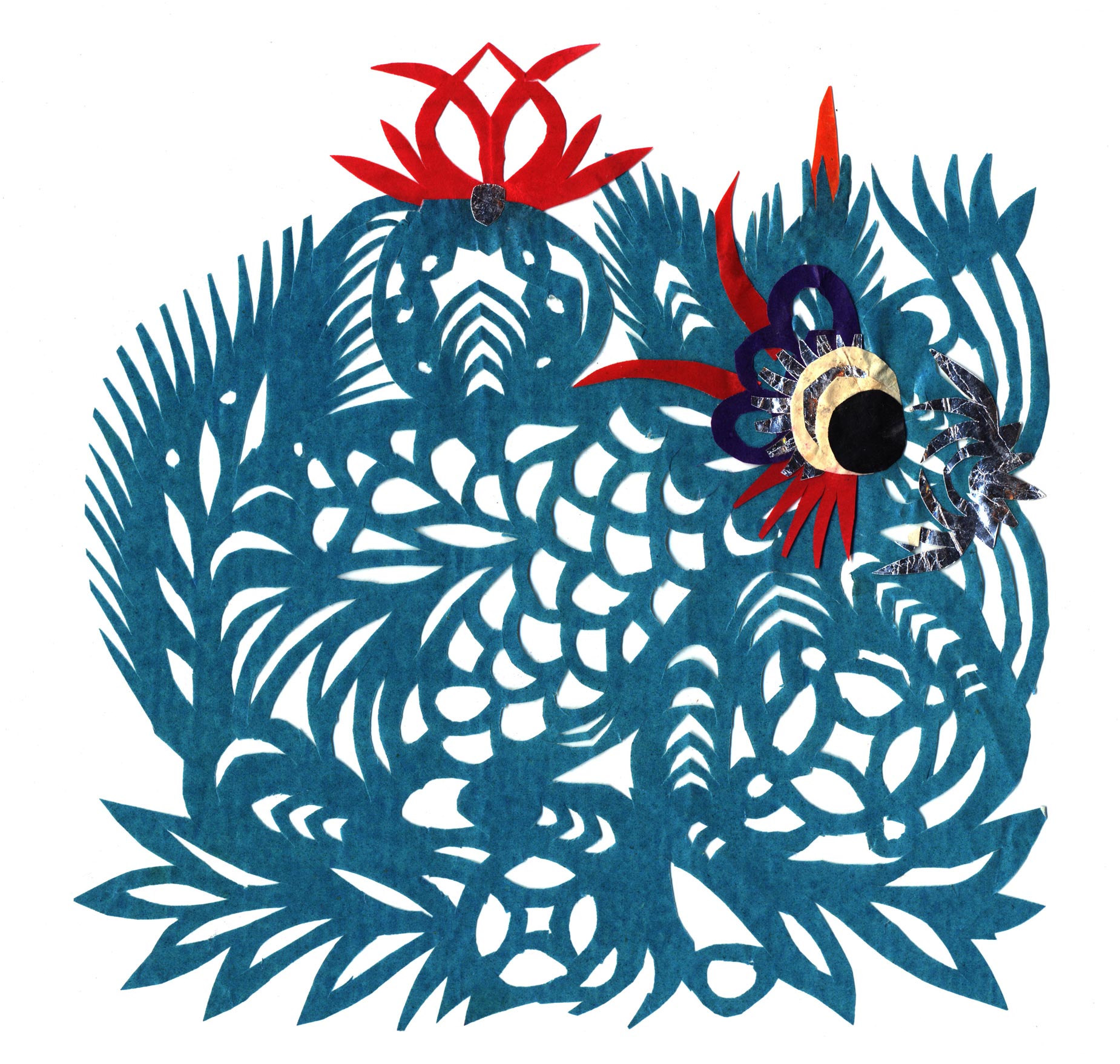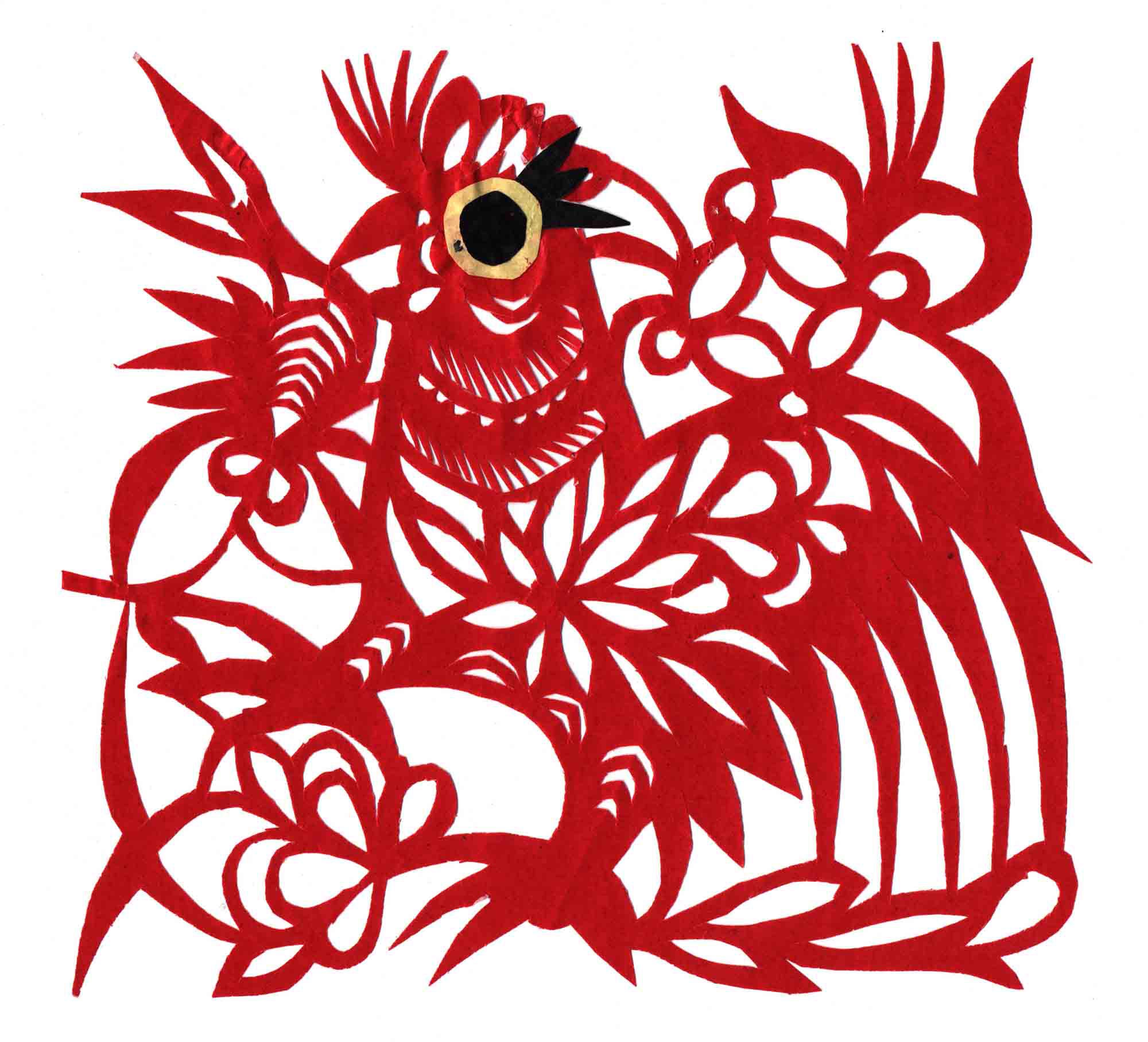 倪培莲剪纸时喜欢用大剪刀,不画不描,下刀直减,风格粗犷大气,淳朴浑厚。