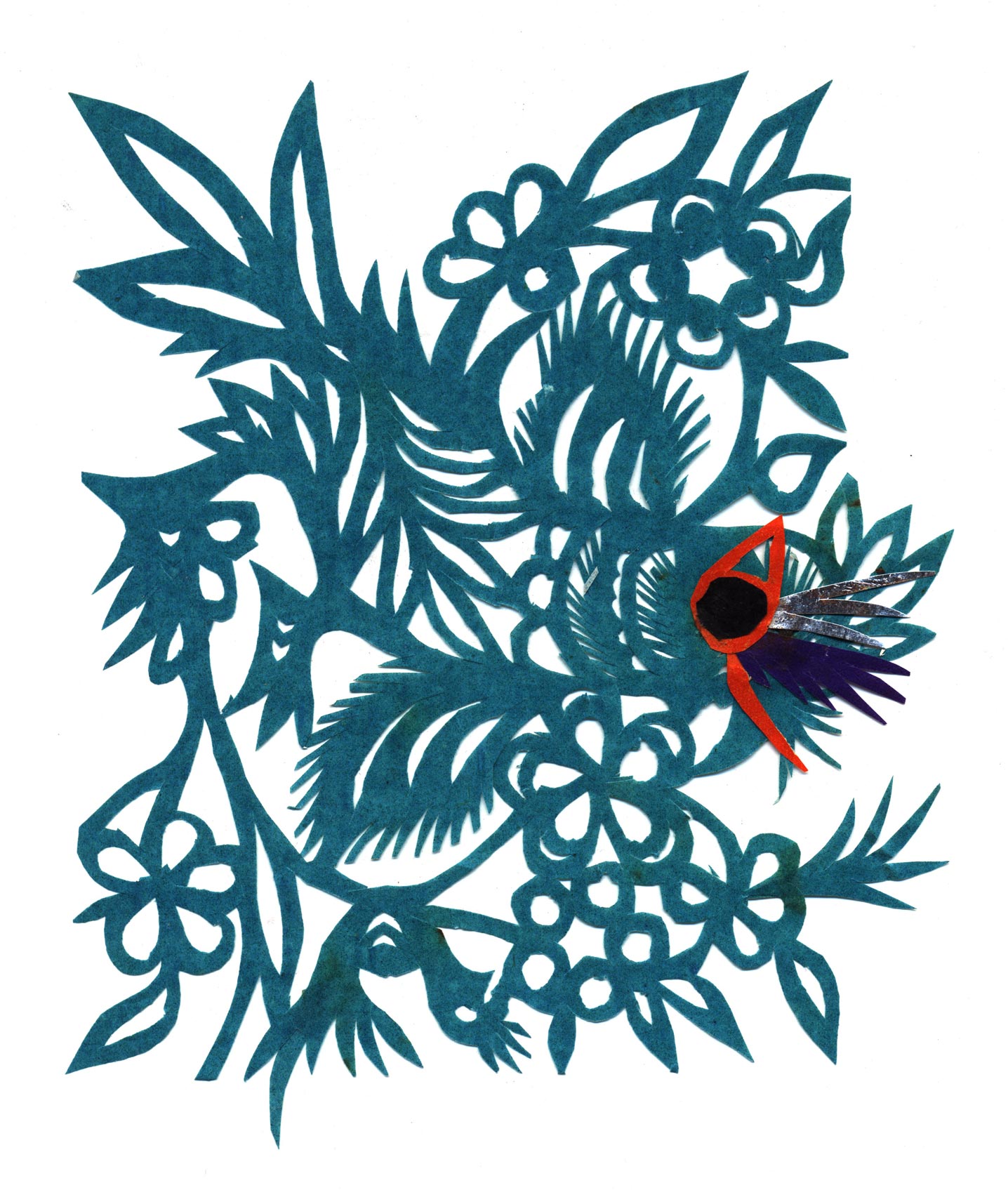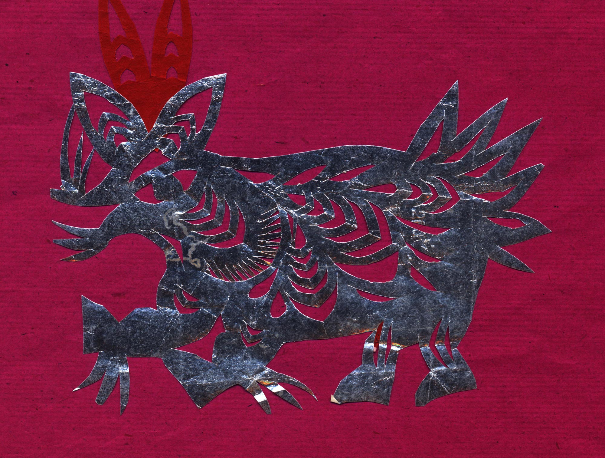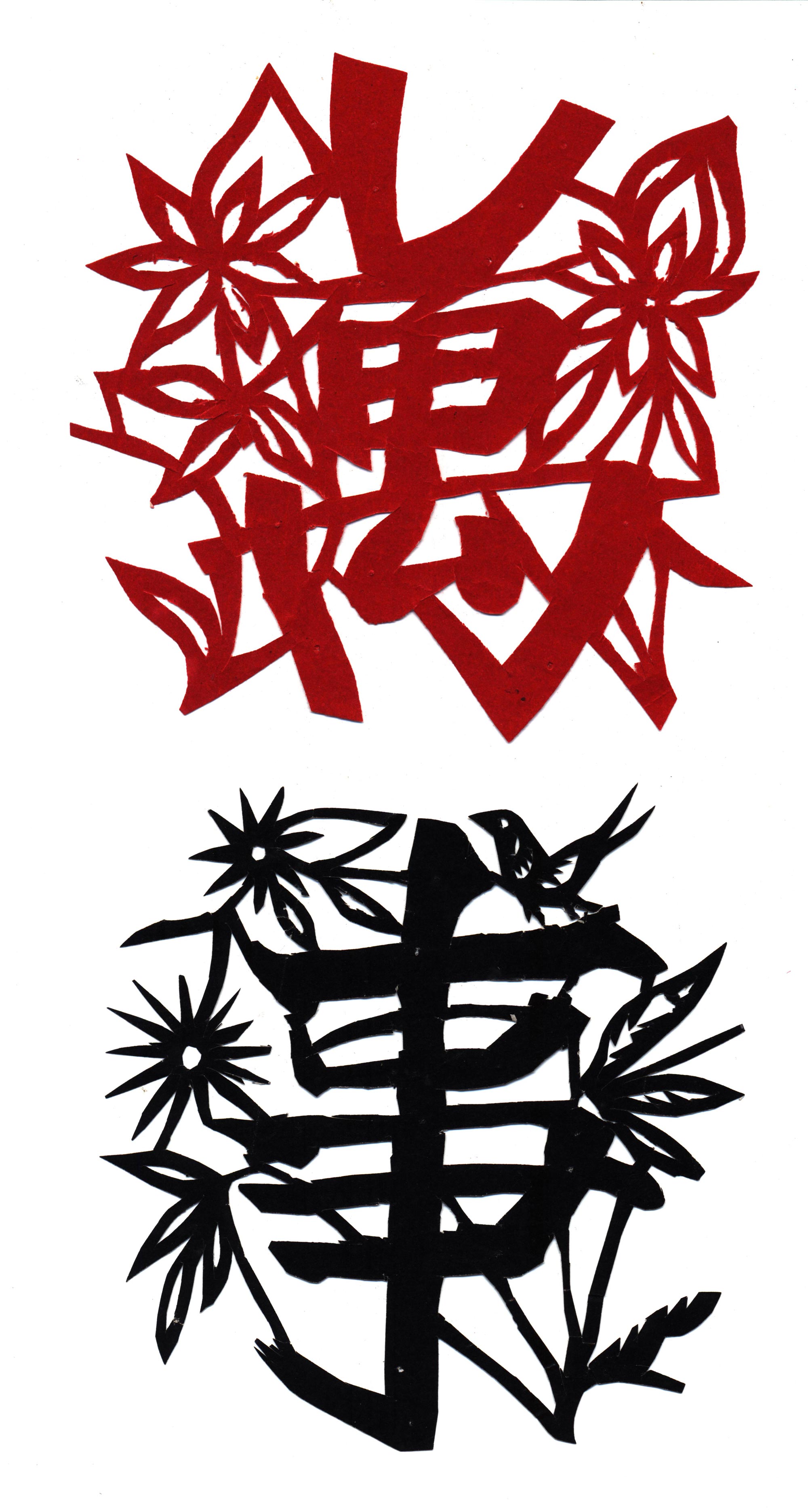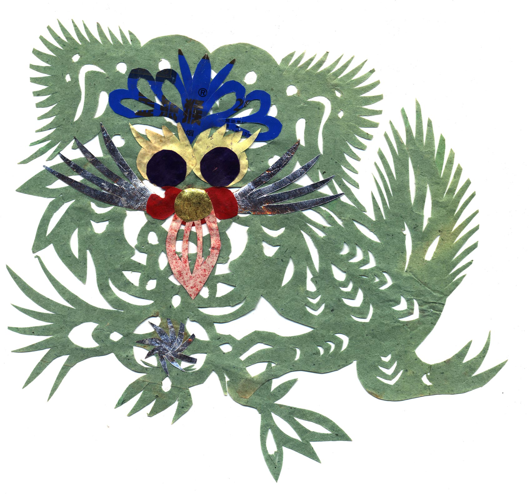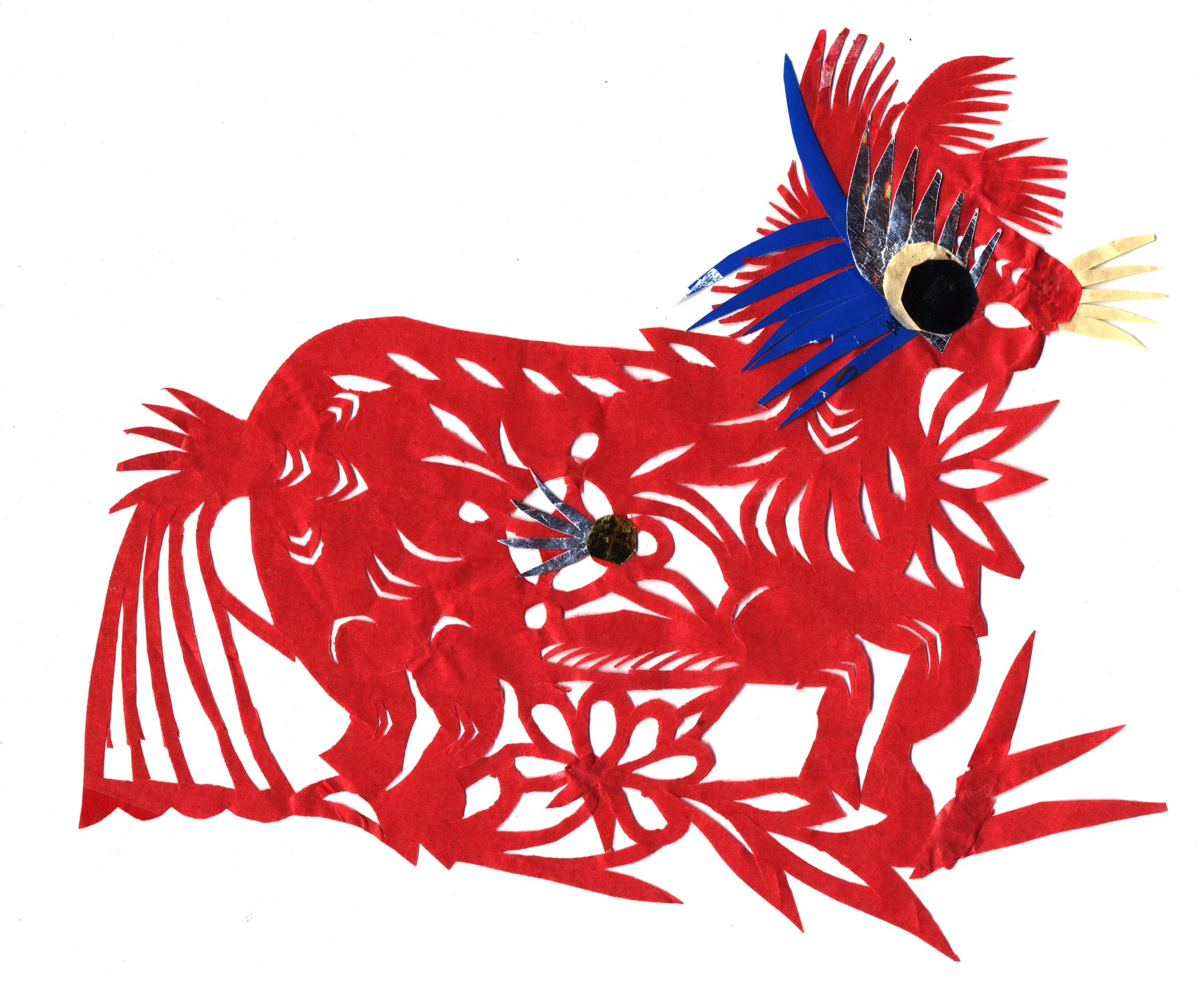 倪培莲剪纸时喜欢用大剪刀,不画不描,下刀直减,风格粗犷大气,淳朴浑厚。