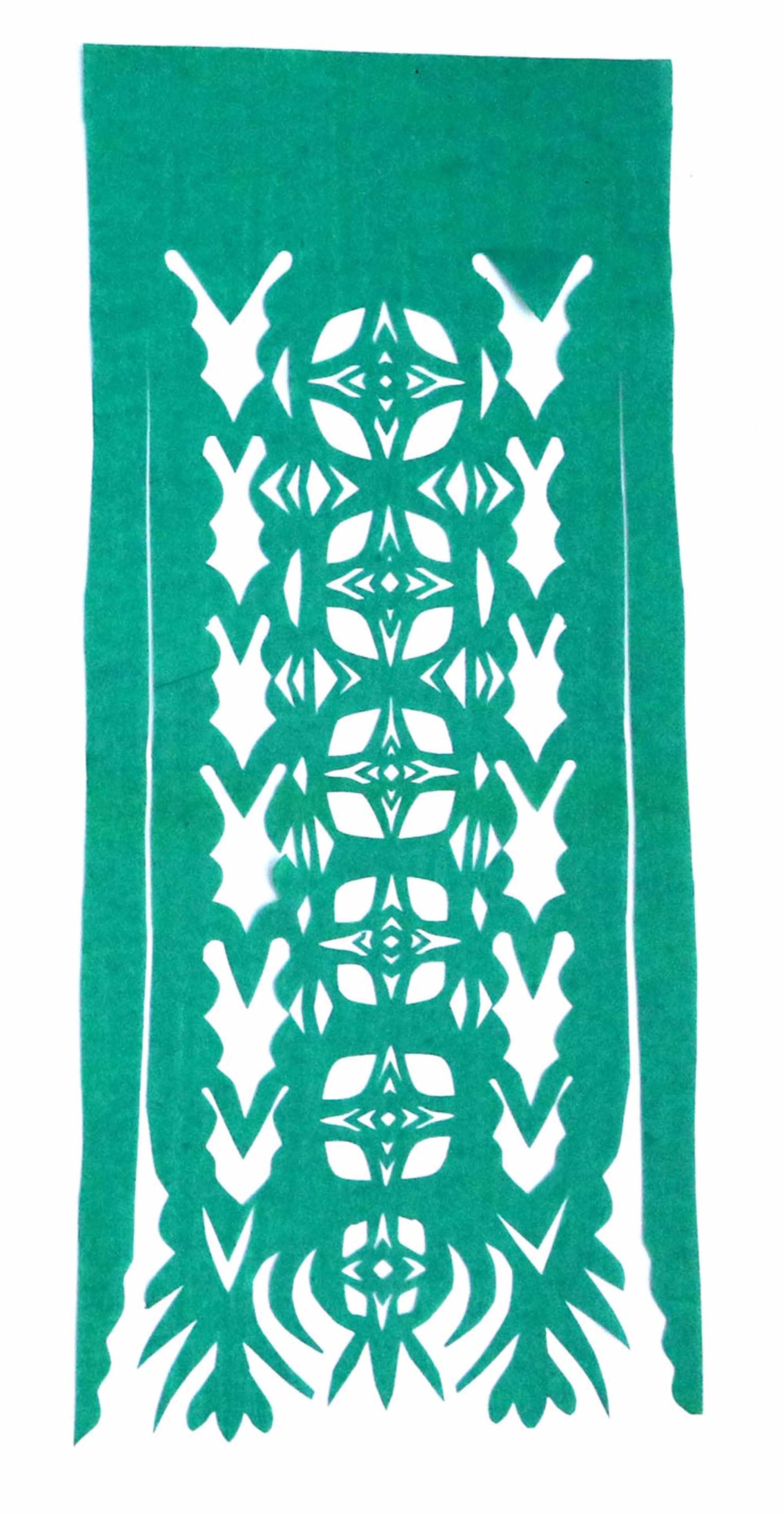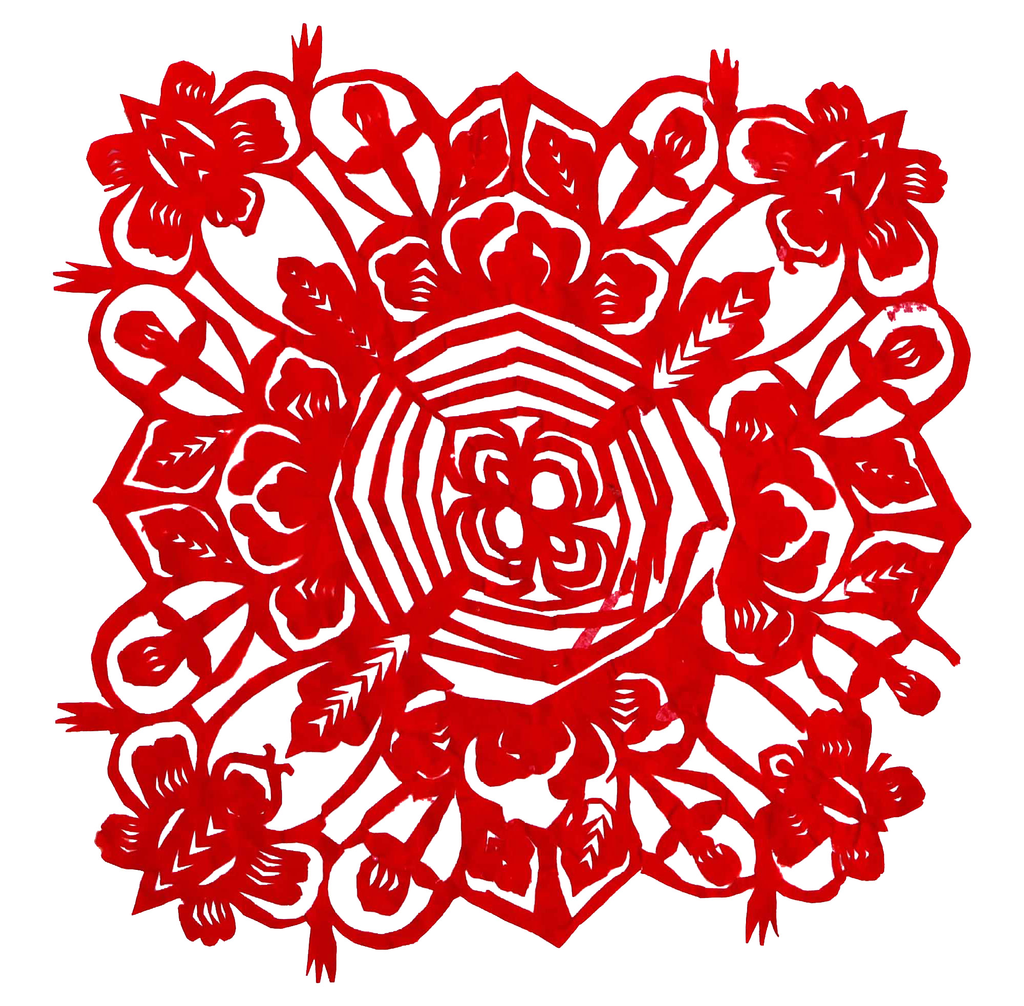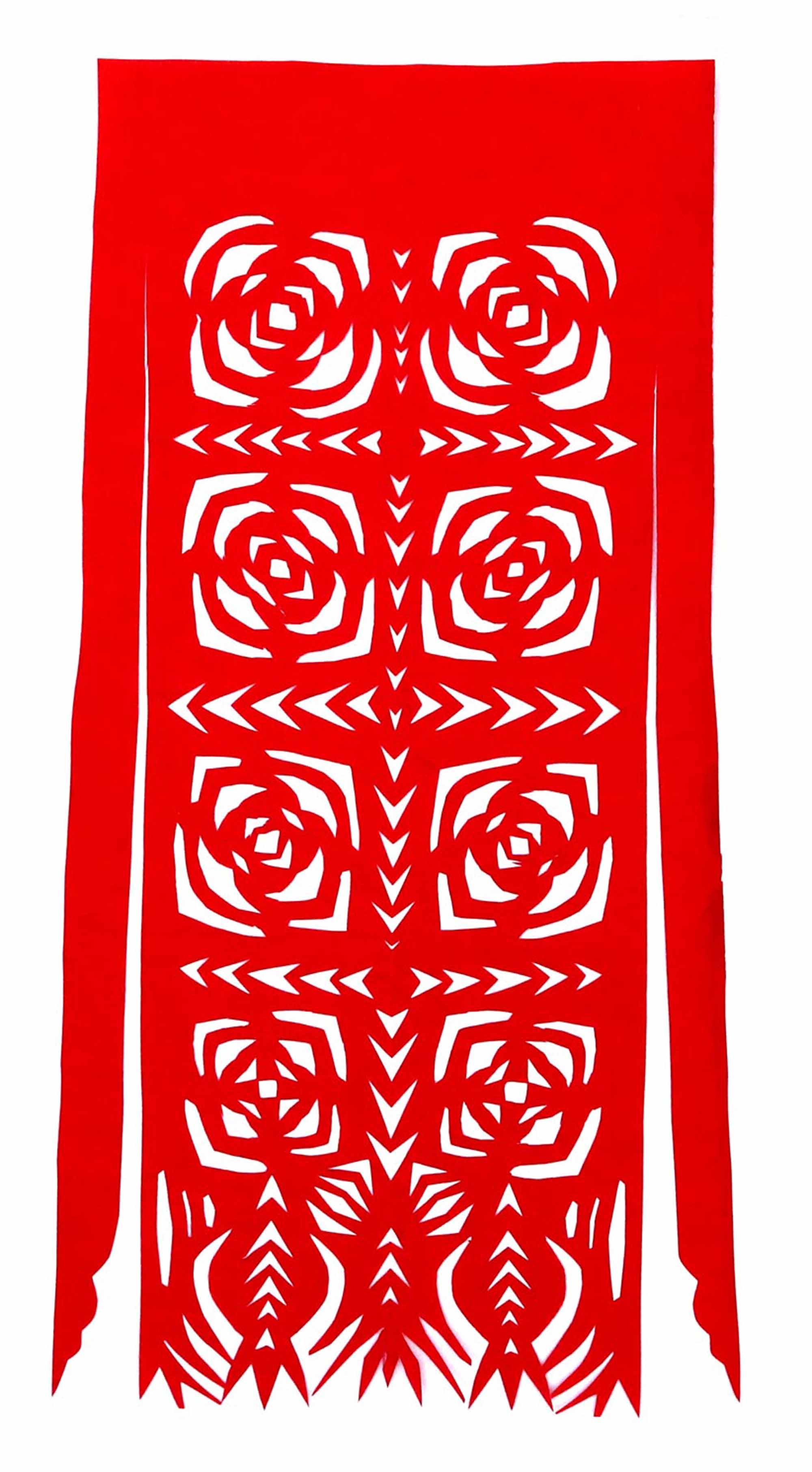 村上的人都知道卢玉爱能剪会画。庙会期间,村上妇女硬拉着她一起参加庙会剪纸的制作,庙宇剪纸中的幡、匾、旗尺寸较大,纹饰变化复杂,剪时一会要折叠着剪,一会又要打开着剪,不同的纹饰用不同的折法,折不好就剪不成功。卢玉爱好学好问,虚心向老年人学习,并反复练习折叠的方法,最终学会了门旗(门笺)、神幡、五色经幡、五色旗等技法。
