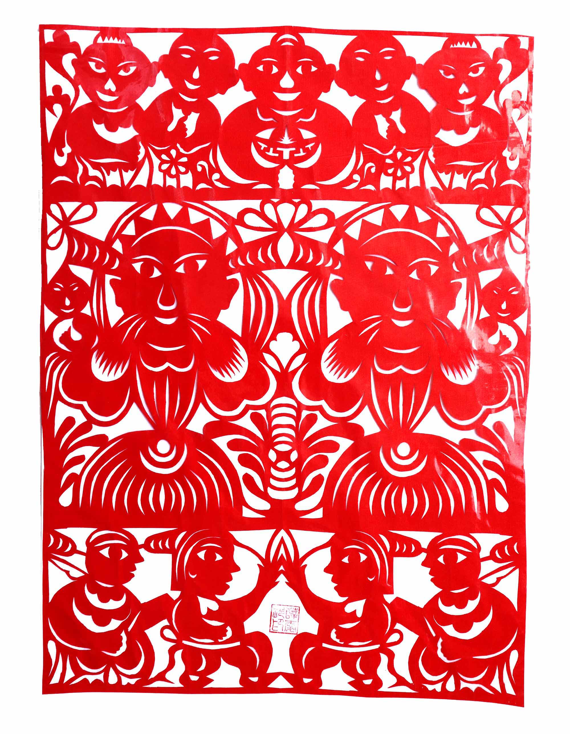 薛爱玲,女,1966年4月22日生,汉族,小学三年级文化程度,农民。祖父当时是巧手,会剪花、纸扎工艺、二胡,爱唱秦腔,父亲也继承了爷爷的基因。母亲擅于剪花、扎花、刺绣,常给她讲一些刺绣纹样中的寓意,龙凤呈祥是传宗接代,望子成龙,望女成凤。喜鹊闹梅是喜上眉梢,用于婚俗是男女相合,生儿育女。丈夫爱剪纸,曾上过富县剪纸培训班,很支持妻子剪花,凡是外出培训和一些剪纸活动都想法让她参加,创作时给她出主意,想题材。