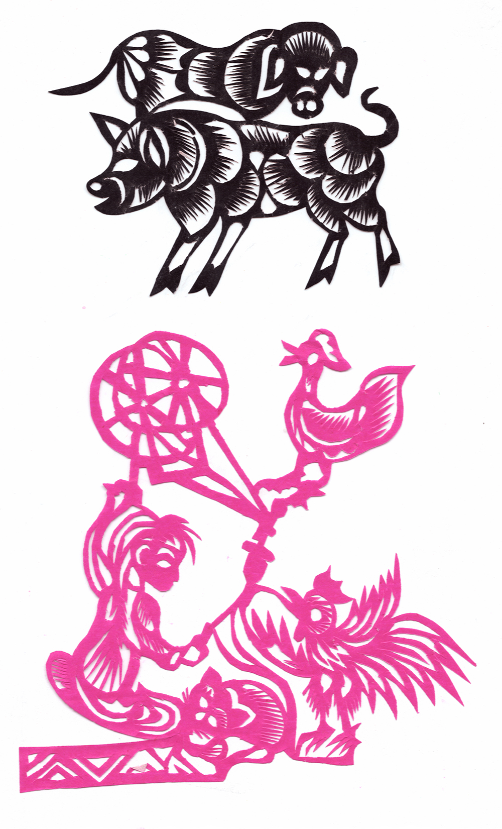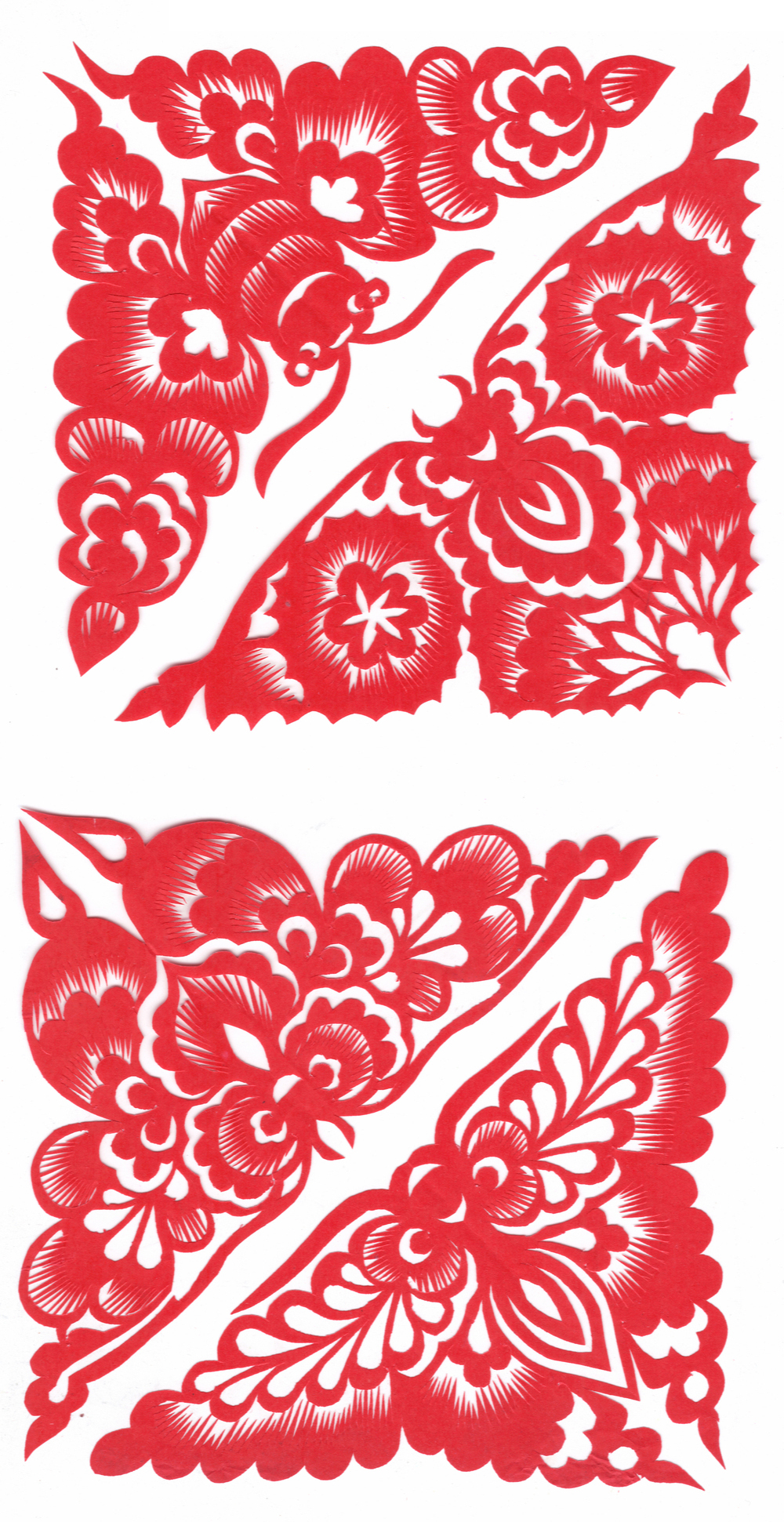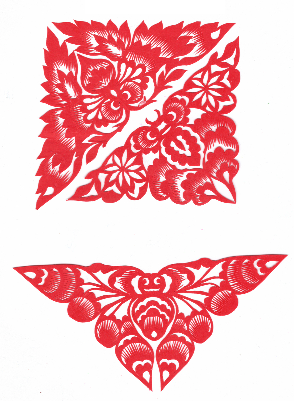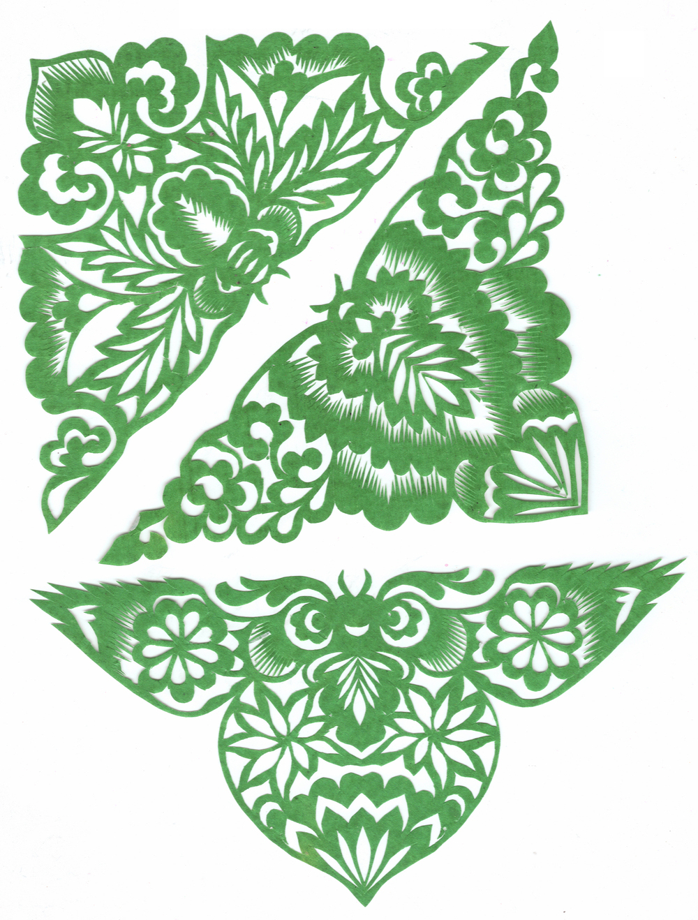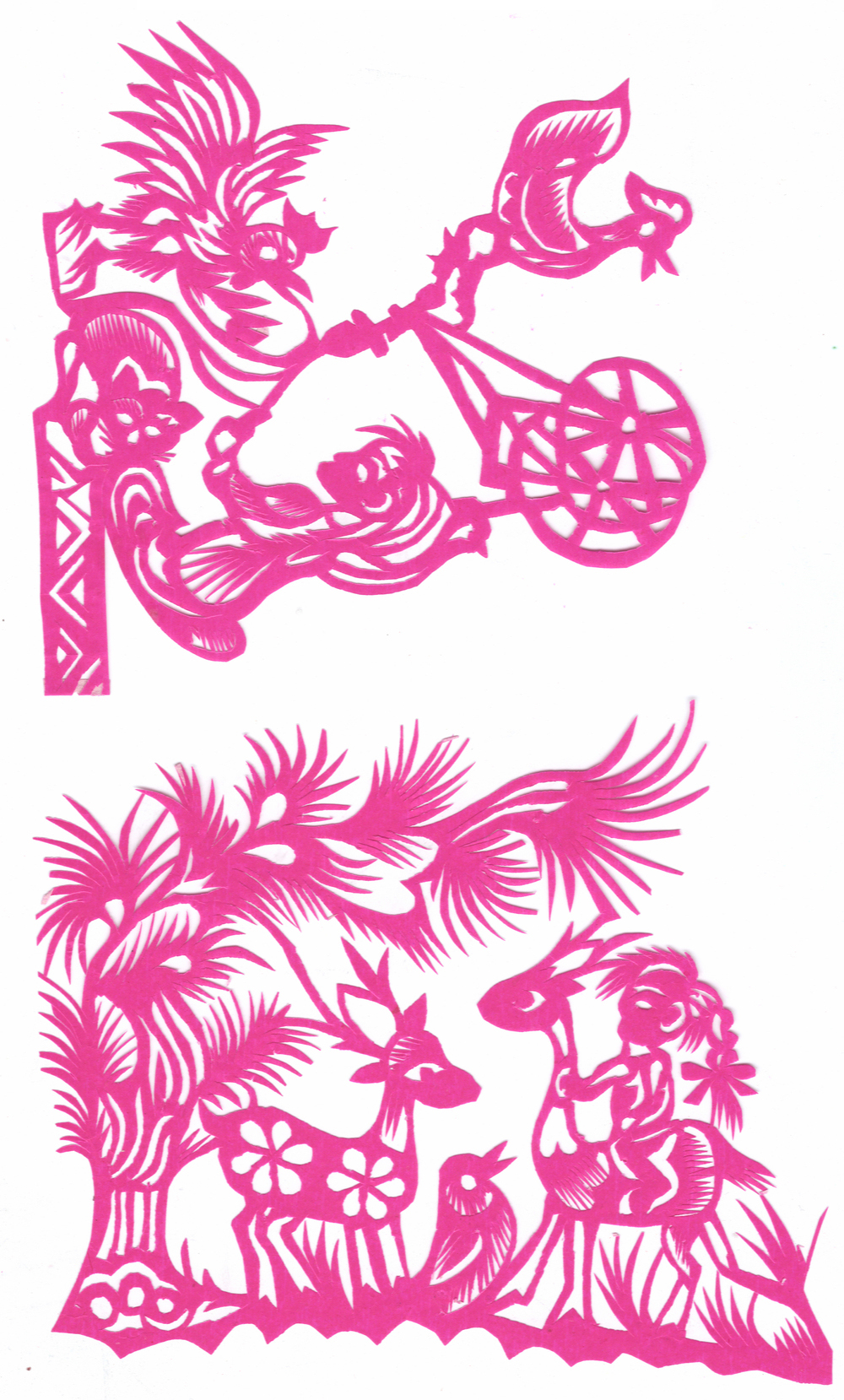 李淑珍姊妹5人,她排老二,上有一姐,下有两弟一妹。她11岁上小学,一直上到高中毕业。母亲是她剪纸上的启蒙老师,母亲剪剪纸,她便跟上剪,母亲捏面花,她便跟上捏。母亲从来没有给她讲过要如何剪,她只是在一边看母亲如何下剪,如何造型?当母亲剪好后,她便把母亲的剪纸花样默记在心里,等下次自己剪时便可回忆剪出来。对于剪纸父母也不管,想剪就剪,但如果用买回来的好纸剪,母亲就不让。因那时家里特别穷,买几张红纸很不容易,母亲怕她把纸浪费了。小时候一直用废书纸学剪花,因为用的是废纸,不怕剪坏,剪的时候就特别的大胆,看见个啥剪个啥,看鸟活跃的很,好看的很,就想把鸟剪出来。在学校给同学、老师都剪过剪纸,毕业时给老师送了两幅碗架对子,一组碗架板子。在学校办学习专栏,她便用剪纸装饰花边,用剪纸装饰报头,剪时老师一直坐在她的旁边,紧张得手都出汗了。化学老师曾给了她好多纸,让她剪花用,过年时她也把剪好的窗花送给化学老师。由于剪花水平高,常受到老师的表扬。15岁之后,家里过年用的窗花母亲便很少剪了,把剪窗花贴窗花的事情交给她来做。除给家里剪窗花外,李淑珍还给外祖母家剪给村里人剪。除会剪纸外,李淑珍跟母亲及村里的老人学会了捏面花、扎花、做针线活等女红活手艺。