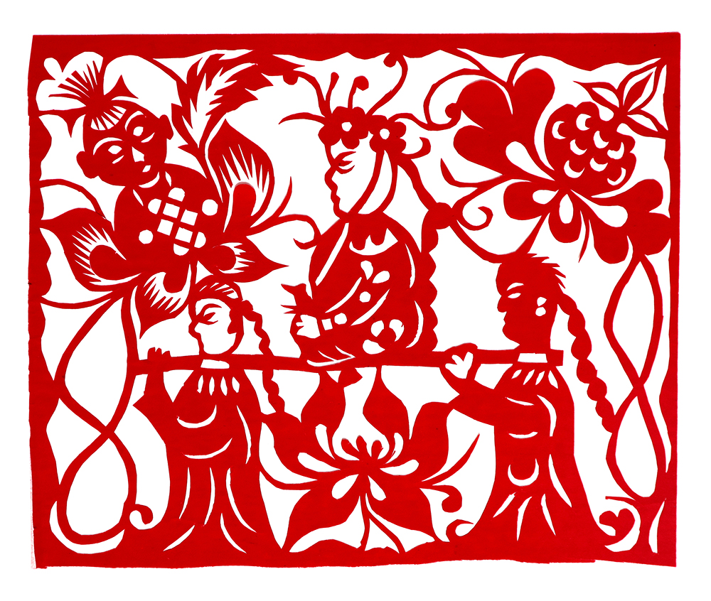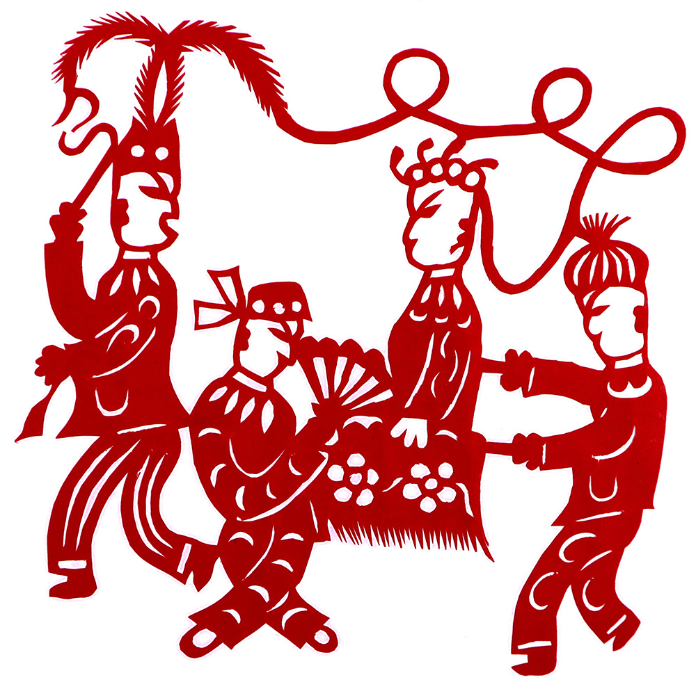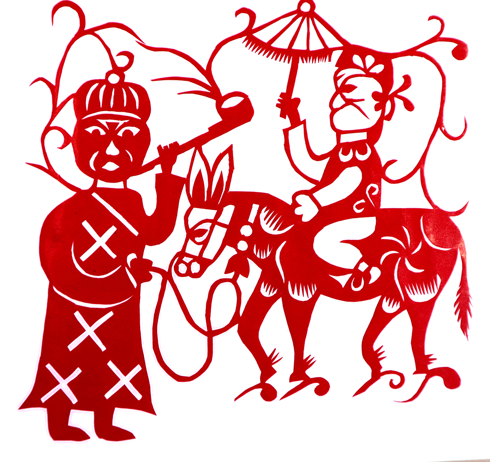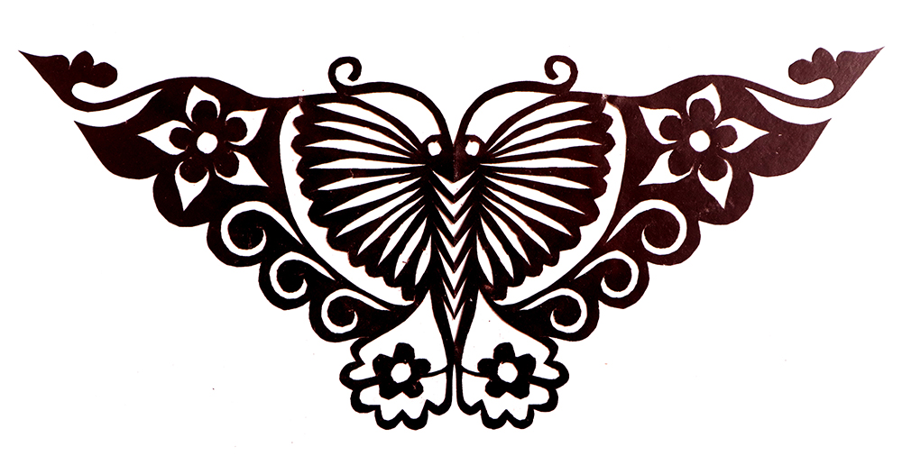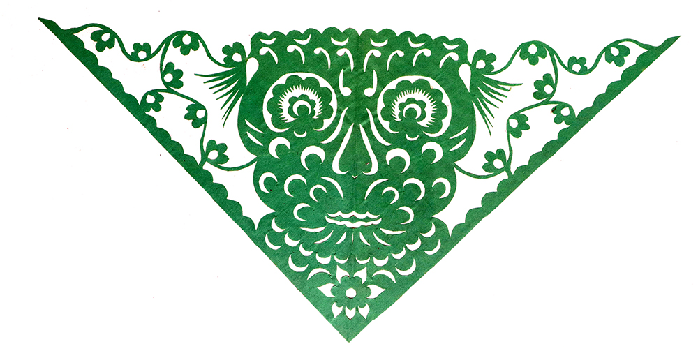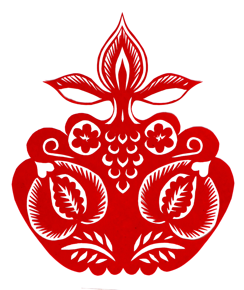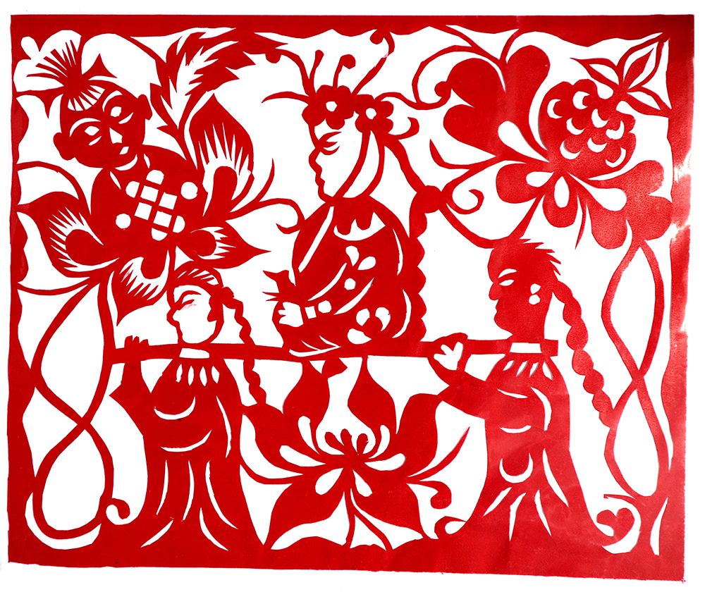 杨秀英姊妹5人,她排行老三,上有两个哥哥,下有一妹妹一弟弟。她7岁上学,一直上到高中,1976年毕业。祖母、外祖母、姑姑都是当地的巧人,她从小跟着看她们剪纸,耳濡目染,也就能剪能绣。5岁时刚刚学会拿剪刀,就试着把衣服上的花照着剪出来。学剪纸一入手就不要样子,拿起剪刀直剪。哥哥结婚时,她给剪了顶棚花、枕顶花,这一剪,全村人都知道她剪顶棚花好,后来村人有娃结婚,都会请她去给剪顶棚花,一直剪到她出嫁。上学期间,她给班上办黑板报,用剪纸装饰边框报头,有时为赶时间,一剪就剪到半夜两三点钟。除了剪花之外,她还会绣花、捏面花。