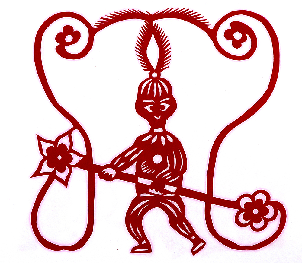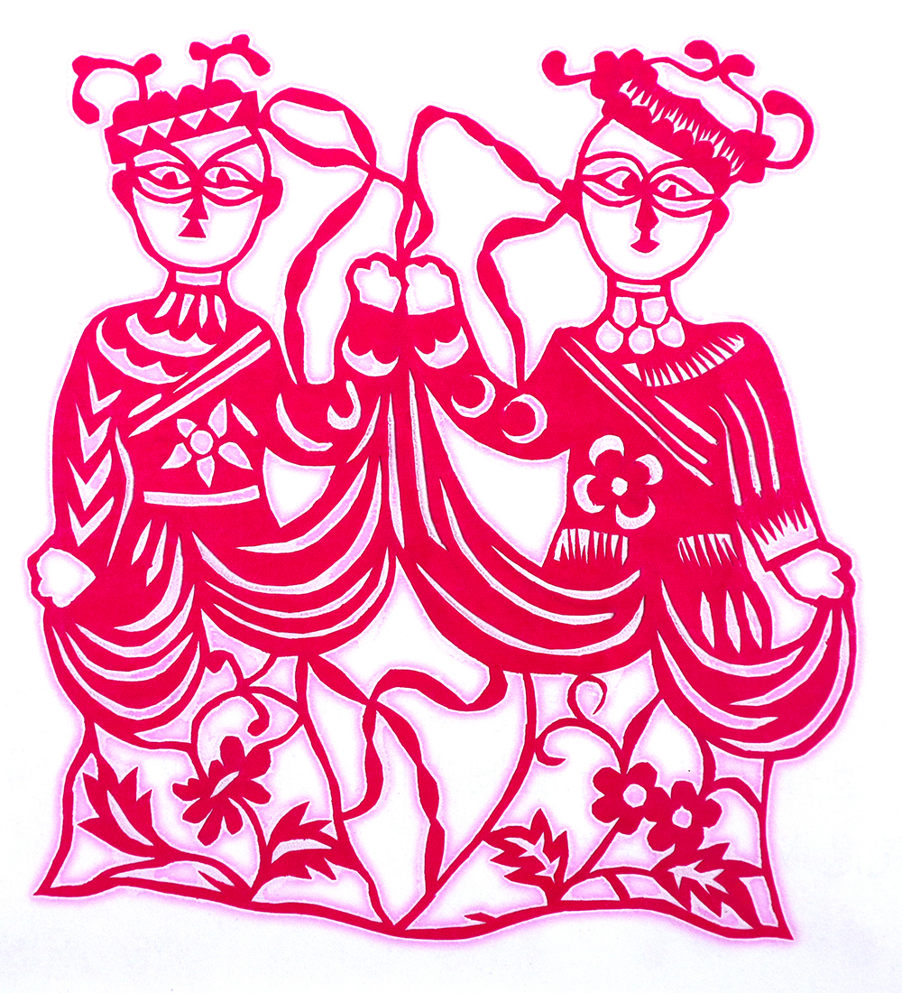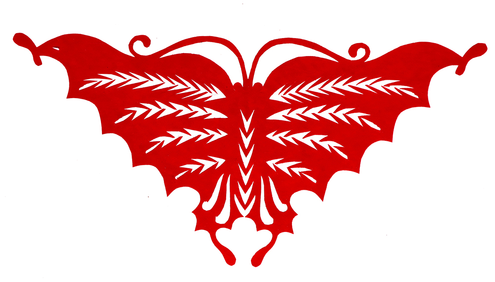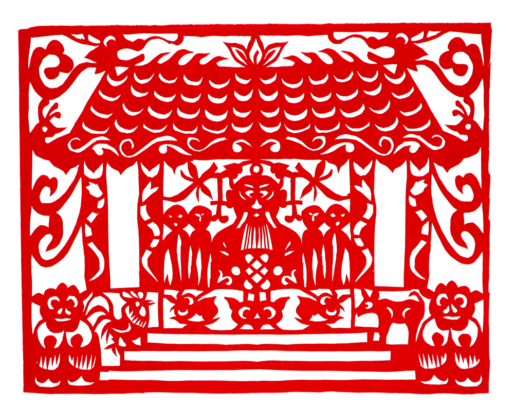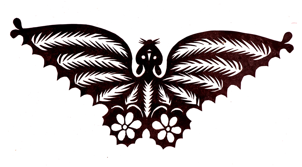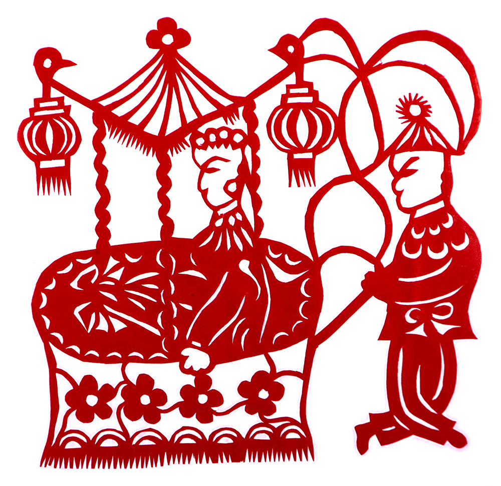 杨秀英姊妹5人,她排行老三,上有两个哥哥,下有一妹妹一弟弟。她7岁上学,一直上到高中,1976年毕业。祖母、外祖母、姑姑都是当地的巧人,她从小跟着看她们剪纸,耳濡目染,也就能剪能绣。5岁时刚刚学会拿剪刀,就试着把衣服上的花照着剪出来。学剪纸一入手就不要样子,拿起剪刀直剪。哥哥结婚时,她给剪了顶棚花、枕顶花,这一剪,全村人都知道她剪顶棚花好,后来村人有娃结婚,都会请她去给剪顶棚花,一直剪到她出嫁。上学期间,她给班上办黑板报,用剪纸装饰边框报头,有时为赶时间,一剪就剪到半夜两三点钟。除了剪花之外,她还会绣花、捏面花。