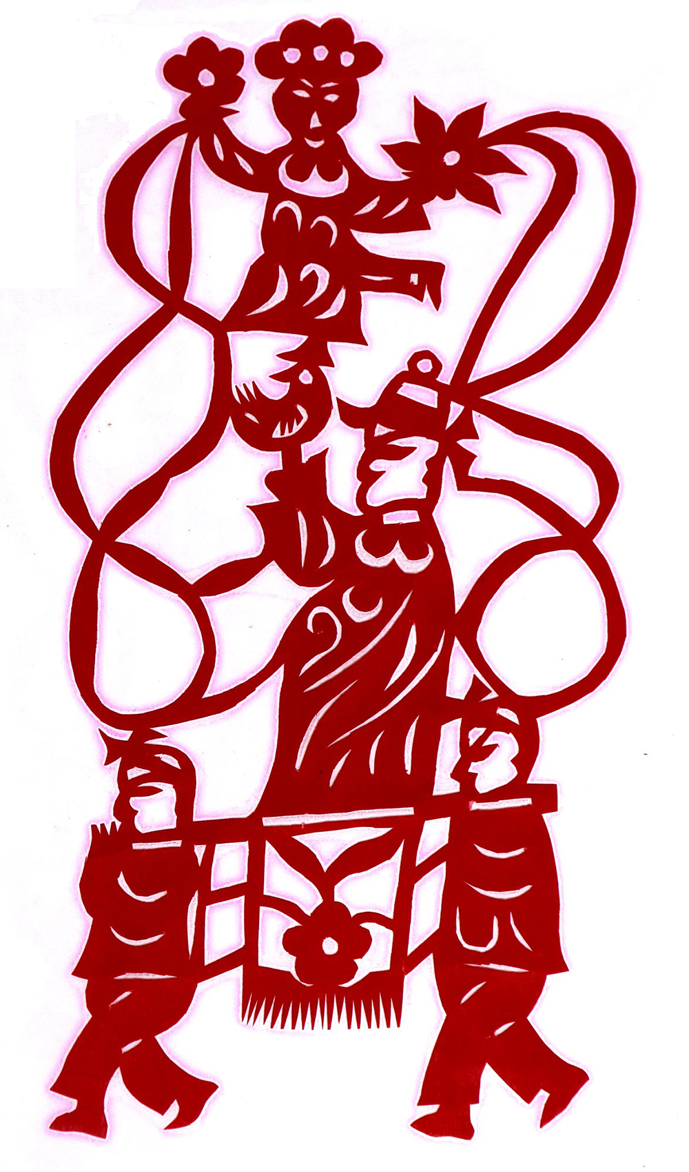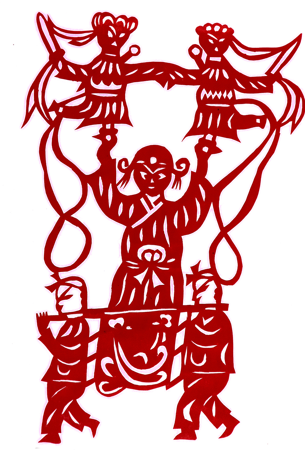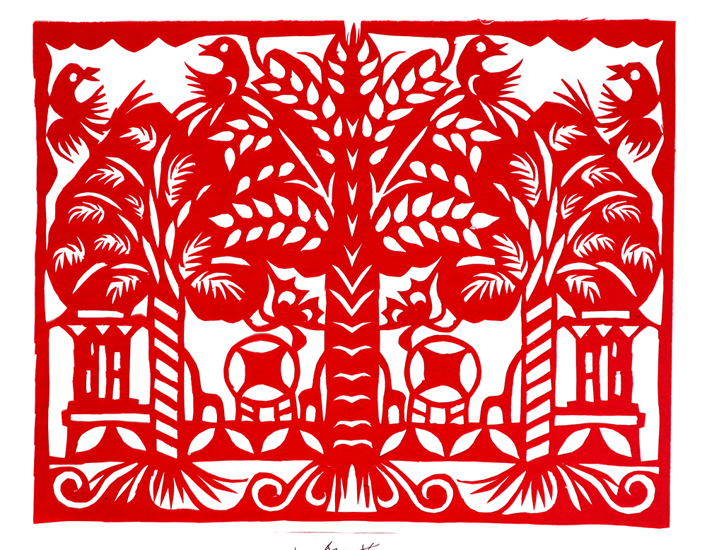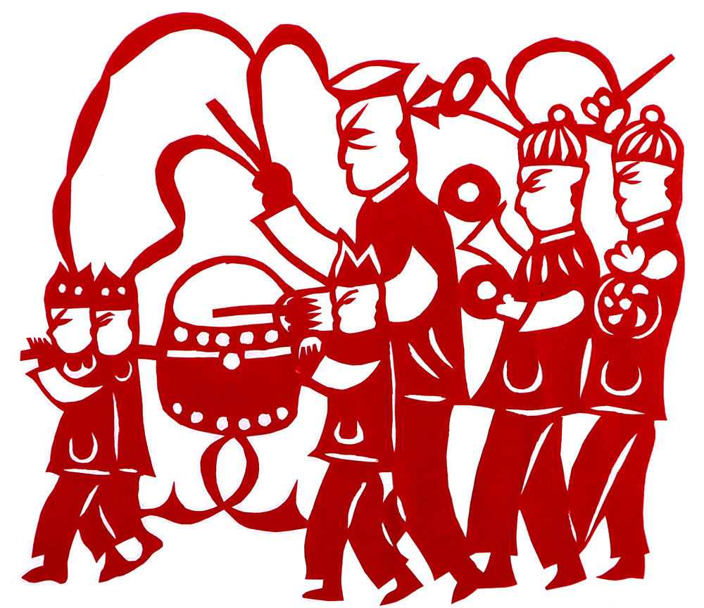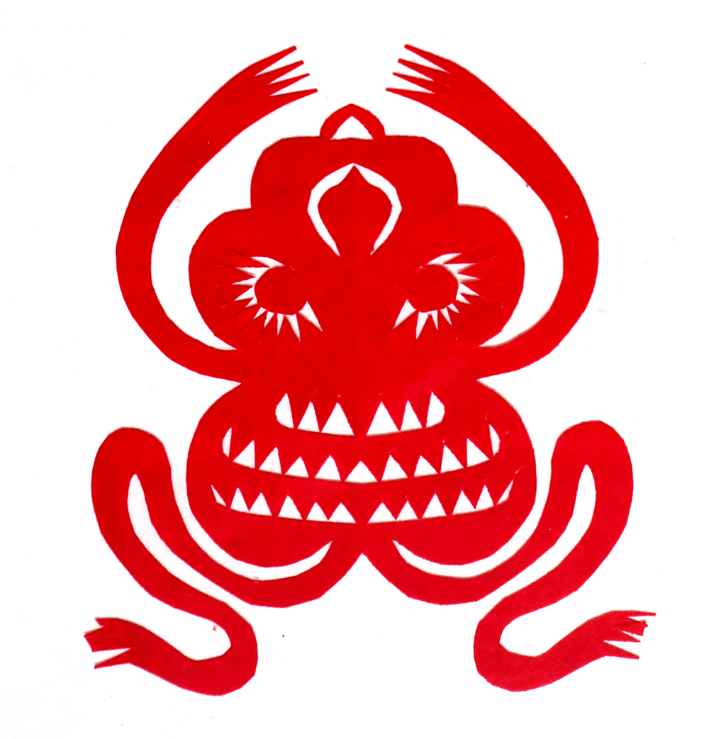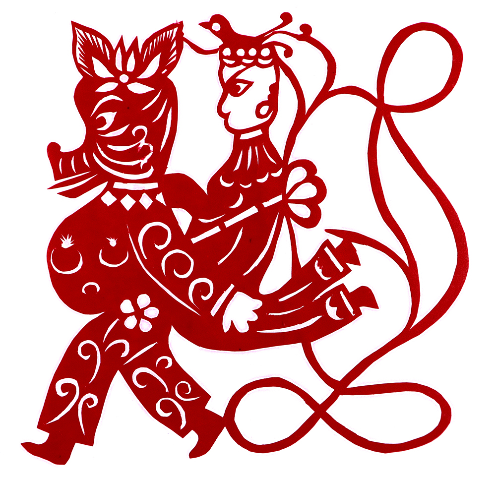 杨秀英姊妹5人,她排行老三,上有两个哥哥,下有一妹妹一弟弟。她7岁上学,一直上到高中,1976年毕业。祖母、外祖母、姑姑都是当地的巧人,她从小跟着看她们剪纸,耳濡目染,也就能剪能绣。5岁时刚刚学会拿剪刀,就试着把衣服上的花照着剪出来。学剪纸一入手就不要样子,拿起剪刀直剪。哥哥结婚时,她给剪了顶棚花、枕顶花,这一剪,全村人都知道她剪顶棚花好,后来村人有娃结婚,都会请她去给剪顶棚花,一直剪到她出嫁。上学期间,她给班上办黑板报,用剪纸装饰边框报头,有时为赶时间,一剪就剪到半夜两三点钟。除了剪花之外,她还会绣花、捏面花。