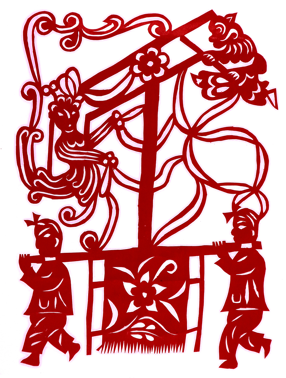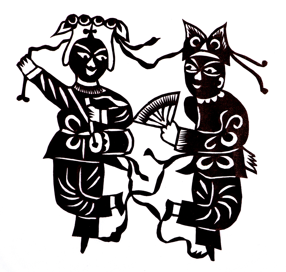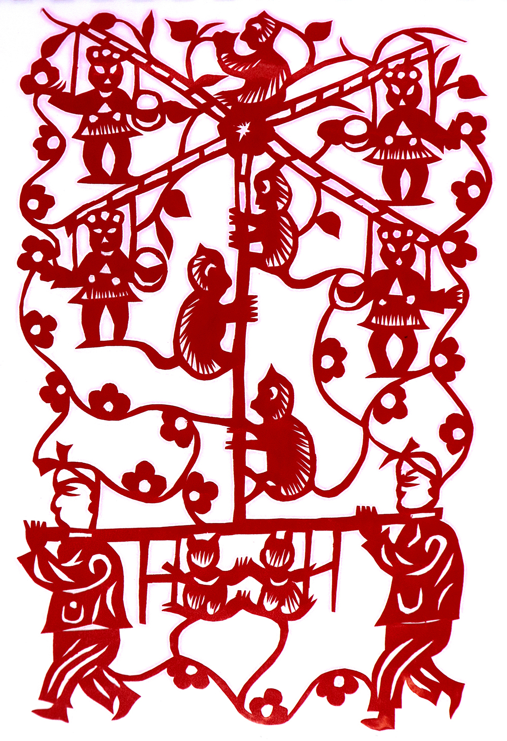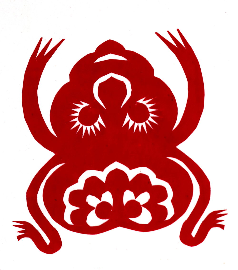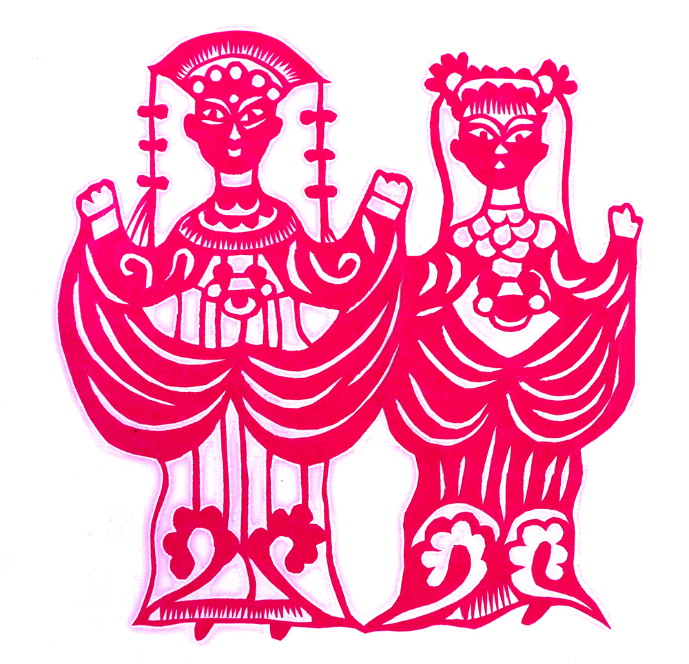 杨秀英姊妹5人,她排行老三,上有两个哥哥,下有一妹妹一弟弟。她7岁上学,一直上到高中,1976年毕业。祖母、外祖母、姑姑都是当地的巧人,她从小跟着看她们剪纸,耳濡目染,也就能剪能绣。5岁时刚刚学会拿剪刀,就试着把衣服上的花照着剪出来。学剪纸一入手就不要样子,拿起剪刀直剪。哥哥结婚时,她给剪了顶棚花、枕顶花,这一剪,全村人都知道她剪顶棚花好,后来村人有娃结婚,都会请她去给剪顶棚花,一直剪到她出嫁。上学期间,她给班上办黑板报,用剪纸装饰边框报头,有时为赶时间,一剪就剪到半夜两三点钟。除了剪花之外,她还会绣花、捏面花。