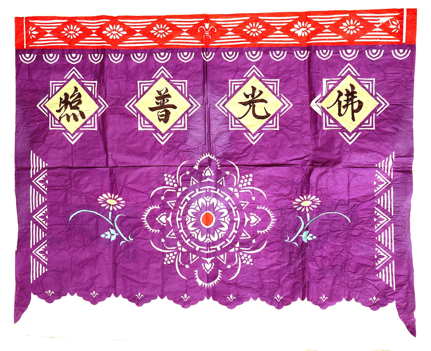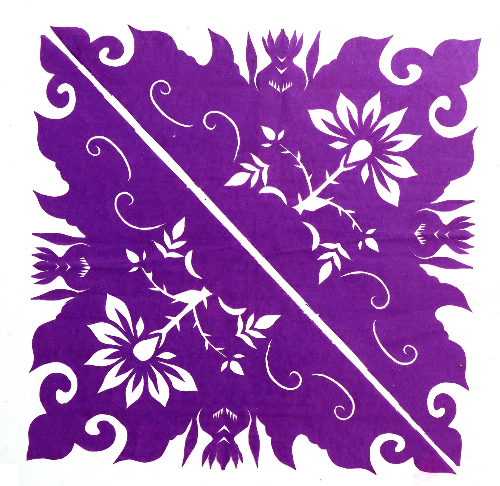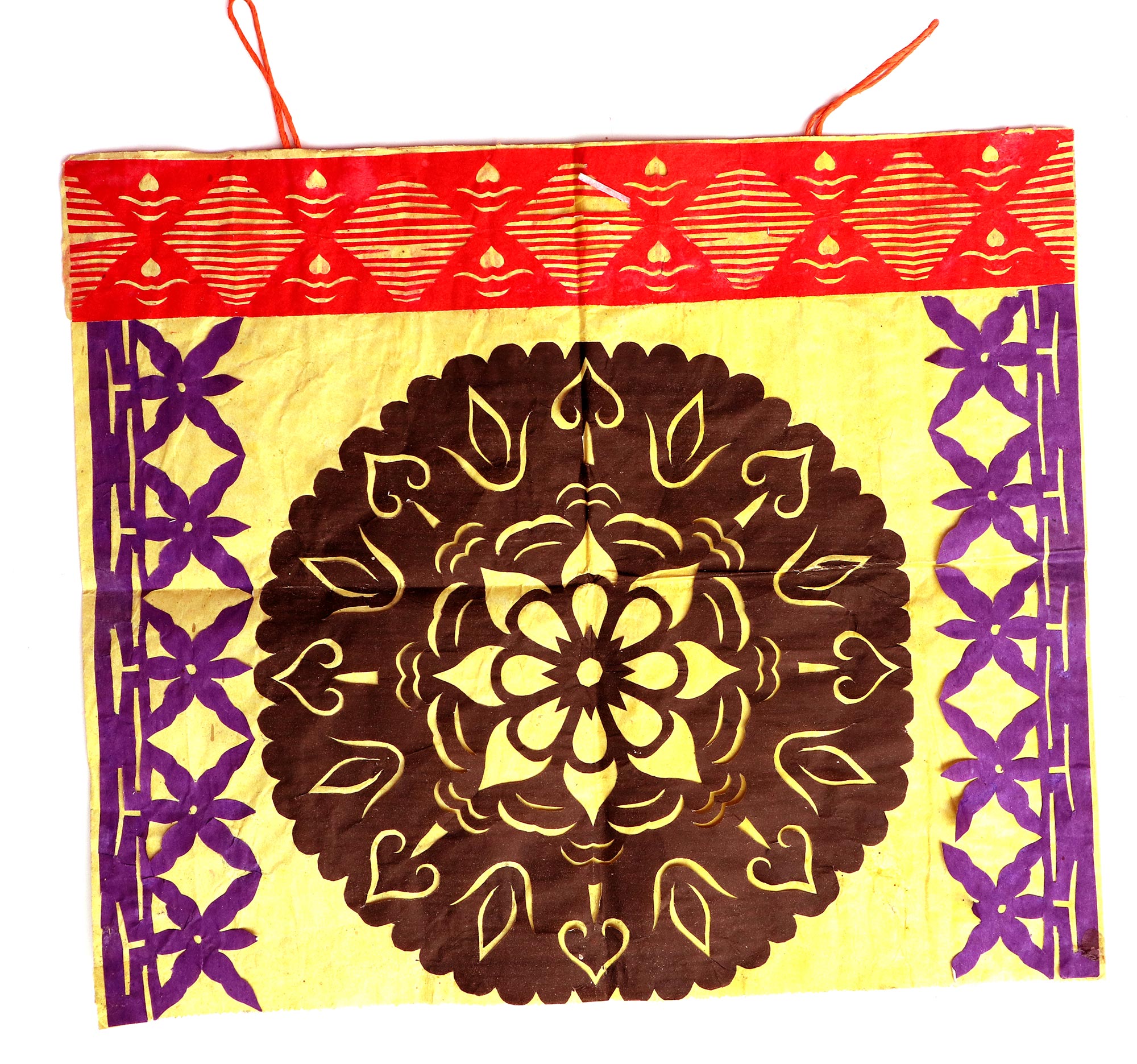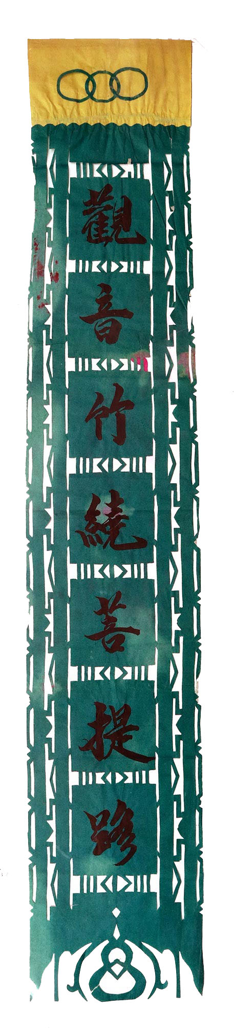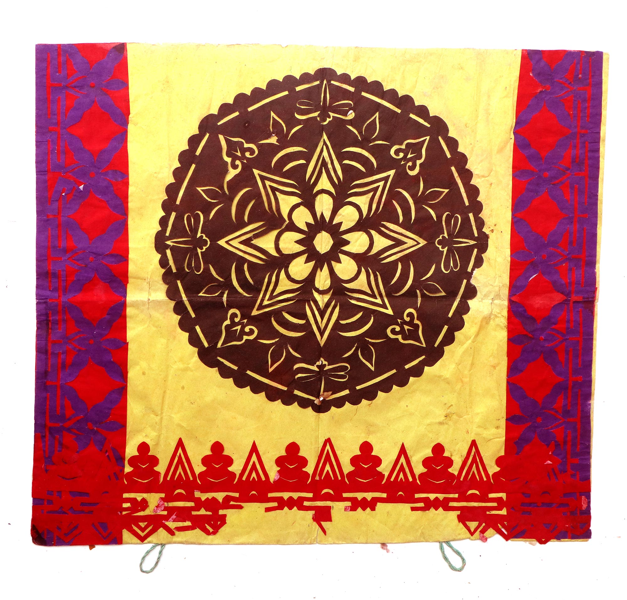 郭巧花说,她平常就爱看别人剪花、绣花,爱看人家门帘上的花,被单上的花,书上印的花,看上一眼就记下了。她在20出头时,村上结婚嫁女的人家都请她去剪喜花,缝被褥。60岁时开始学剪庙上用的剪纸,这一剪便放不下了,又是到处请着给剪。剪佛前吊子要用紫色,紫色是道教中的正色,有紫气东来的寓意。神堂和经堂用的幡一样,都是五色代表五方。道教门符一堂五幅,用黑白红黄青五色剪出,佛教门符一堂五幅都用黄色剪出。神幡是挂在主神两边的幡,上面还要写上对联。神幡要用线拴,这一拴就把运气翻过来了。五色旗插在院中的五谷斗中,神仙看到彩旗才会下凡参加庙会活动,庙会剪纸较多的传承着传统民俗文化的文化内涵。