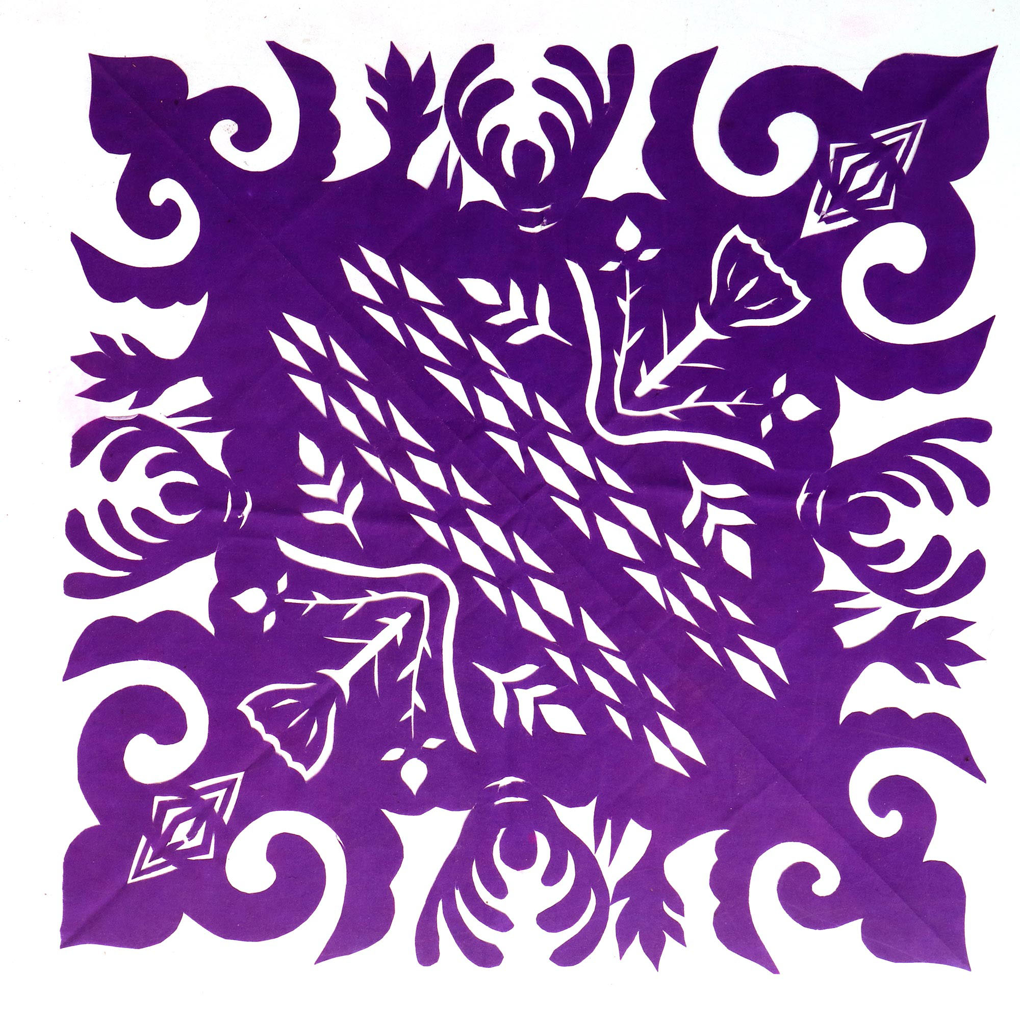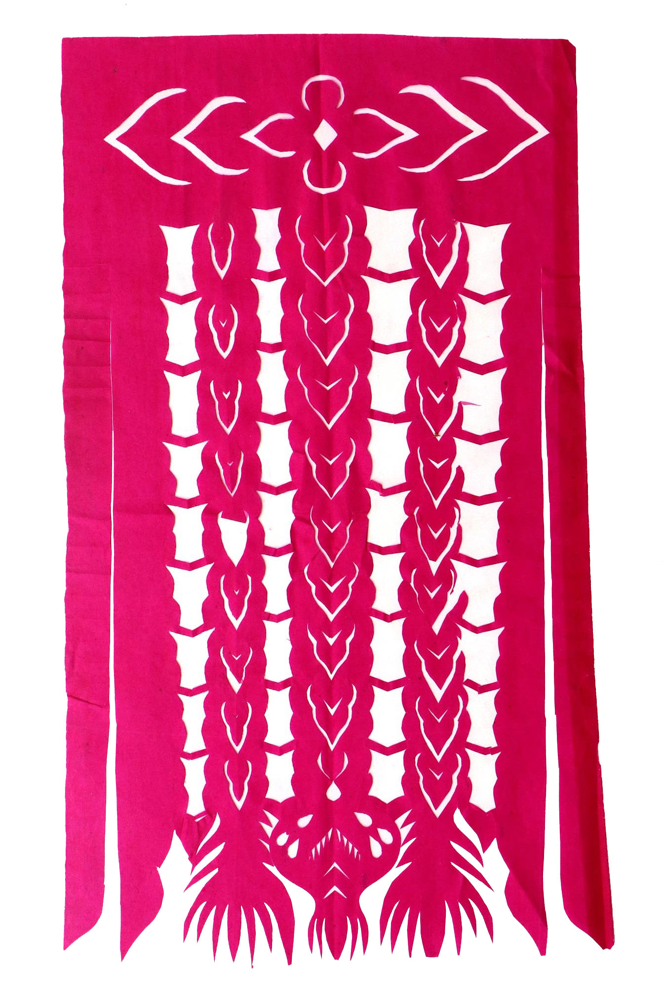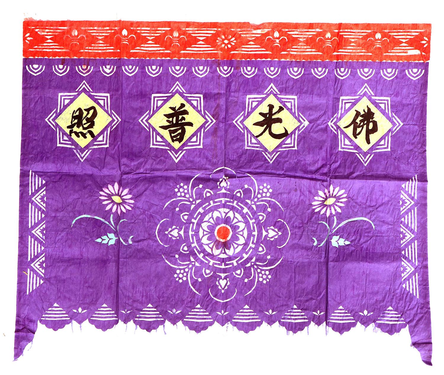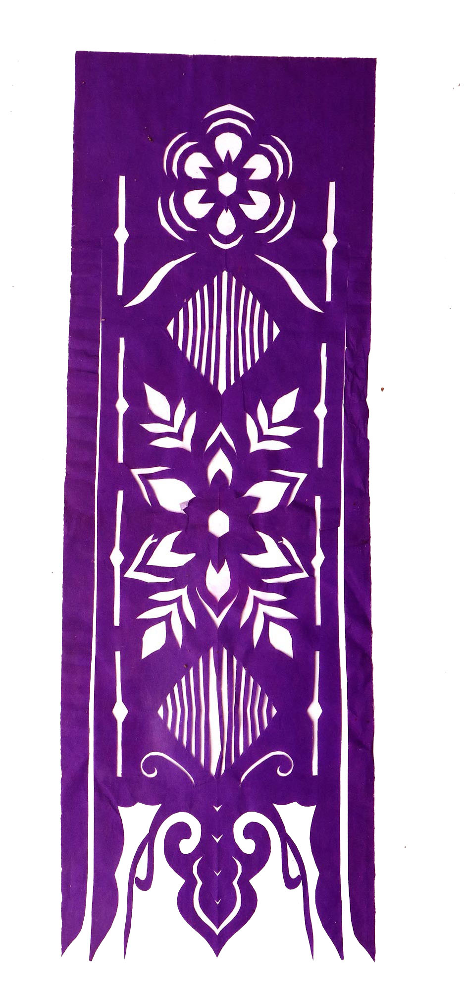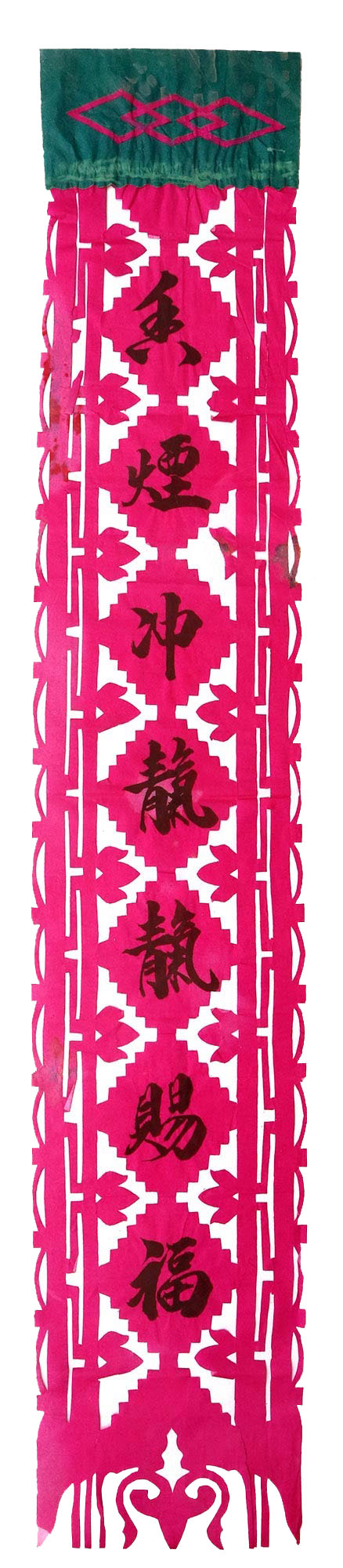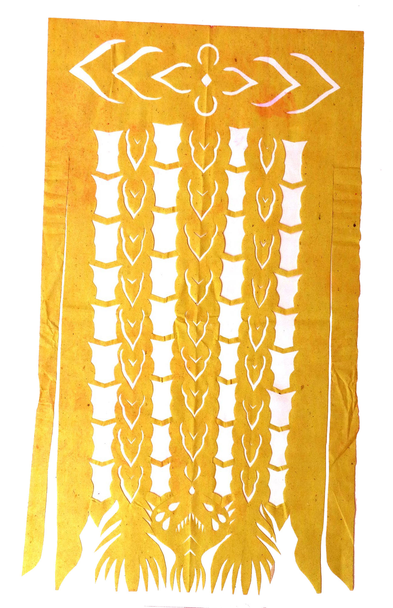郭巧花说,她平常就爱看别人剪花、绣花,爱看人家门帘上的花,被单上的花,书上印的花,看上一眼就记下了。她在20出头时,村上结婚嫁女的人家都请她去剪喜花,缝被褥。60岁时开始学剪庙上用的剪纸,这一剪便放不下了,又是到处请着给剪。剪佛前吊子要用紫色,紫色是道教中的正色,有紫气东来的寓意。神堂和经堂用的幡一样,都是五色代表五方。道教门符一堂五幅,用黑白红黄青五色剪出,佛教门符一堂五幅都用黄色剪出。神幡是挂在主神两边的幡,上面还要写上对联。神幡要用线拴,这一拴就把运气翻过来了。五色旗插在院中的五谷斗中,神仙看到彩旗才会下凡参加庙会活动,庙会剪纸较多的传承着传统民俗文化的文化内涵。