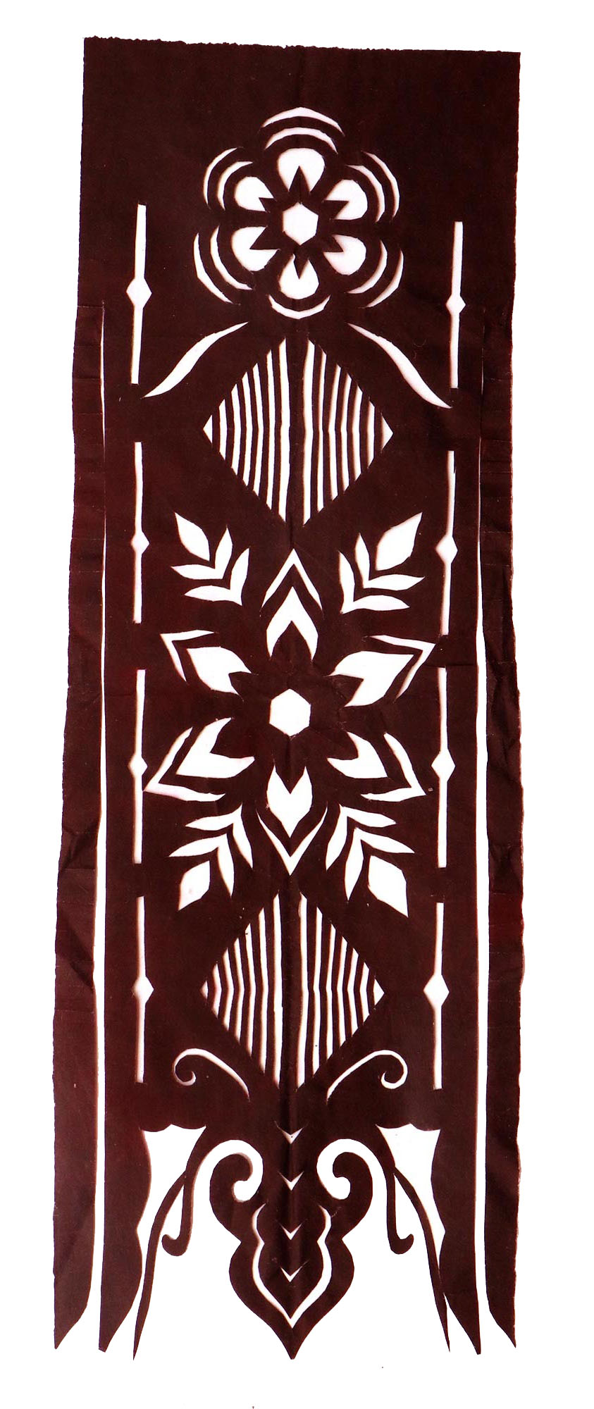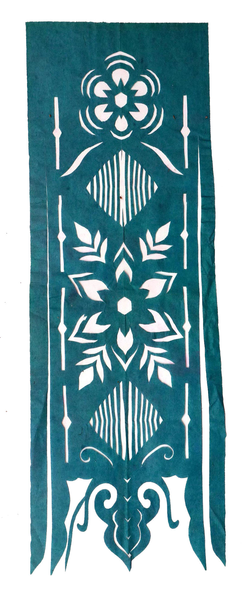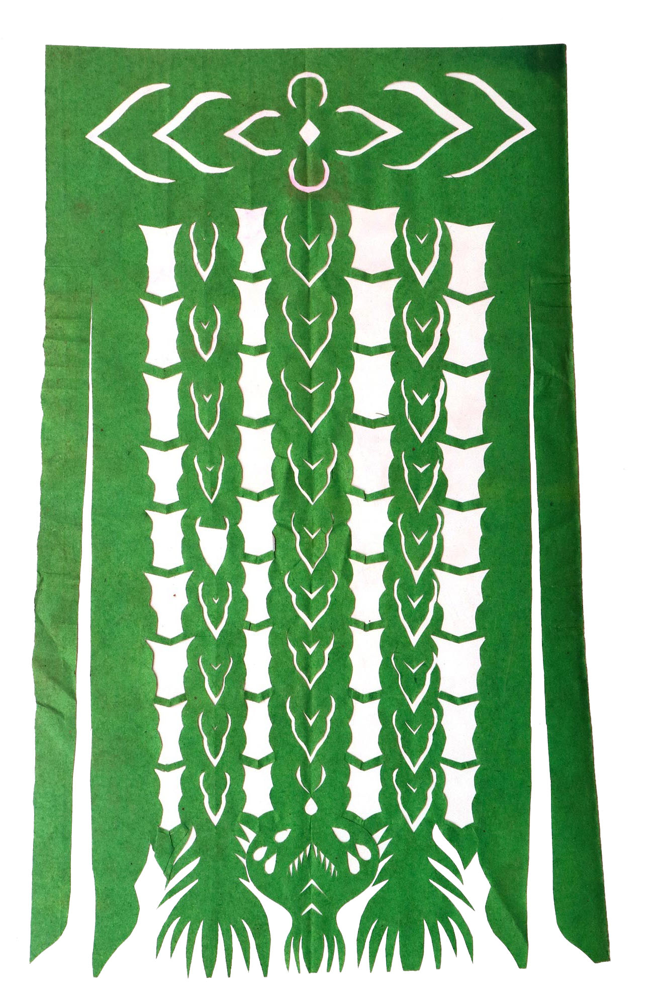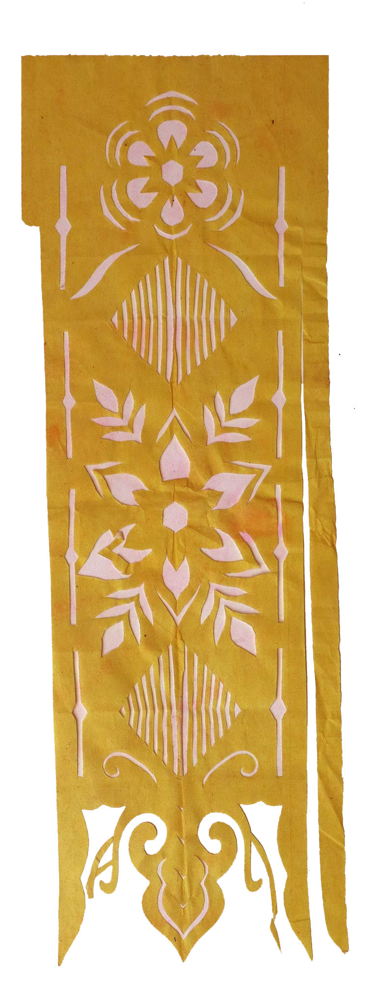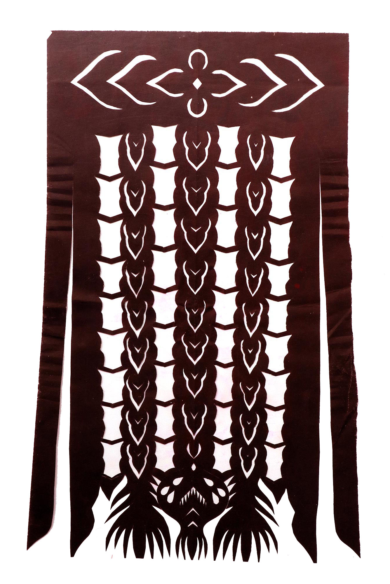 郭巧花说,她平常就爱看别人剪花、绣花,爱看人家门帘上的花,被单上的花,书上印的花,看上一眼就记下了。她在20出头时,村上结婚嫁女的人家都请她去剪喜花,缝被褥。60岁时开始学剪庙上用的剪纸,这一剪便放不下了,又是到处请着给剪。剪佛前吊子要用紫色,紫色是道教中的正色,有紫气东来的寓意。神堂和经堂用的幡一样,都是五色代表五方。道教门符一堂五幅,用黑白红黄青五色剪出,佛教门符一堂五幅都用黄色剪出。神幡是挂在主神两边的幡,上面还要写上对联。神幡要用线拴,这一拴就把运气翻过来了。五色旗插在院中的五谷斗中,神仙看到彩旗才会下凡参加庙会活动,庙会剪纸较多的传承着传统民俗文化的文化内涵。