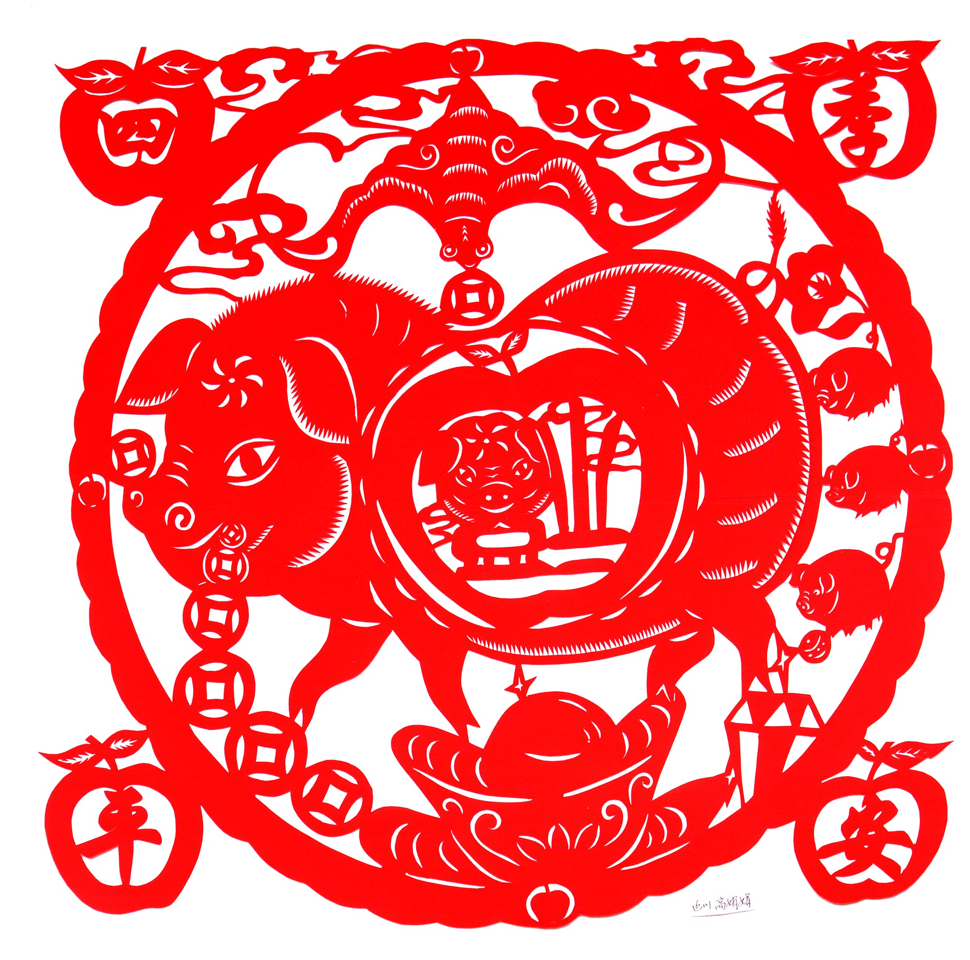 高娟娟,女,1980年9月9日生,汉族,高娟娟姊妹两人,她是老大,下有一个弟弟。她7岁上学,初中毕业后,考入西安美术学院附中,附中毕业考入陕西师范大学美术系,2005年调入延川县城关小学。2013年又到陕西师范大学美术教育系进修本科。除剪纸外,平常为教学画一些素描、色彩,也画一些国画,自己的创作主要是剪纸。由于她一开始学美术就是民间美术这种造型观念,对她影响较深,后来学了现代美术教育,对她的剪纸有很大的帮助。