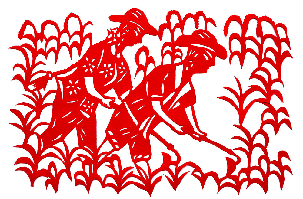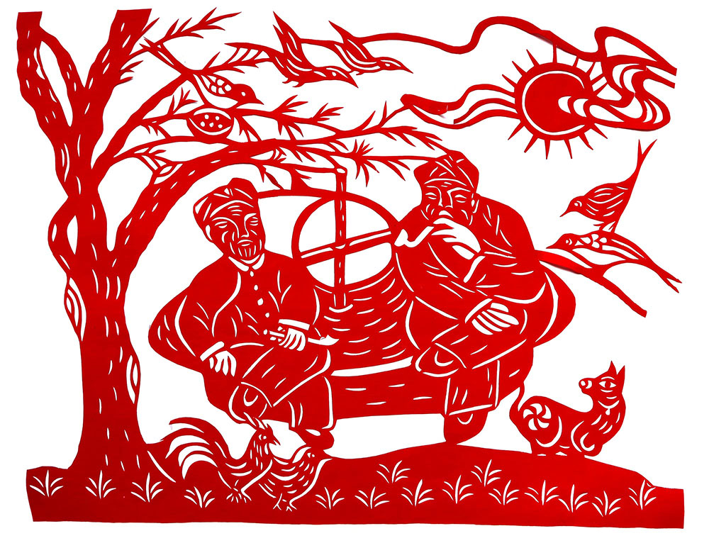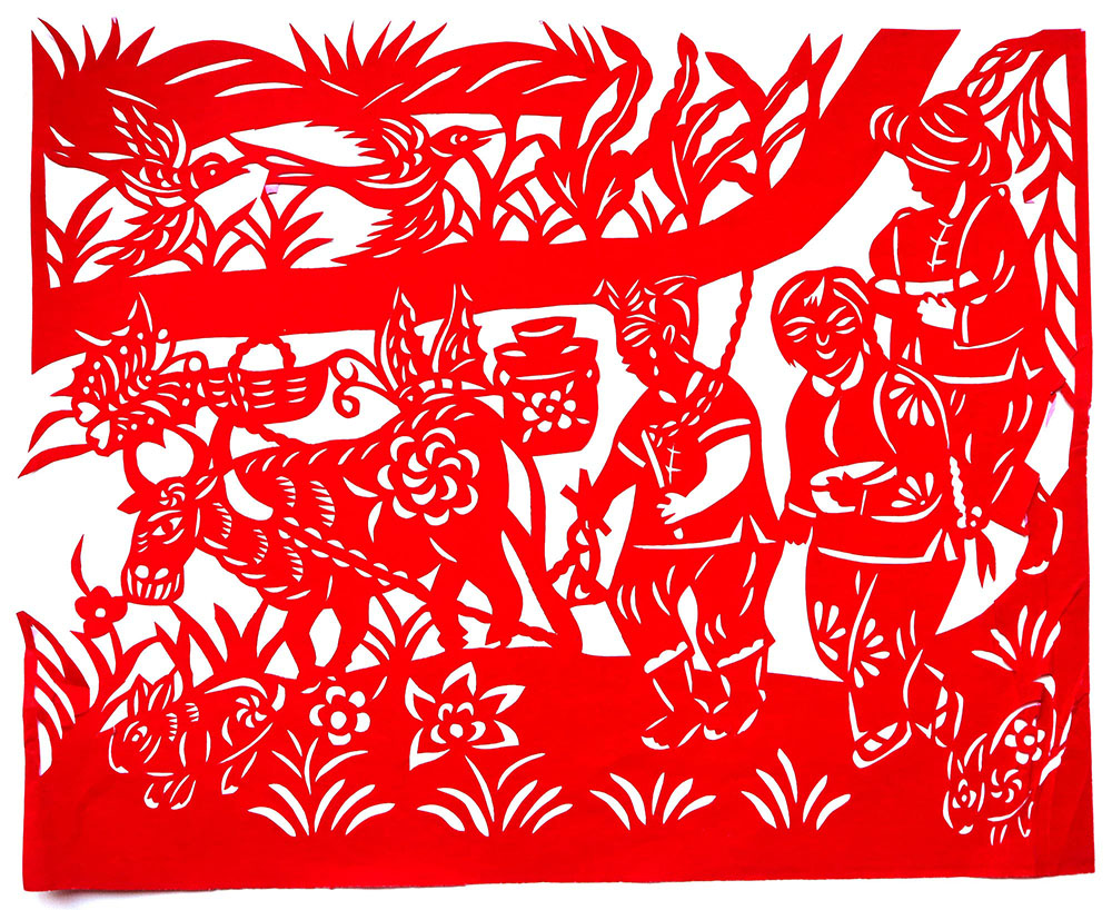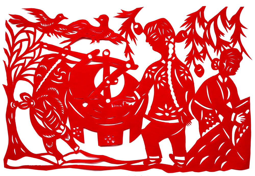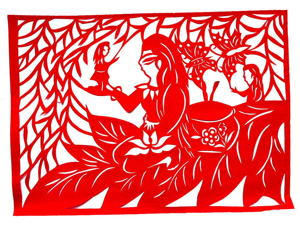 1993年,焦岗岗结婚,那年22岁。婚后生育有两个孩子,一儿一女。孩子小的时候,整日照顾孩子,剪的不多,到孩子上学后有了空闲时间,正好剪纸巧手高河晓在延川培训剪纸,她参加了学习。从这以后就开始了有目的的剪纸创作。