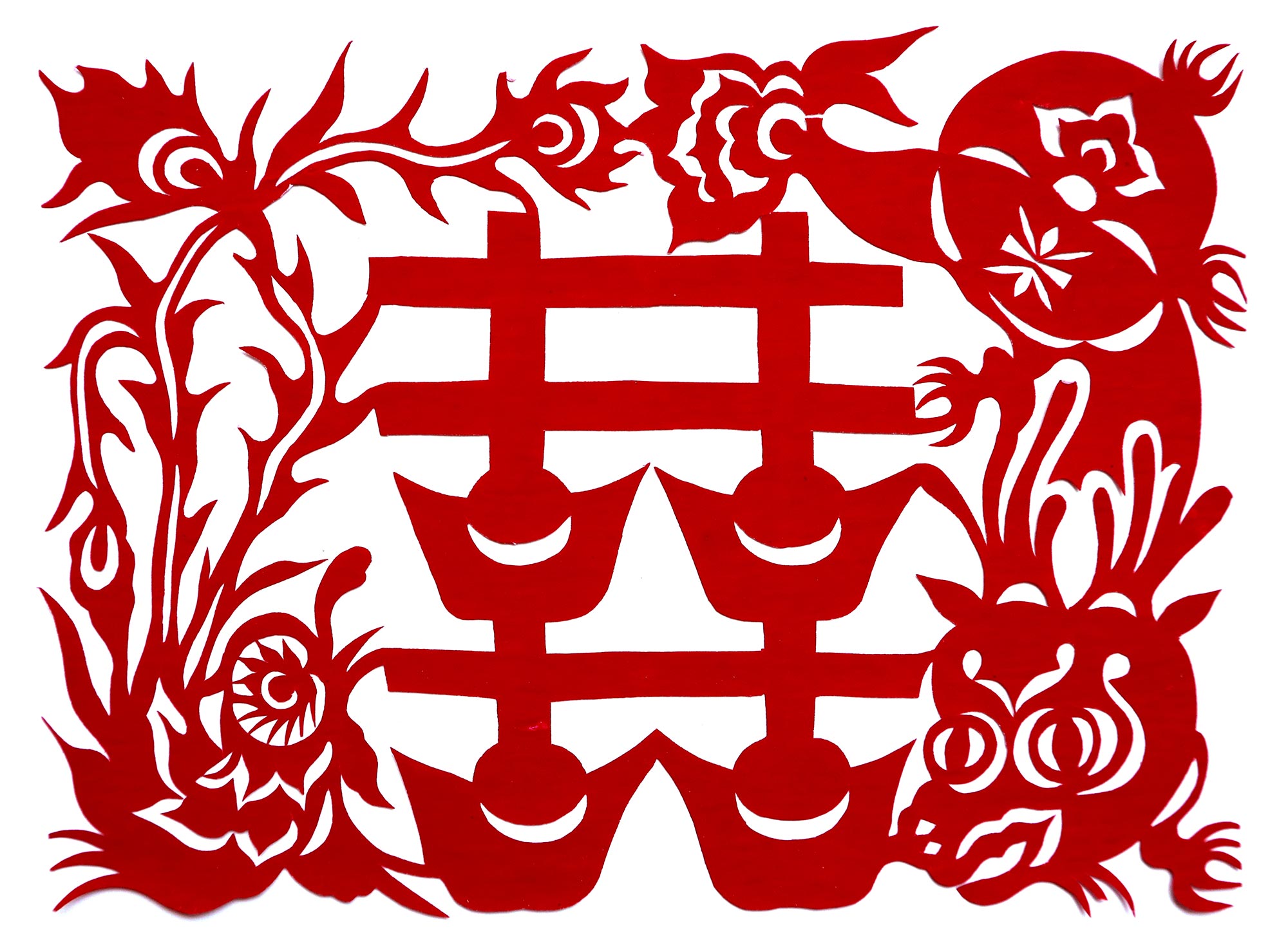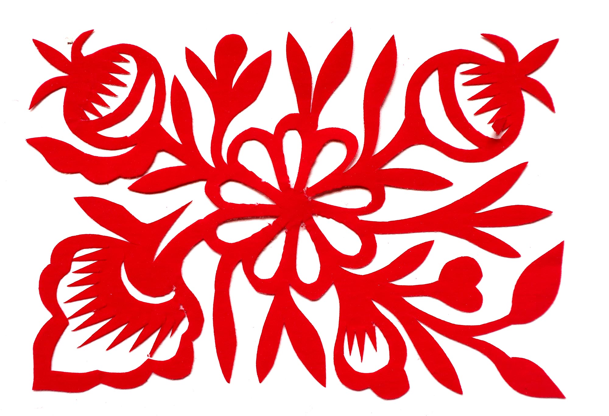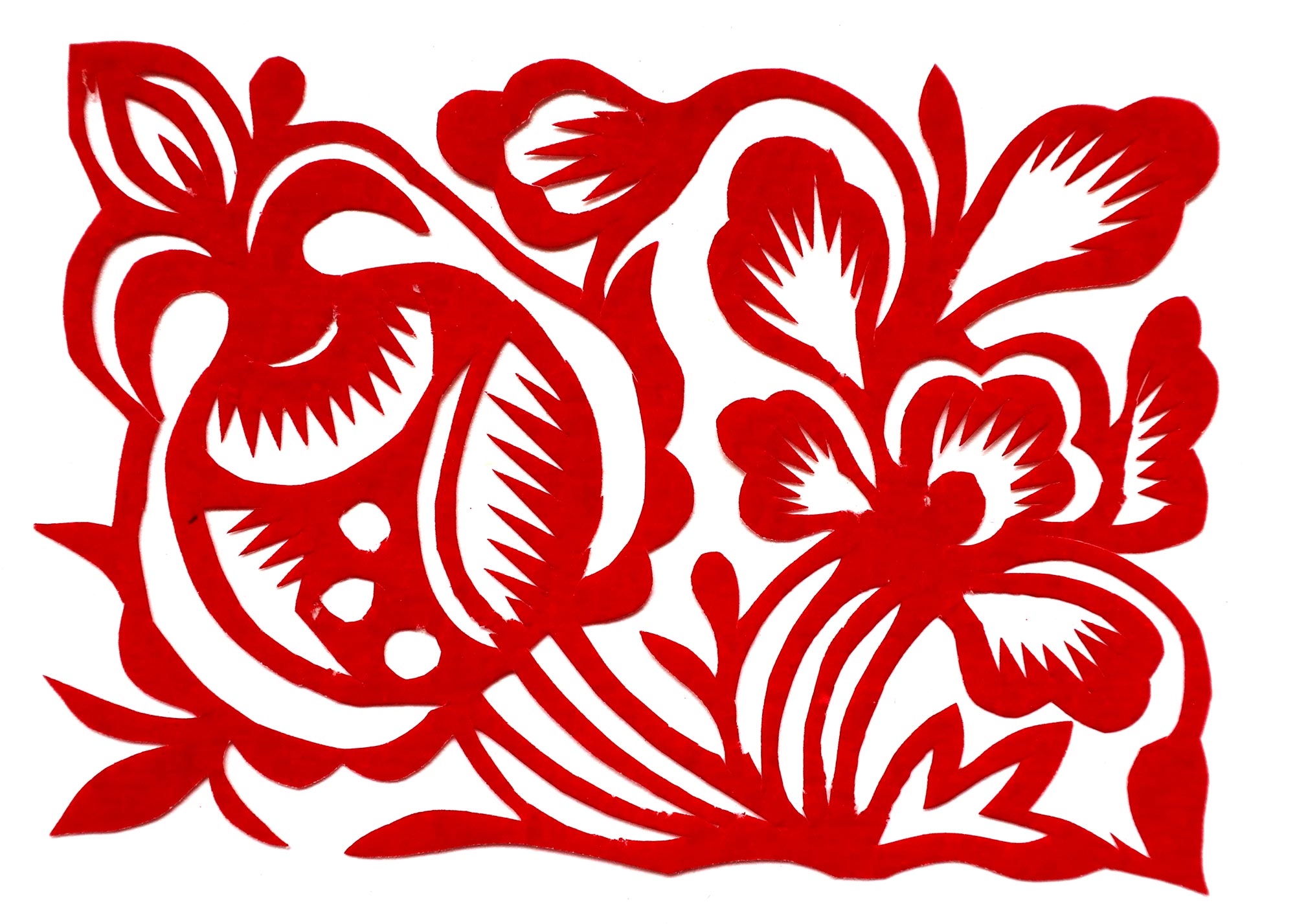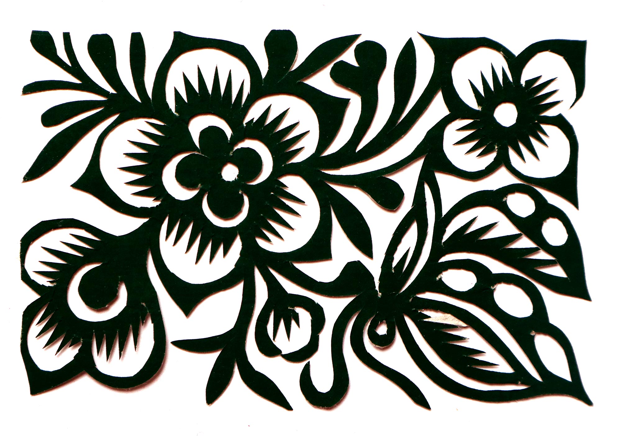 她从小受祖母的影响最大,常常跟上祖母学剪牡丹花、石榴等,学纳高粱盖盖。小时喜欢画画,上学时就爱上美术课,把美术课本上的范画一幅幅临摹。在学校给班上画版报,在家里没事就爱画些刺绣用的传统花样,如石榴、牡丹、莲花等, 12岁时就能给村上的女孩子们画鞋垫花样。一开始学剪纸就是冒剪花草动物,没有照过样子,到后来一步步剪些复杂的花样。过年用的窗花都是她来剪她来贴,也剪过婚俗中的上头馍馍“鱼戏莲”“笙鸡牡丹”等喜花。除剪纸外,她还跟着祖母学会了绣花、捏面花、编织、缝纫等女红活。2005年,郭飞琴结婚,婚后生有两个孩子,一儿一女,孩子小时整日的工作就是照看孩子,孩子上学后时间相对比较充足,她就进行剪纸创作。