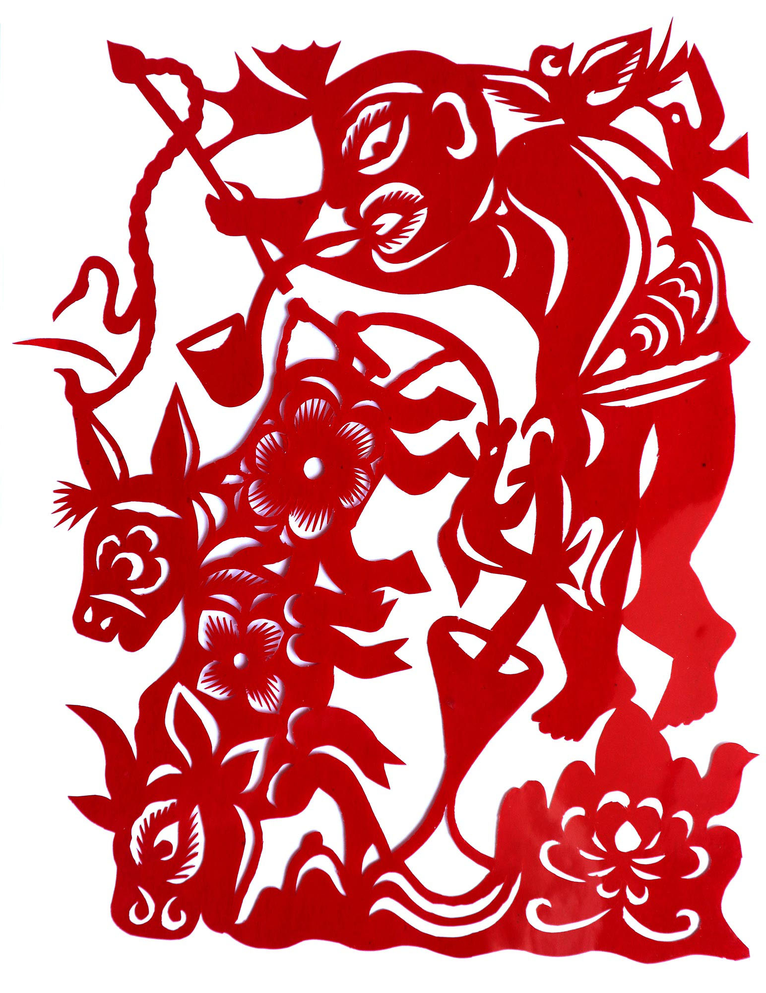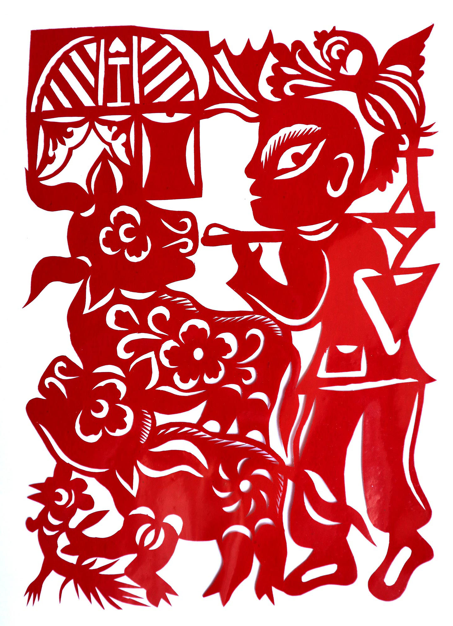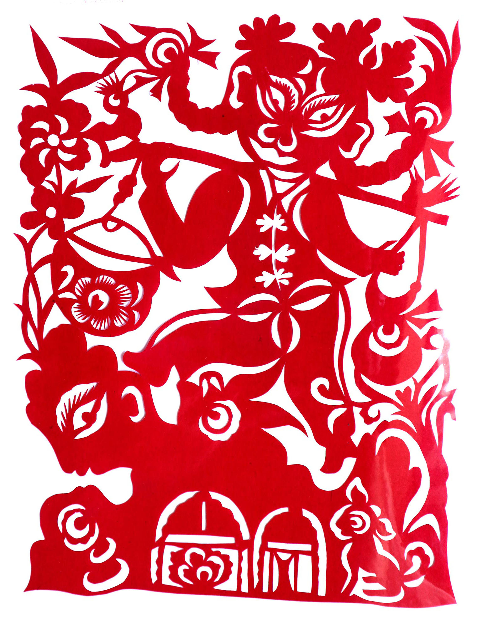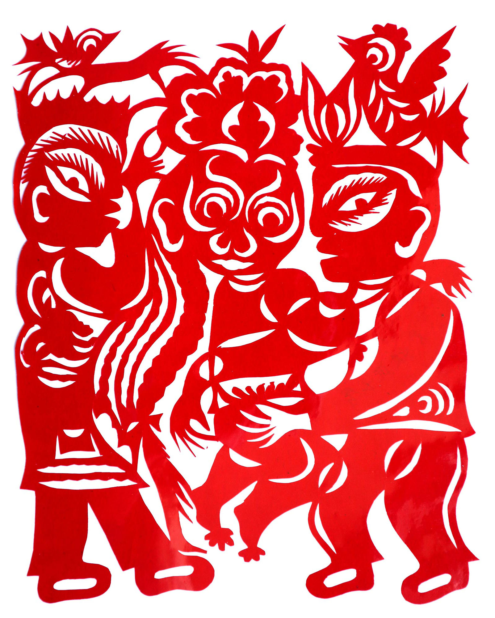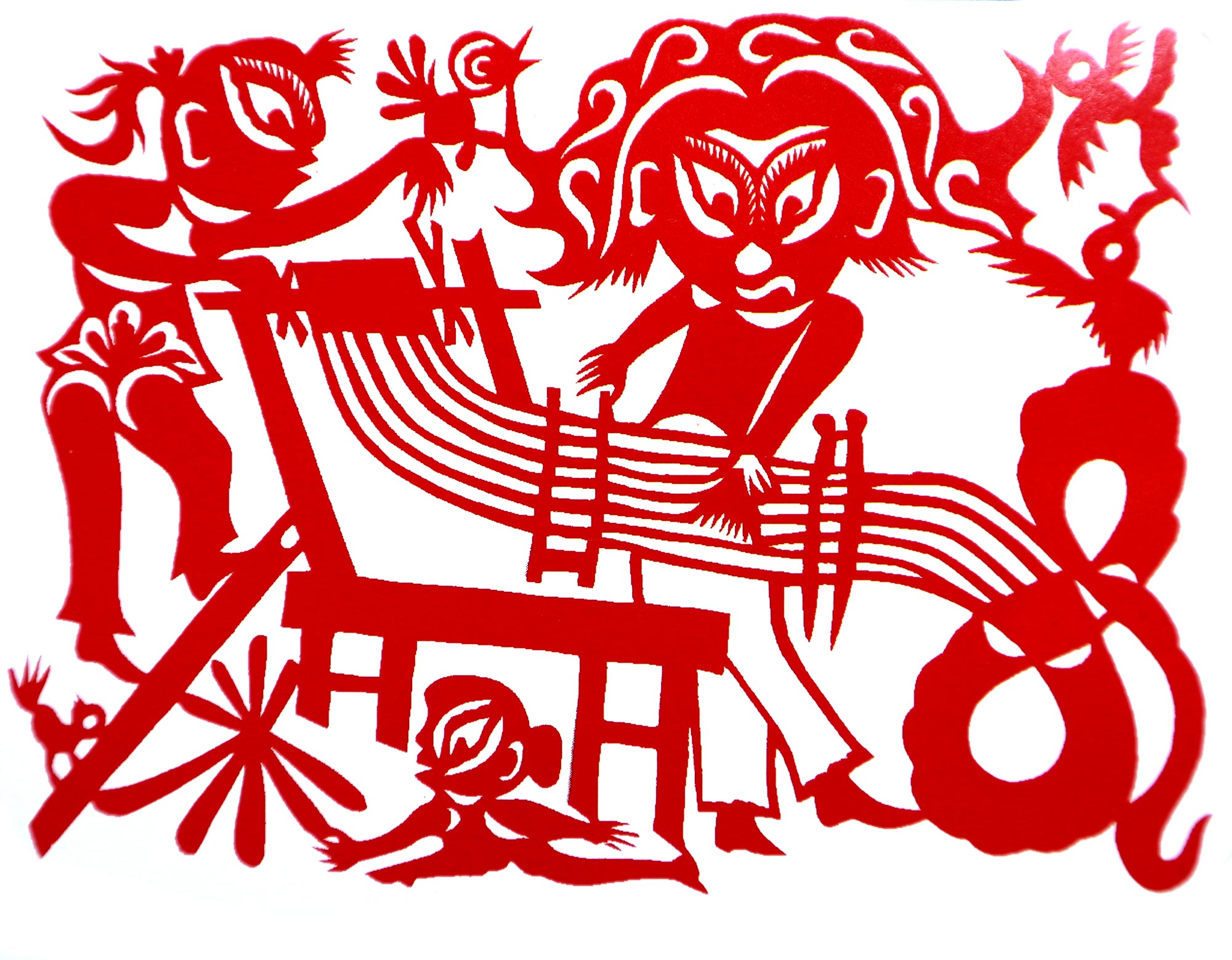 贺彩莲从小见母亲给村里人剪花,就跟上母亲学习。母亲剪花冒剪冒画,她也跟着冒剪冒画。母亲不剪花时,她就拿起剪刀冒剪,从没有拓过样子,小小年纪就学会了剪窗花。村里的女孩子,都来让她给剪花样画花样。上学时特别喜欢画画,经常受到老师的表扬。学剪纸主要从窗花开始,以花鸟动物为主,当时延川农村忌讳剪人物,所以也没有学。1988年,贺彩莲结婚,家里人都支持她剪花、唱歌,特别是婆婆在她剪花时就帮忙做家务,照看孩子。当姑娘时主要是过年剪花,那时没有纸,平常有一点红纸都舍不得用,只能在过年时间用。2001年,靳之林老师来到延川写生,靳老师让她剪了个动物,也启发她剪人物,再靳老师的鼓励下,她的剪纸创作就一直没有停止,创作了《纺织系列》《迎亲系列》《民歌系列》等。后来贺彩莲参加了延川县文化馆的剪纸创作培训班,延安市的剪纸培训班,对她的艺术修养有所提高,更加明确了自己的创作方向和艺术特色的坚持。这些年省市县镇上只要有剪纸活动,每次都参加,不管能不能获奖,她都是平常心。